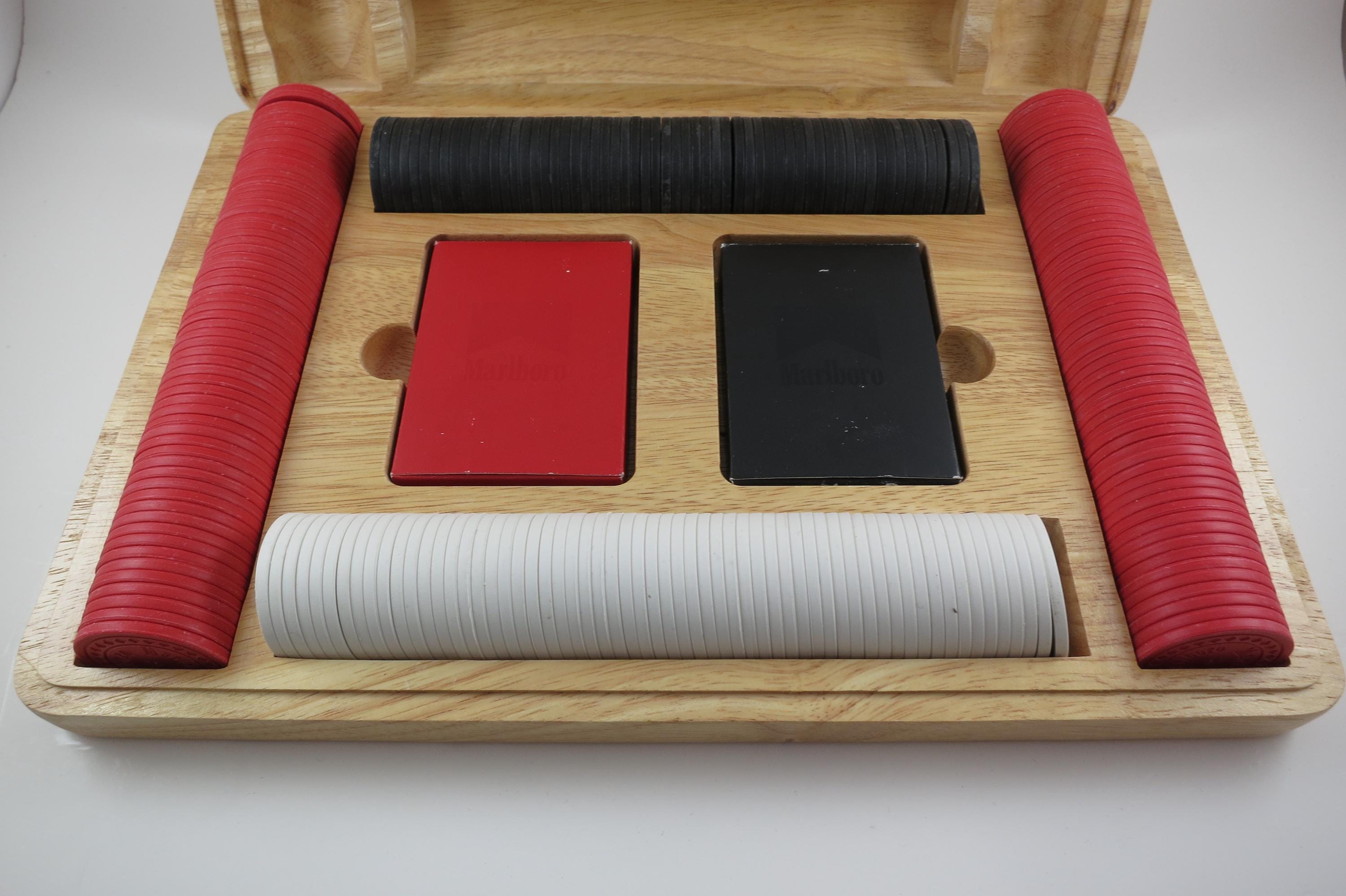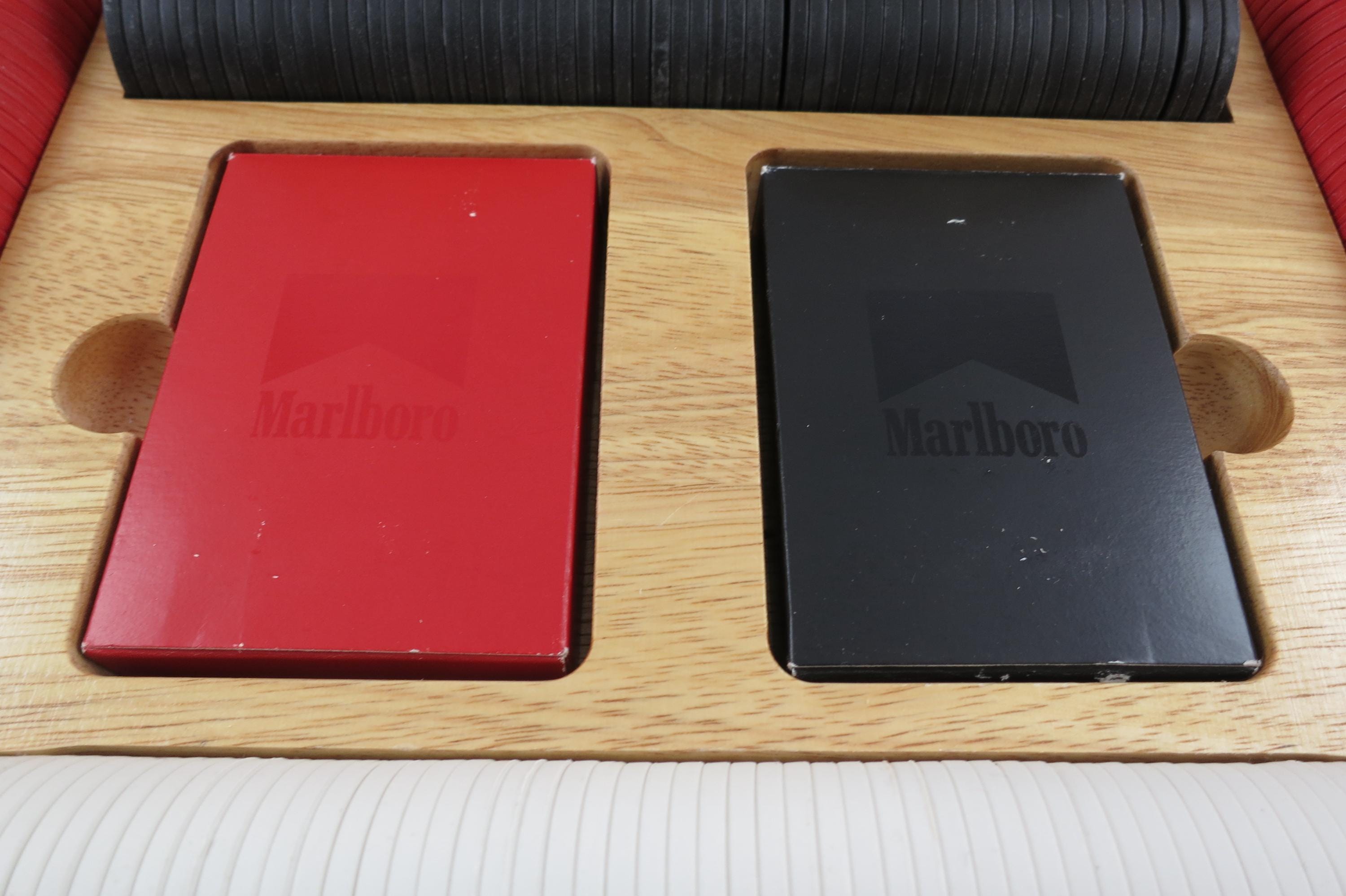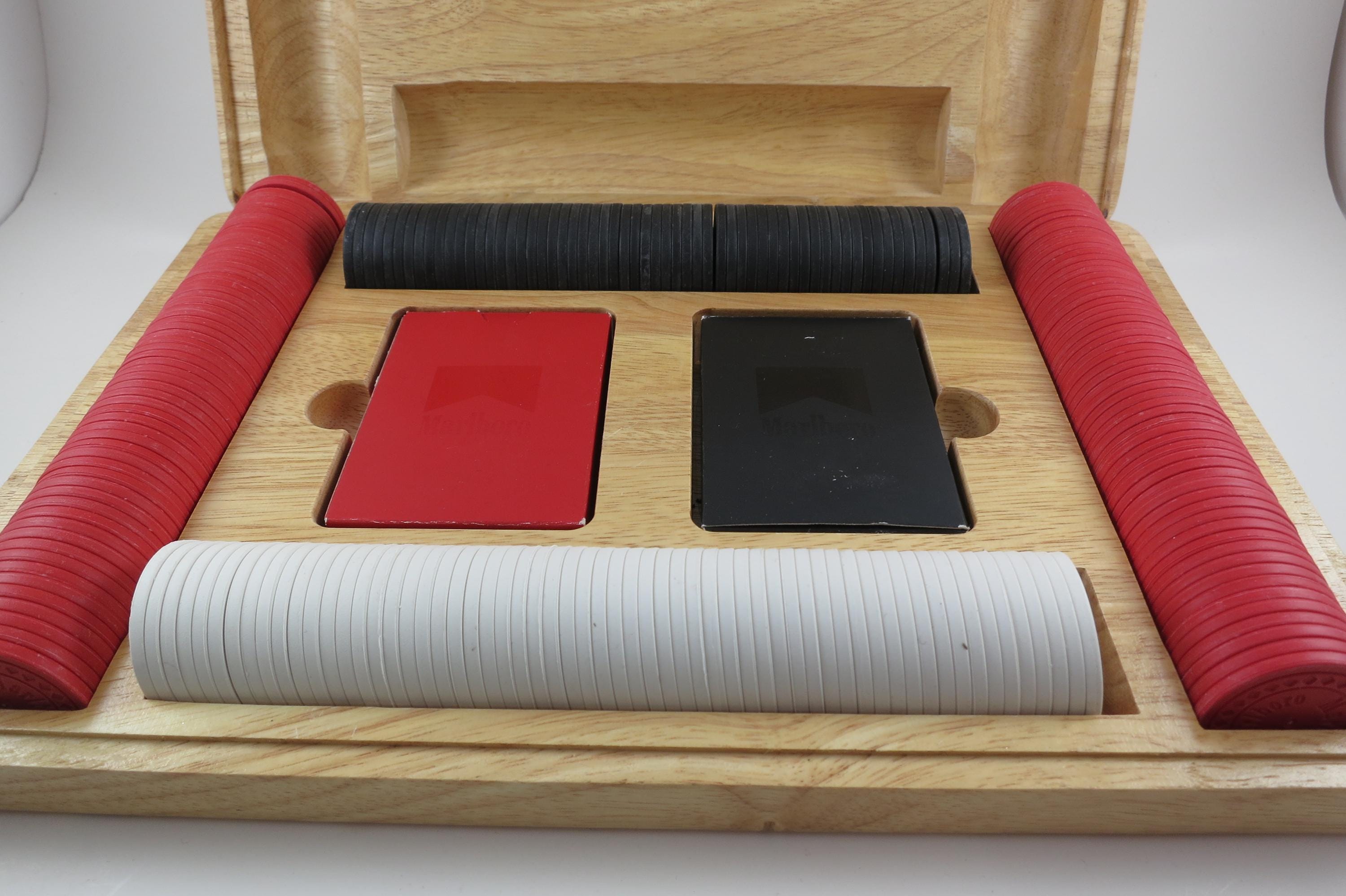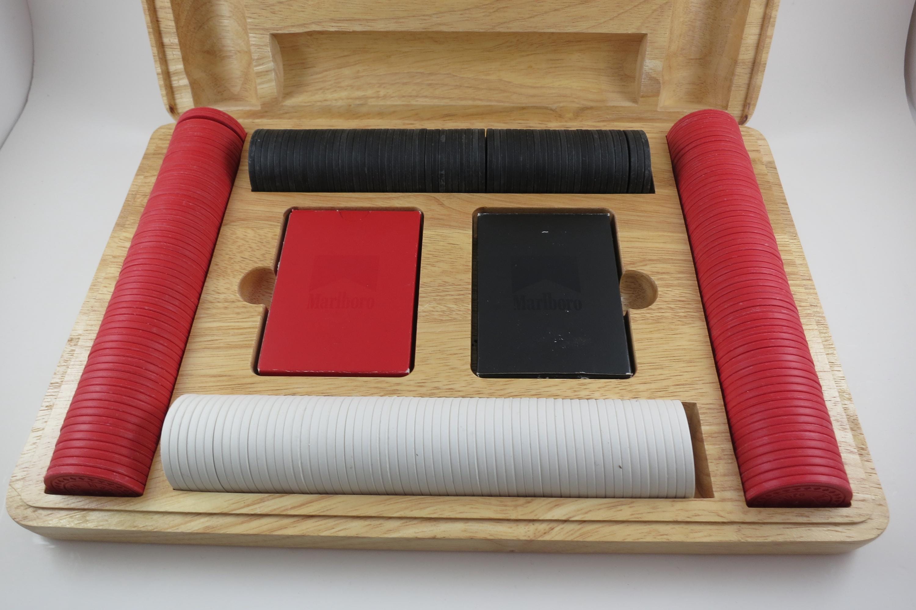 Has the original 2 decks of playing cards, and all the original chips. There are 60 Black, 60 White and 120 Red Chips. Everything of course says Marlboro on it! Box is heavy solid wood.