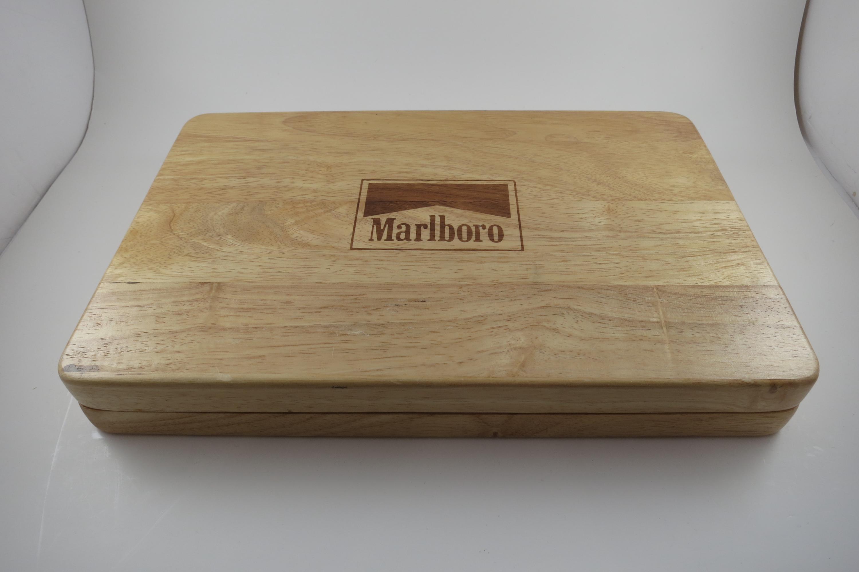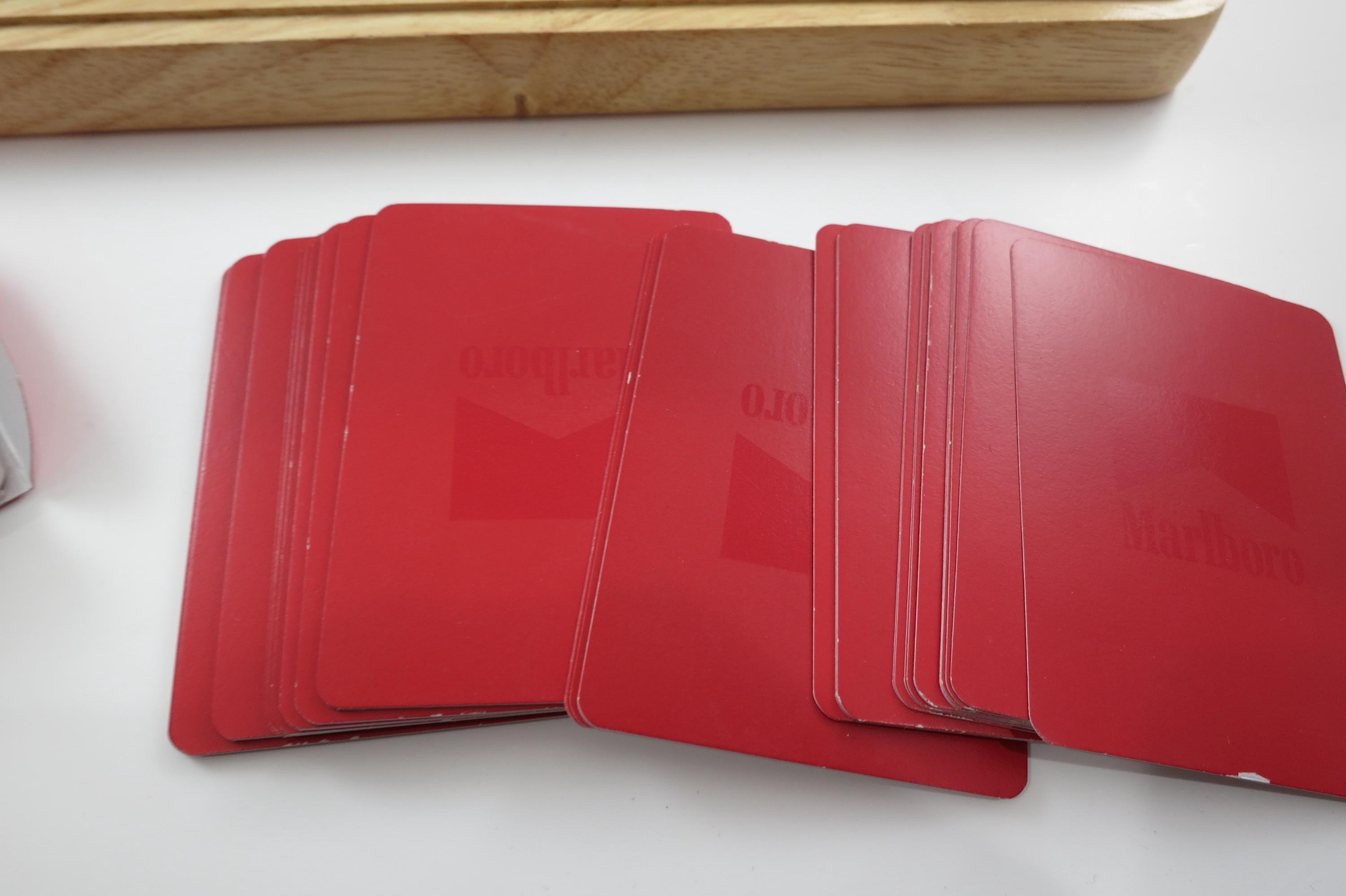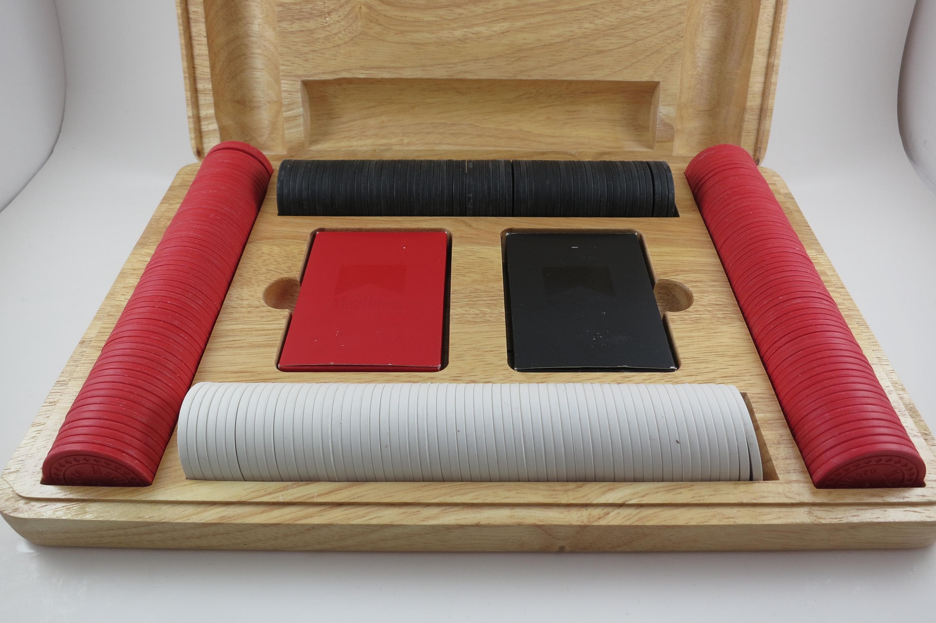 Has the original 2 decks of playing cards, and all the original chips. There are 60 Black, 60 White and 120 Red Chips. Everything of course says Marlboro on it! Box is heavy solid wood.