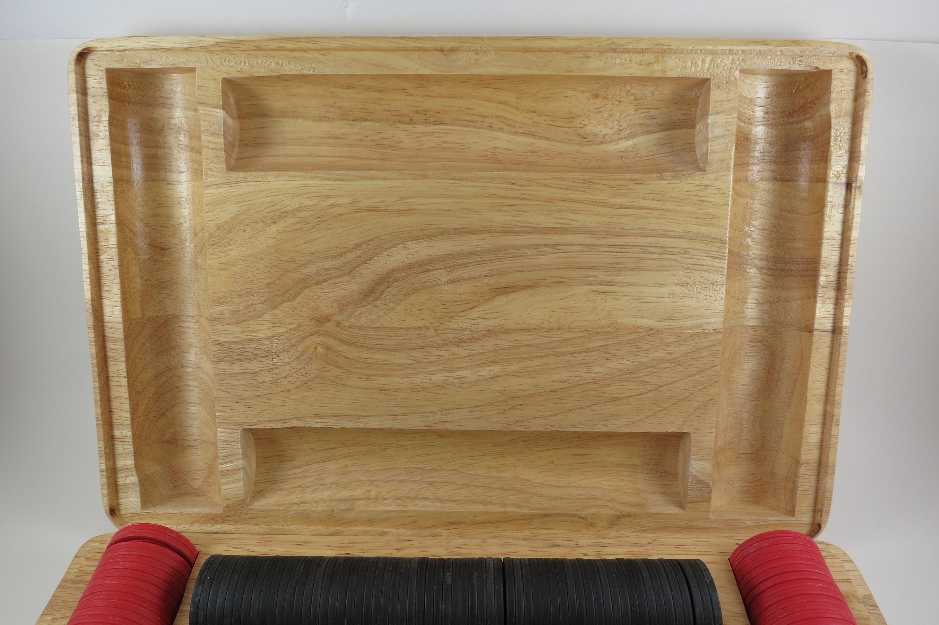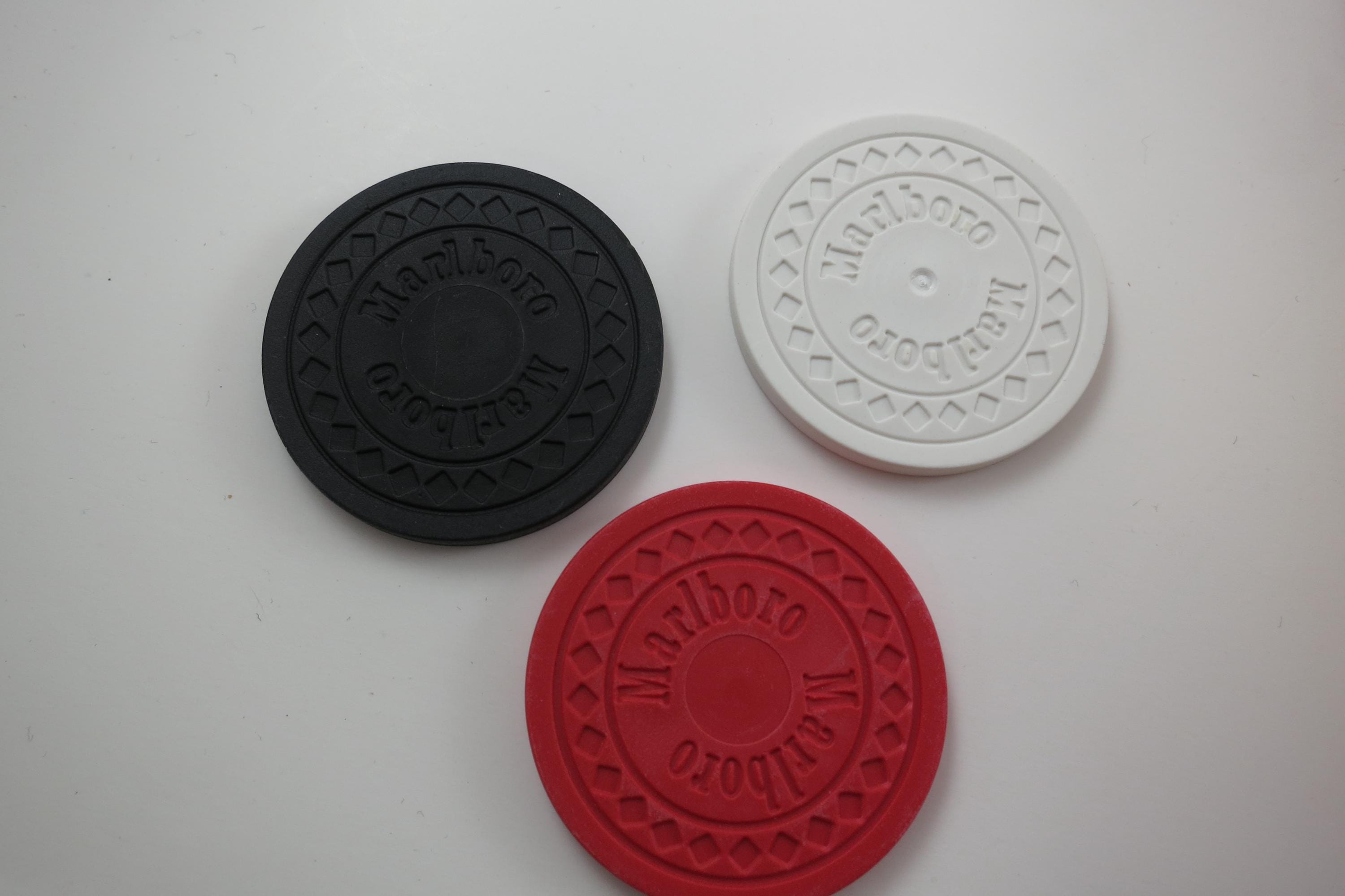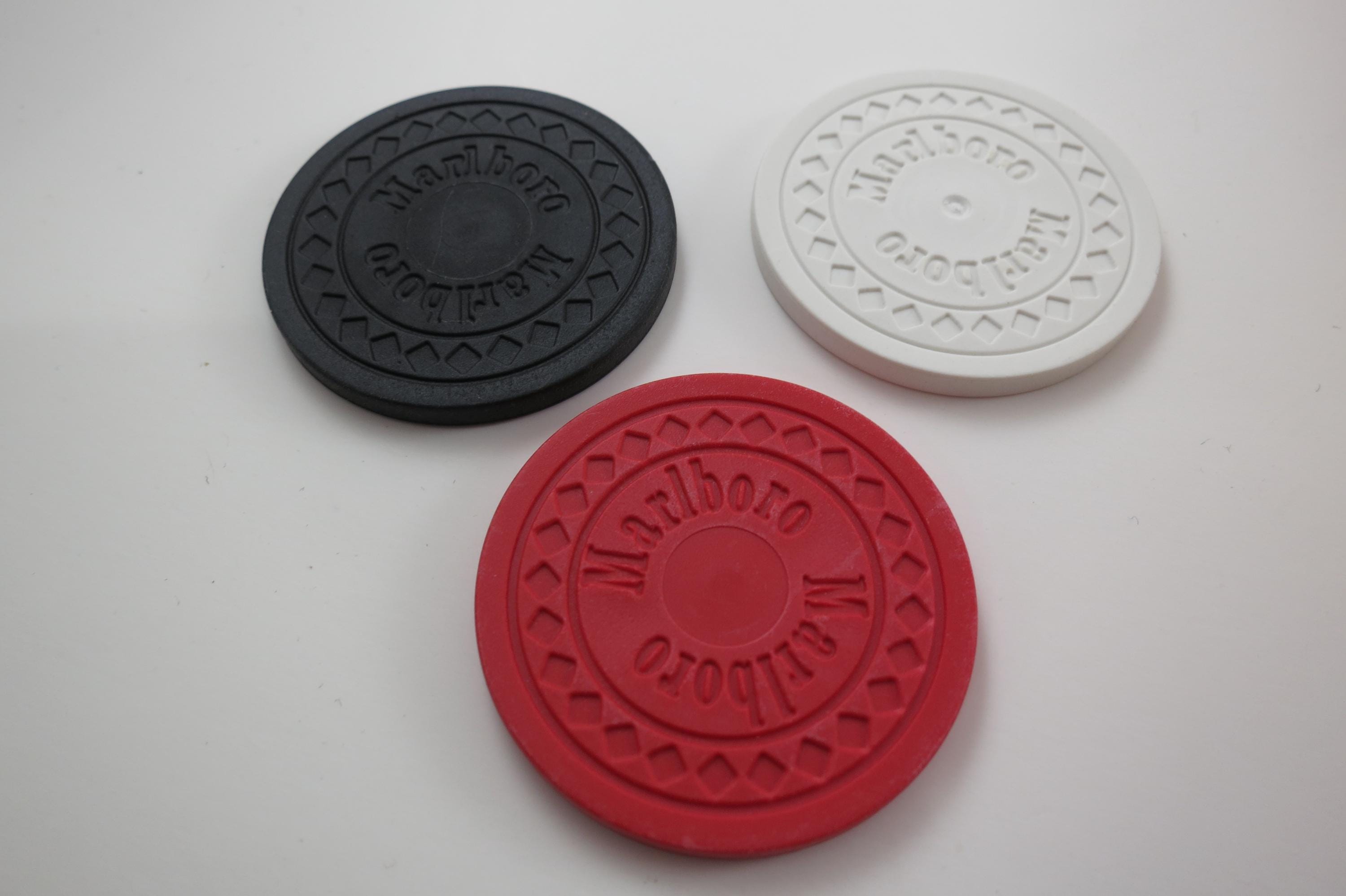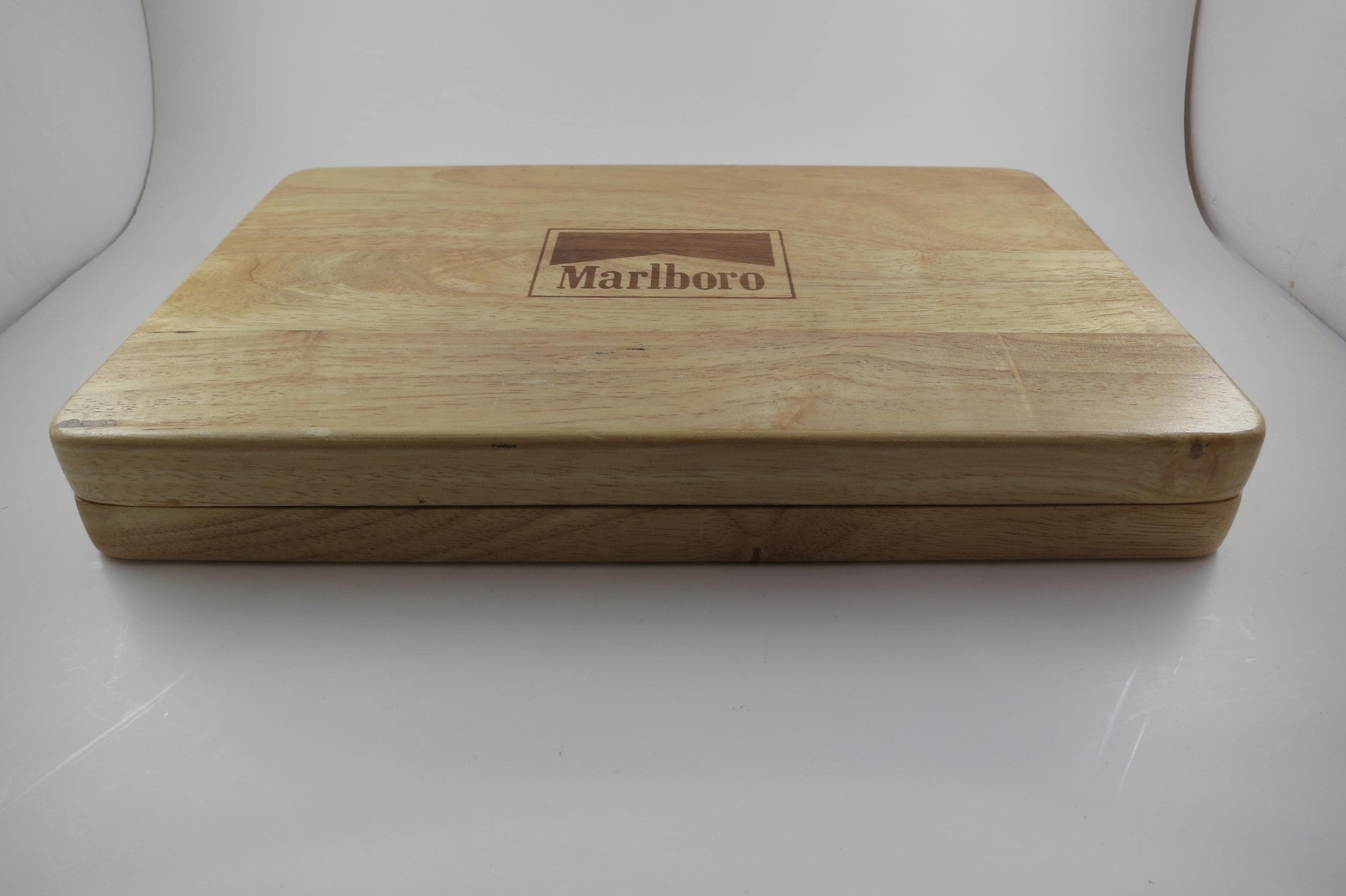 Has the original 2 decks of playing cards, and all the original chips. There are 60 Black, 60 White and 120 Red Chips. Everything of course says Marlboro on it! Box is heavy solid wood.