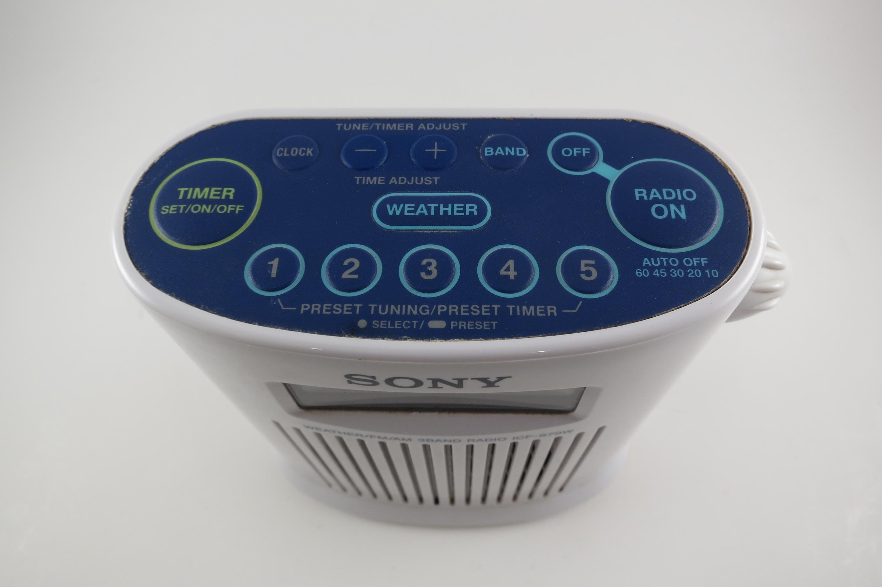 Vintage 1990s Sony ICF-579W Weather AM/FM Radio Blue and White Shower.