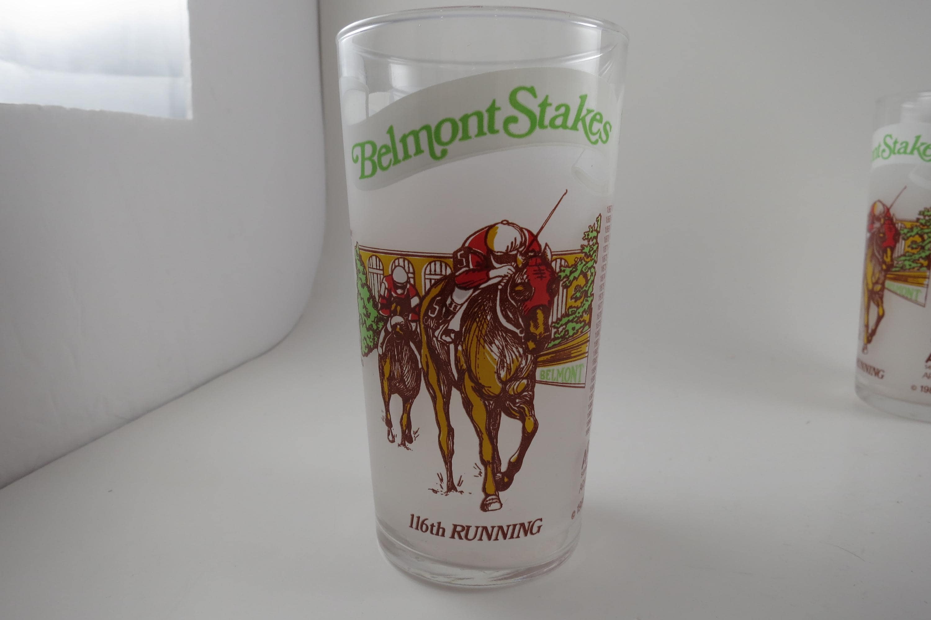 These glasses are all in excellent to like new condition and have been stored for years. None have ever been used to my knowledge, they show no wear. Of course, the Belmont and Preakness glasses are much more scarce than the common Derby glasses.