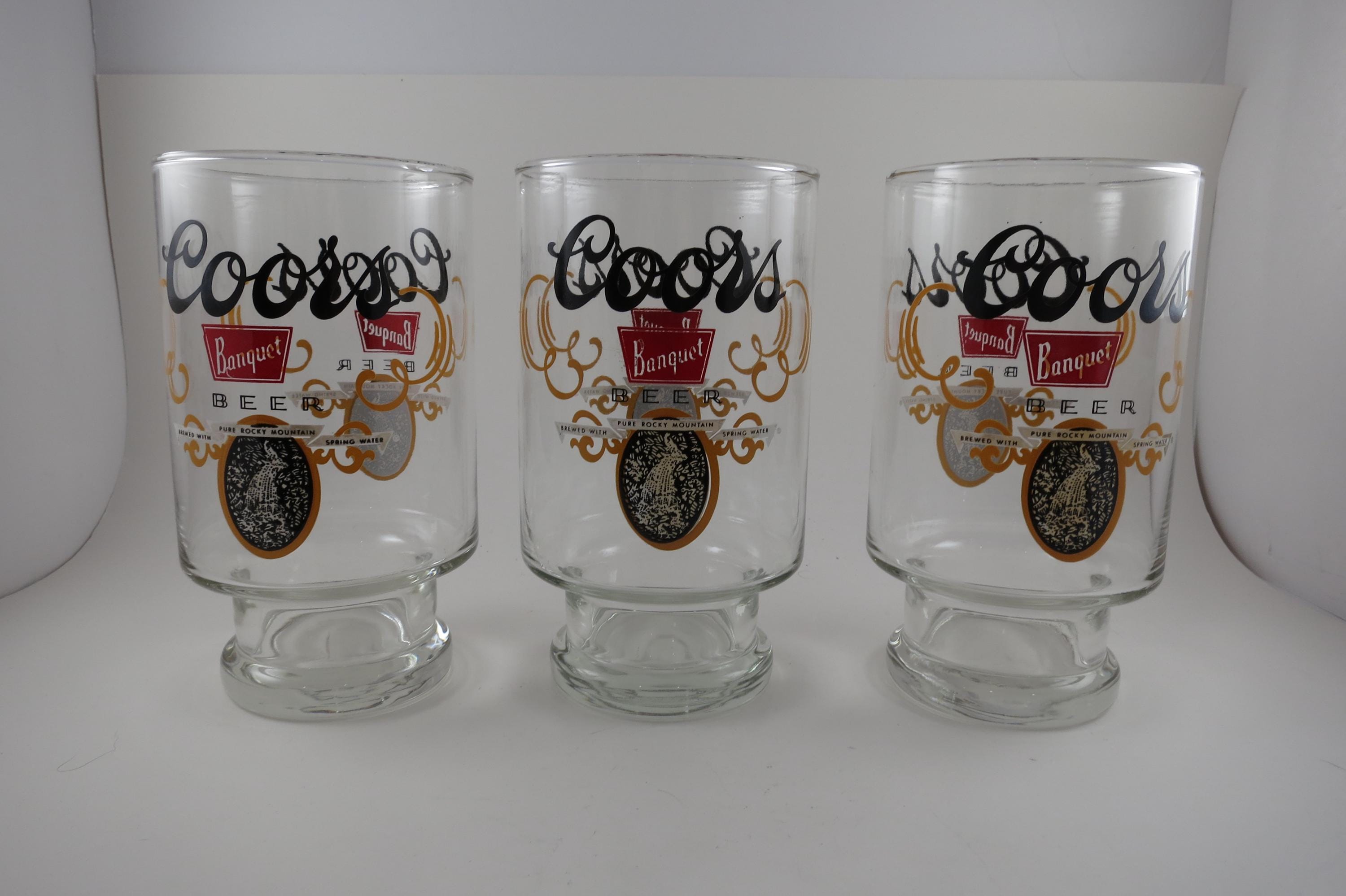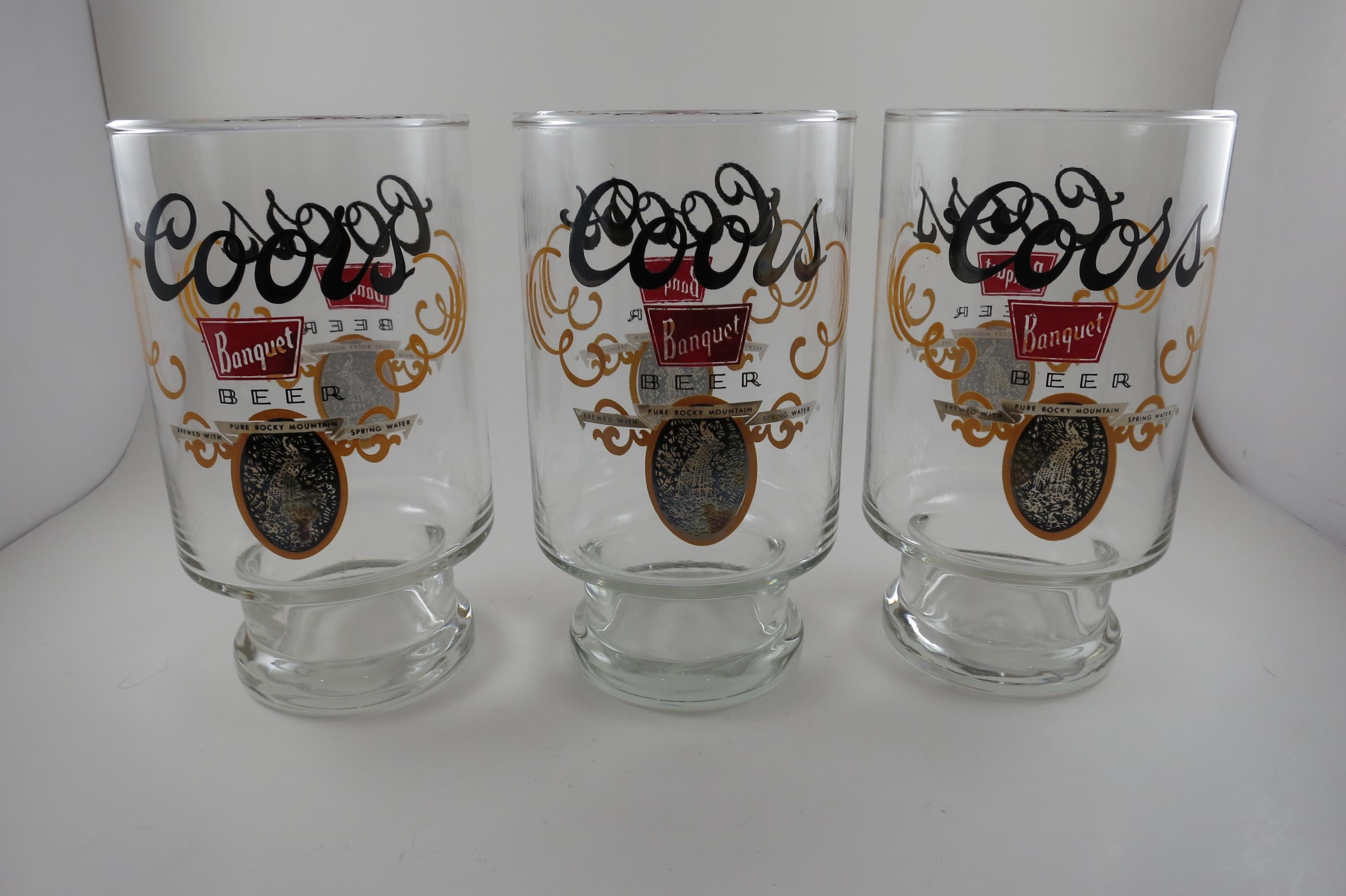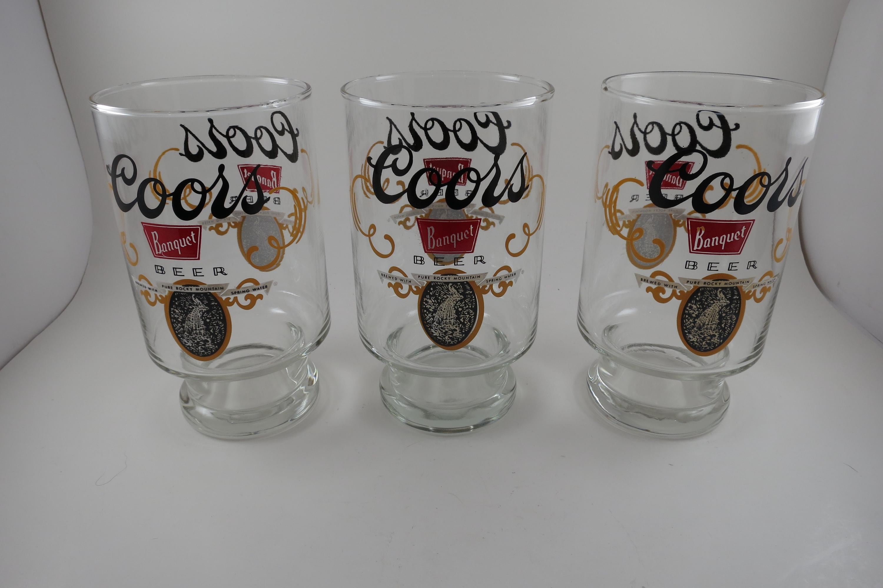 Set of 3 Large 1970’s Vintage Coors Banquet Footed Beer Glasses With Rocky Mountain Emblem.