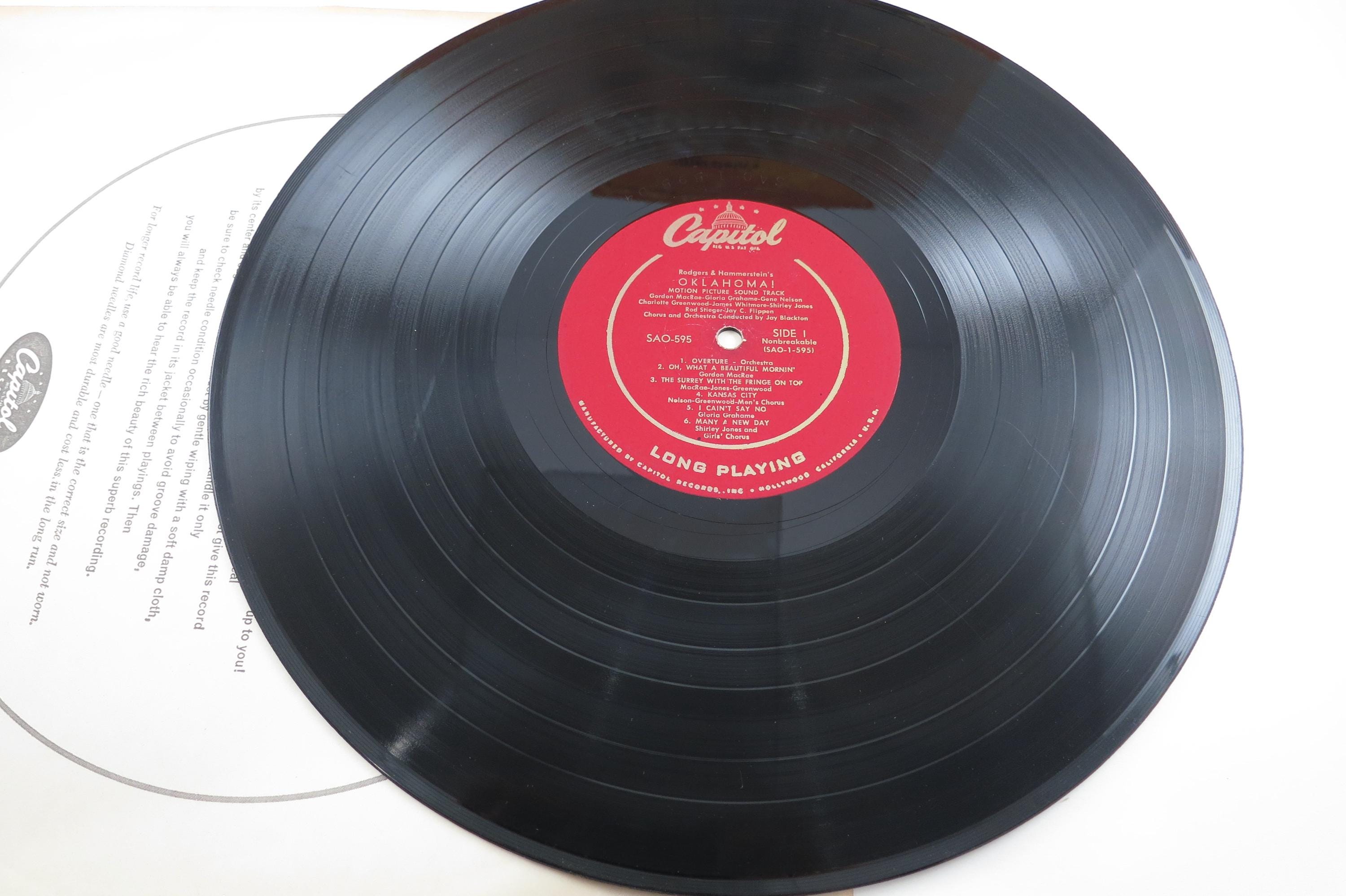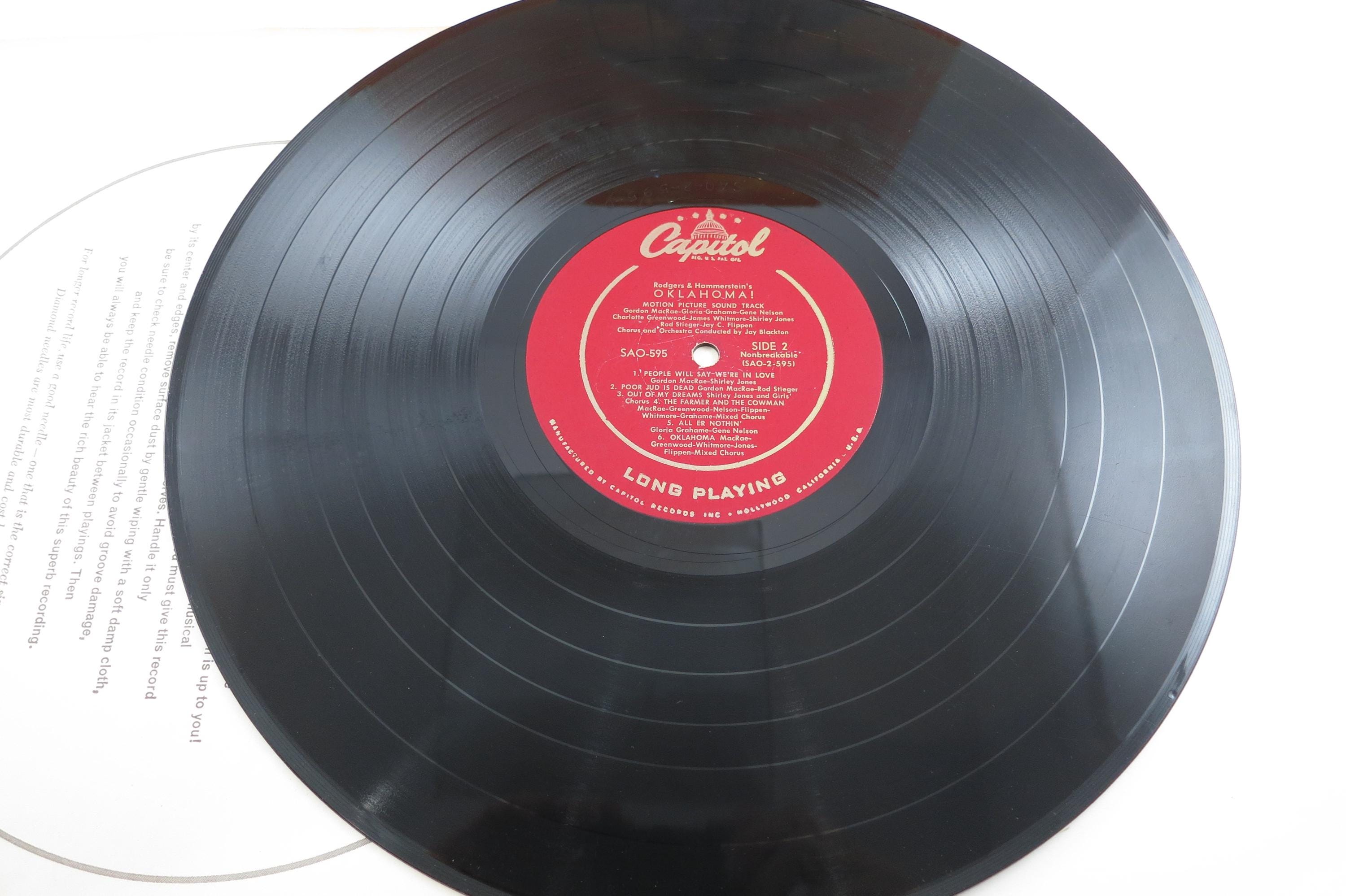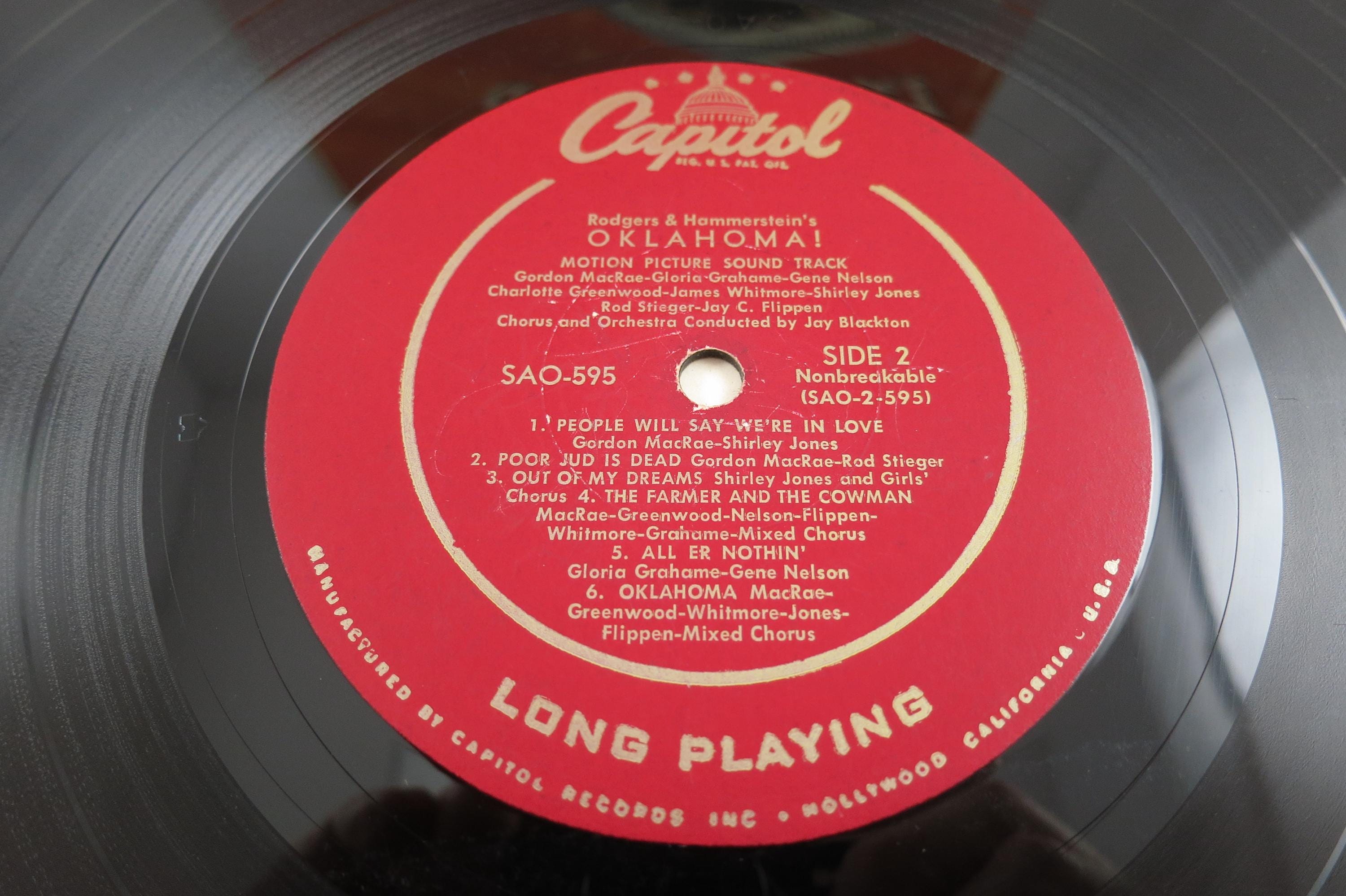 Vintage 1955 Vinyl LP Record Rodgers and Hammerstein's Oklahoma From the Motion Picture Soundtrack Capitol Records. Original cover is in good condition and Includes the original inner paper sleeve. Record is excellent, has the deep red Capitol label. Tracks are as follows