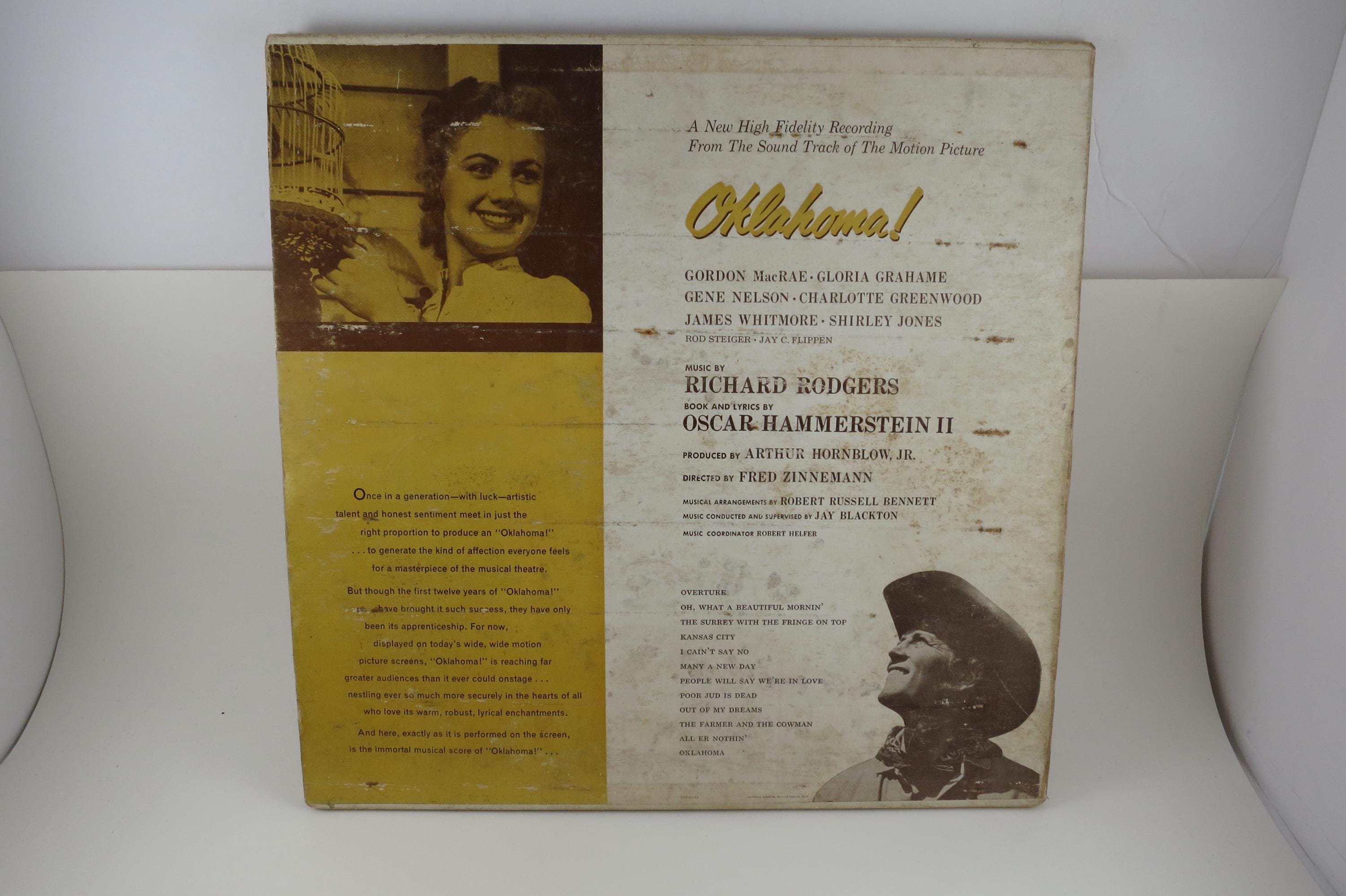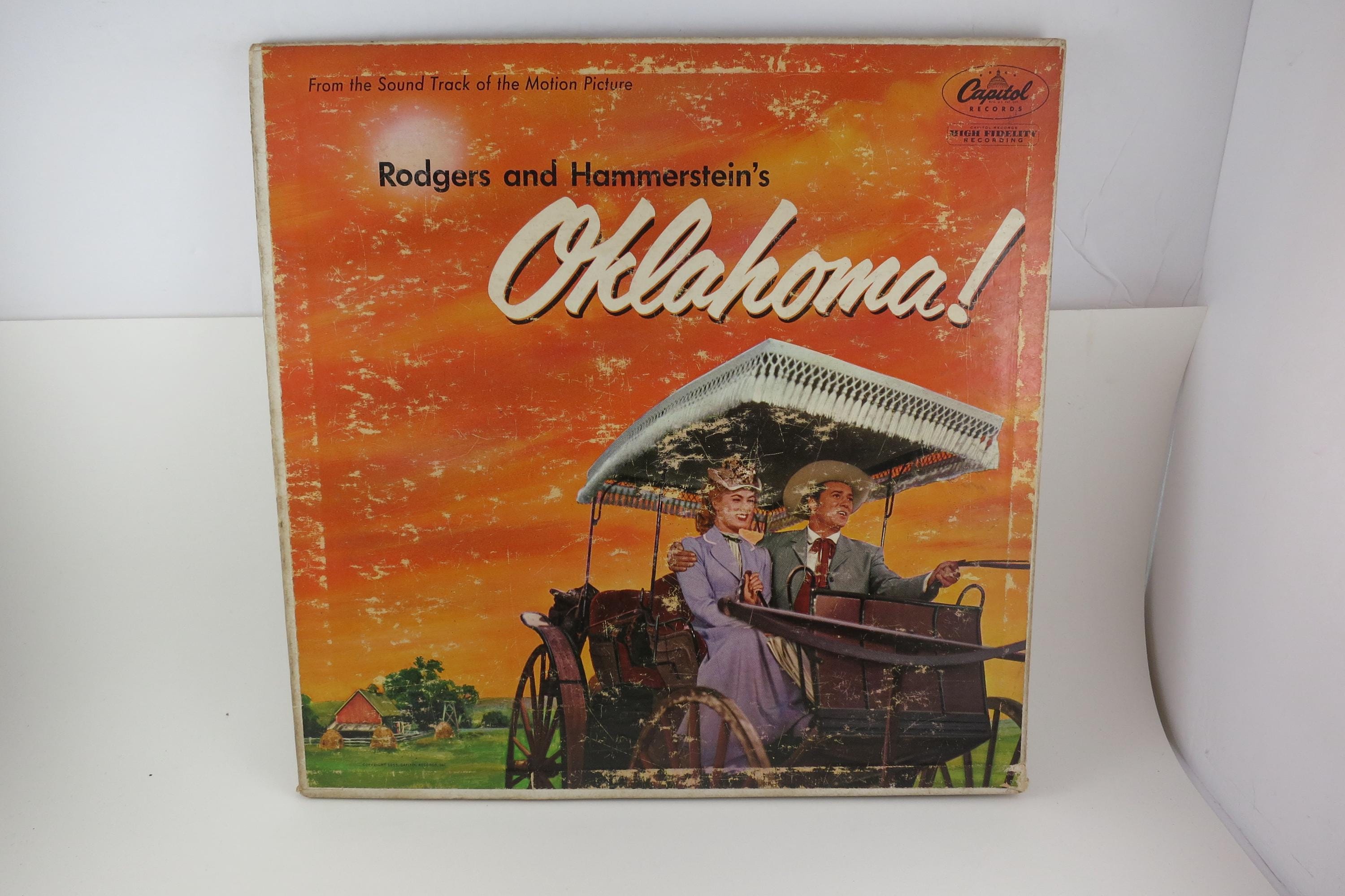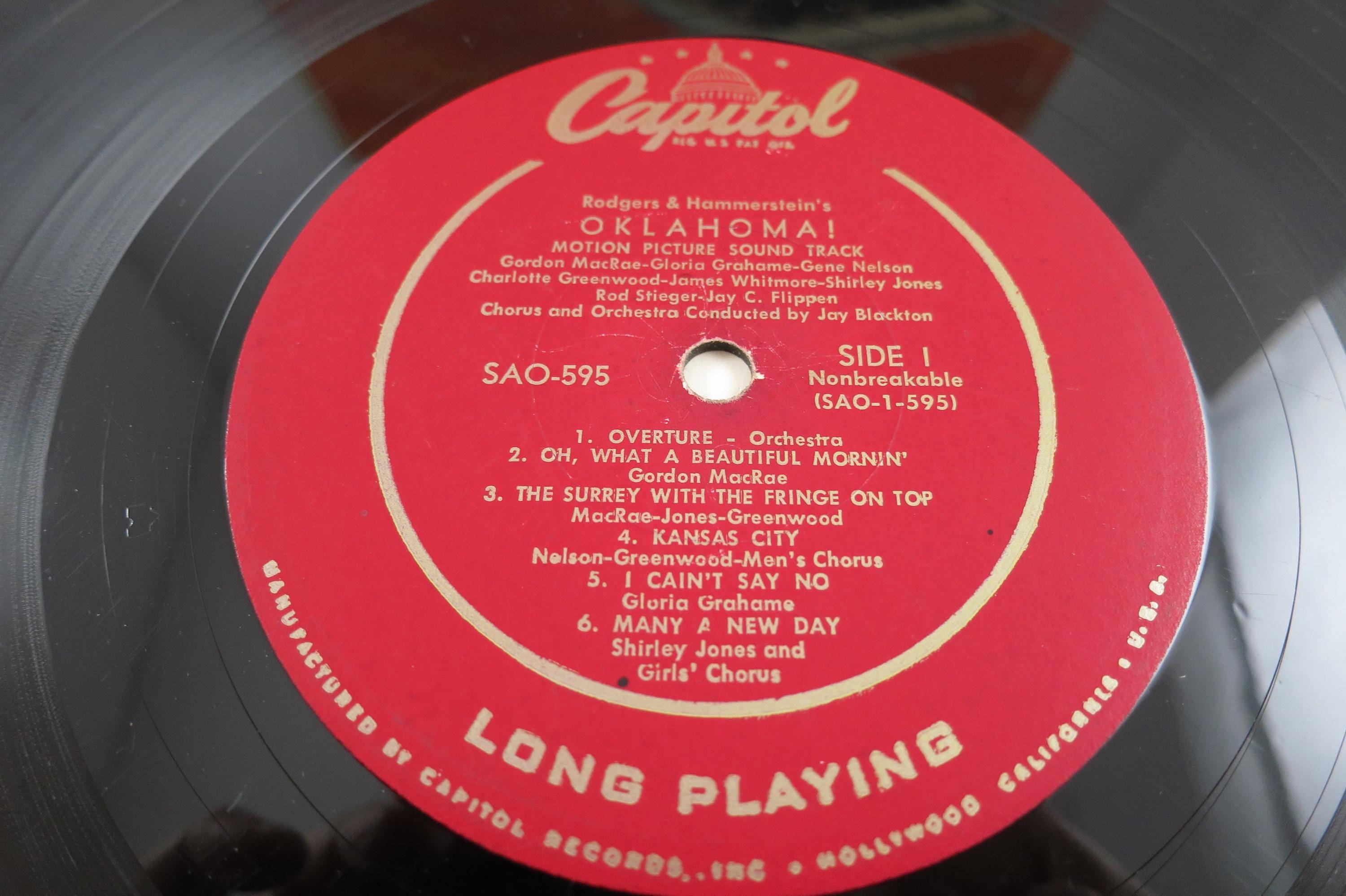 Vintage 1955 Vinyl LP Record Rodgers and Hammerstein's Oklahoma From the Motion Picture Soundtrack Capitol Records. Original cover is in good condition and Includes the original inner paper sleeve. Record is excellent, has the deep red Capitol label. Tracks are as follows