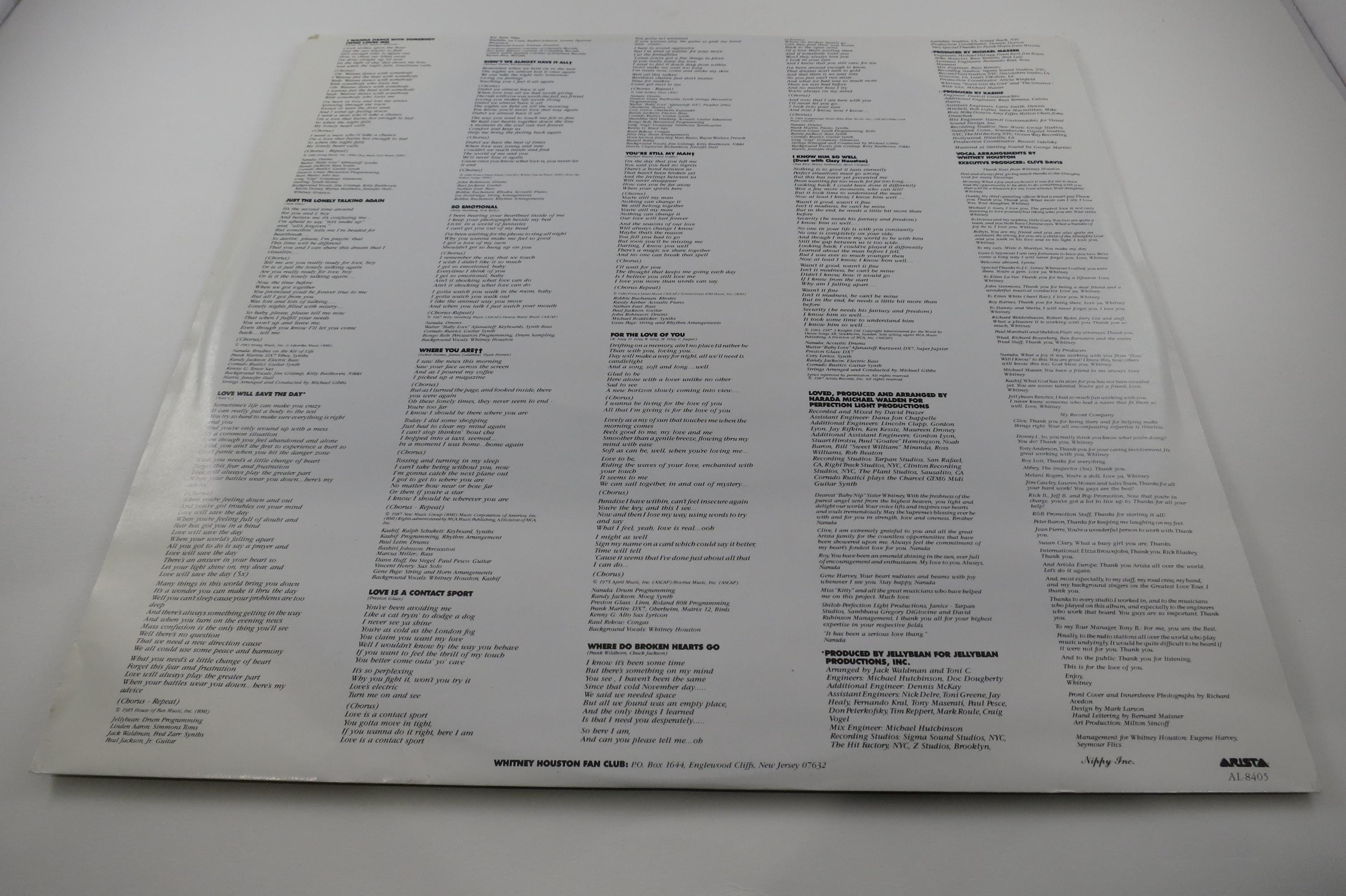 Vintage 1987 Vinyl LP Record Whitney Houston Whitney In Shrink NM-MT. Original cover is in Near Mint condition and includes the original inner paper sleeve. Record is Near Mint-Mint. Fabulous copy! Tracks are as follows