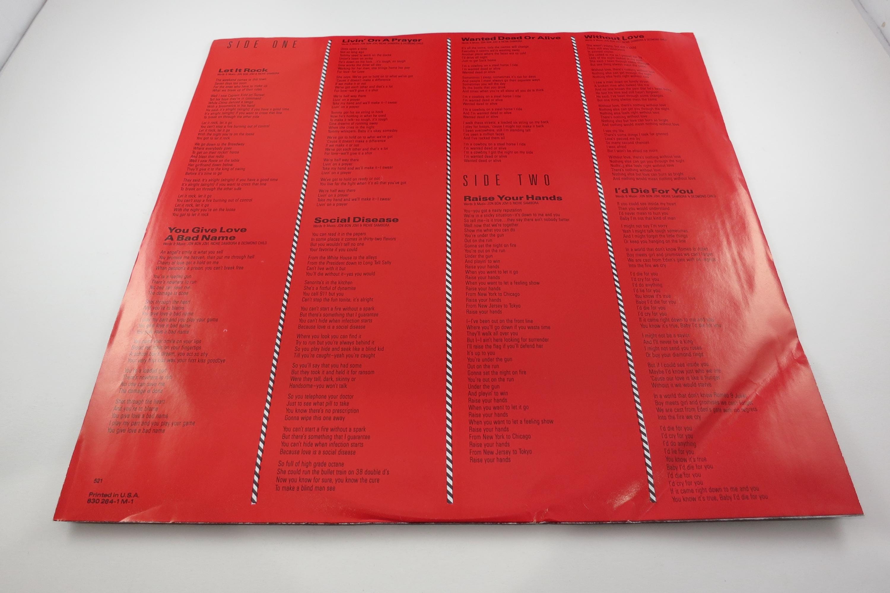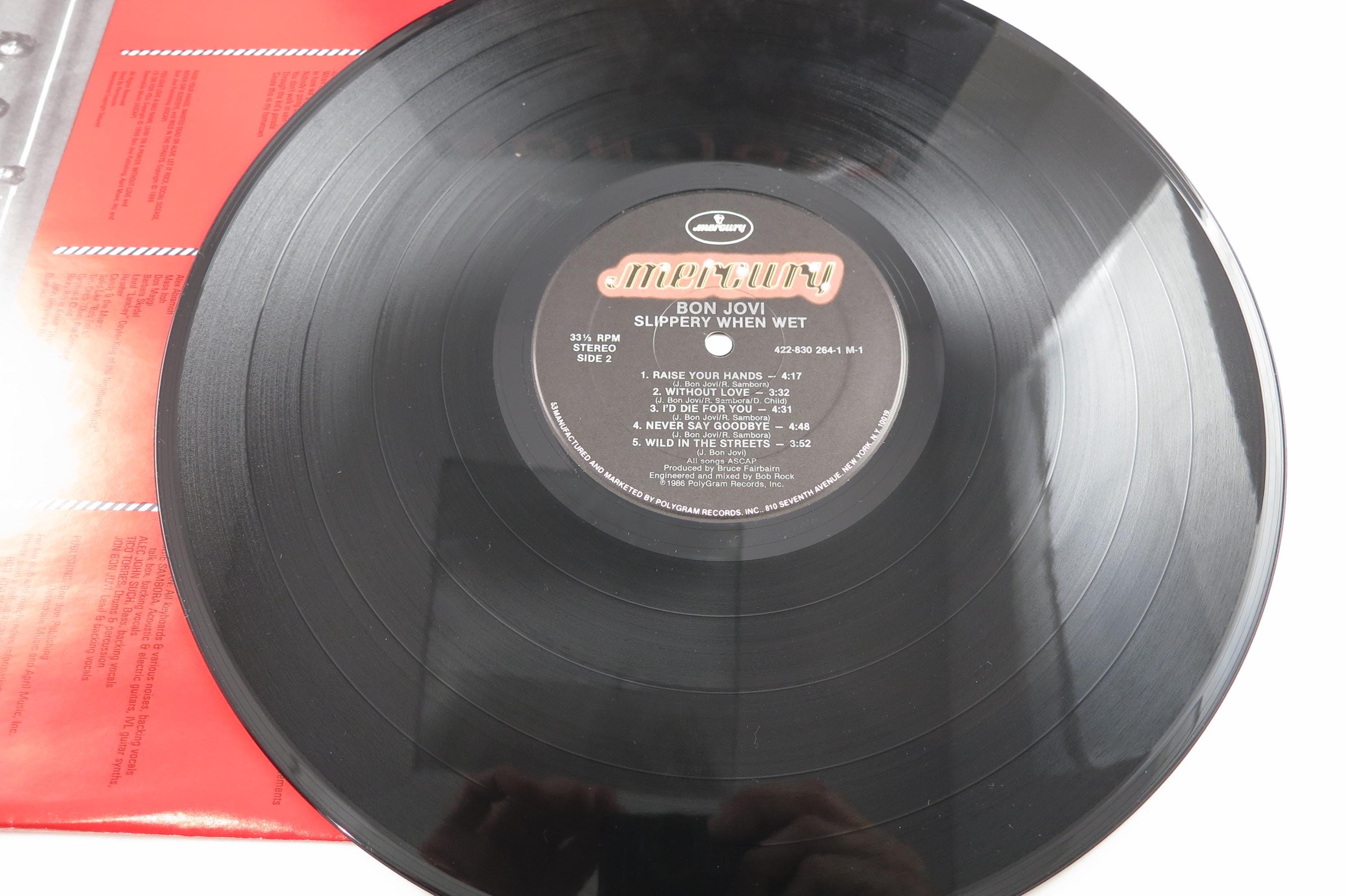 Vintage 1986 Vinyl LP Record Bon Jovi Slippery When Wet Near Mint Condition. Original cover is in excellent condition and includes the original inner paper sleeve, which is the red variation. Record is Near Mint. Original US Pressing of this iconic album! Tracks are as follows