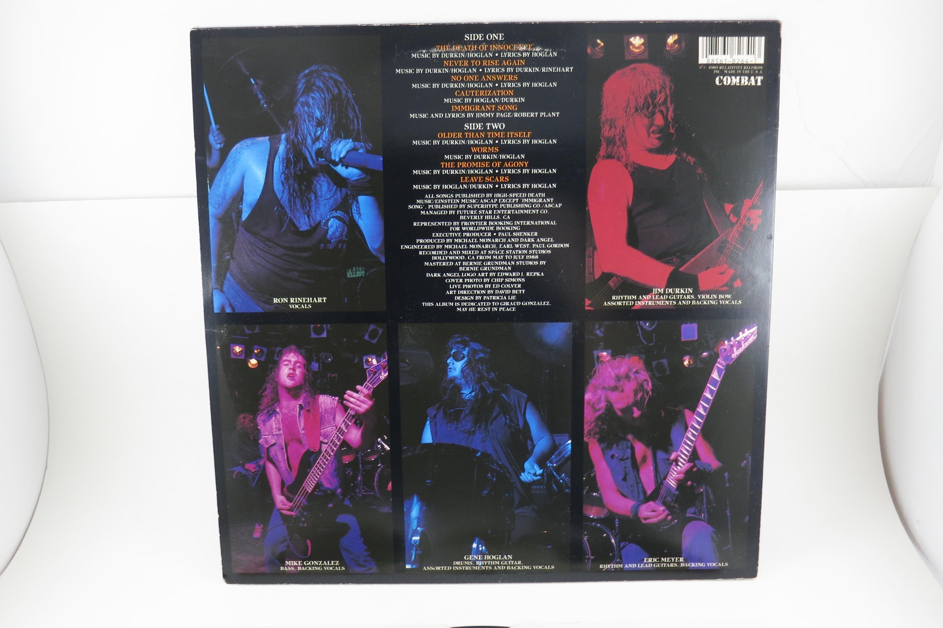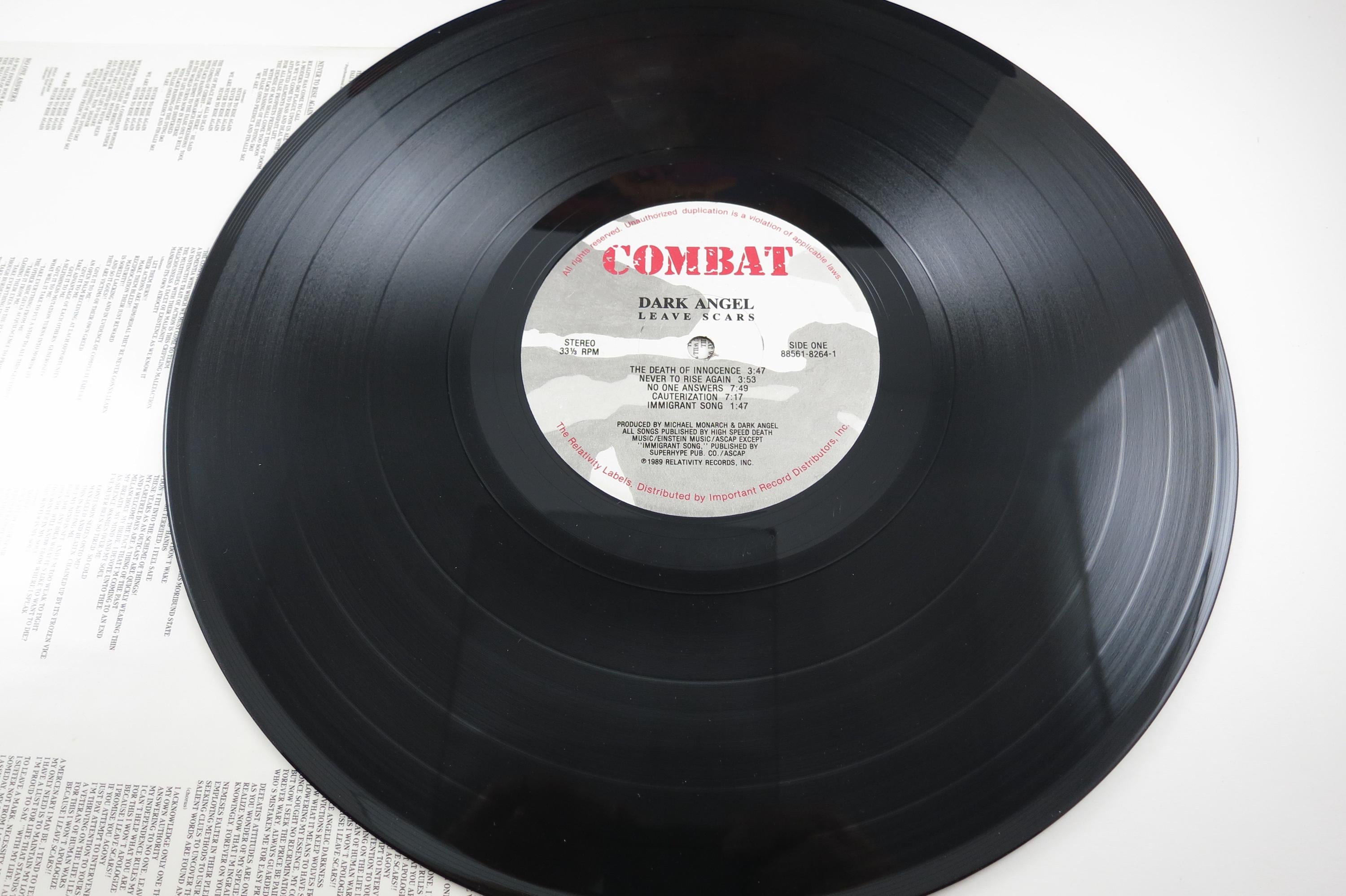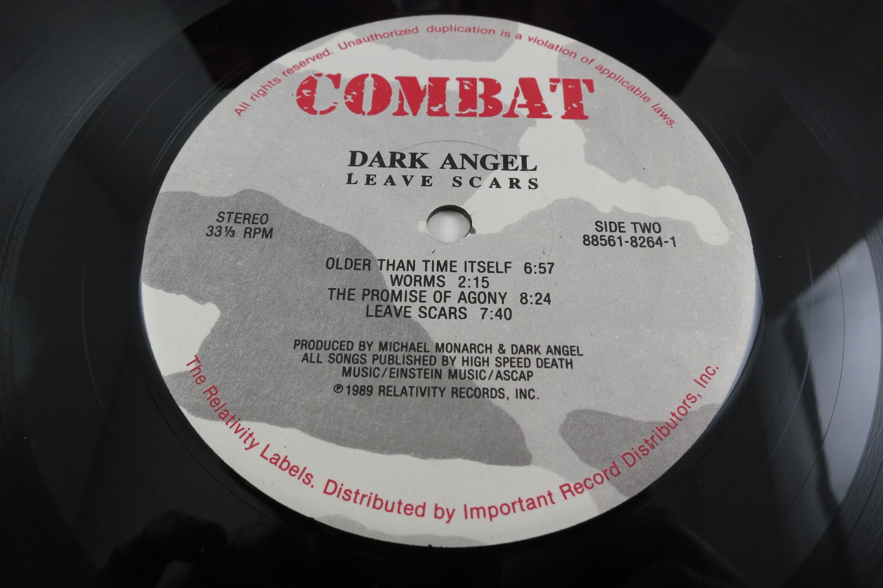 1989 Vinyl LP Thrash Metal Record Leave Scars Dark Angel Excellent Condition Combat Label. Original cover is in excellent condition and includes the original inner sleeve and mail order form. Original Inner Sleeve has taped edges. Record is excellent as well. Rare Find!! Tracks are as follows