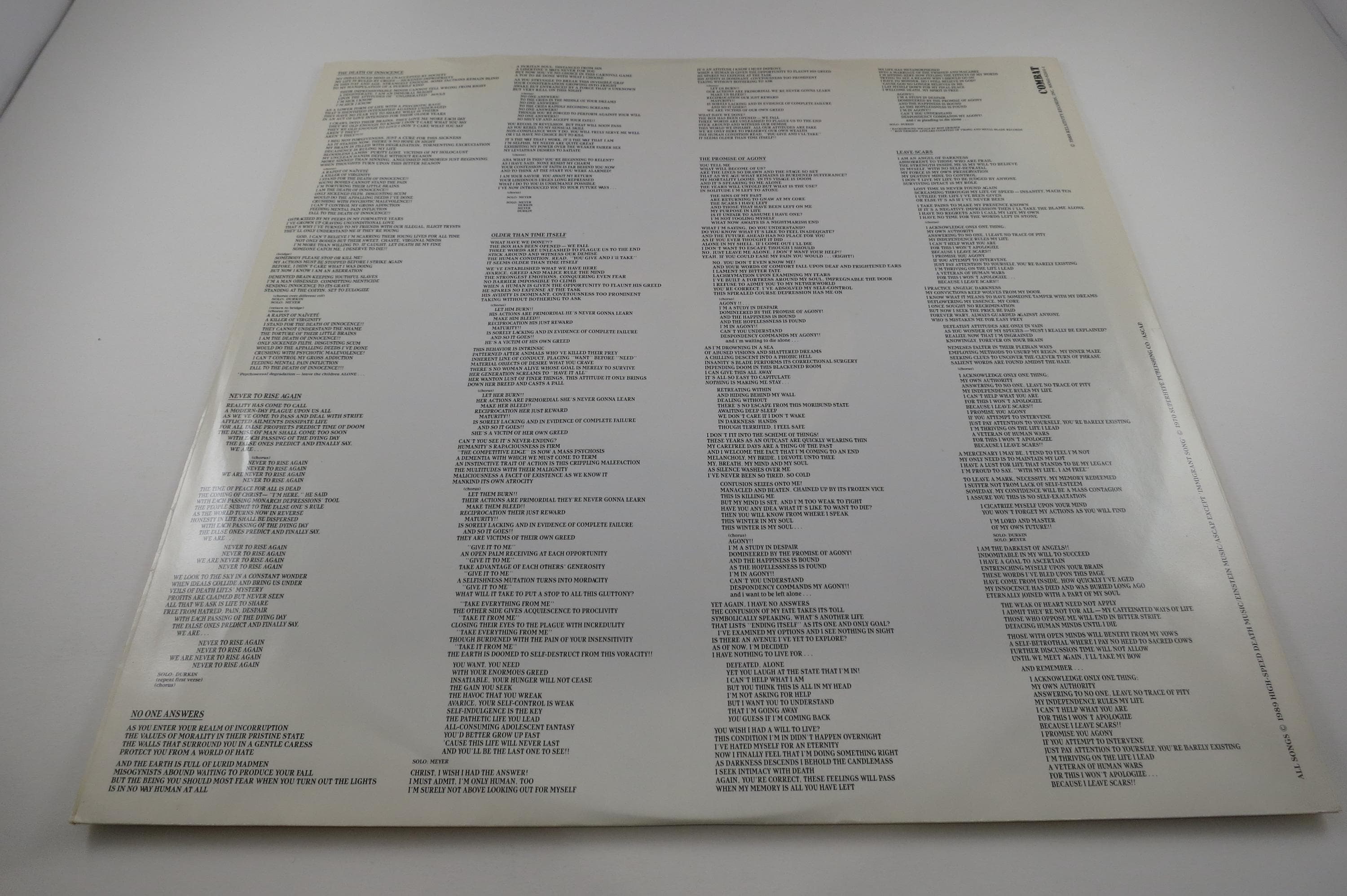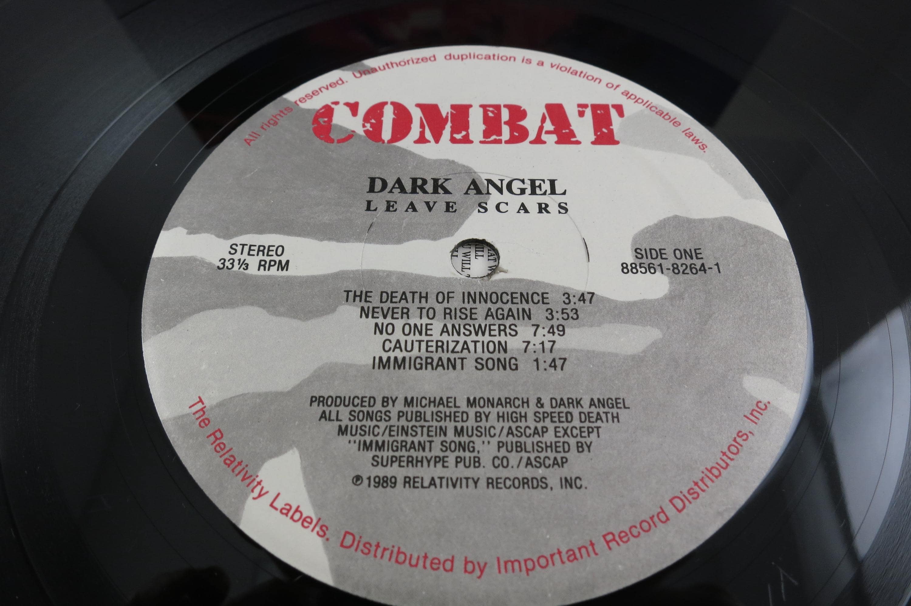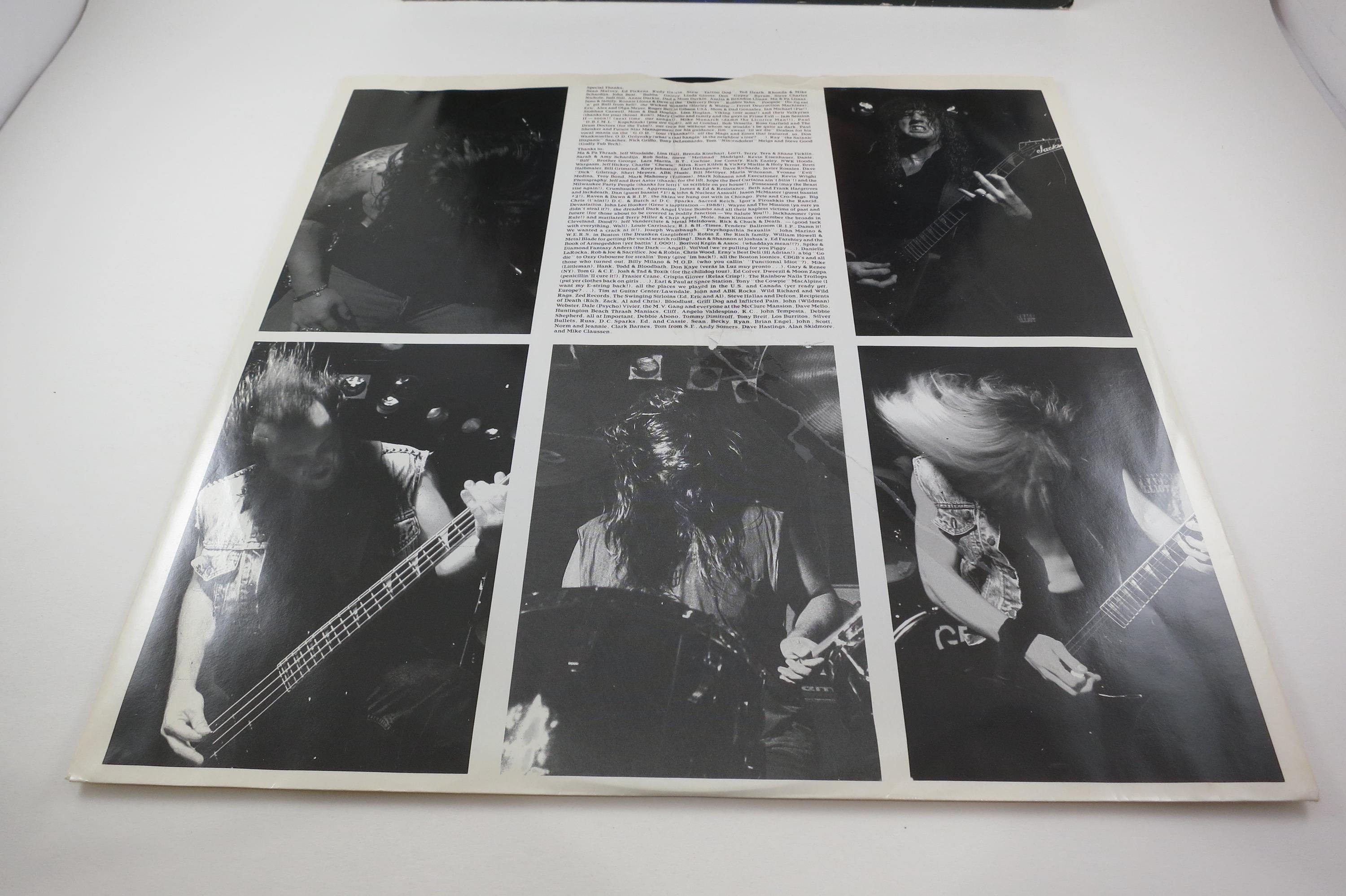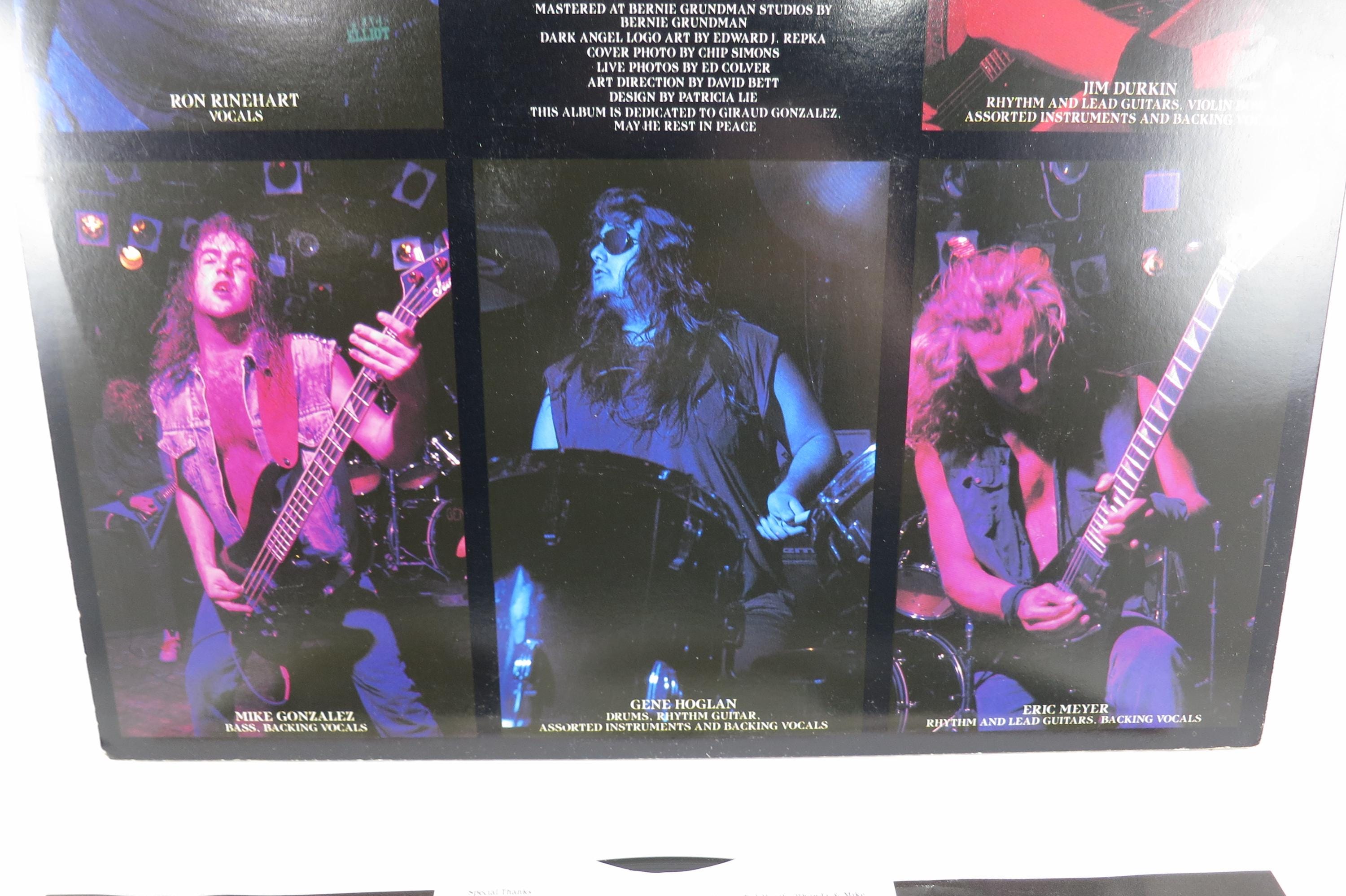 1989 Vinyl LP Thrash Metal Record Leave Scars Dark Angel Excellent Condition Combat Label. Original cover is in excellent condition and includes the original inner sleeve and mail order form. Original Inner Sleeve has taped edges. Record is excellent as well. Rare Find!! Tracks are as follows