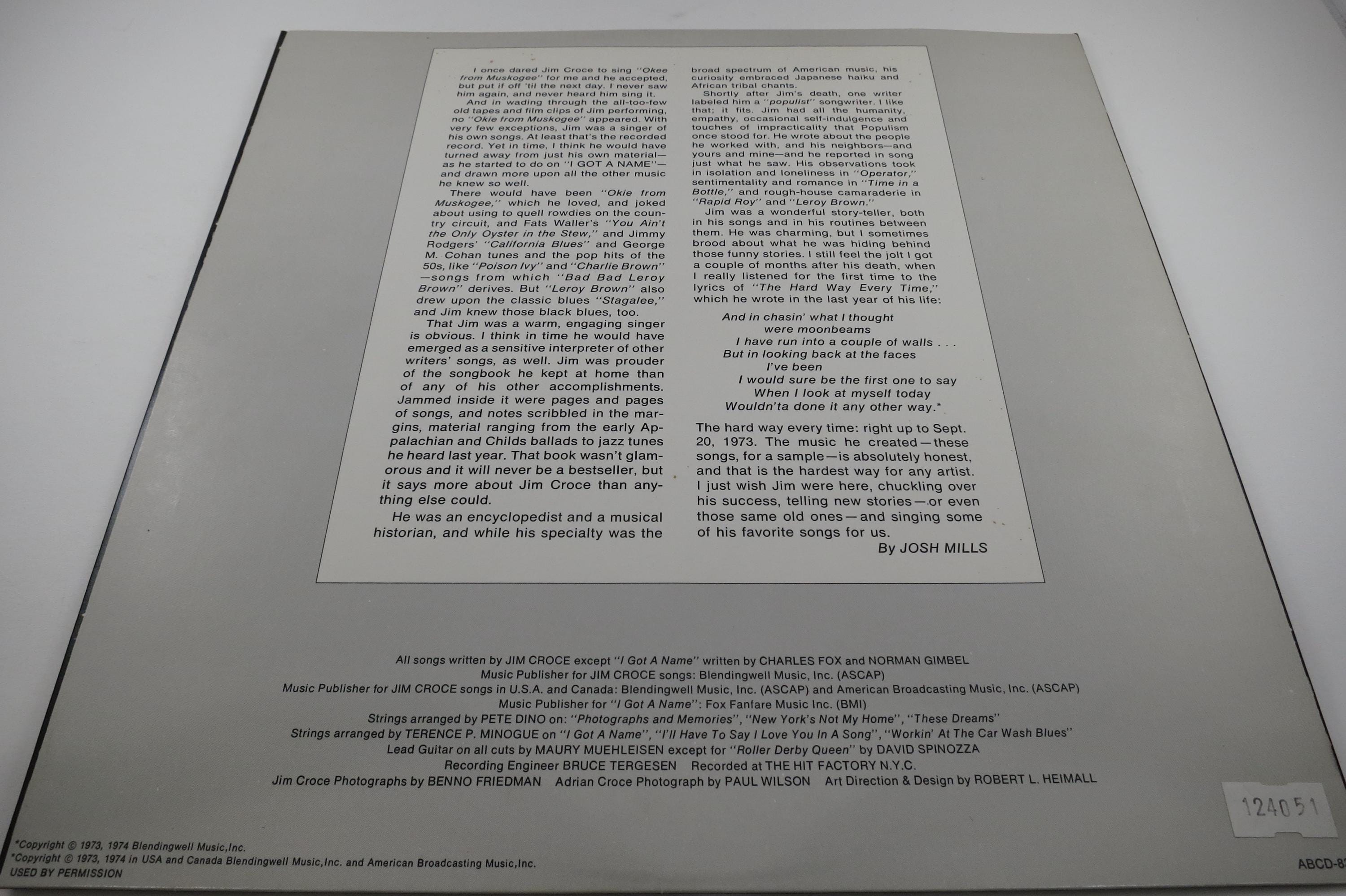 Vintage 1974 Jim Croce Photographs & Memories Vinyl LP: Greatest Hits EX
