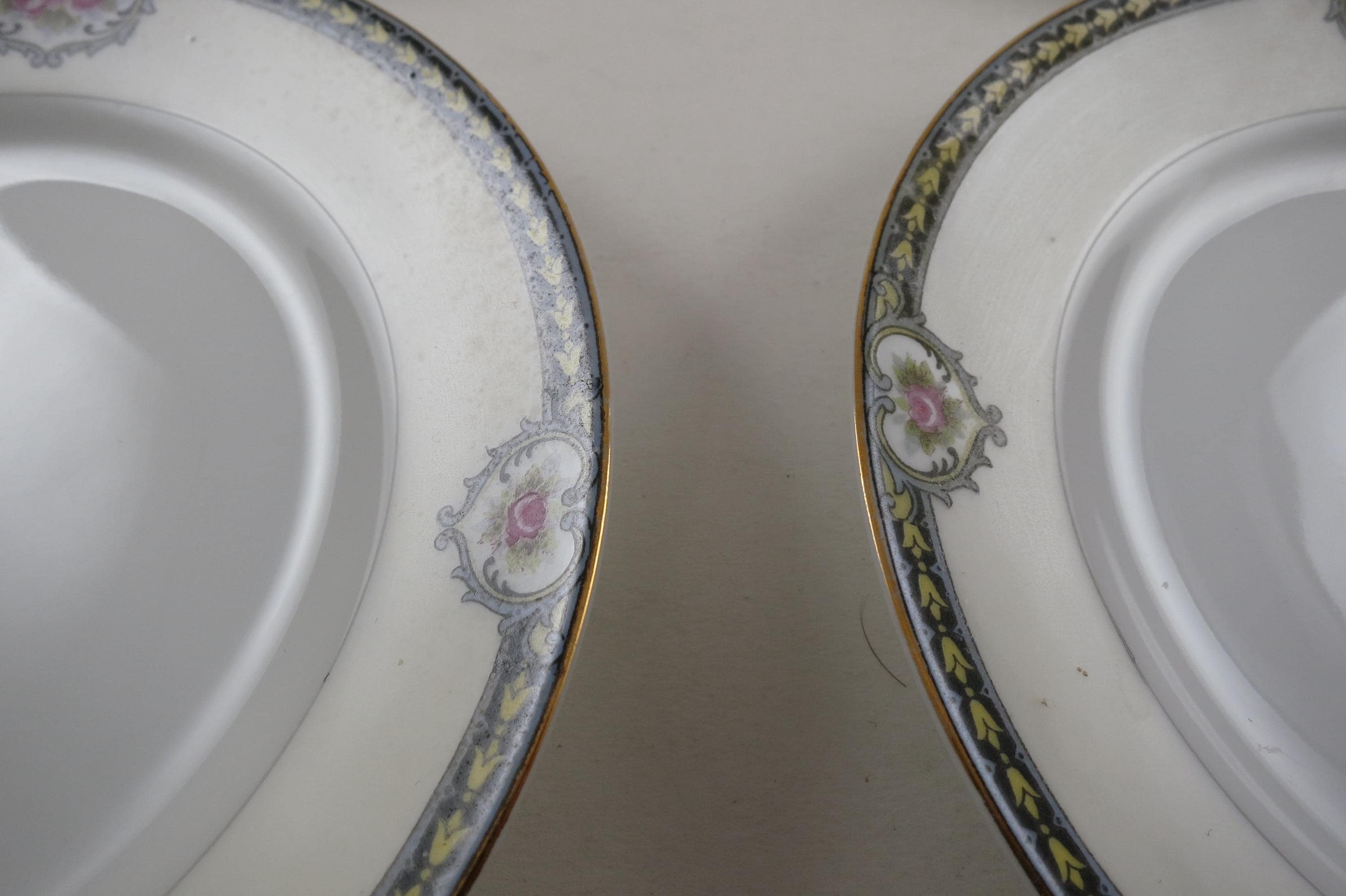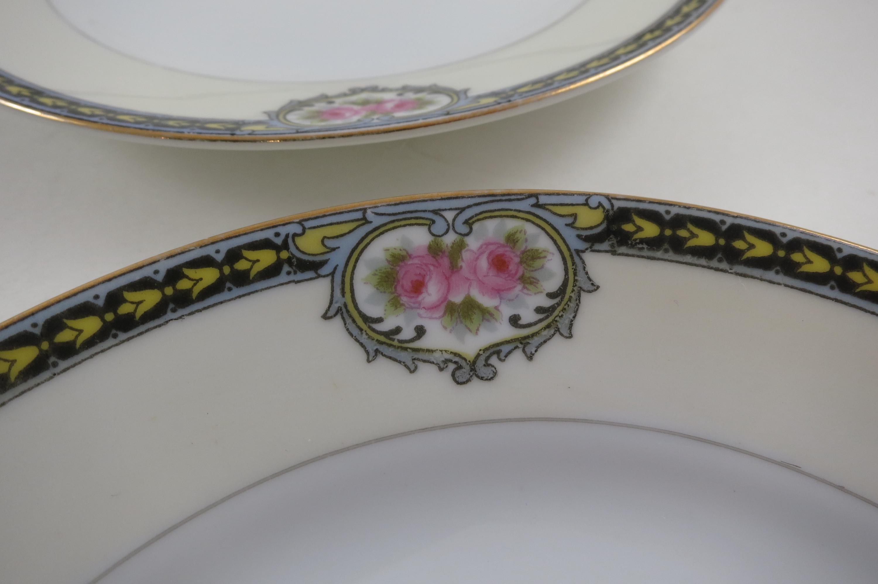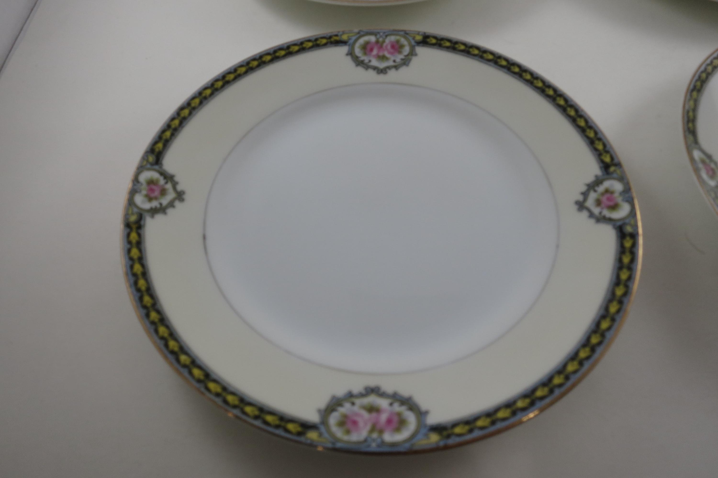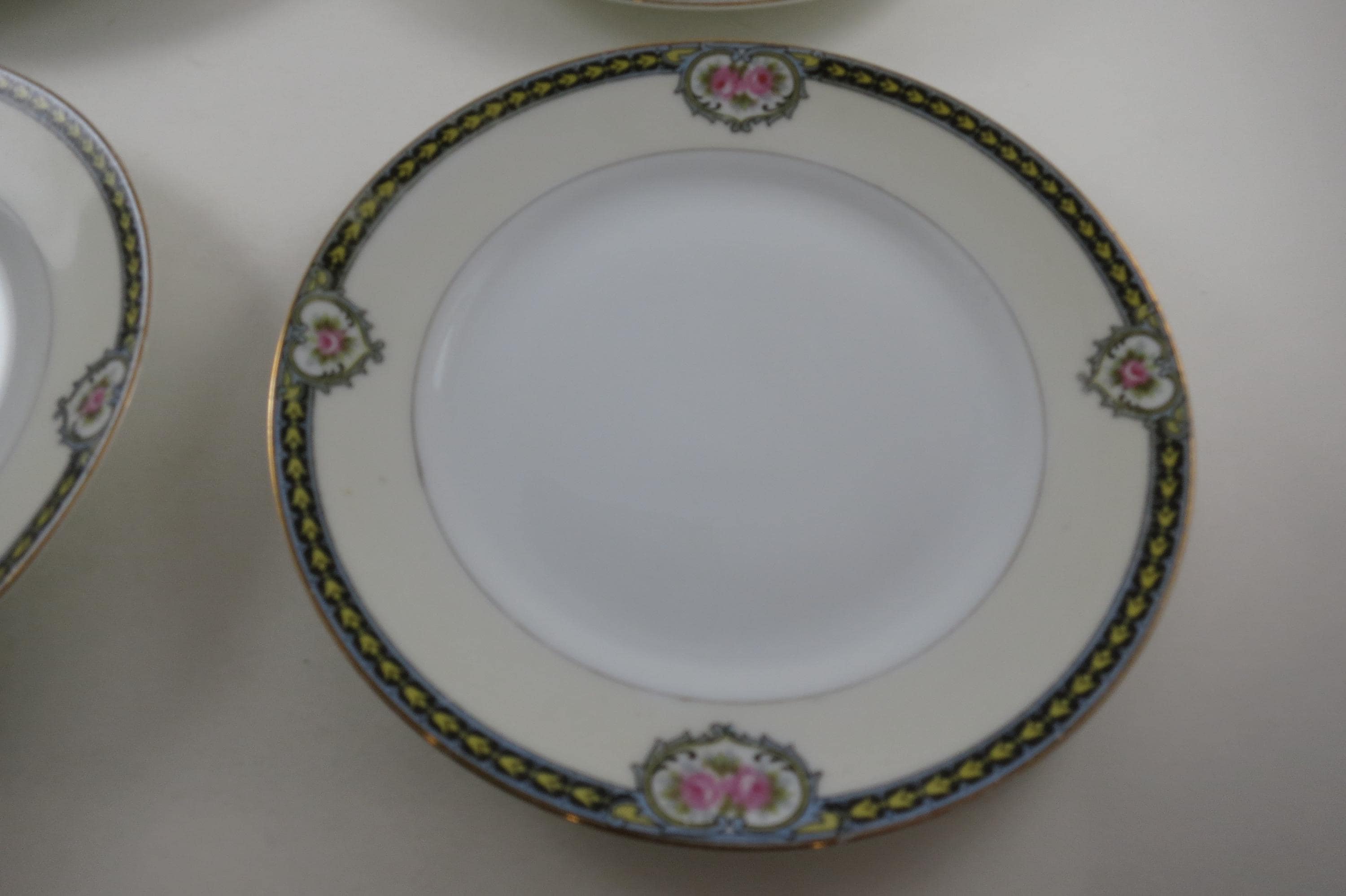 Beautiful Noritake Pattern Produced 1921-1947. Yellow Laurel, Pink Roses and a Black Band. We have a huge set we are listing in several listings, so please see our other items for more pieces.