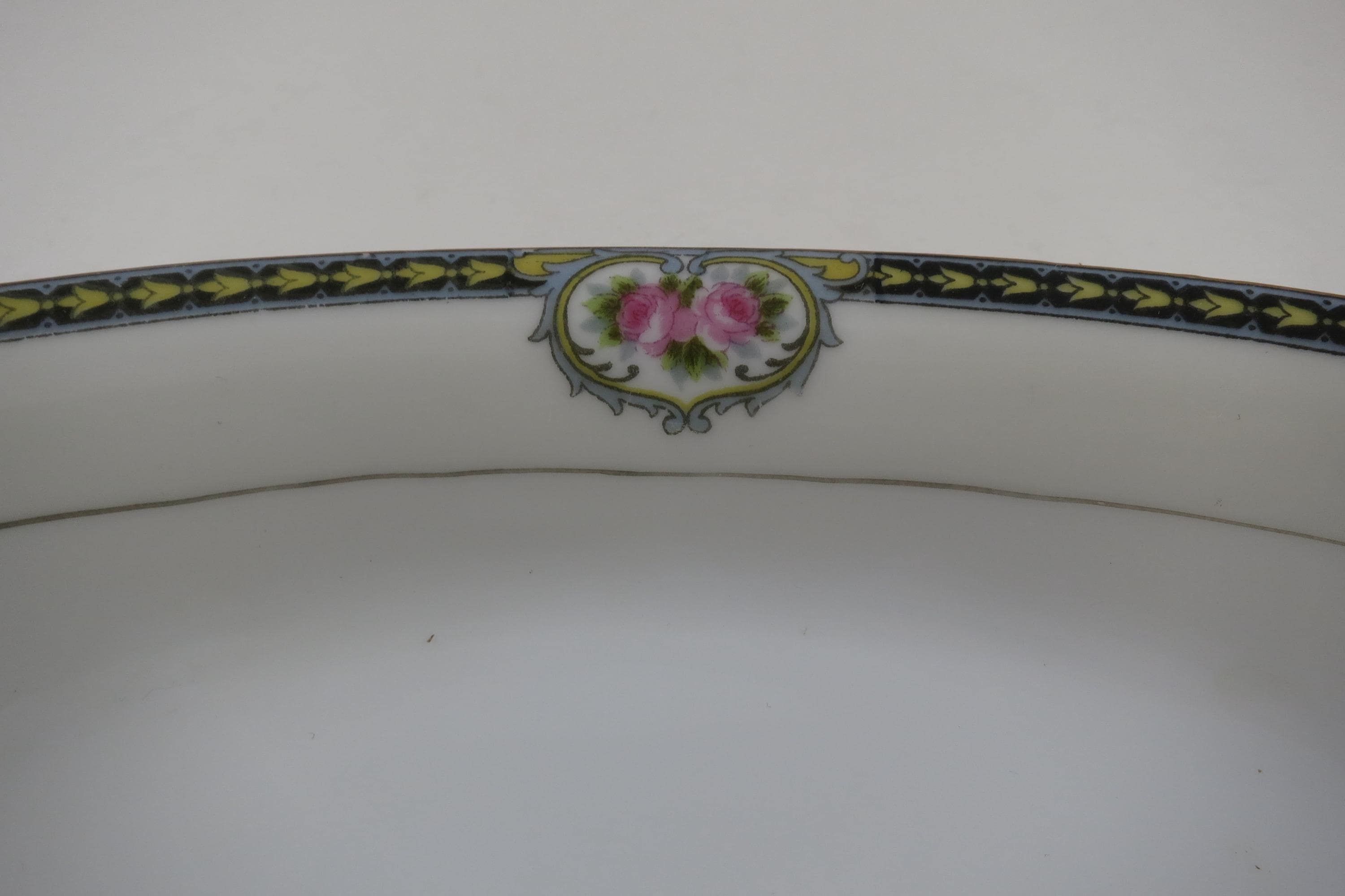 Beautiful Noritake Pattern Produced 1921-1947. Yellow Laurel, Pink Roses and a Black Band. We have a huge set we are listing in several listings, so please see our other items for more pieces.