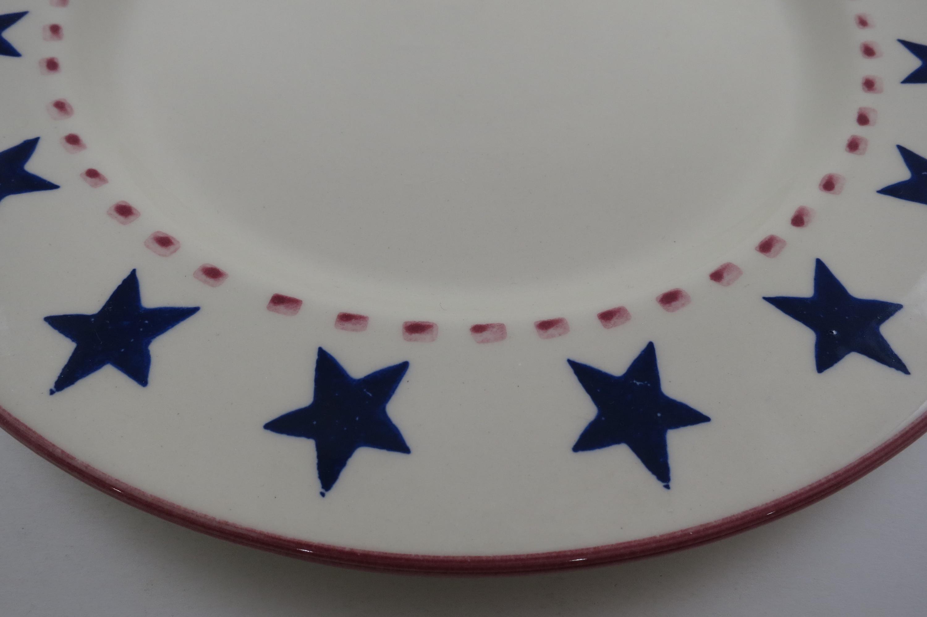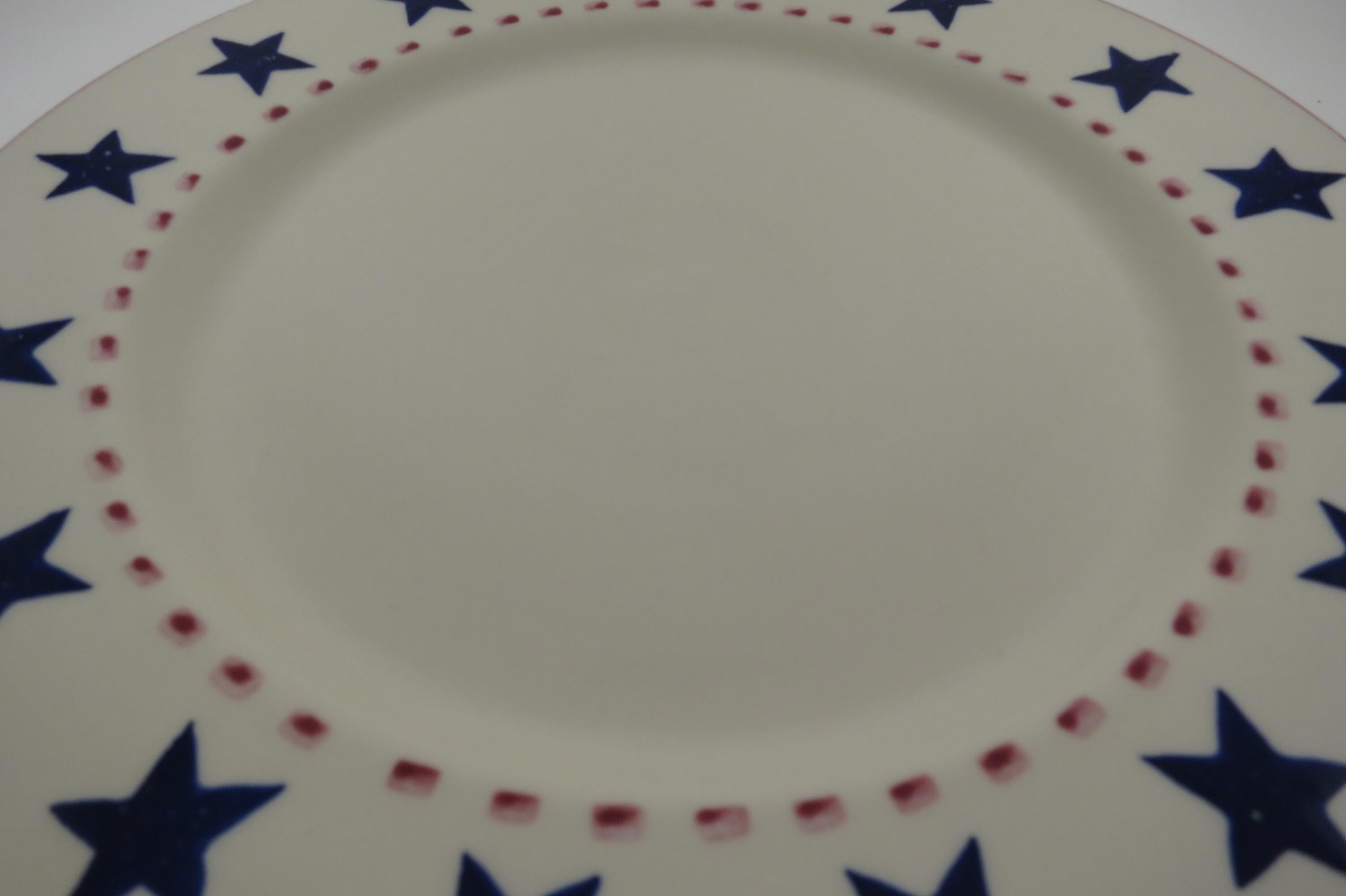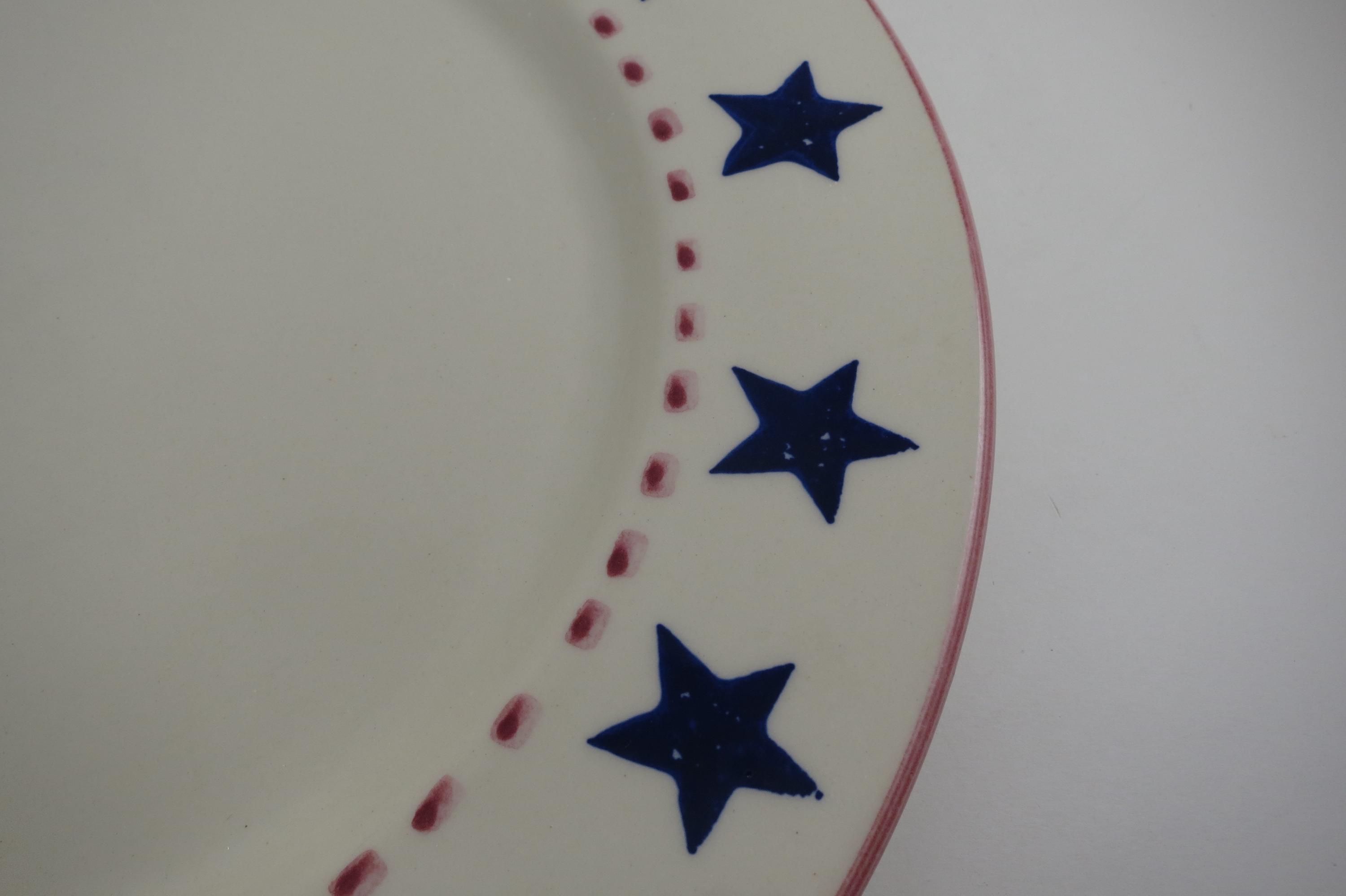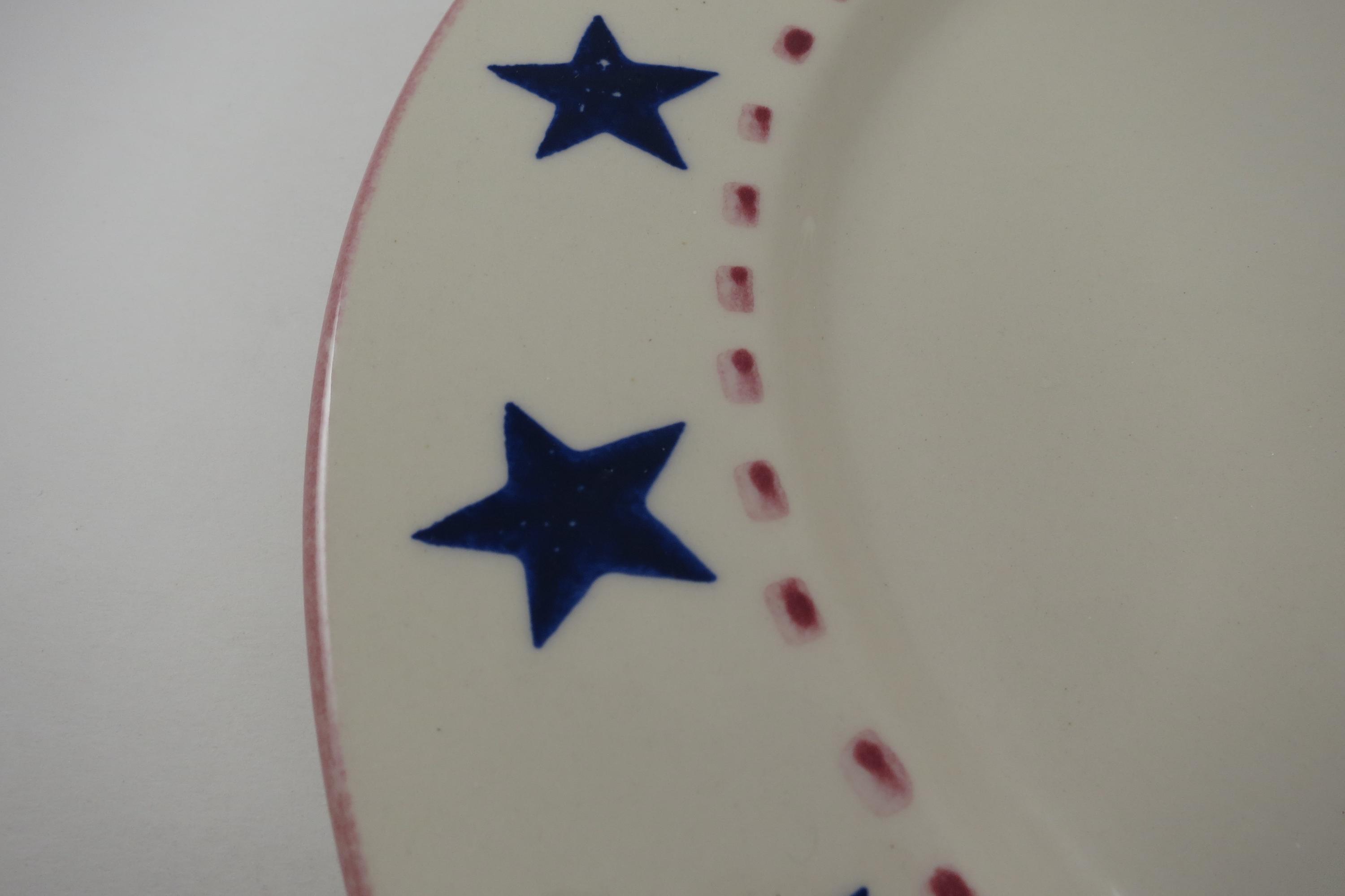 Beautiful old platter, measuring 12 1/4 inches diameter. White with a red border and blue stars. Hartstone Stoneware.