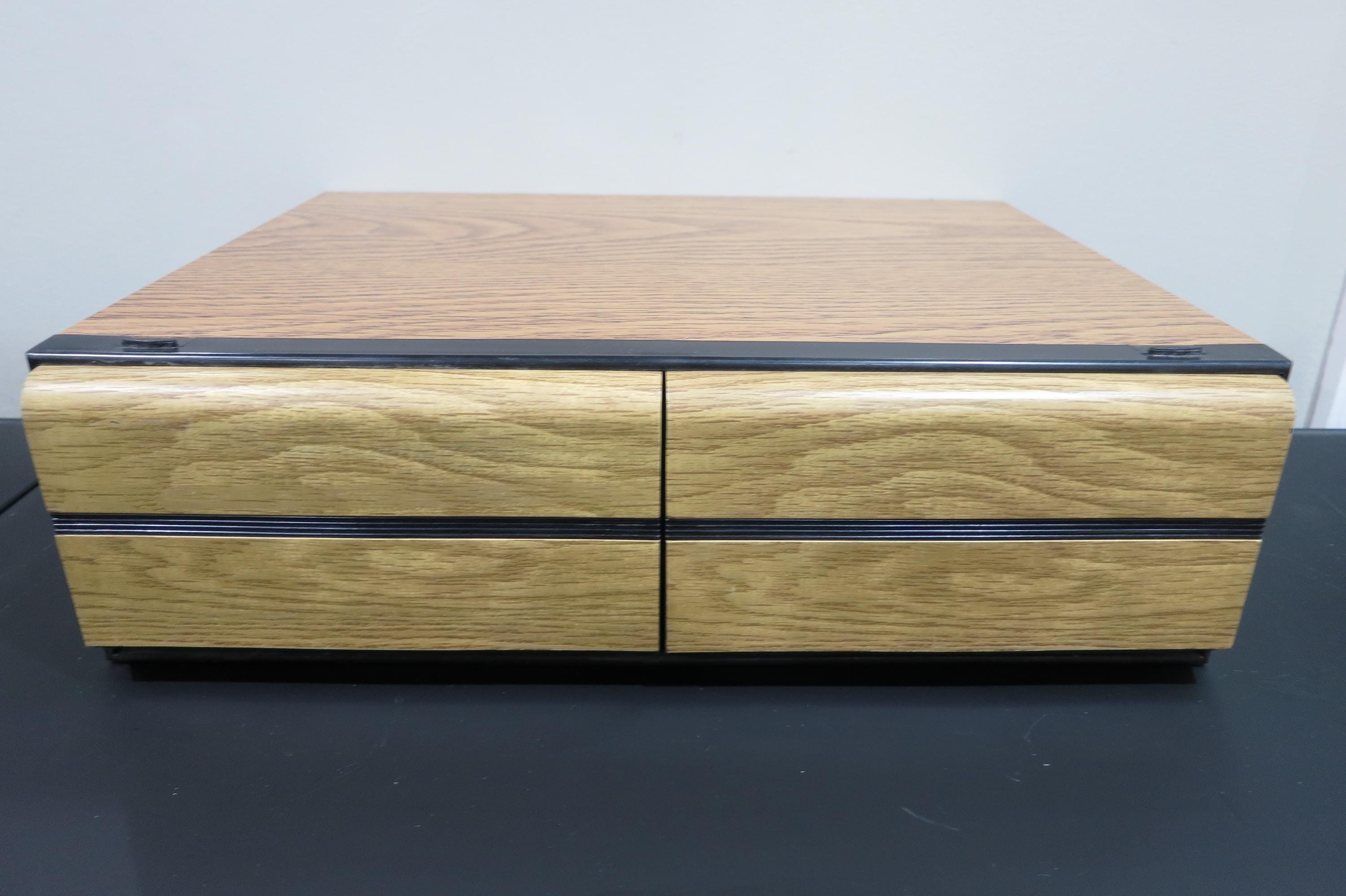 All 18 Tapes were purchased new by my parents and are in excellent condition. The cabinet is in excellent condition as well. It measures 16 1/2 inches wide, 13 inches deep and 5 inches tall. Both drawers slide in and out well. Holds 20 VHS Tapes!