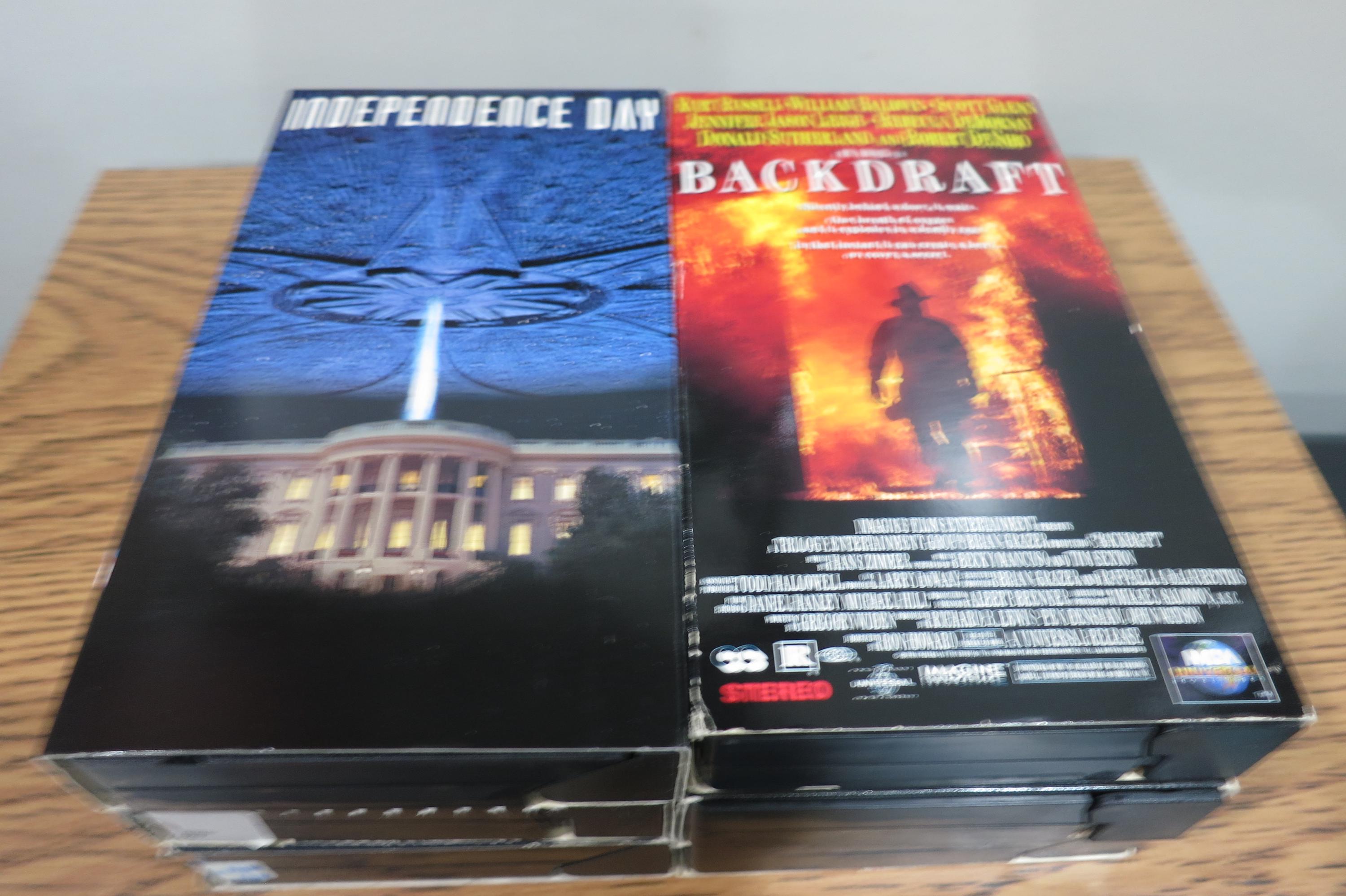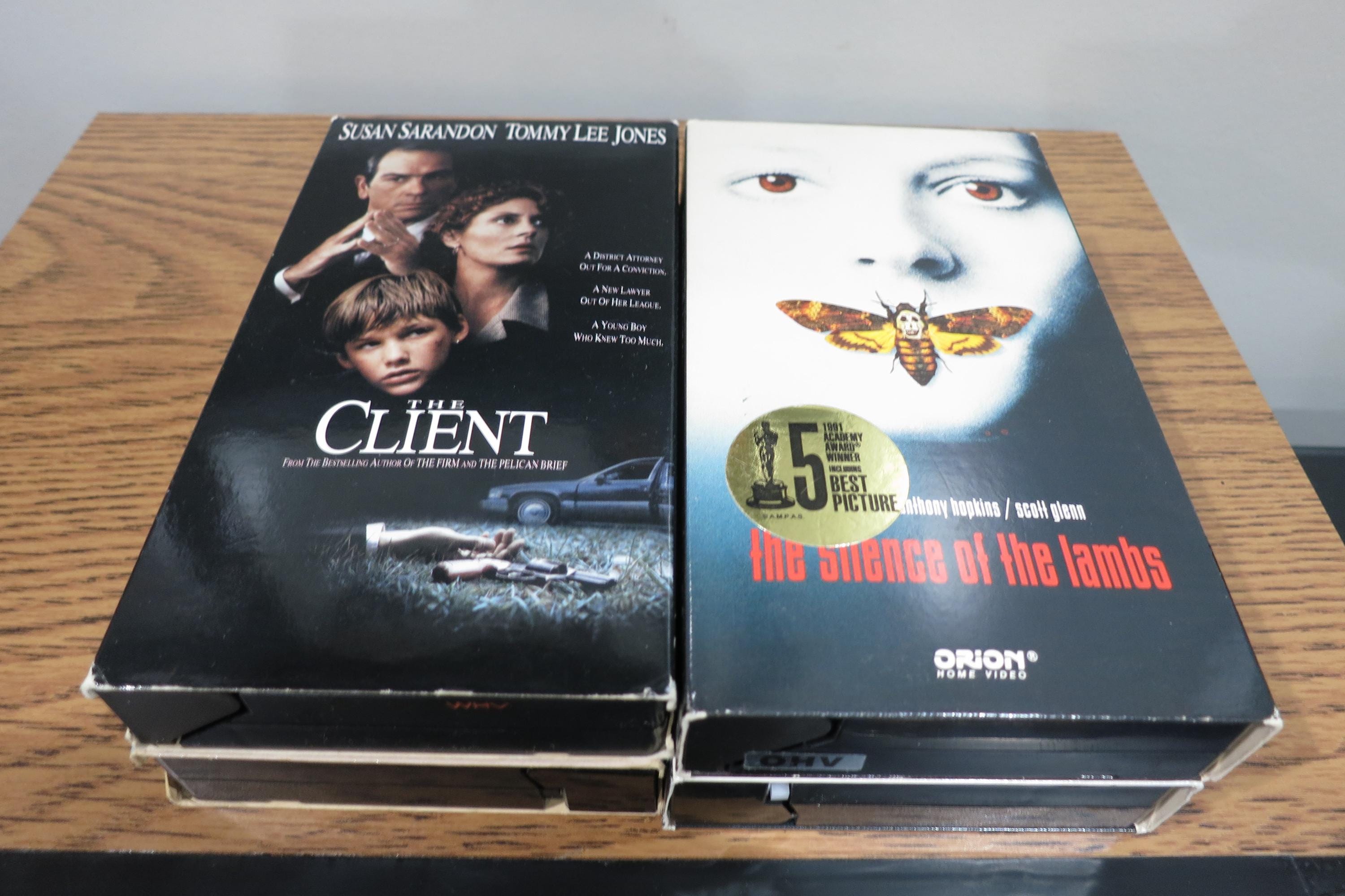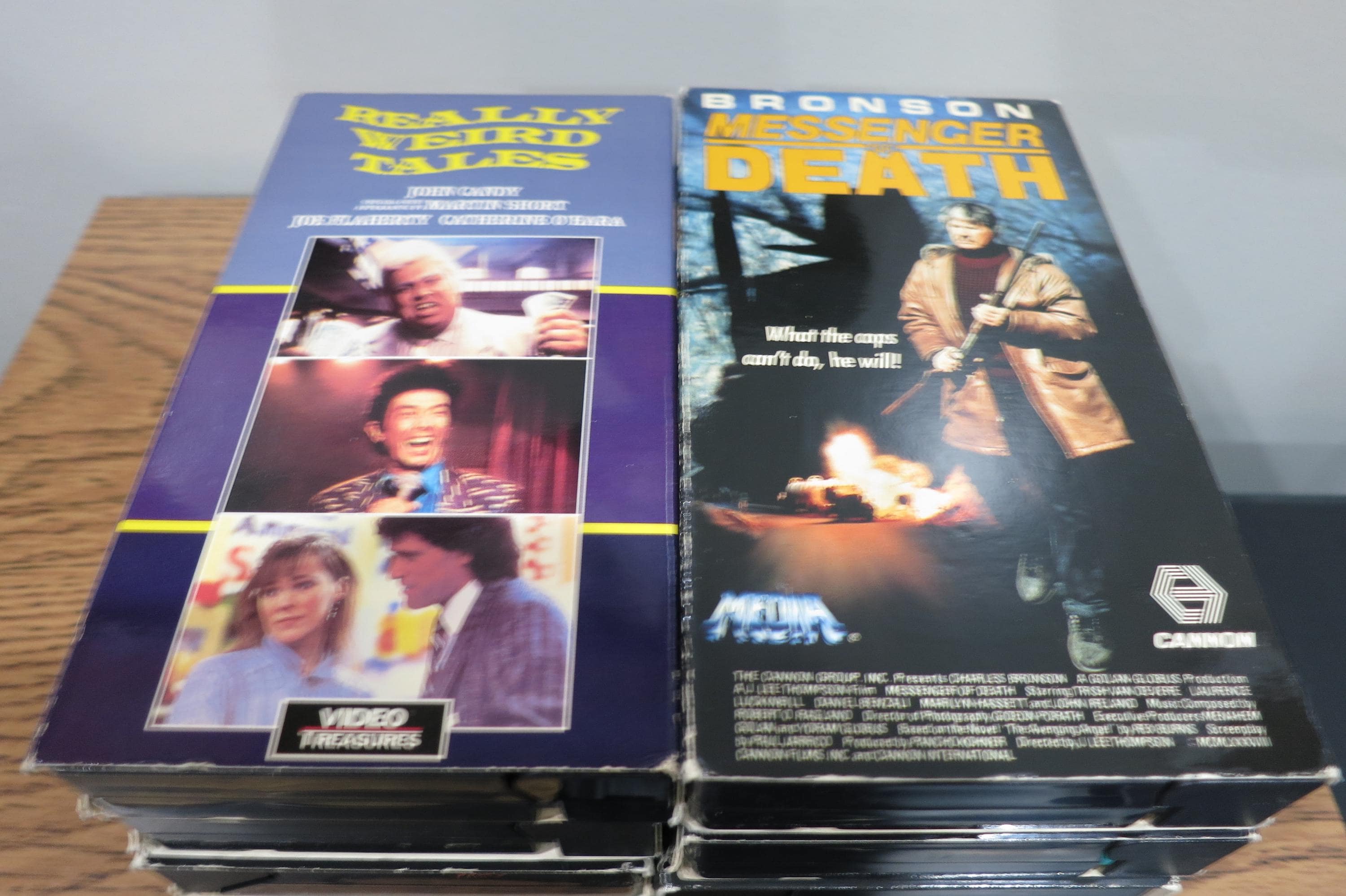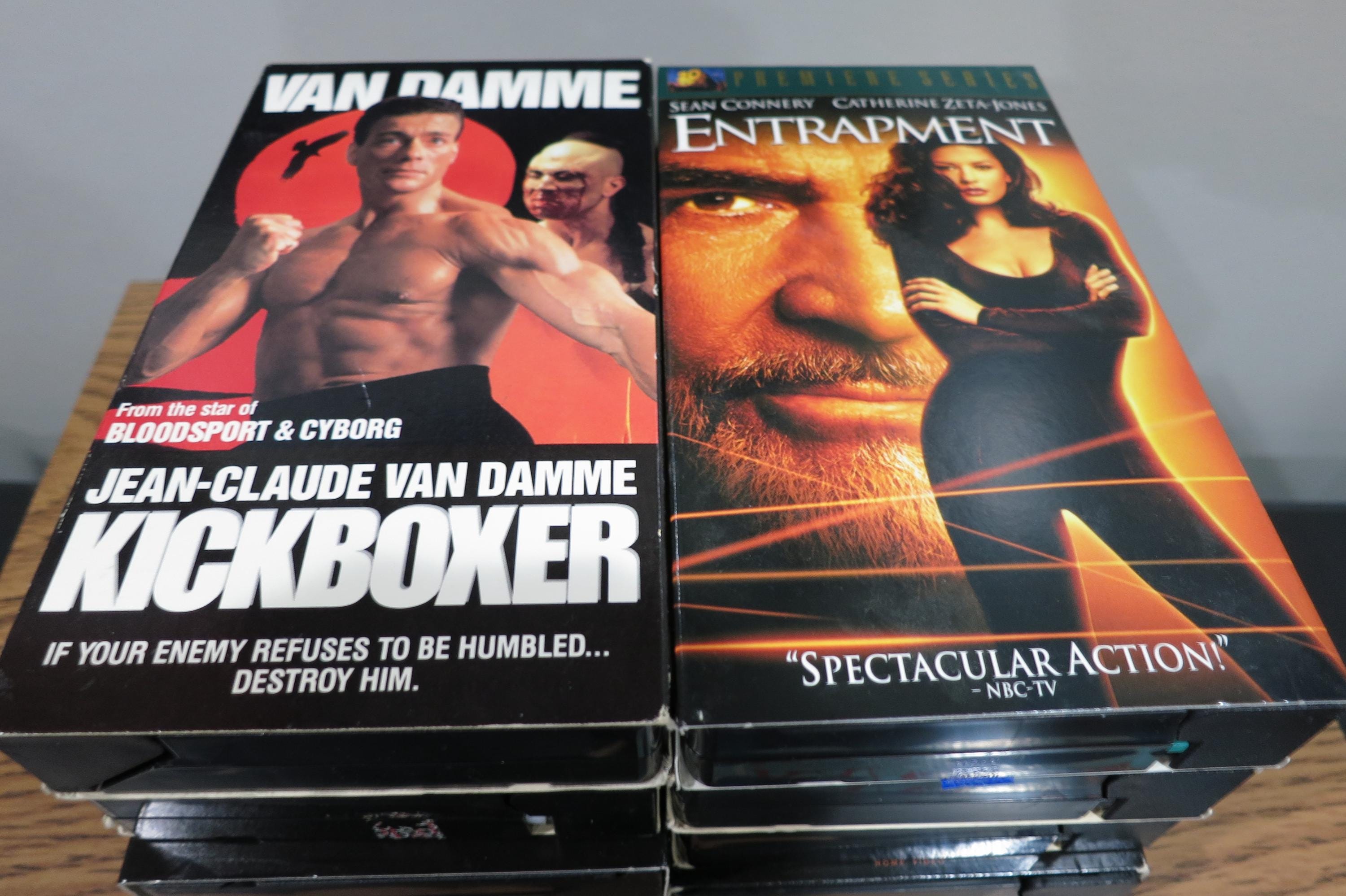 Instant Action/Drama VHS Collection 18 Tapes with Faux Wood Storage Cabinet.