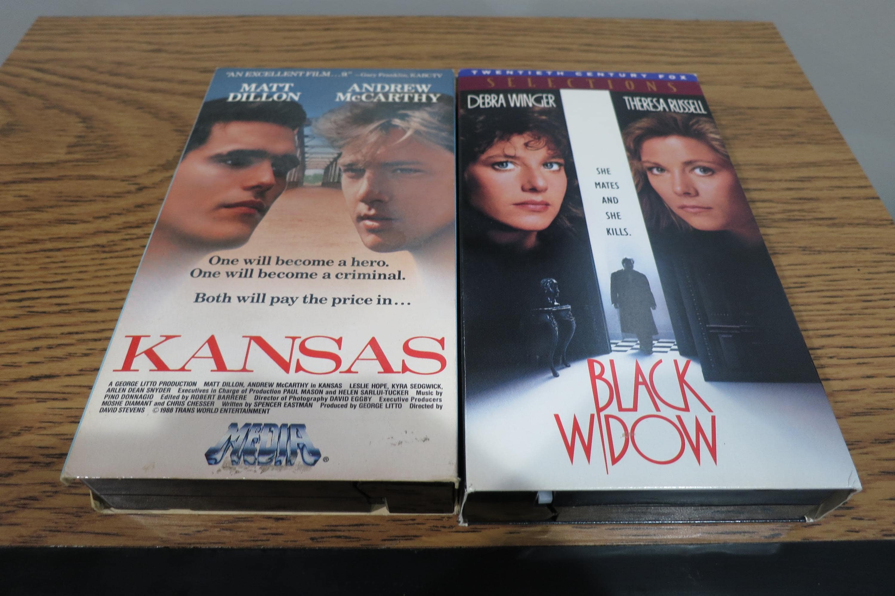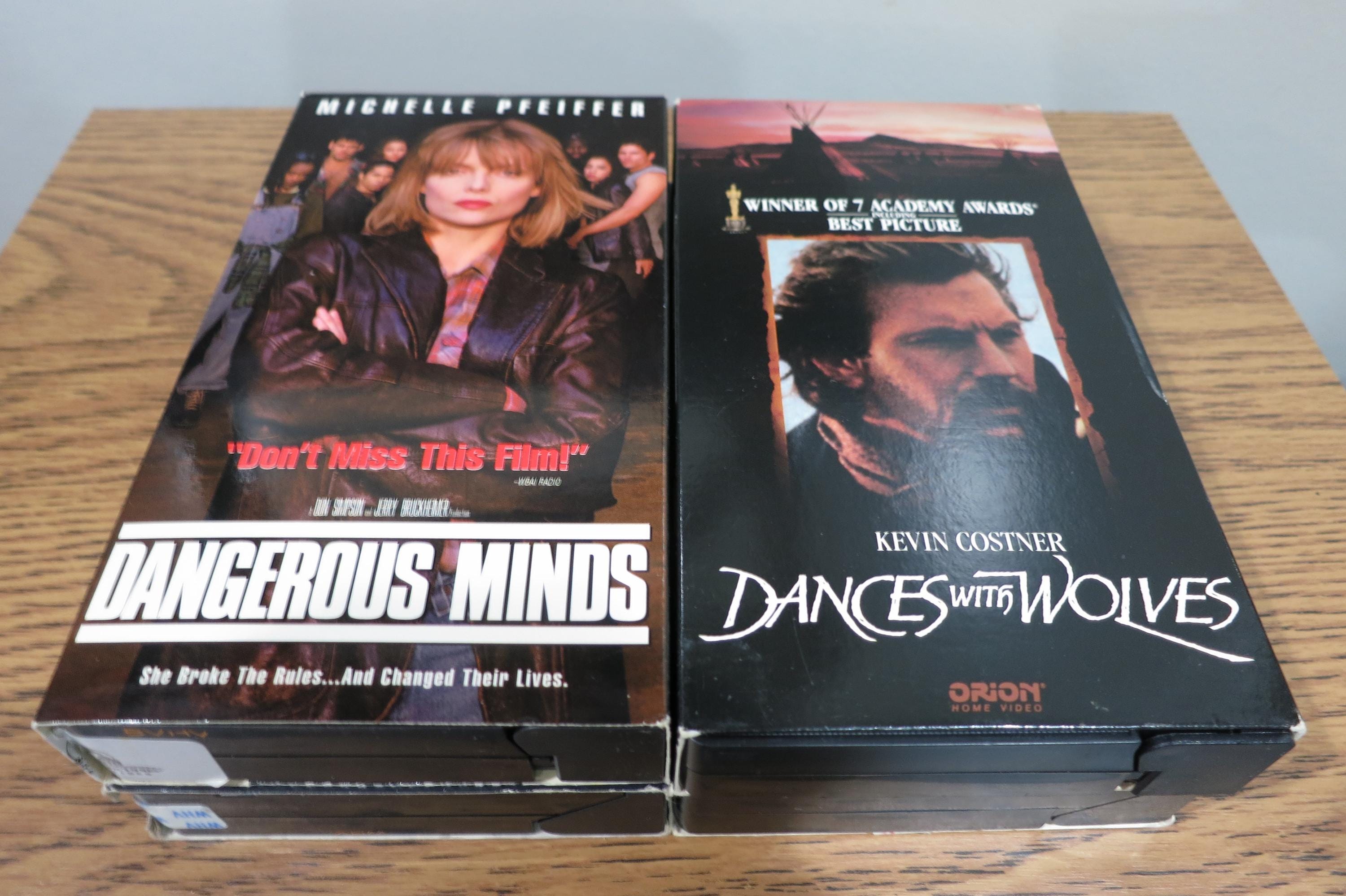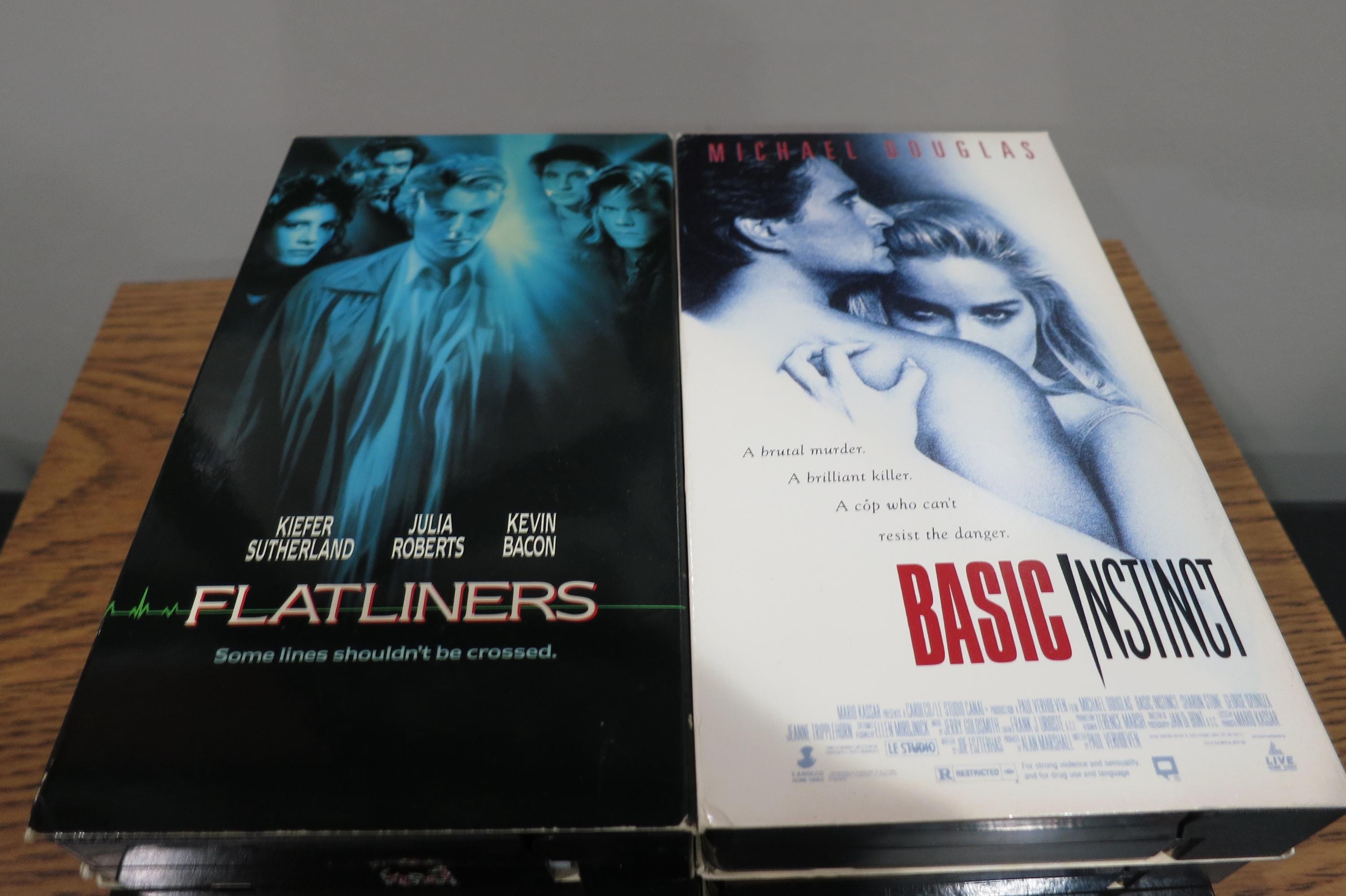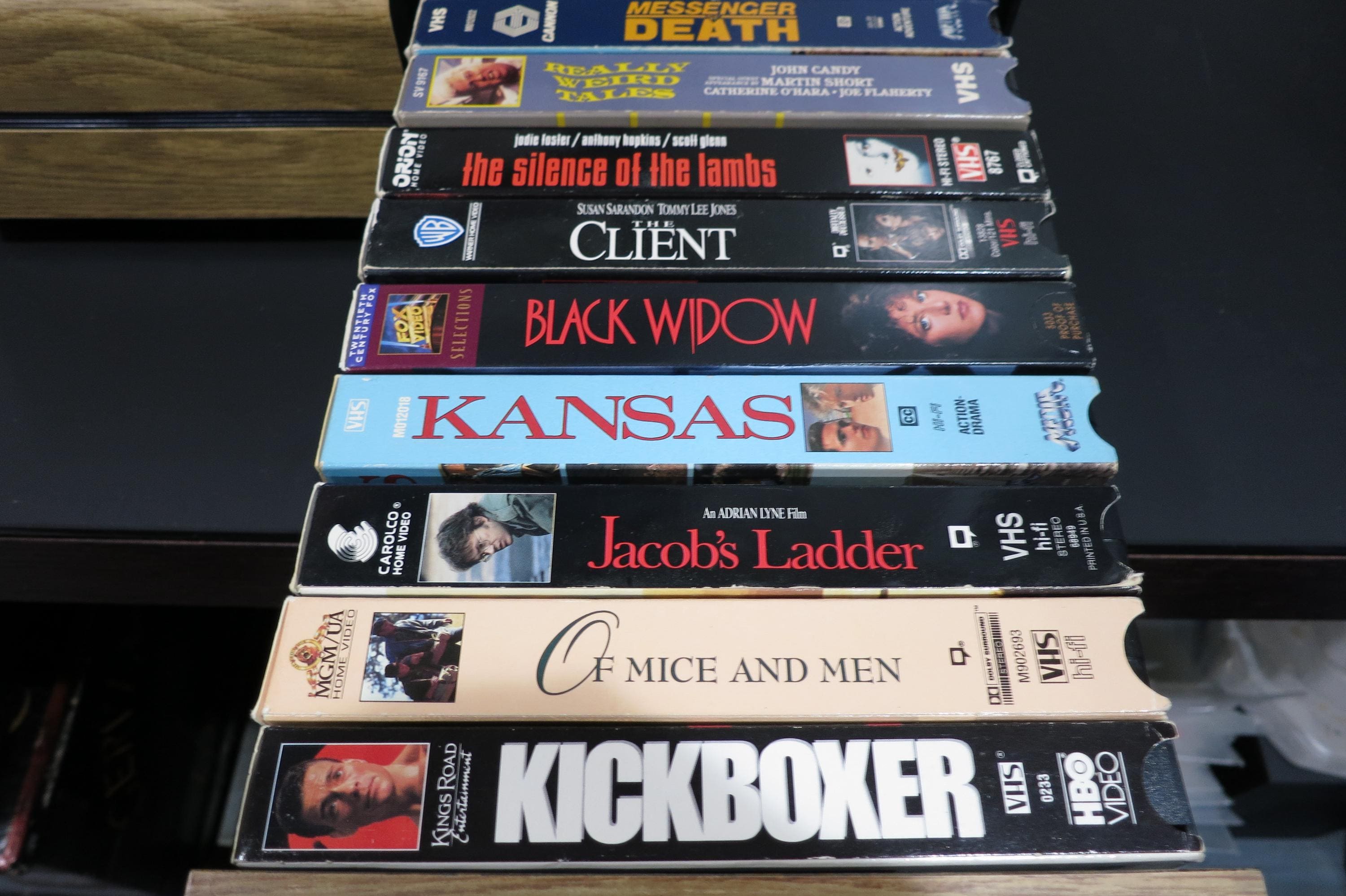 Instant Action/Drama VHS Collection 18 Tapes with Faux Wood Storage Cabinet.