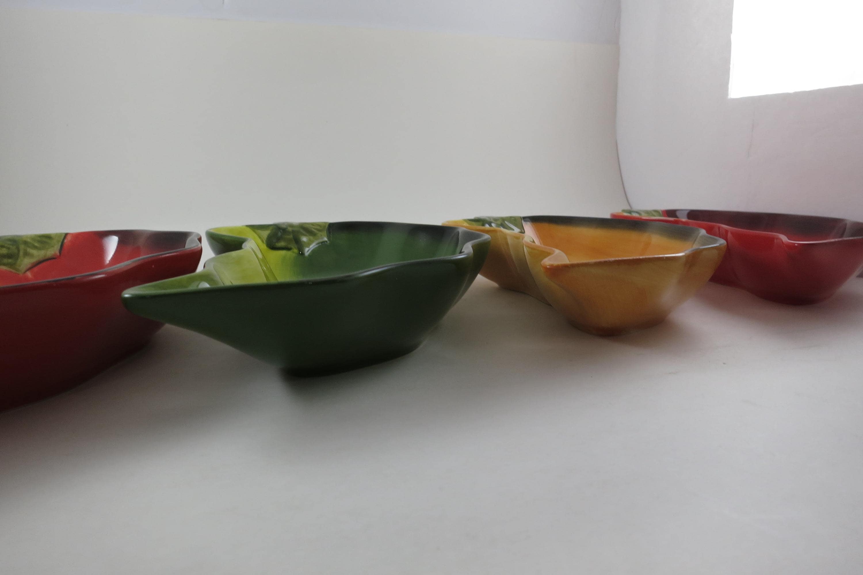 All four are perfect and like new. One Green, One Yellow, Two slightly different shades of red. Each measures 9 inches long, and 5 inches wide.