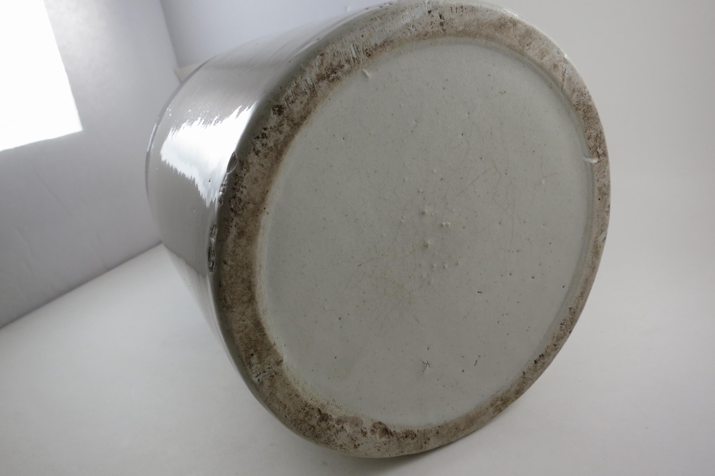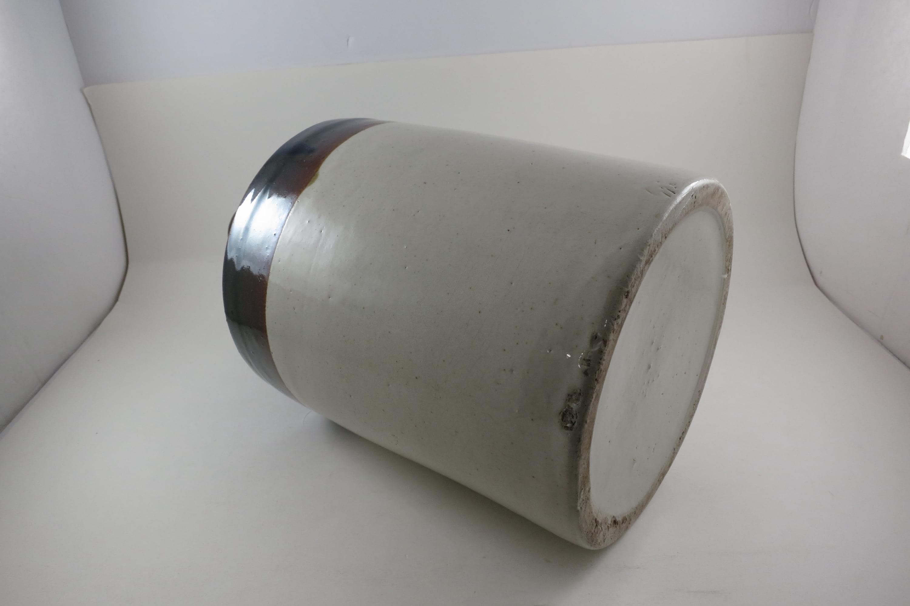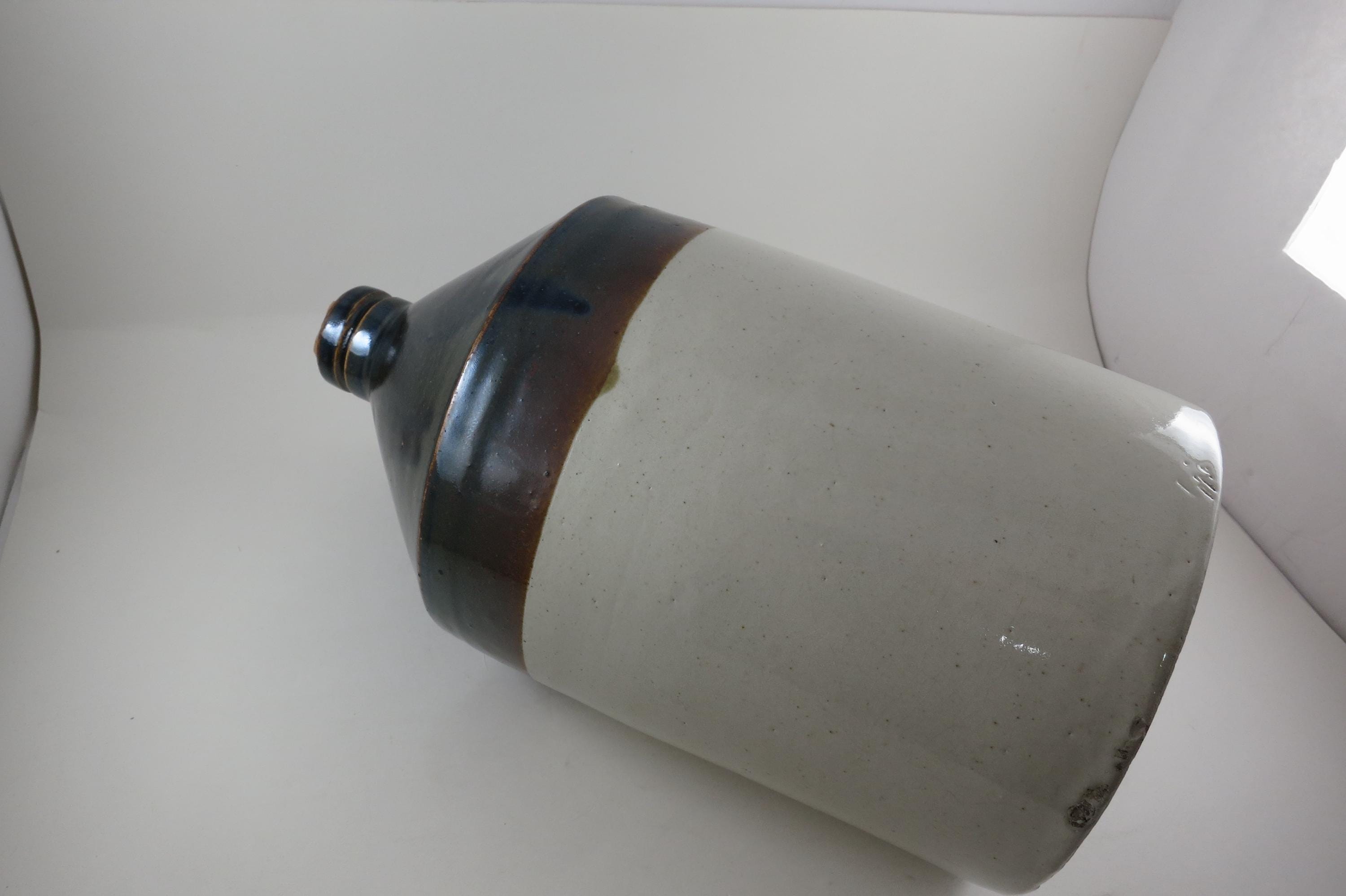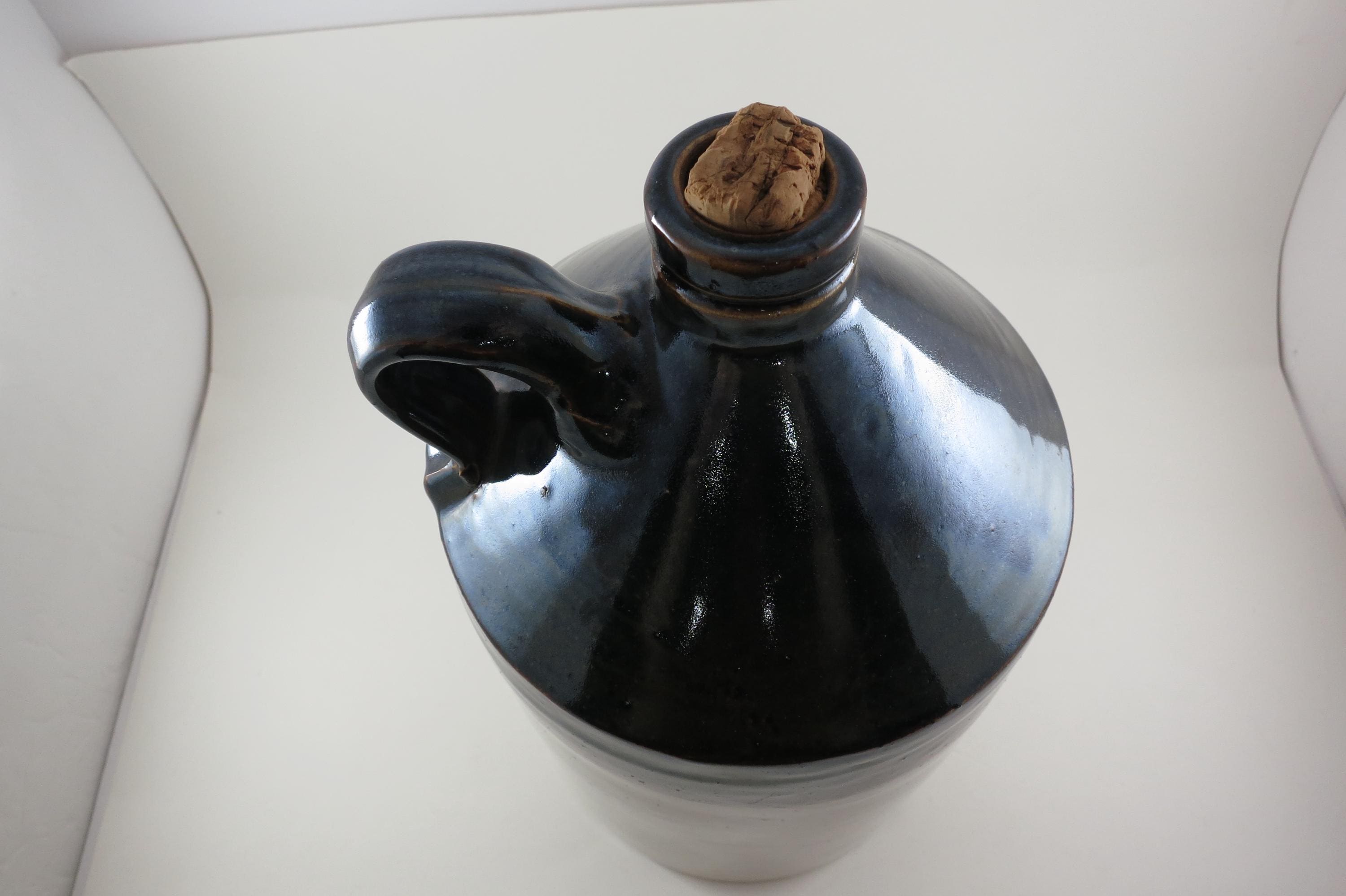 This Stoneware Jug measures 12 inches tall and is 6 1/2 inches wide. It has no makers marks, nor does it have any chips, cracks or damages. We offer free shipping on all orders over 35 dollars.