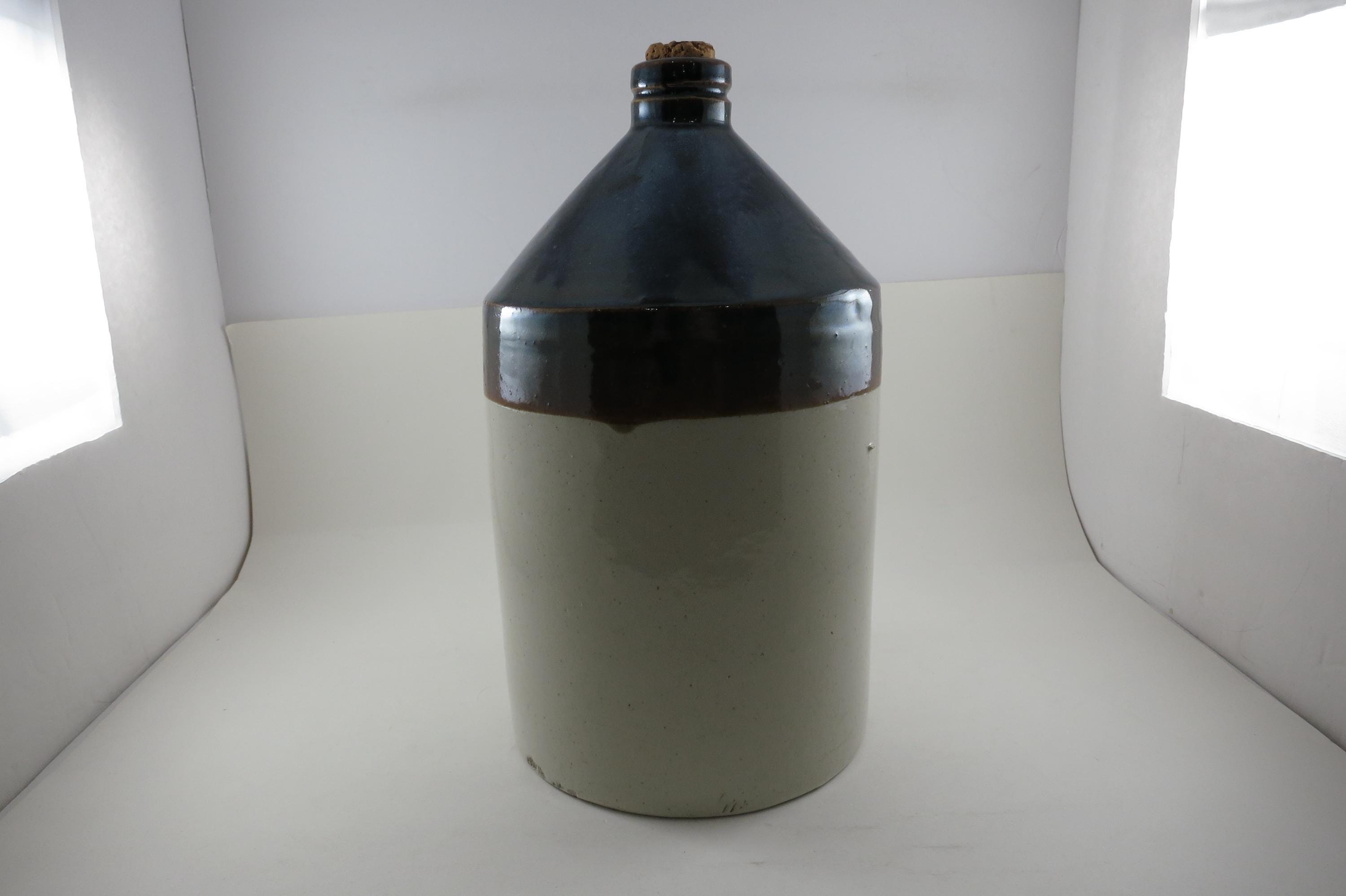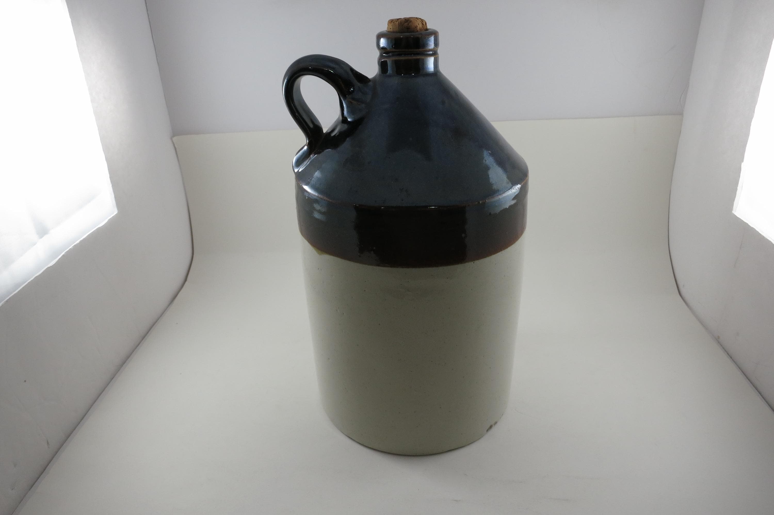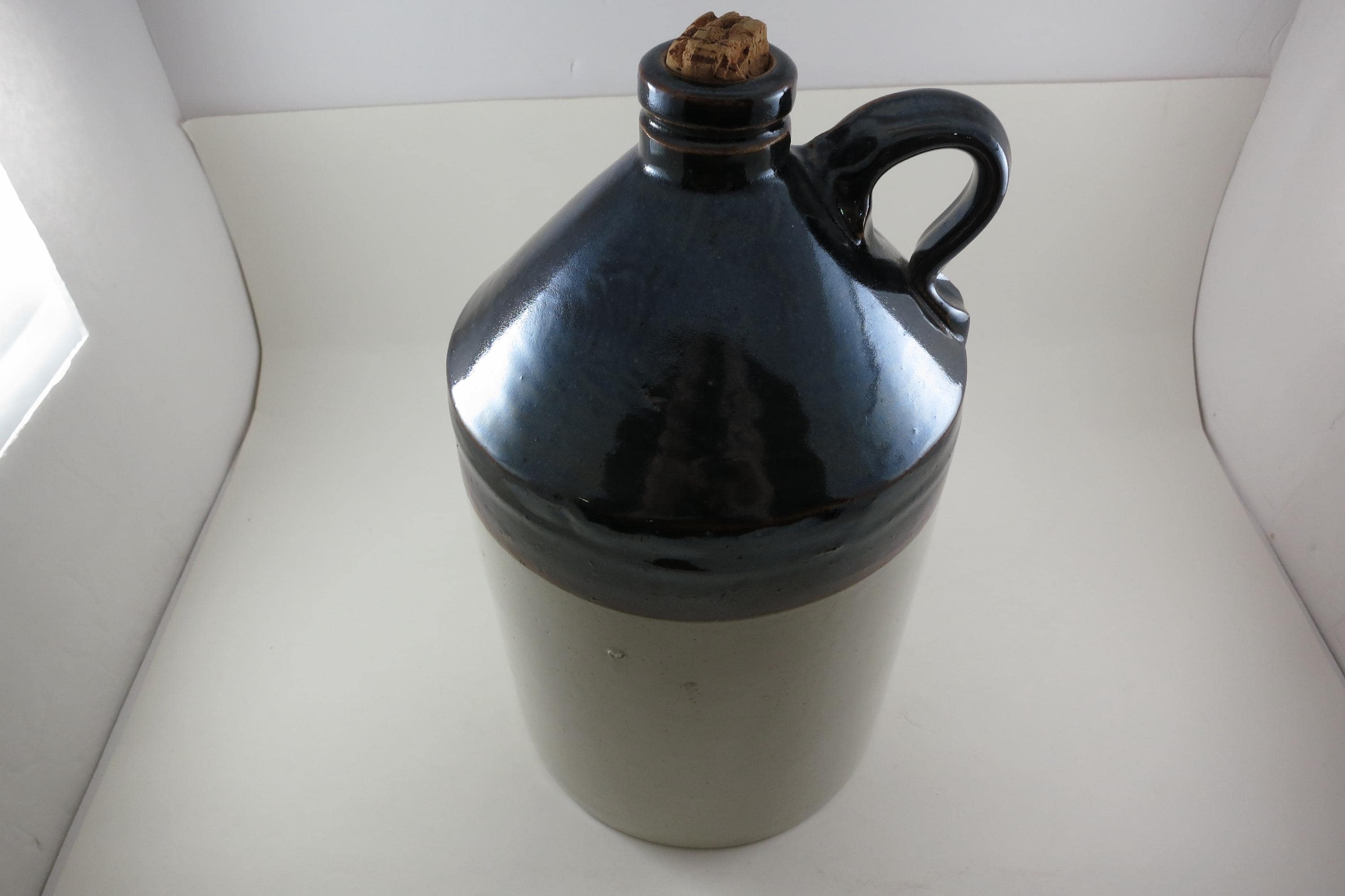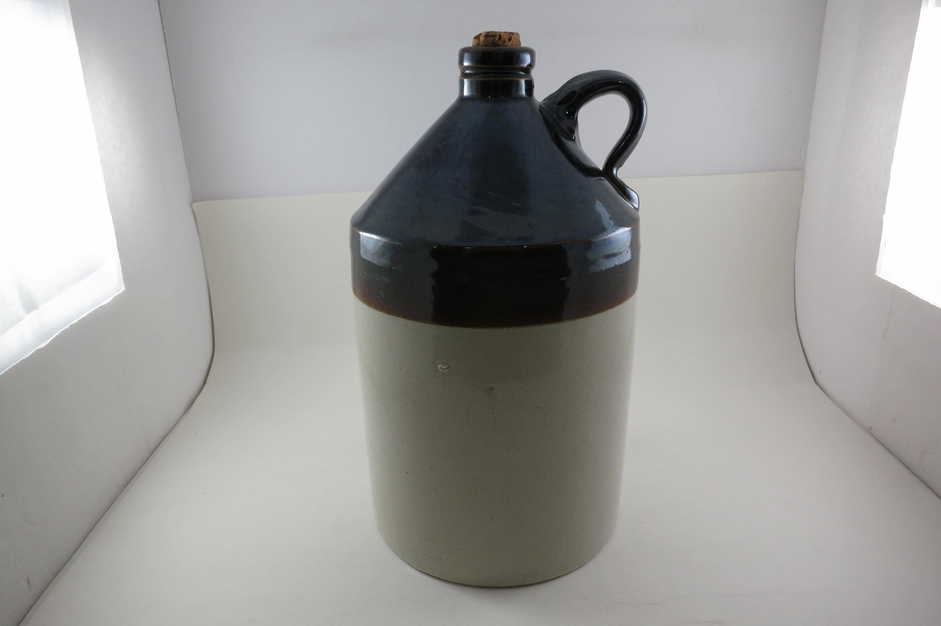 Vintage Stoneware Pottery Jug: Large Beige & Brown Rustic Decor with Cork Stopper. Fabulous addition to any home or collection.