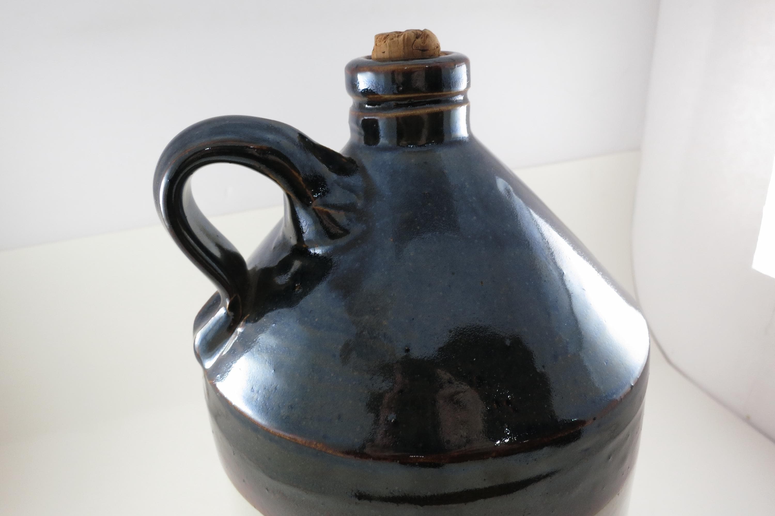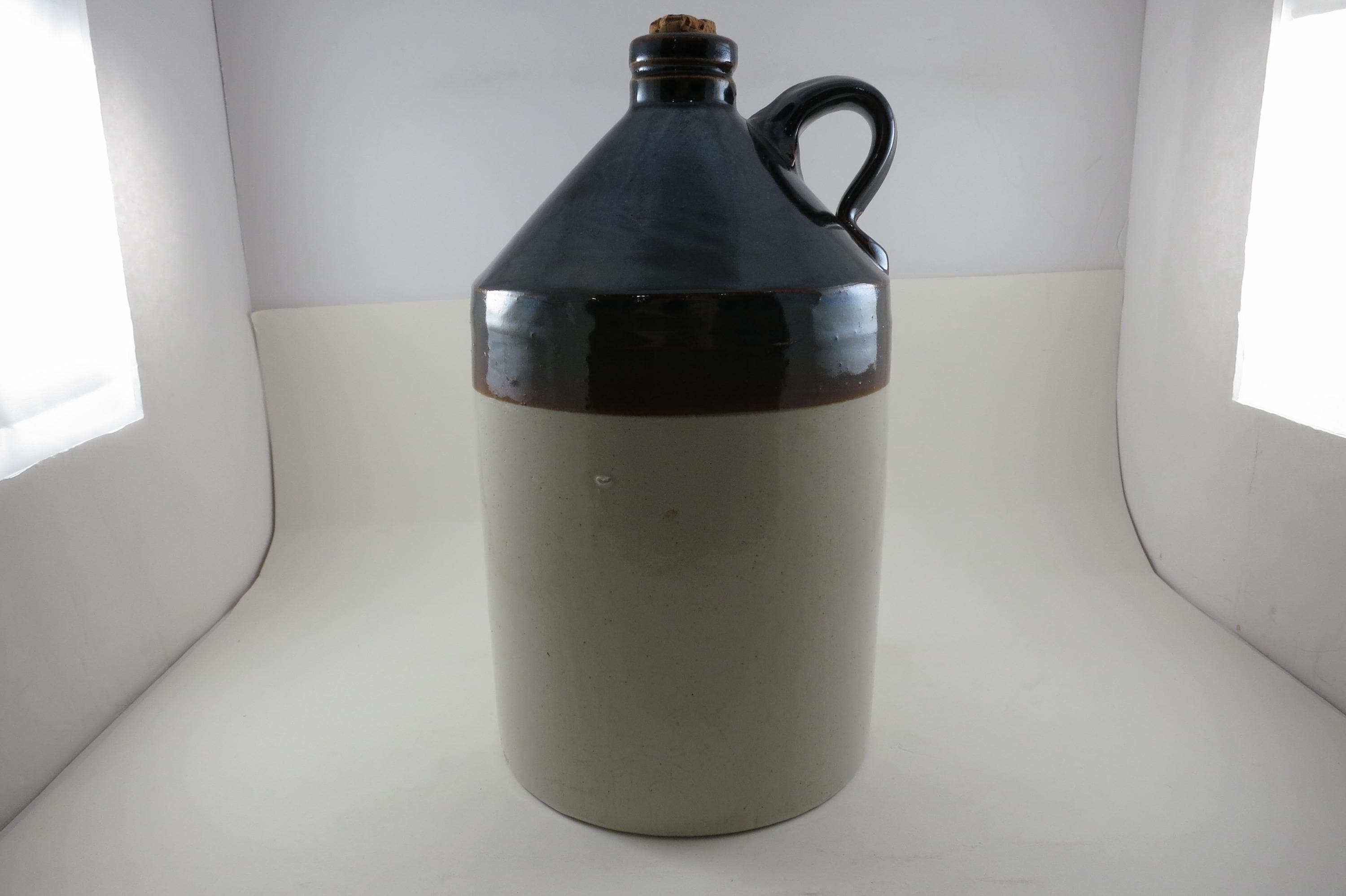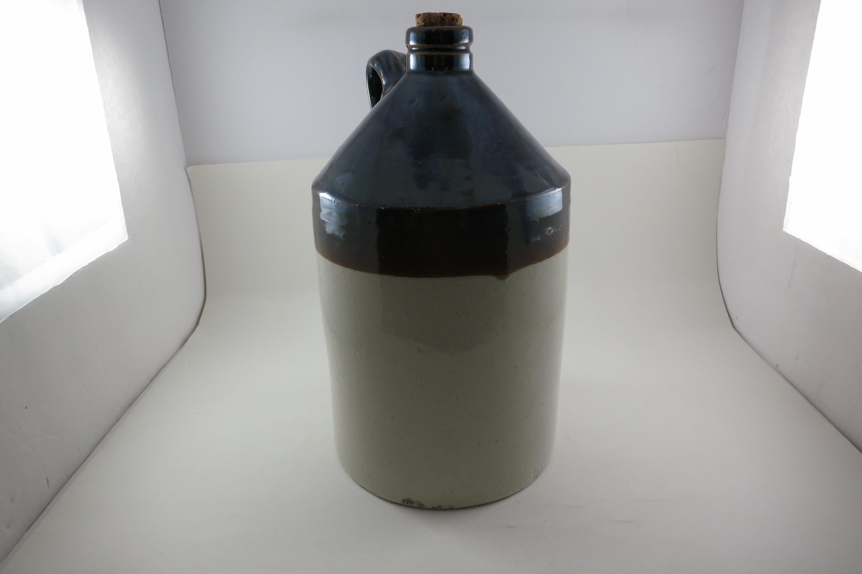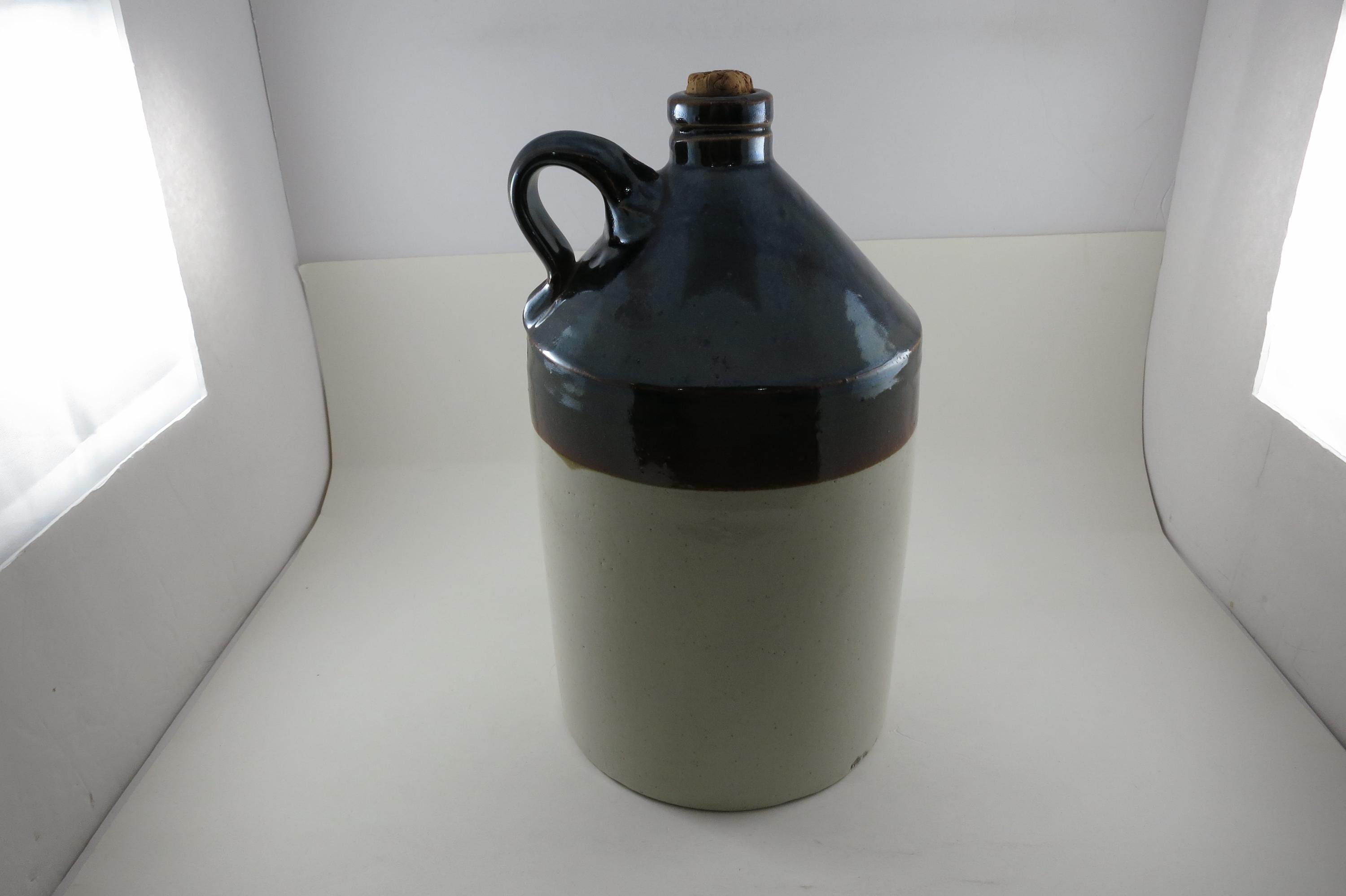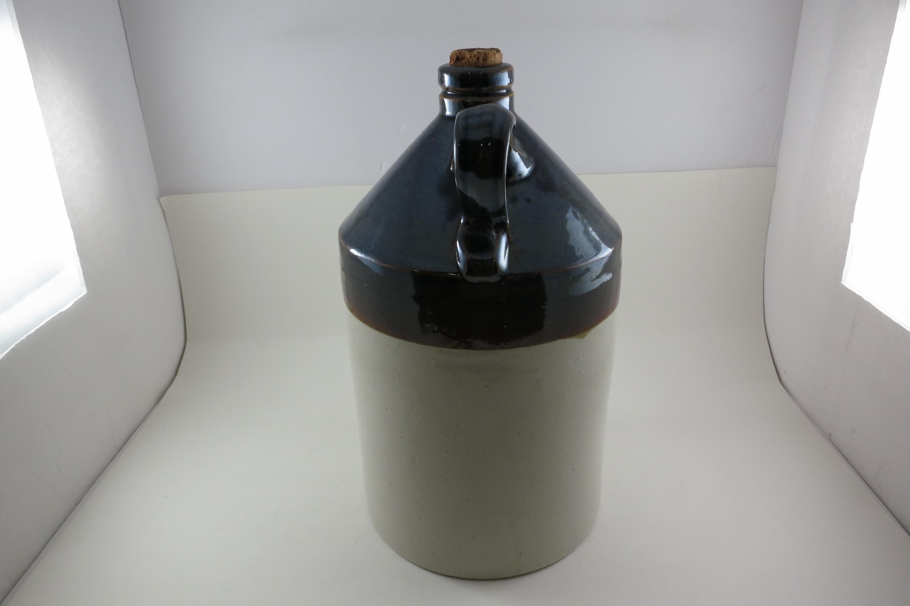 Vintage Stoneware Pottery Jug: Large Beige & Brown Rustic Decor with Cork Stopper. Fabulous addition to any home or collection.