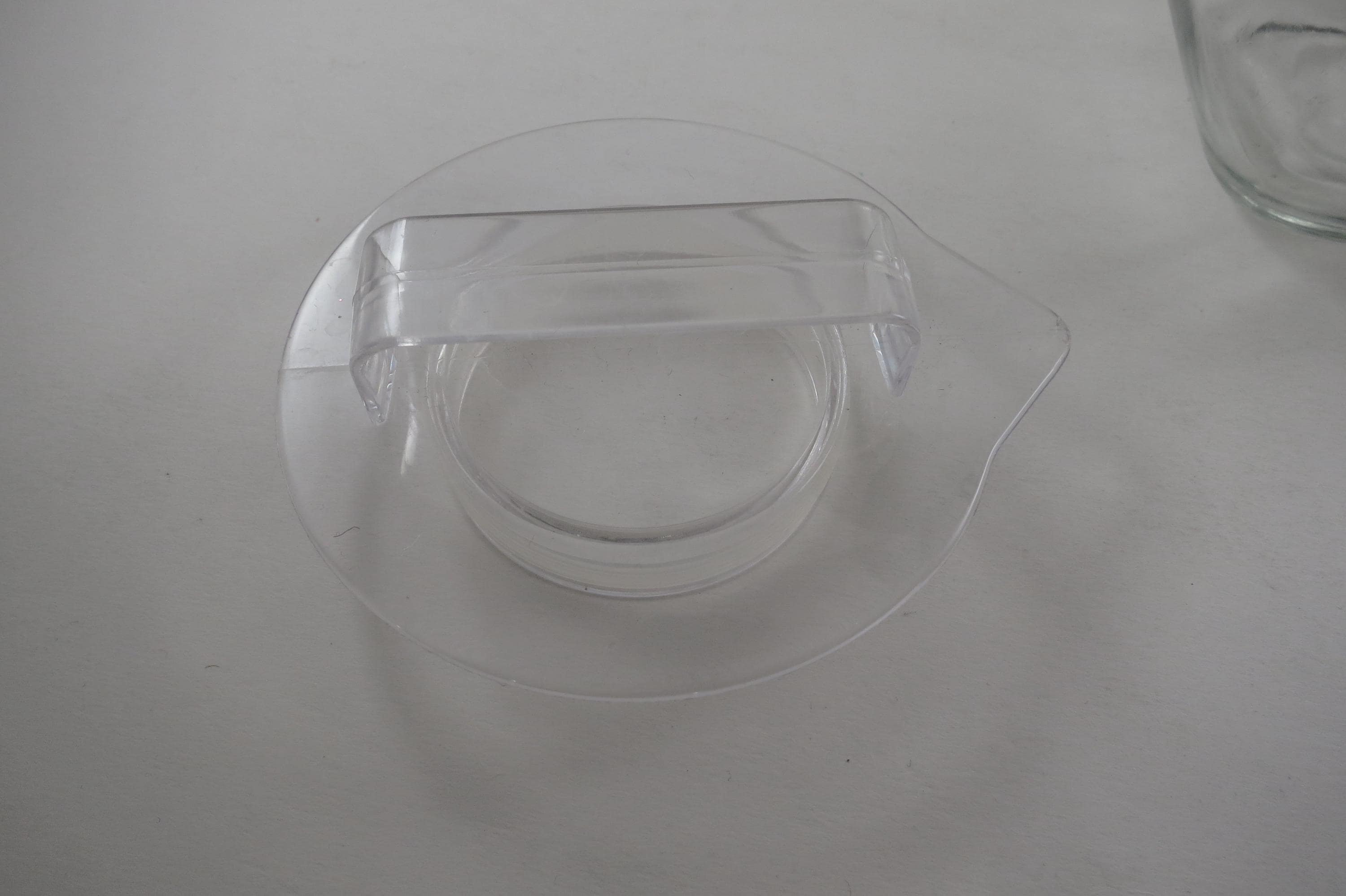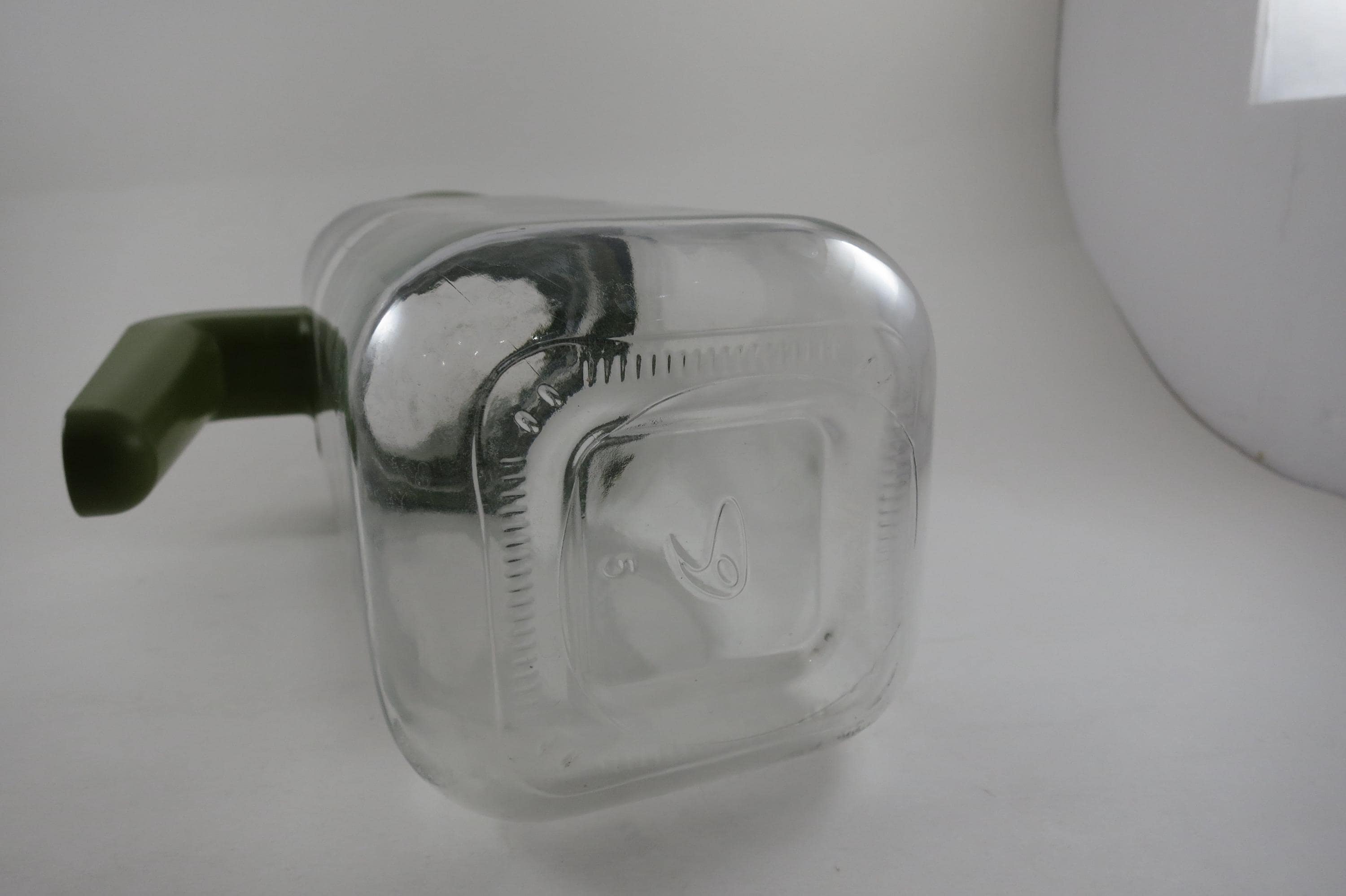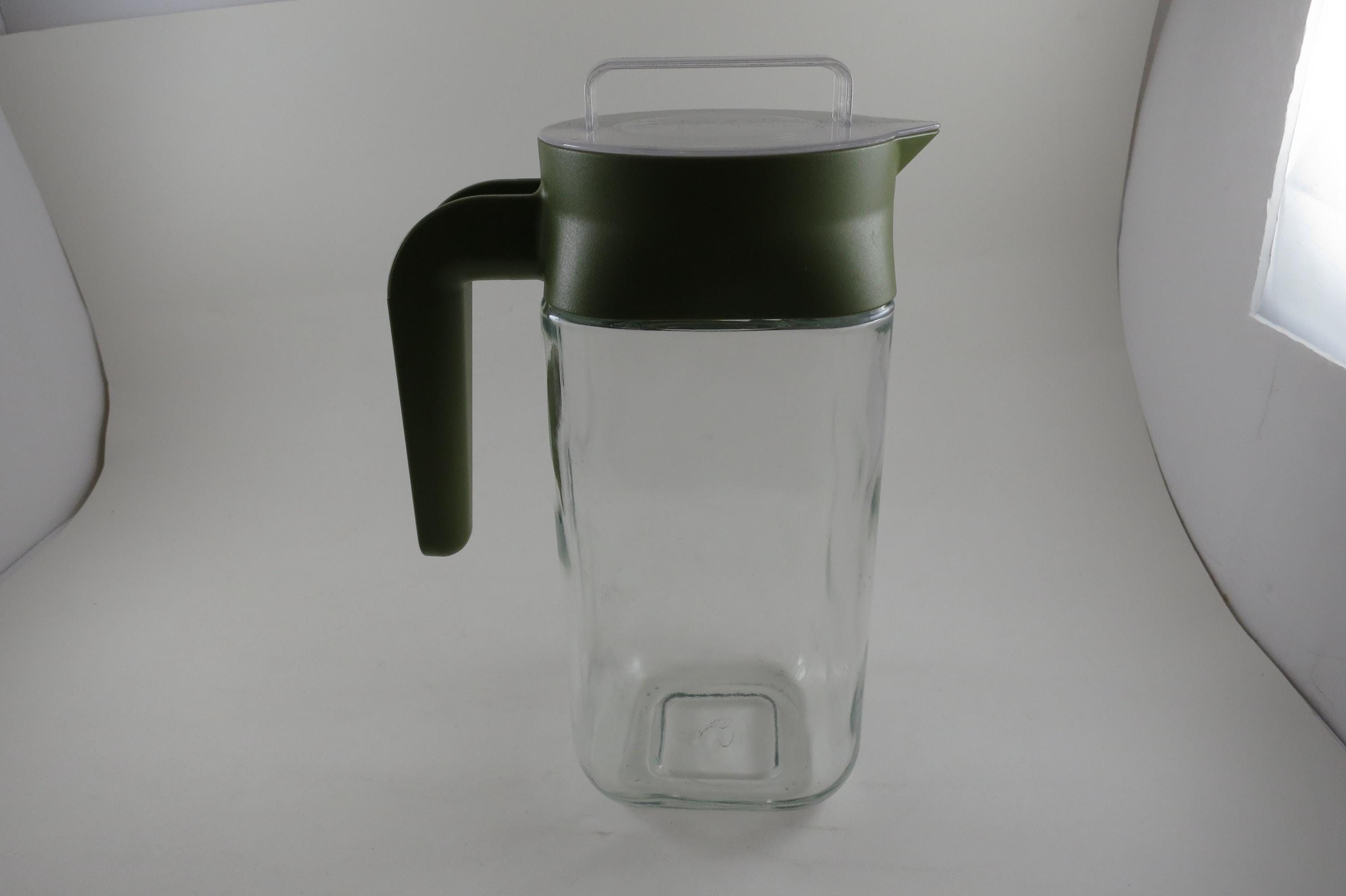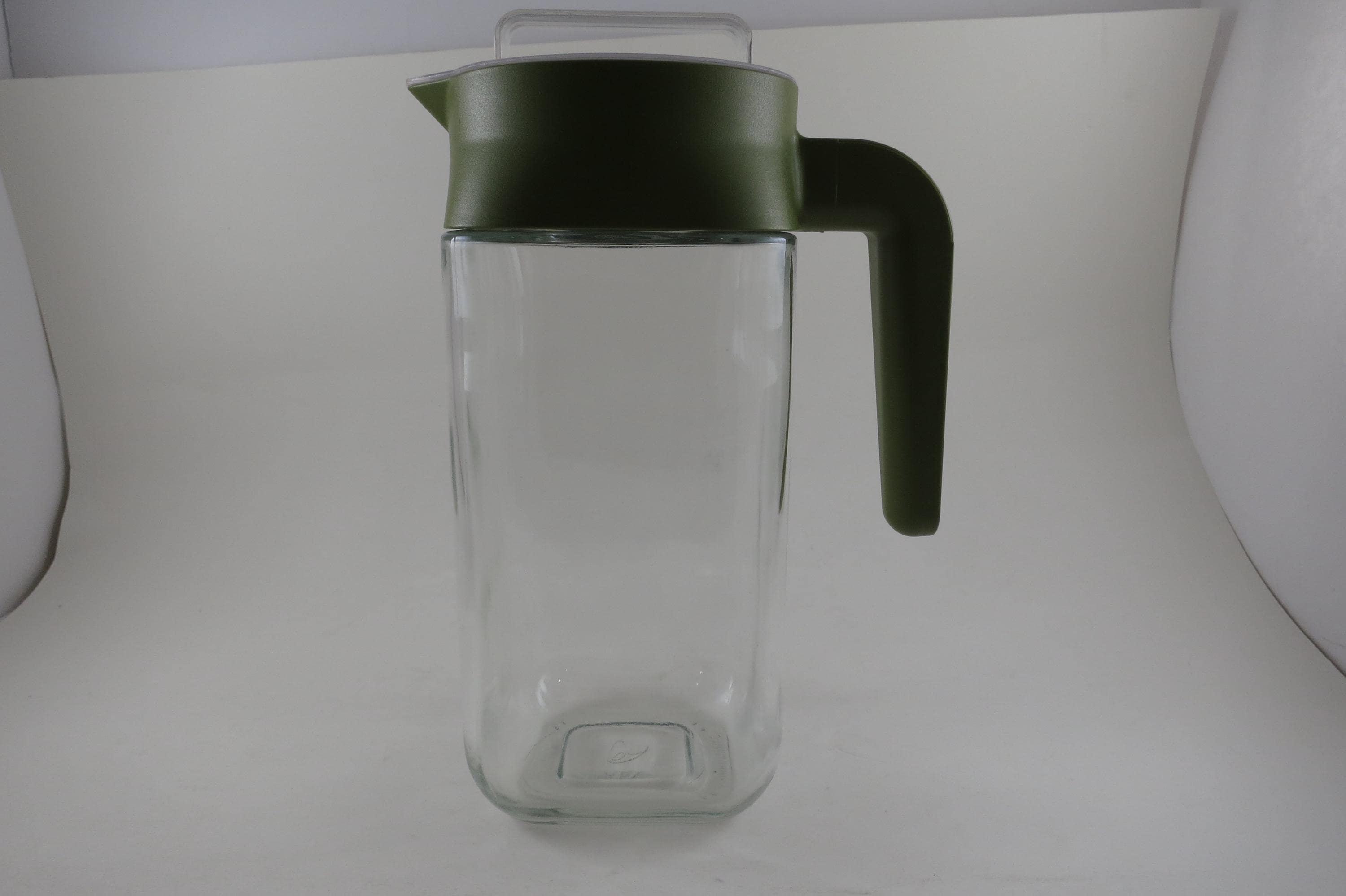 Vintage ARC France Ribbed Glass Juice/Water Jar Green Top and Plastic Lid. Measures 9 1/4 Inches Tall. Excellent Condition with No chips, cracks or damages.