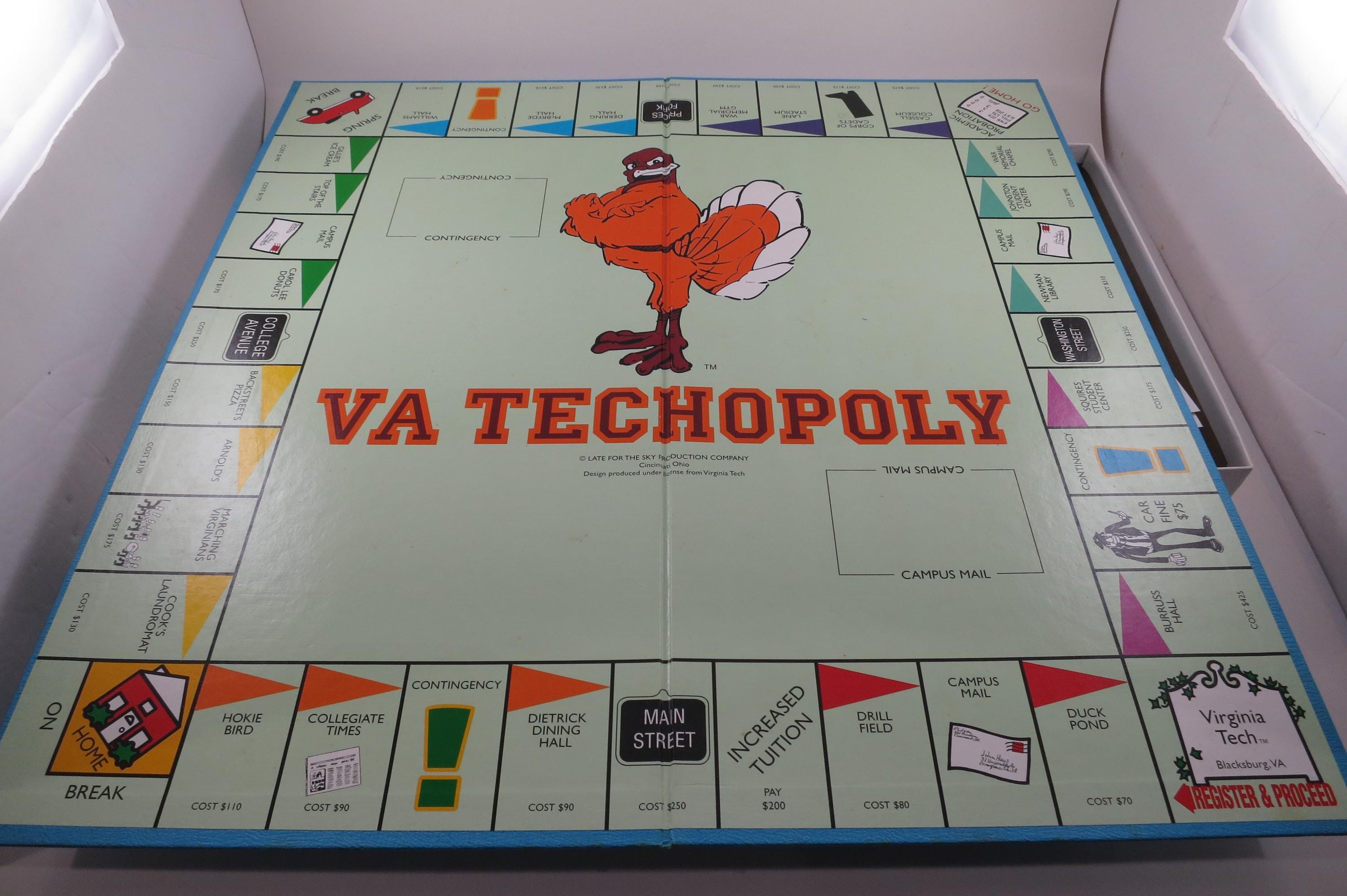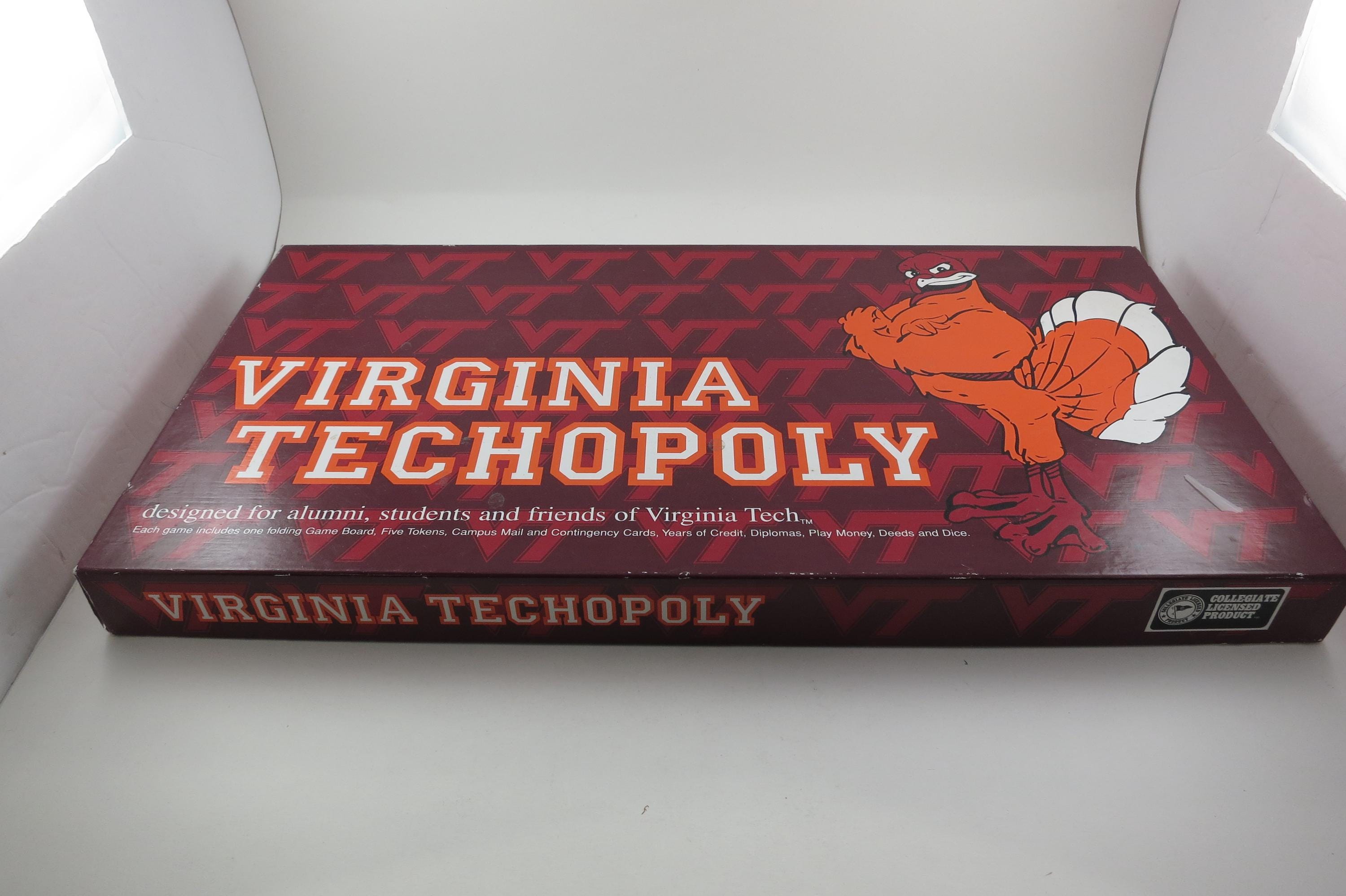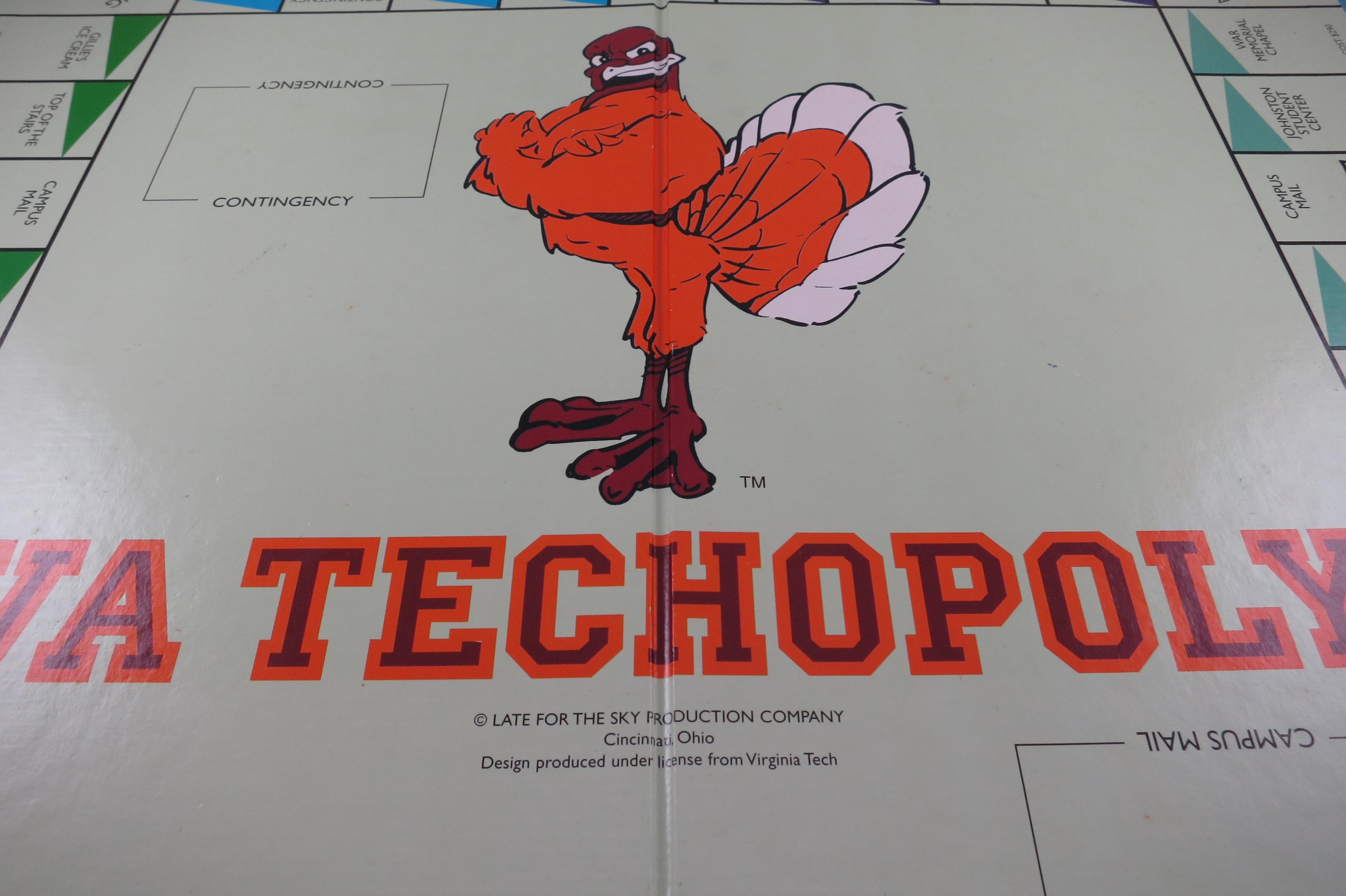 2002 Board Game Virginia Techopoly Late for the Sky Productions VT Hokies Themed Monopoly. Perfect for Hokie Fans!! Box shows wear and has taped corners. Complete less one utility card.