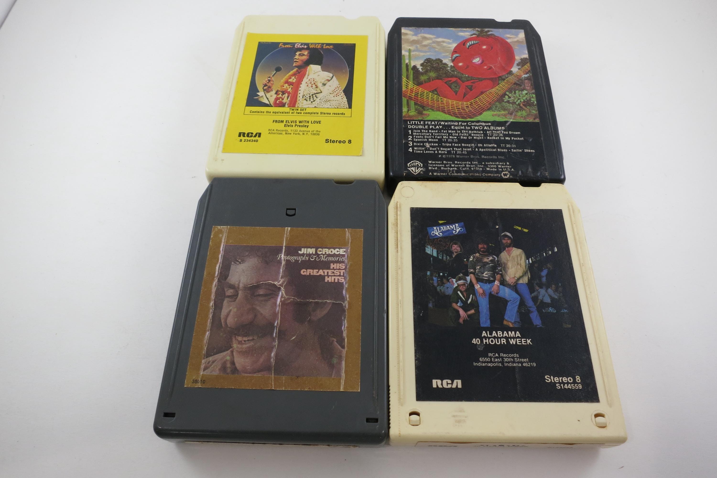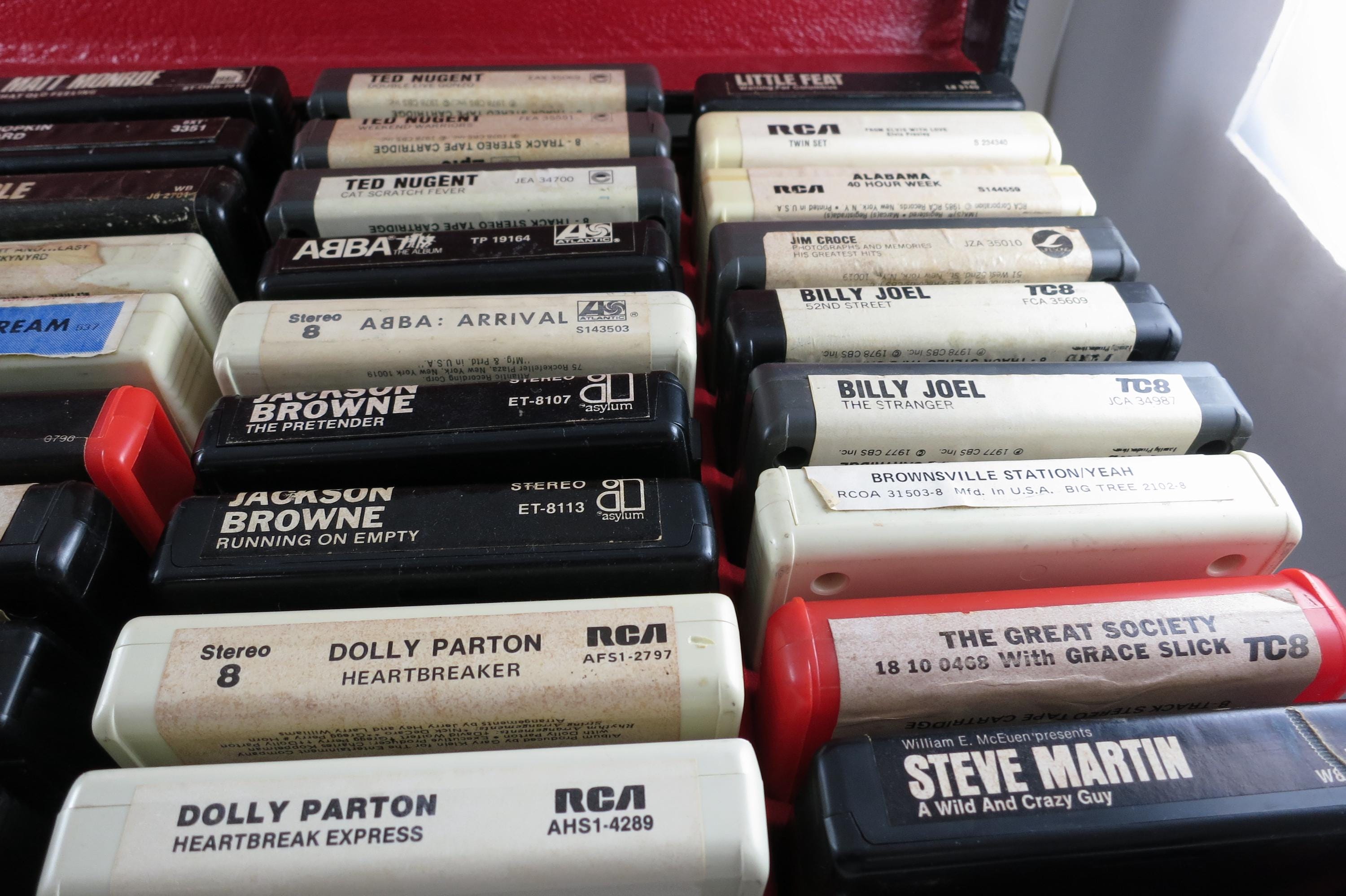 There are a total of 36 Tapes, the majority are in great shape and are clean! Nice labels as well. List is below. Case itself is a black faux leather with a red interior and it is in excellent condition. Has double latches with the original key and lock, and a carrying handle. This collection has been very well cared for, these are nicer than the good majority of 8 tracks we have seen! Tapes are as follows