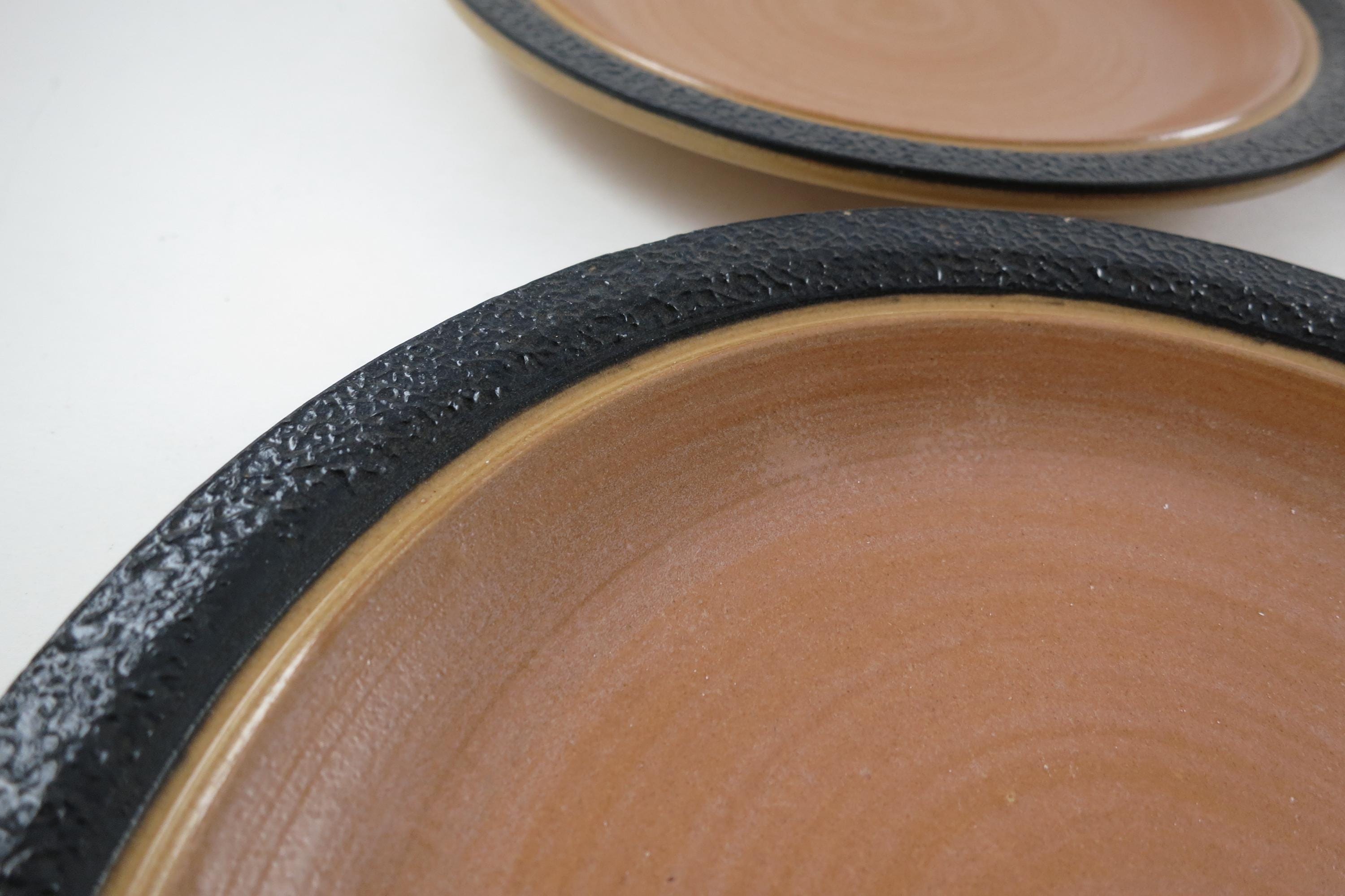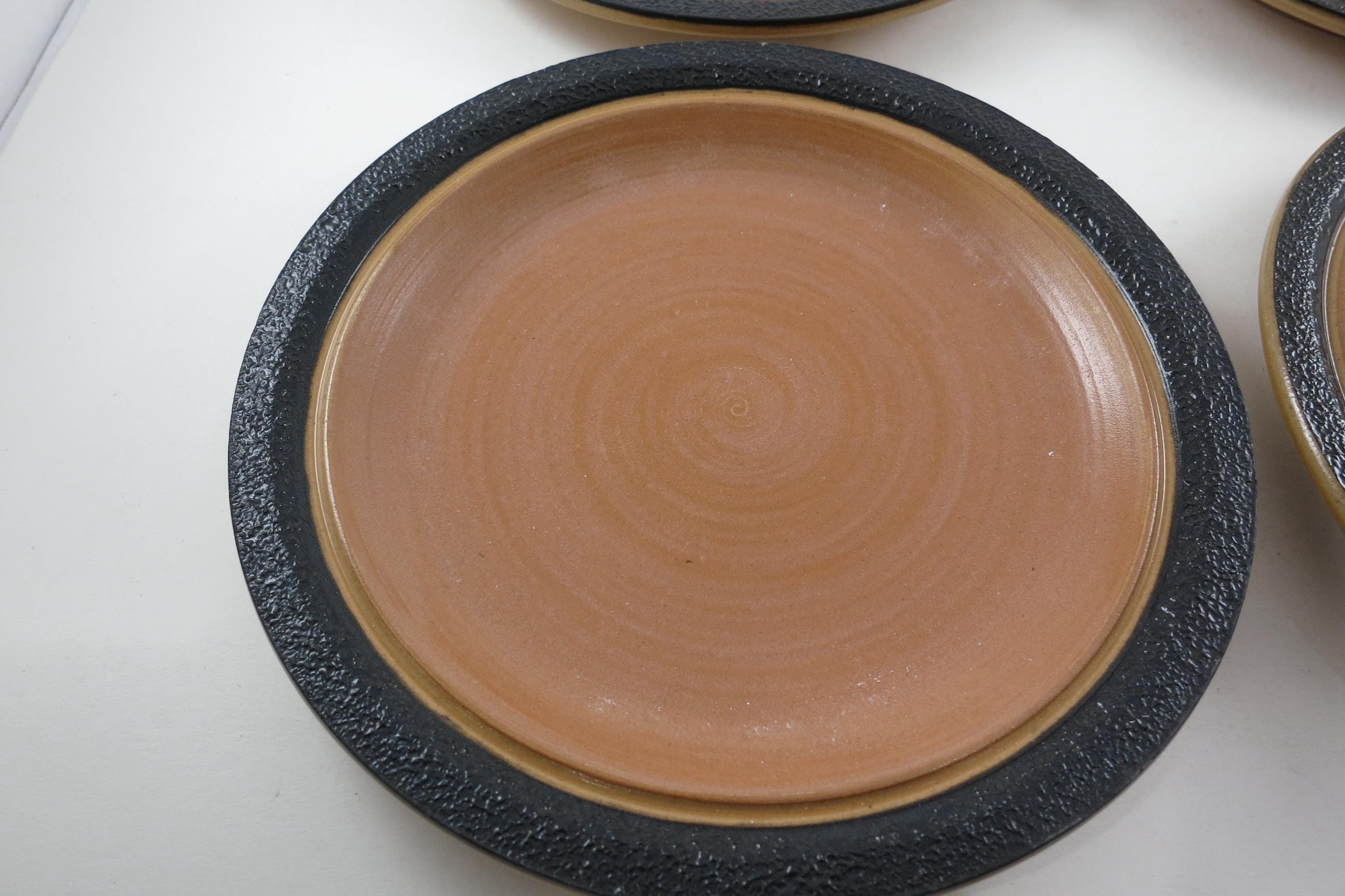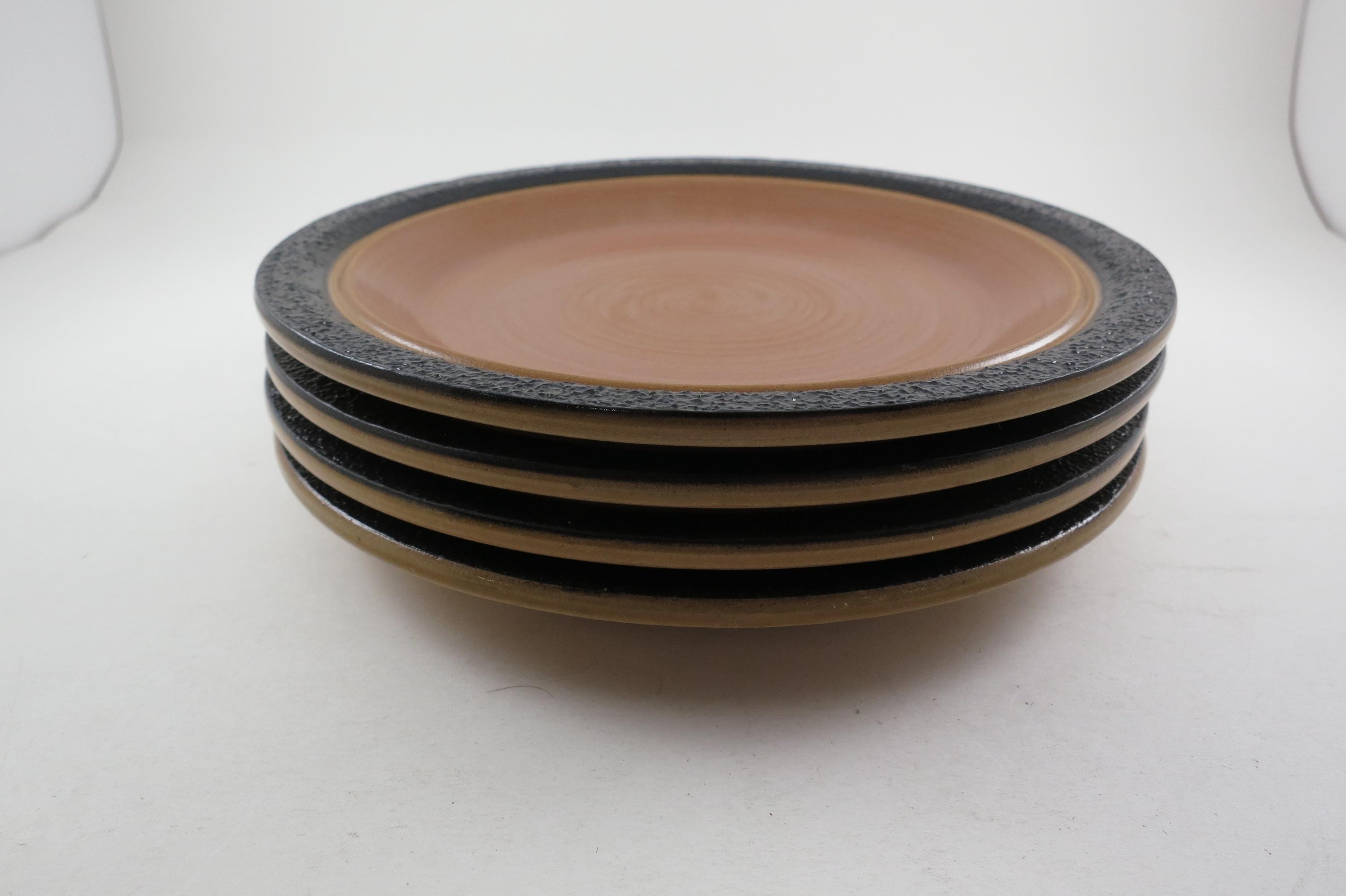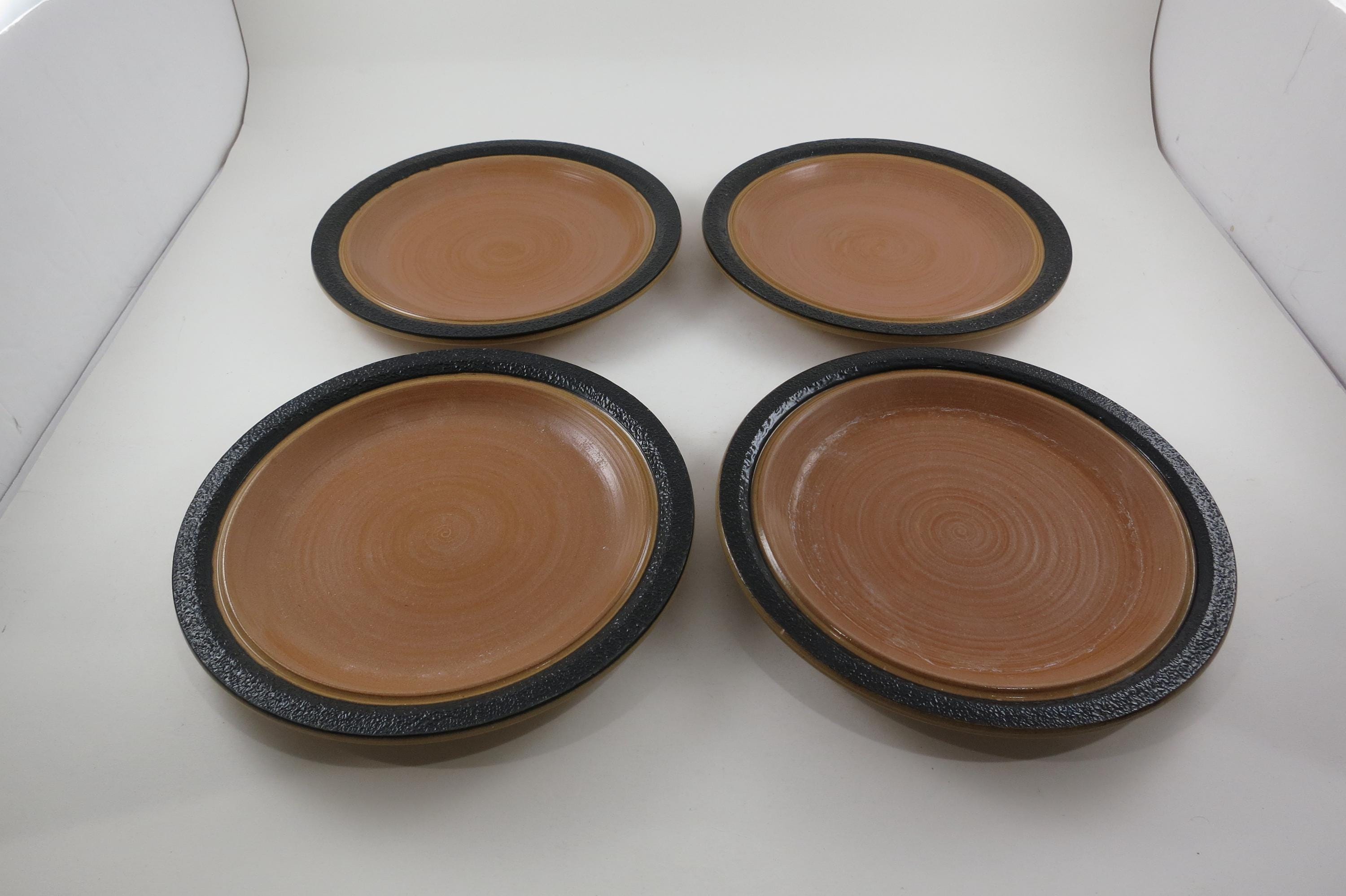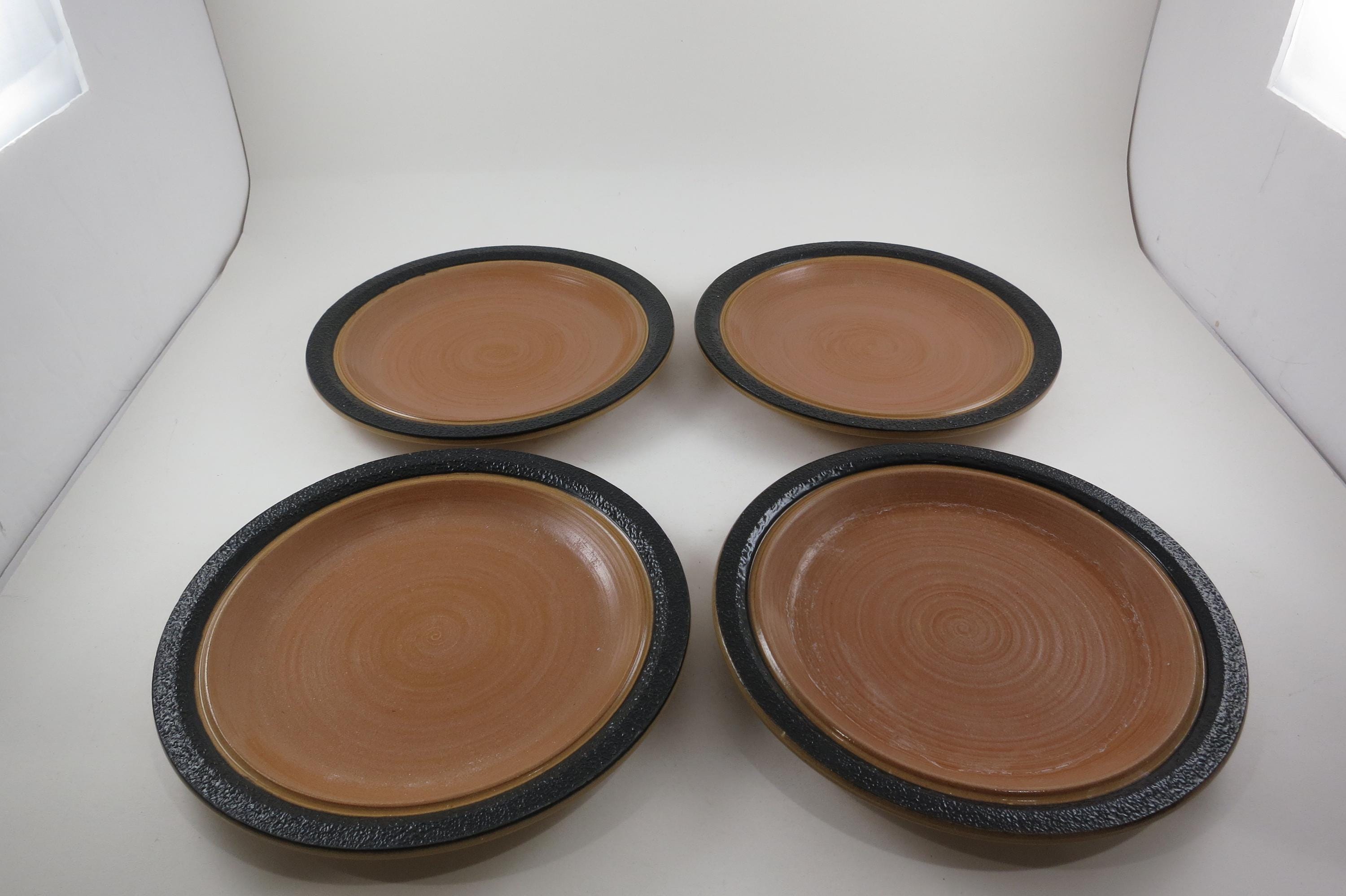 All four salad plates are in excellent used condition showing light use wear. Each measures 7 1/8 inches diameter. Brown stoneware with black edges.