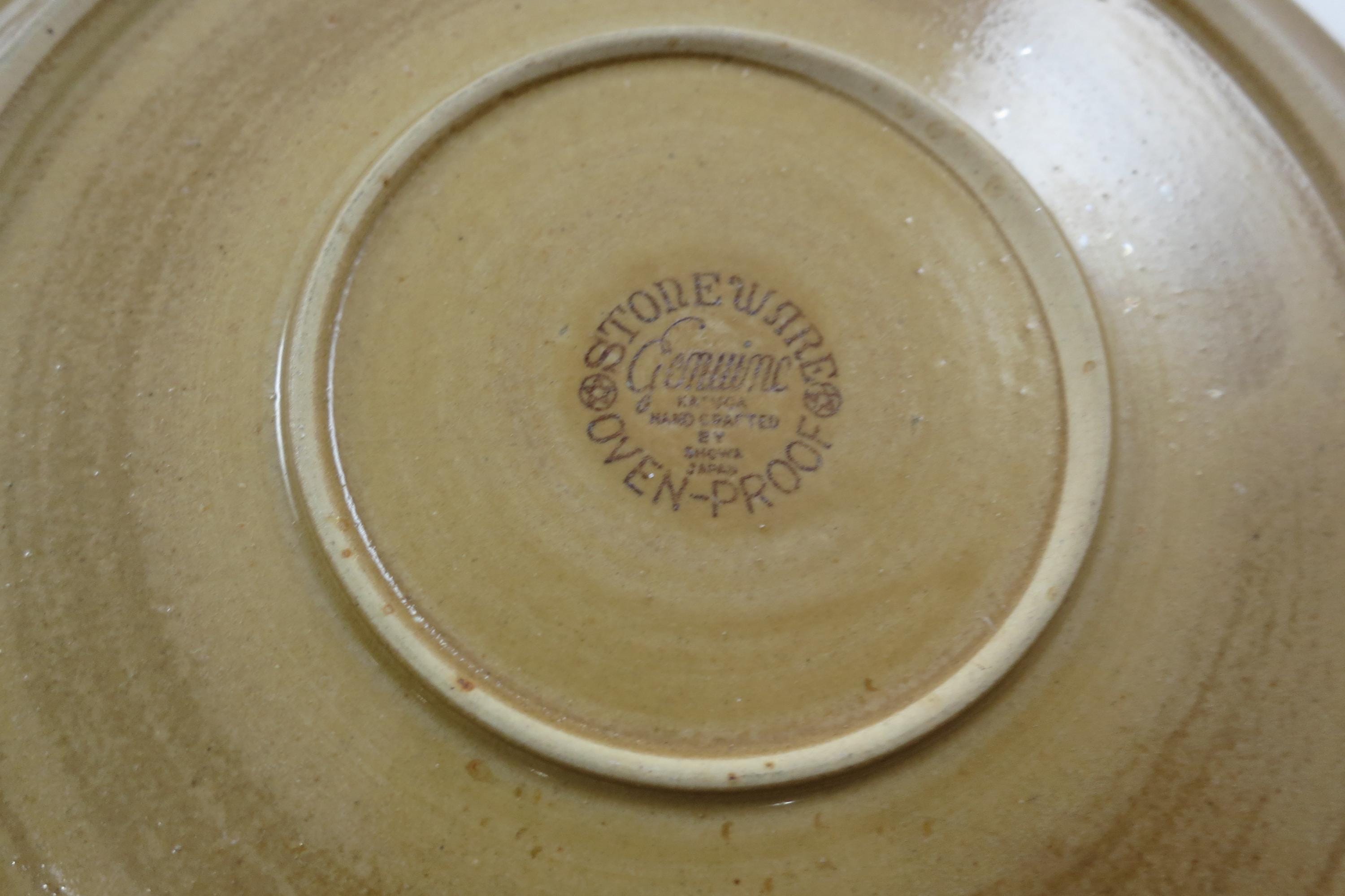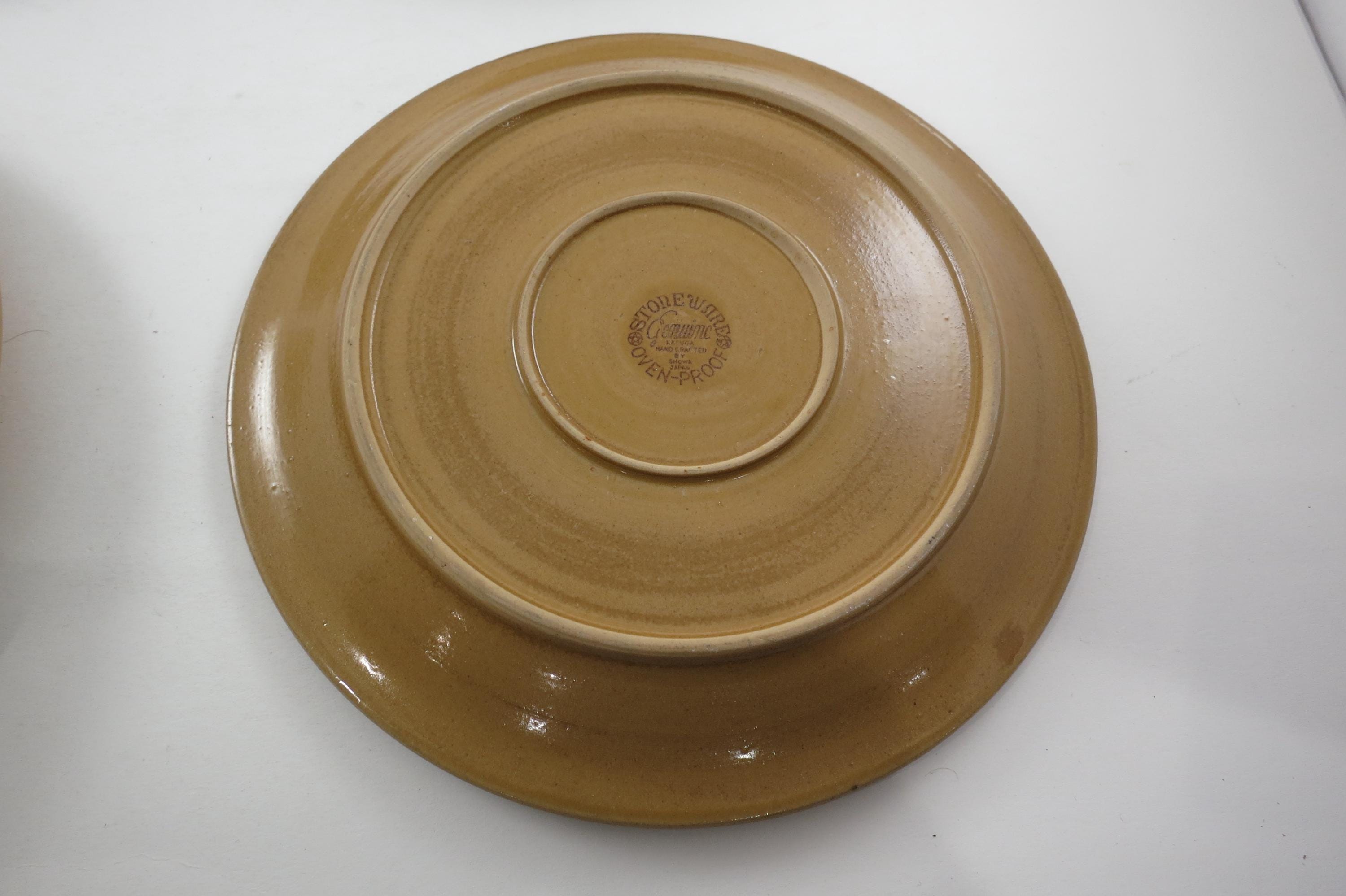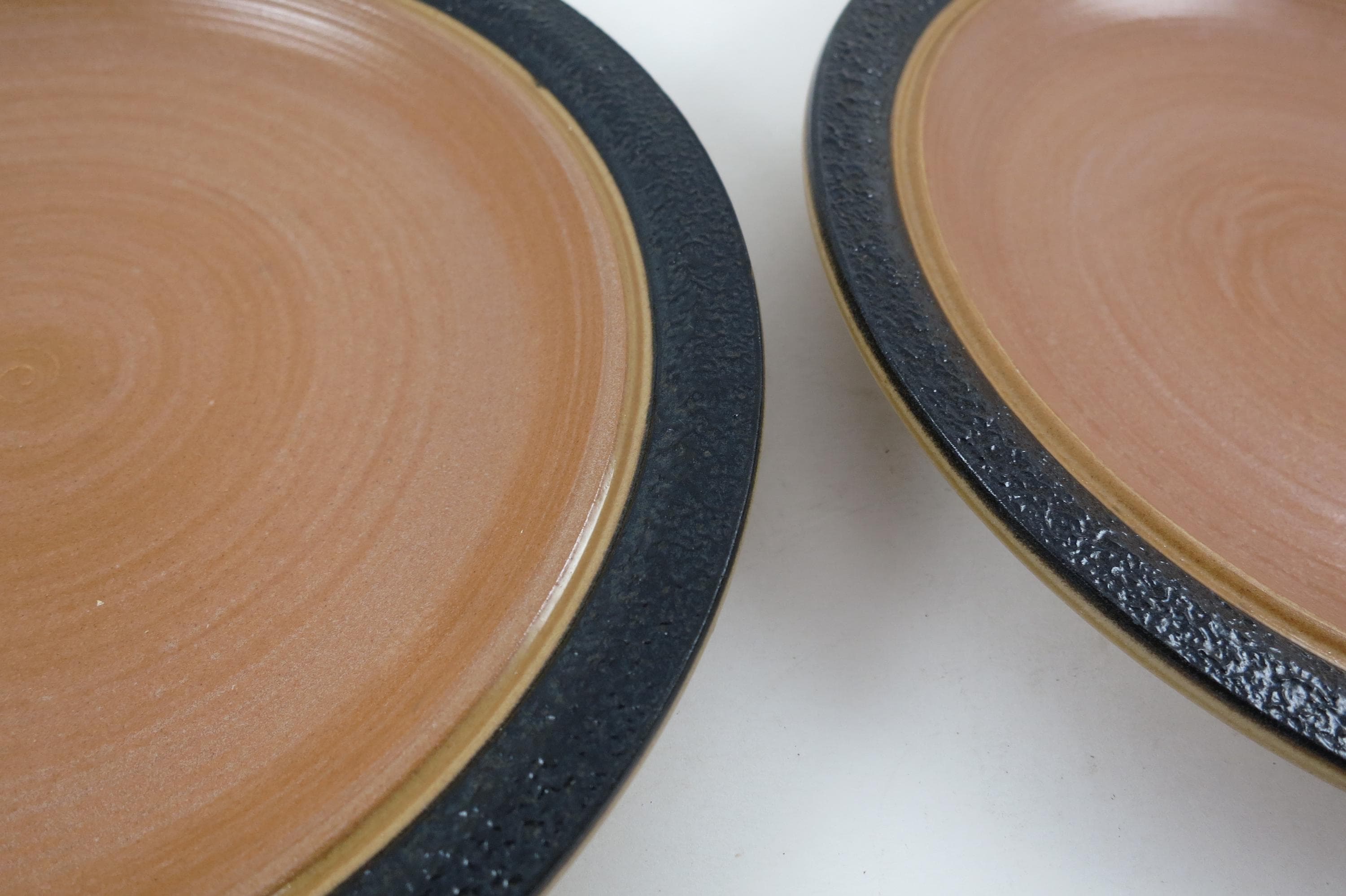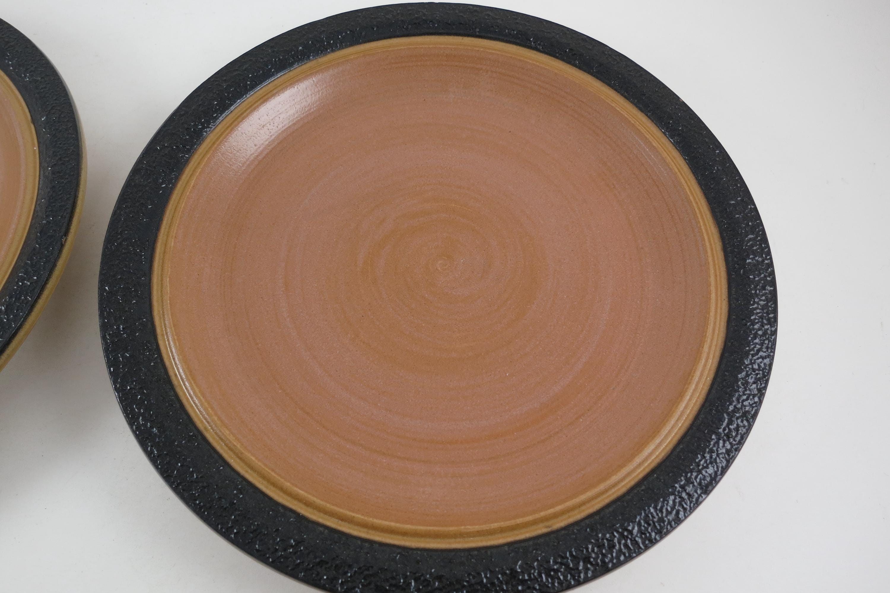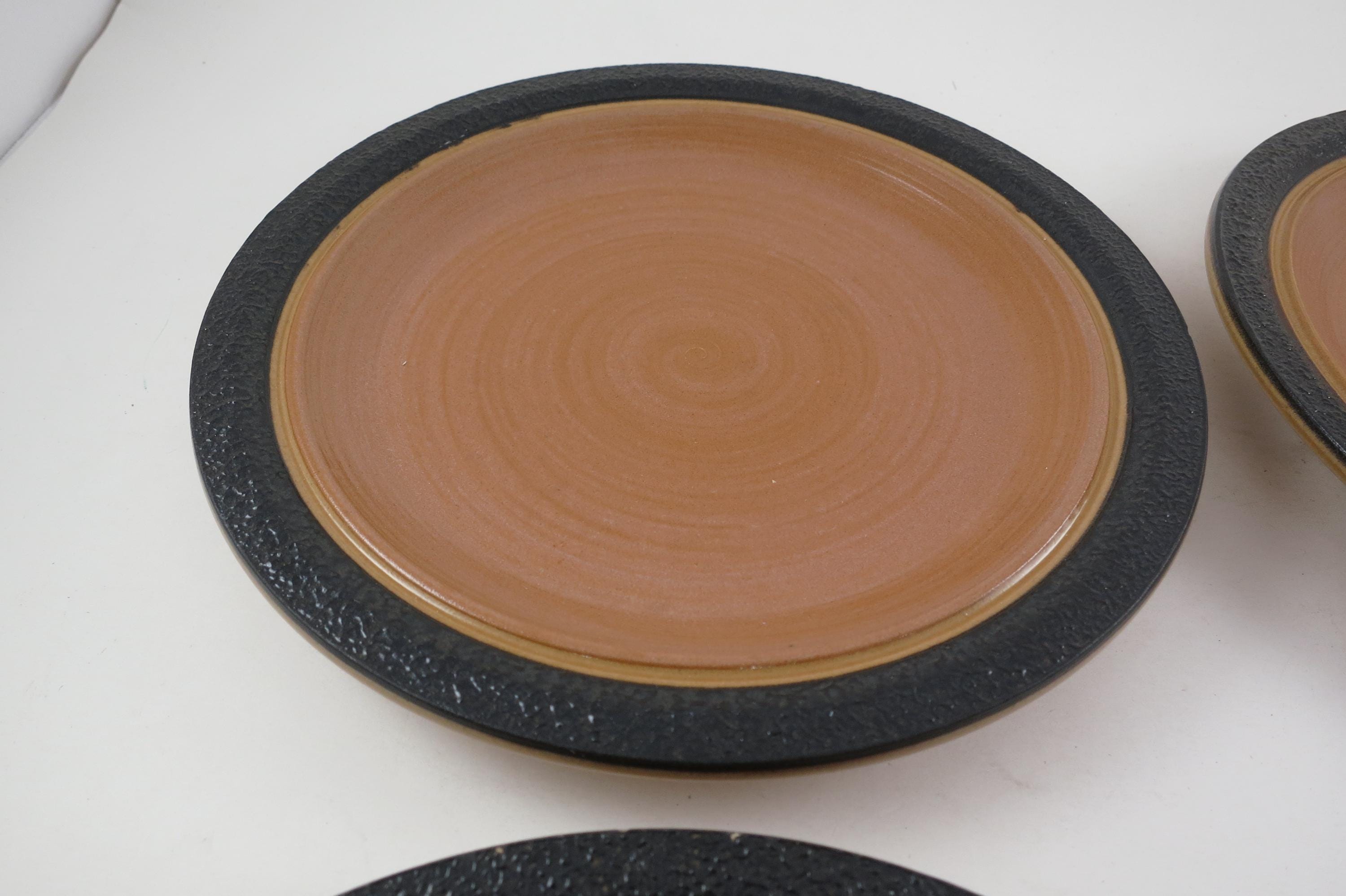 All four salad plates are in excellent used condition showing light use wear. Each measures 7 1/8 inches diameter. Brown stoneware with black edges.