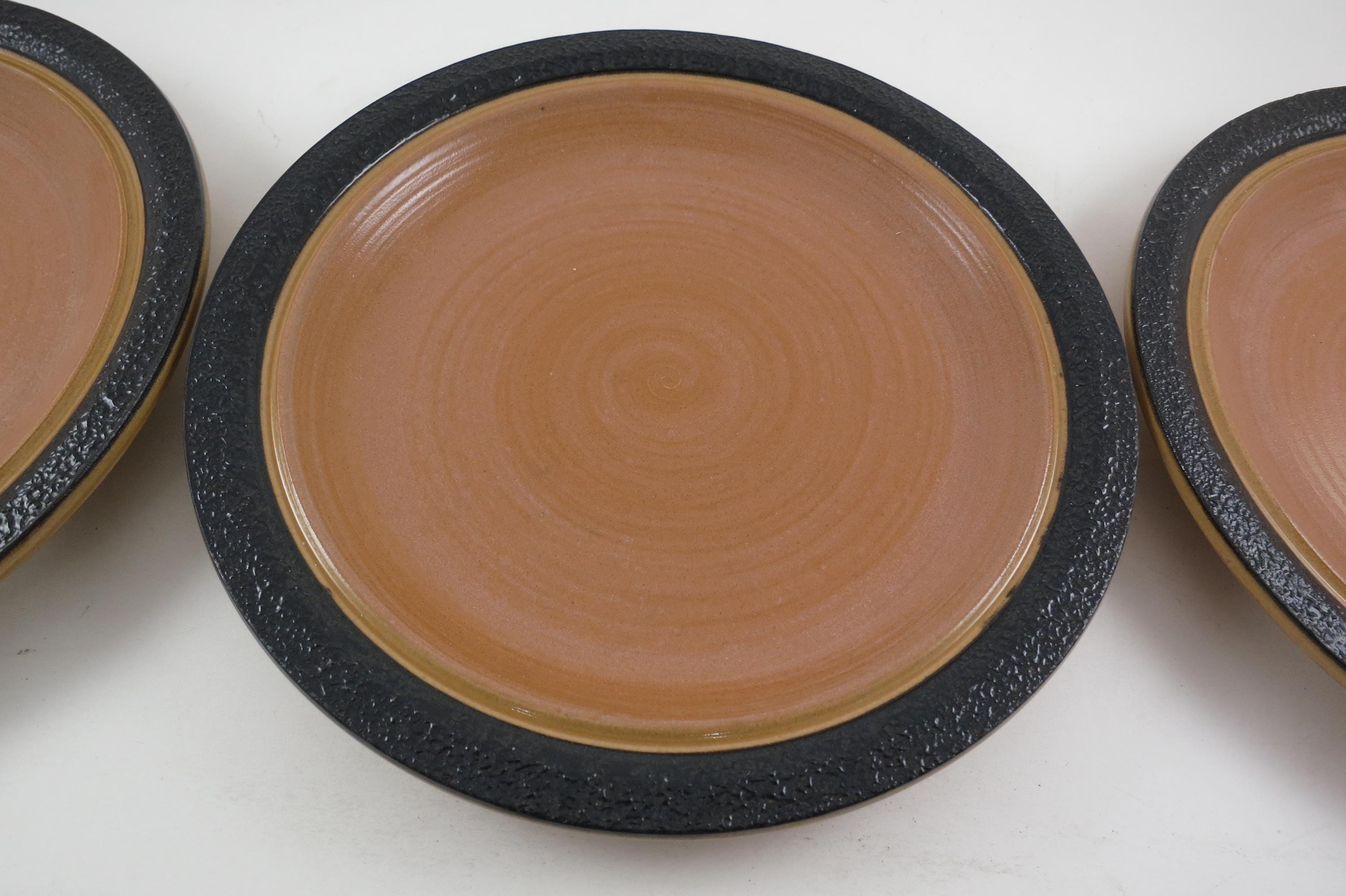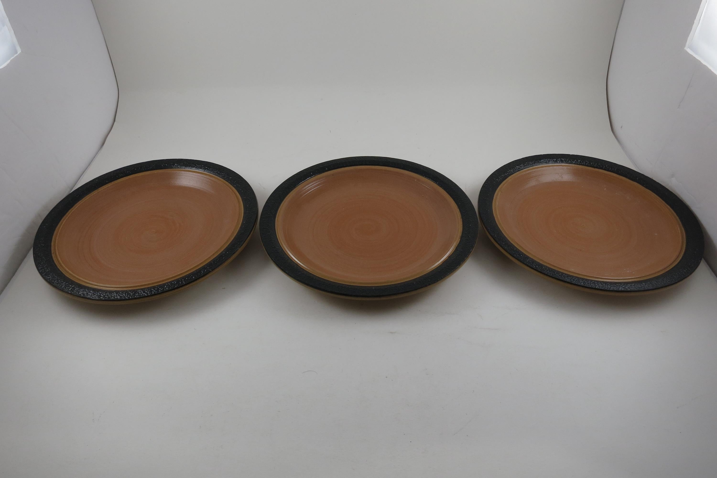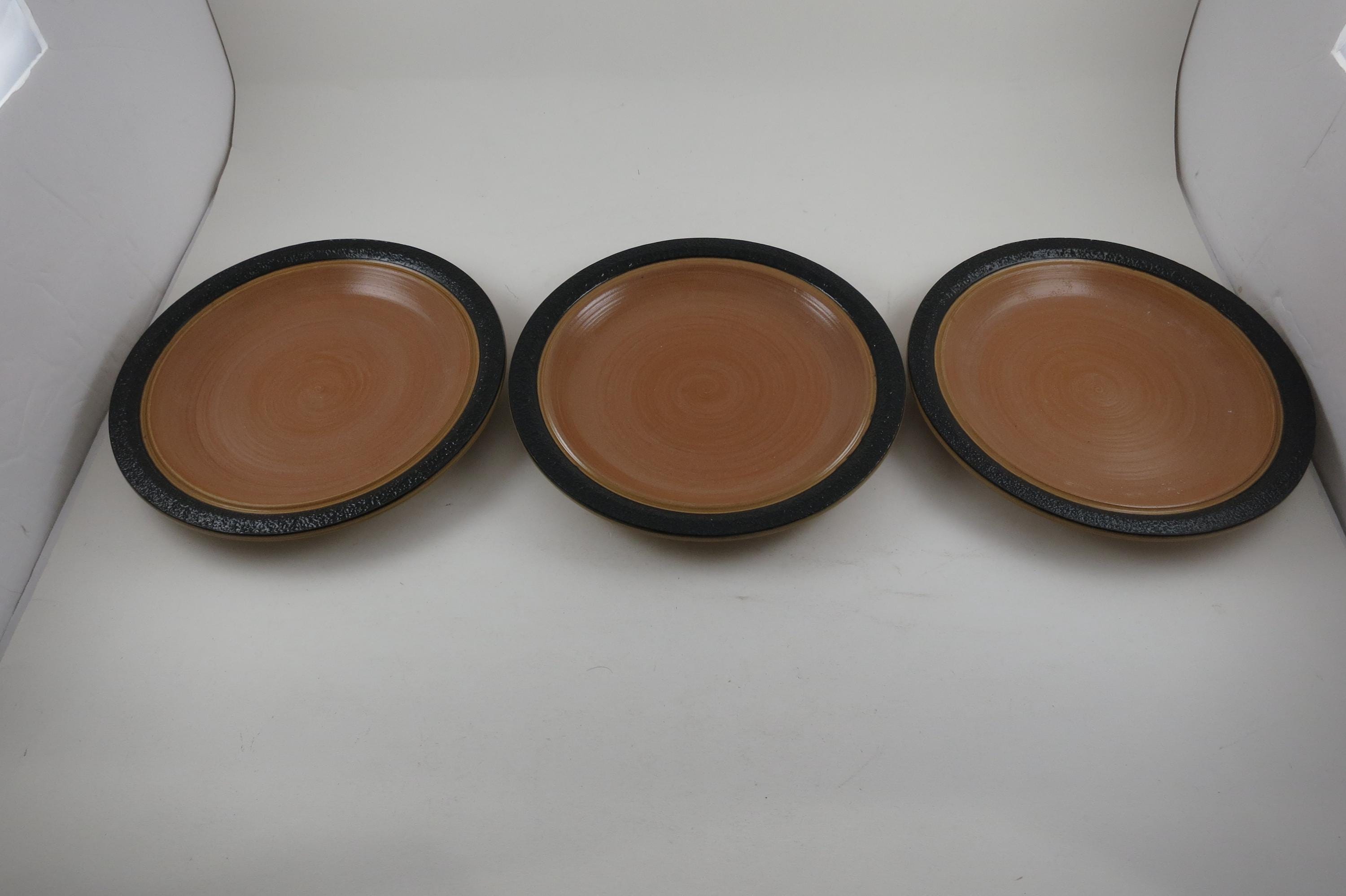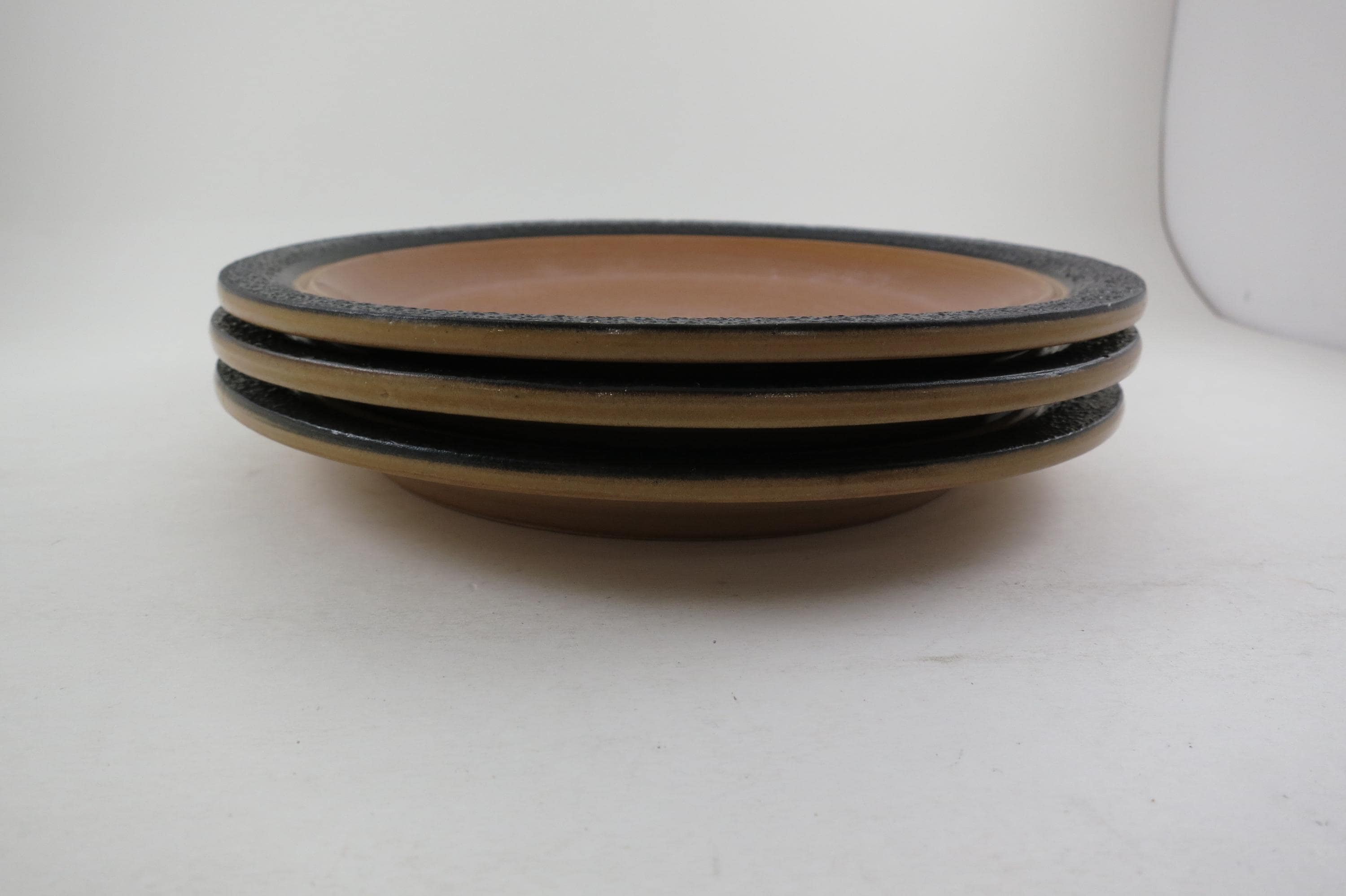 All three salad plates are in excellent used condition showing light use wear. Each measures 7 1/8 inches diameter. Brown stoneware with black edges.
