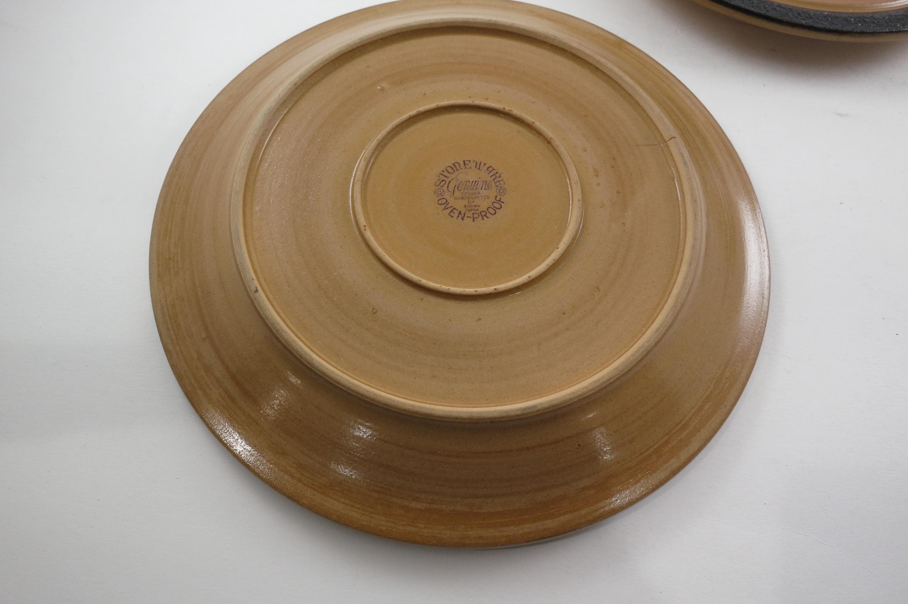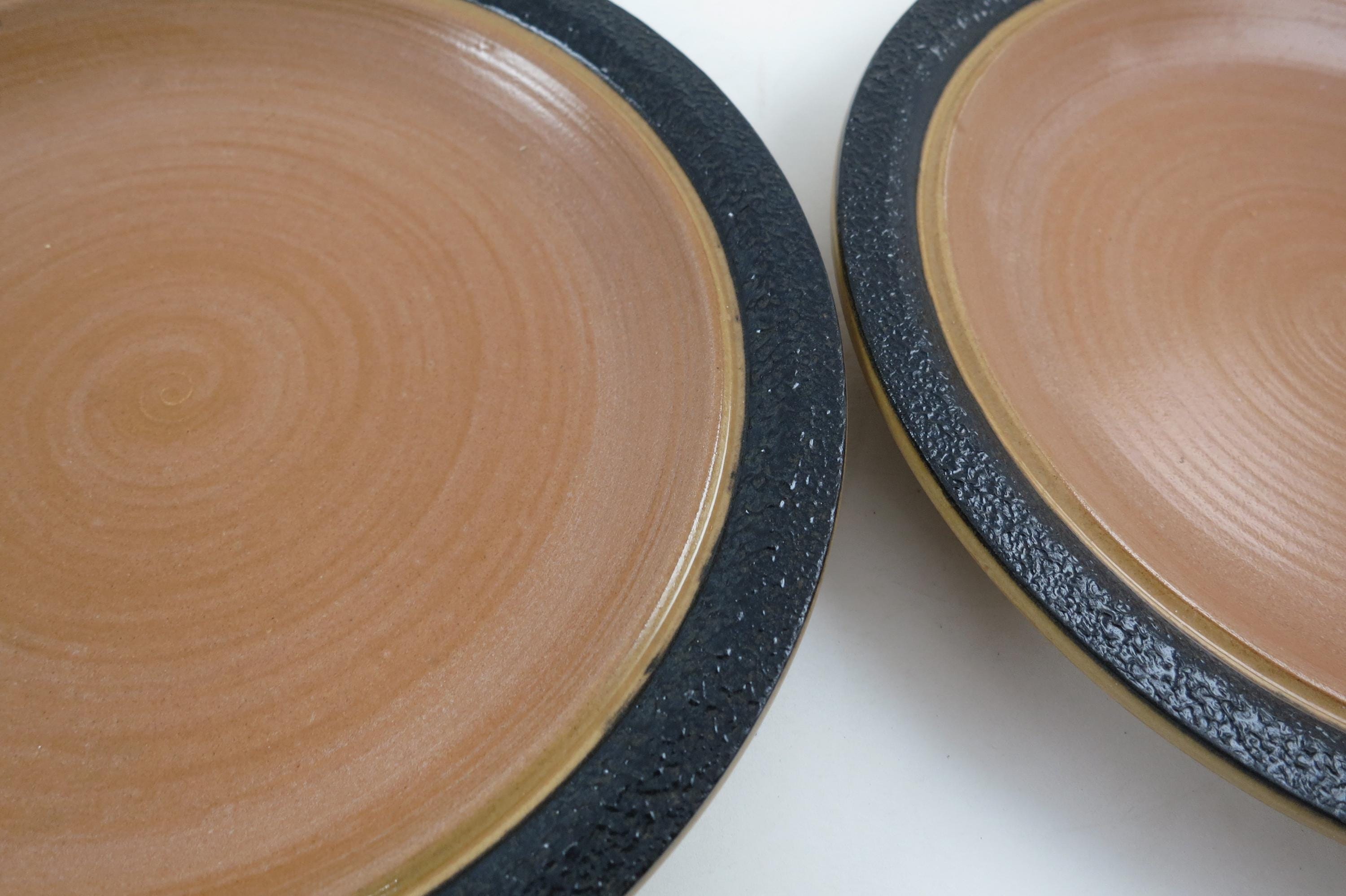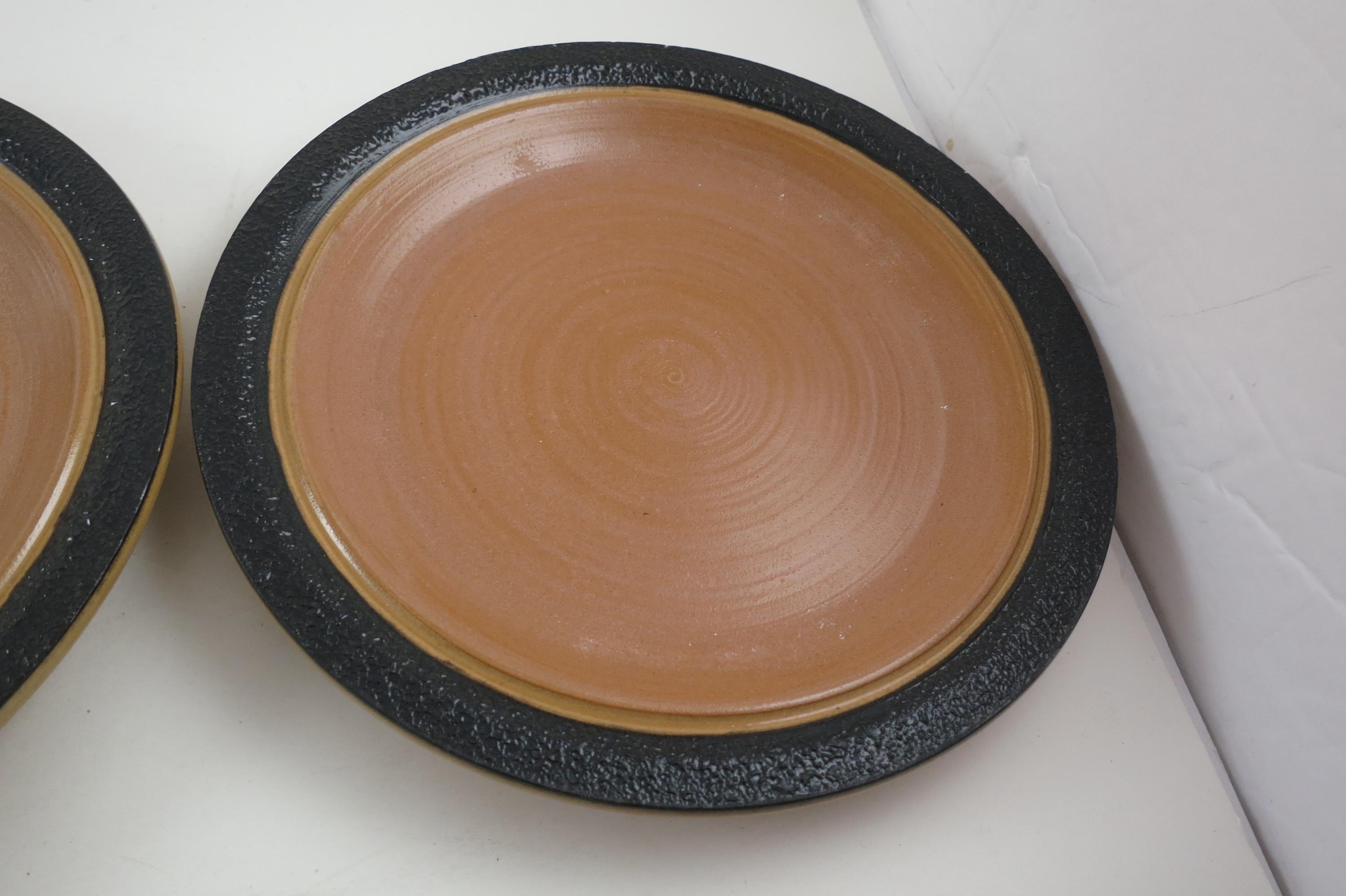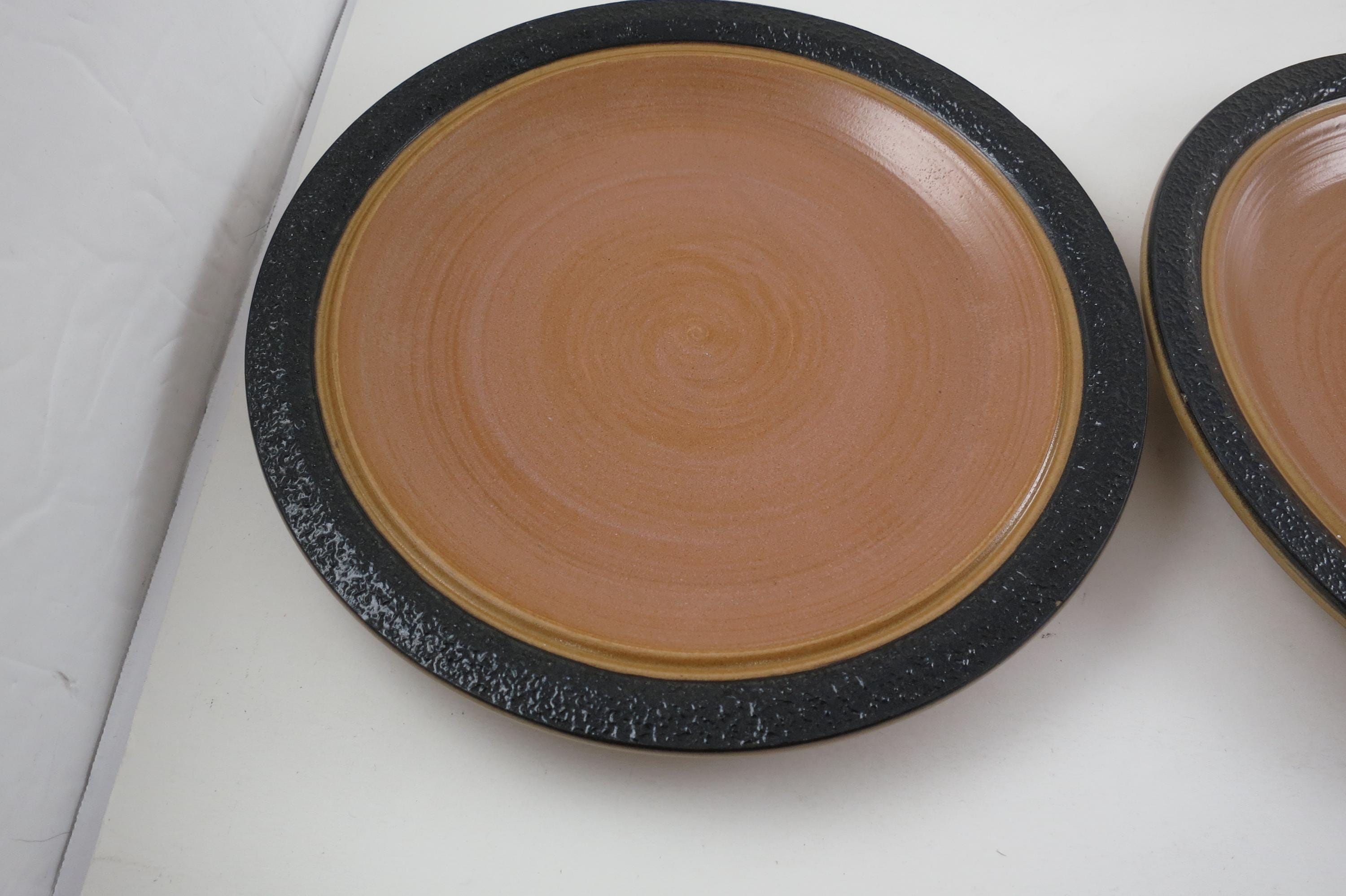 All three salad plates are in excellent used condition showing light use wear. Each measures 7 1/8 inches diameter. Brown stoneware with black edges.