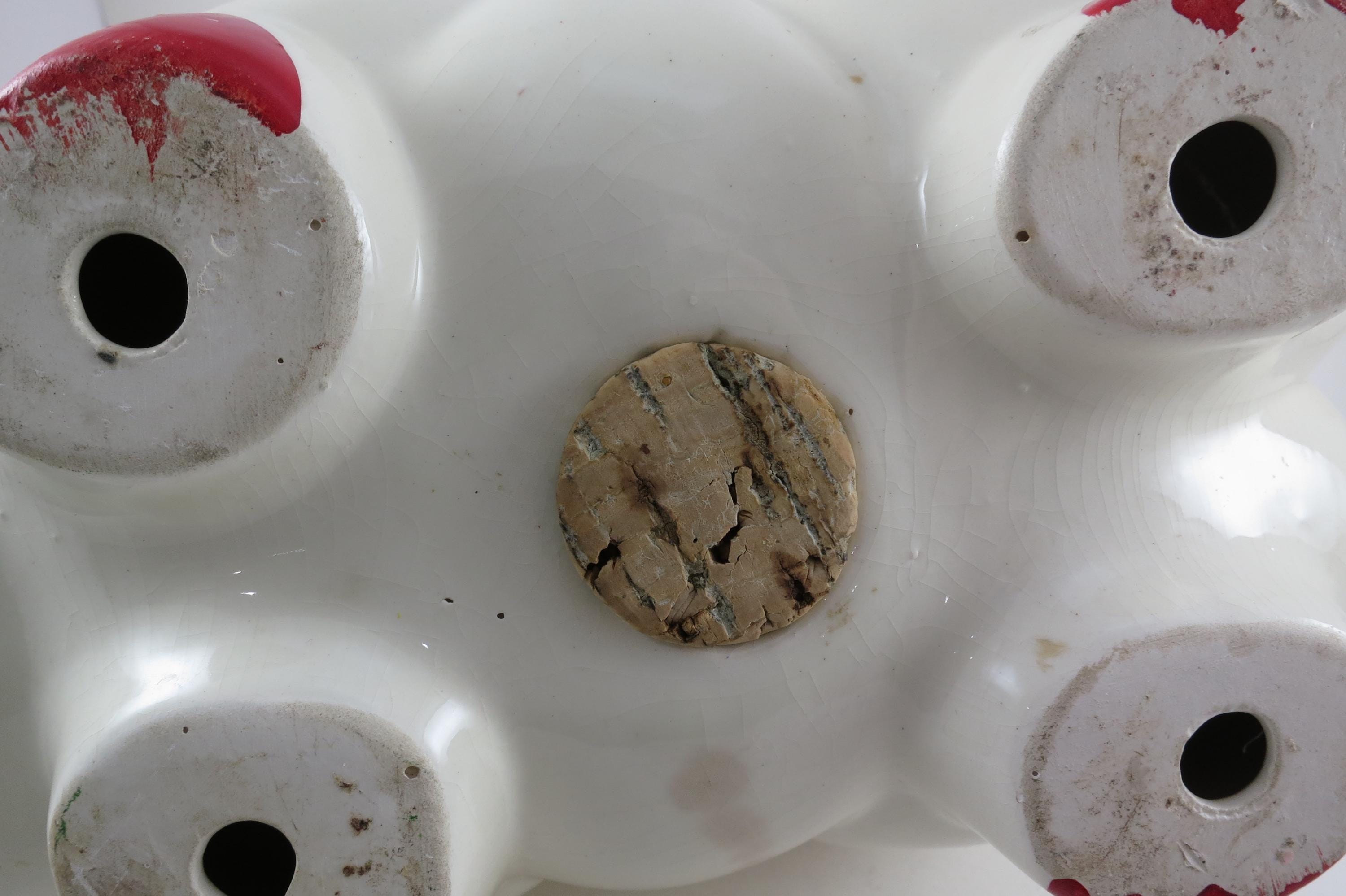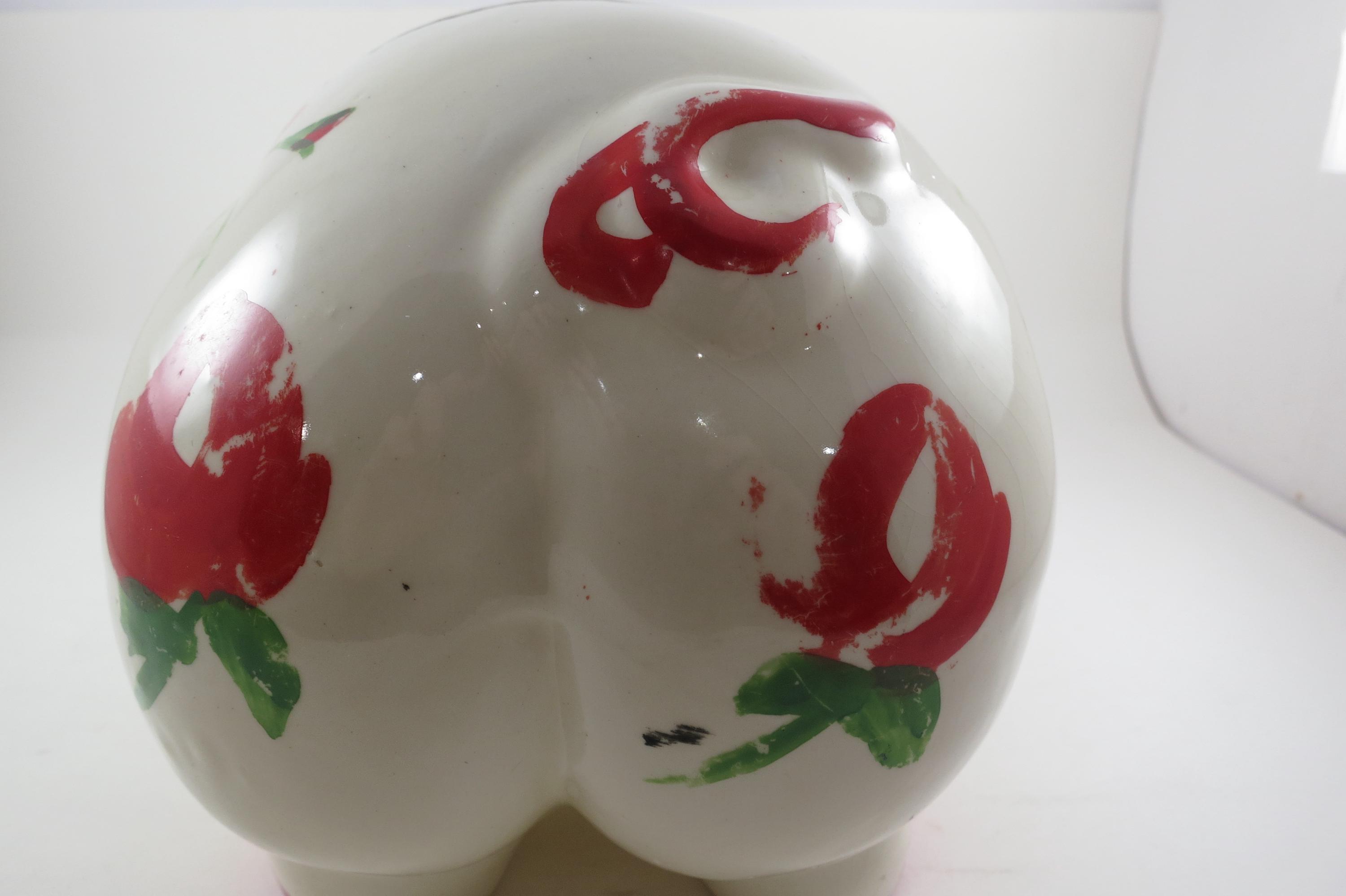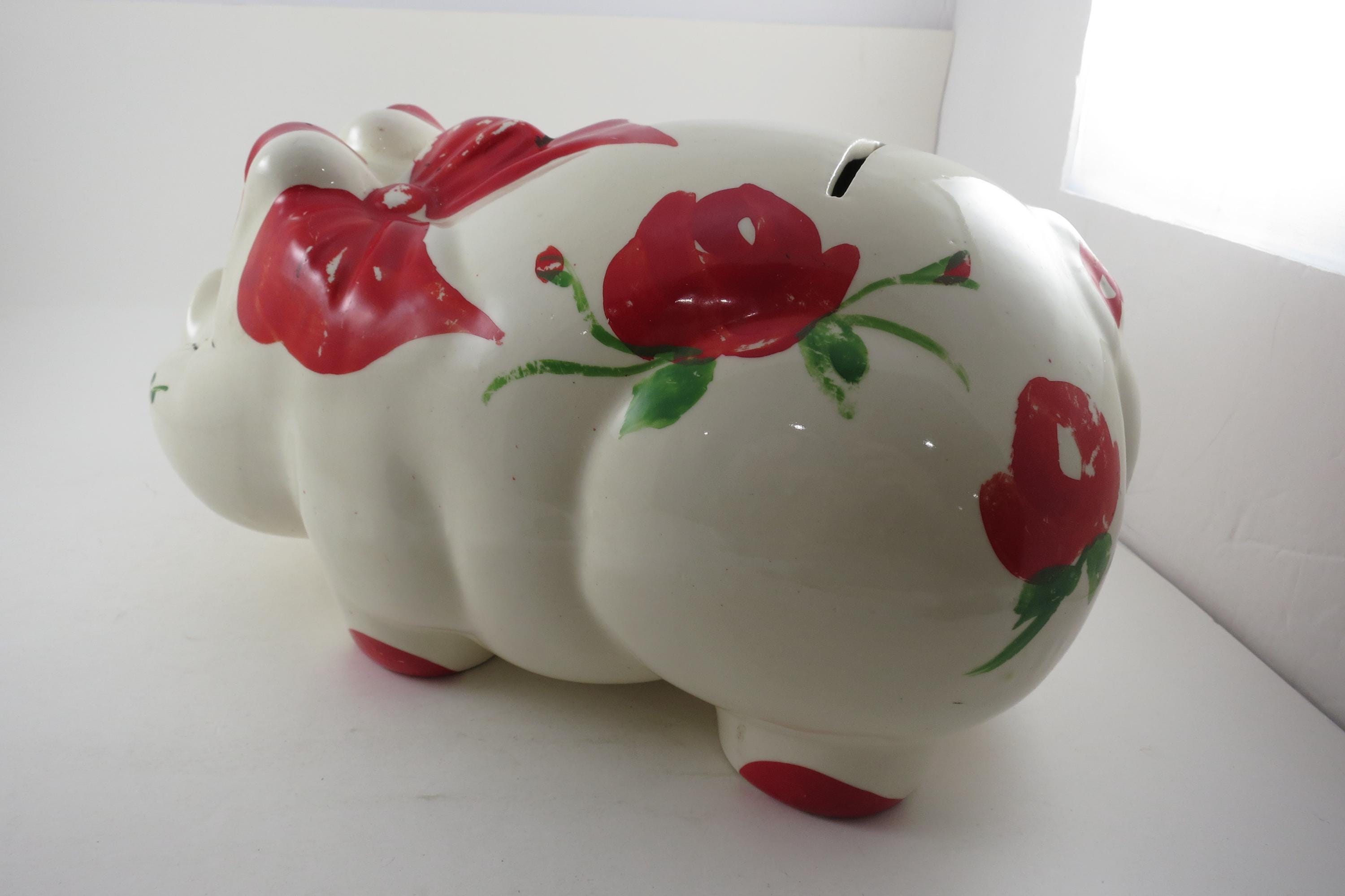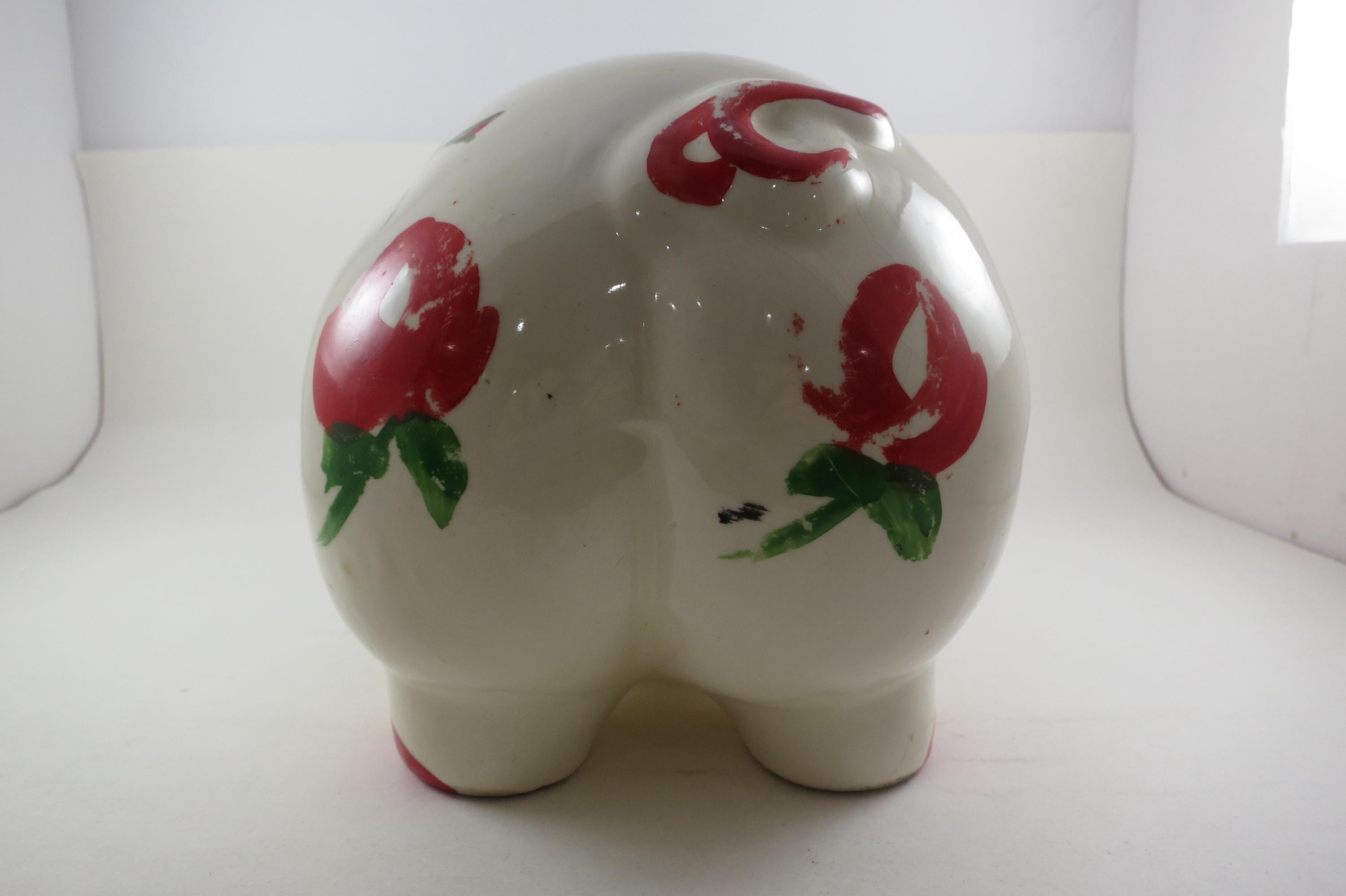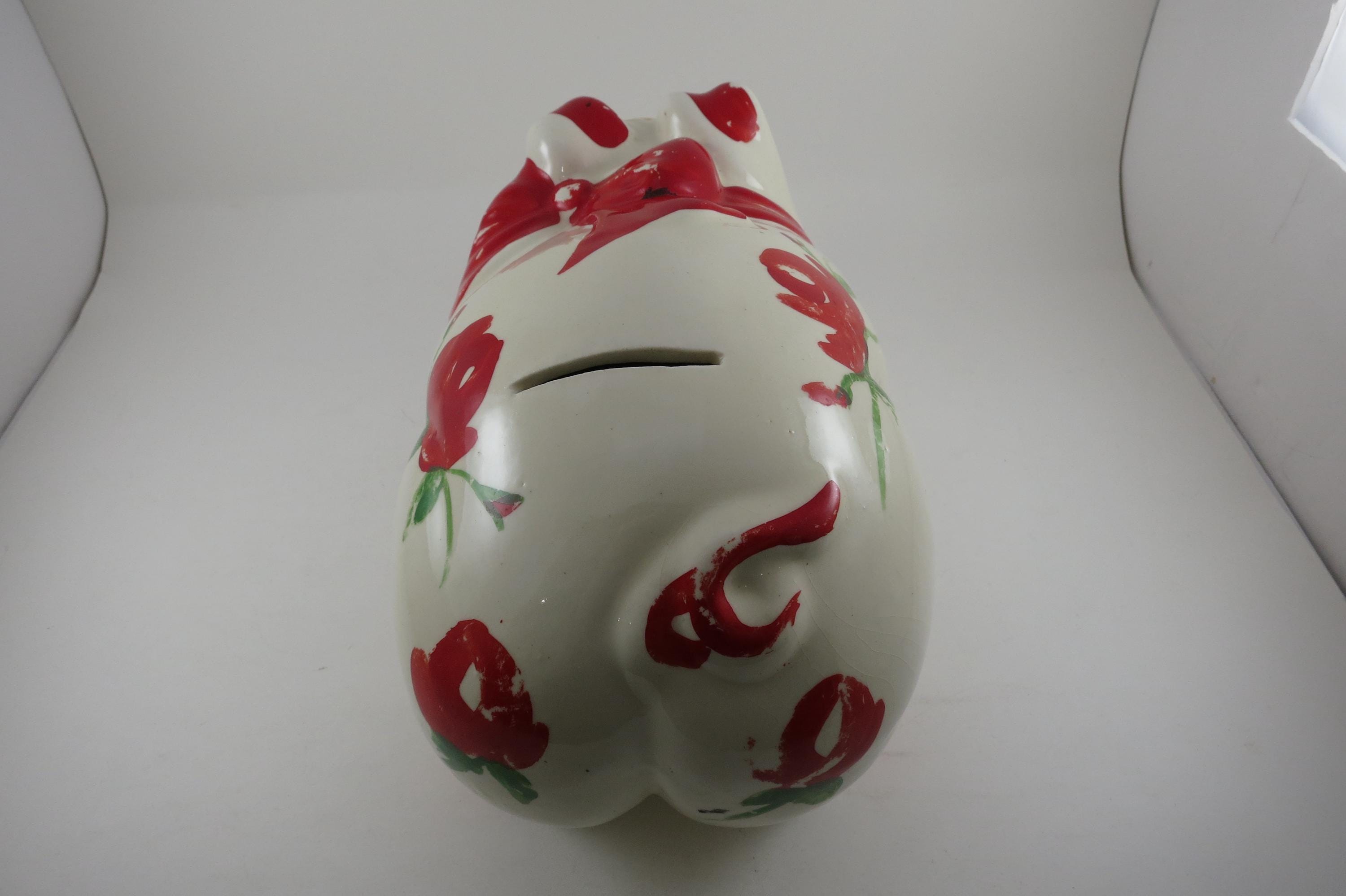 Will hold lots of pennies! Has a cork stopper and retains most of the original red paint. Measures 12 inches long 6 inches wide. No damages.