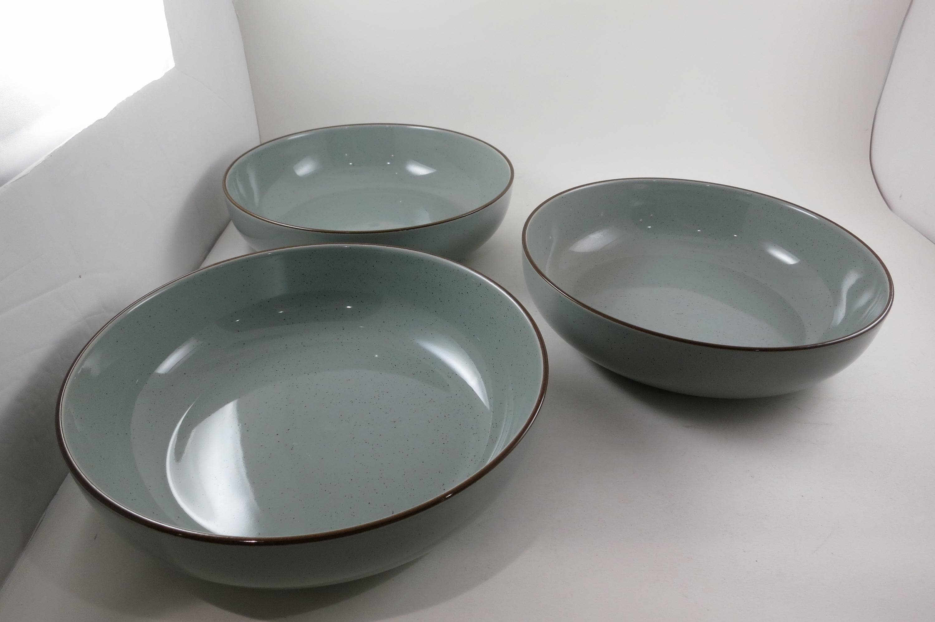 All three plates are in excellent used condition. Each measures 8 1/4 inches diameter. These are soft sage with brown rims.