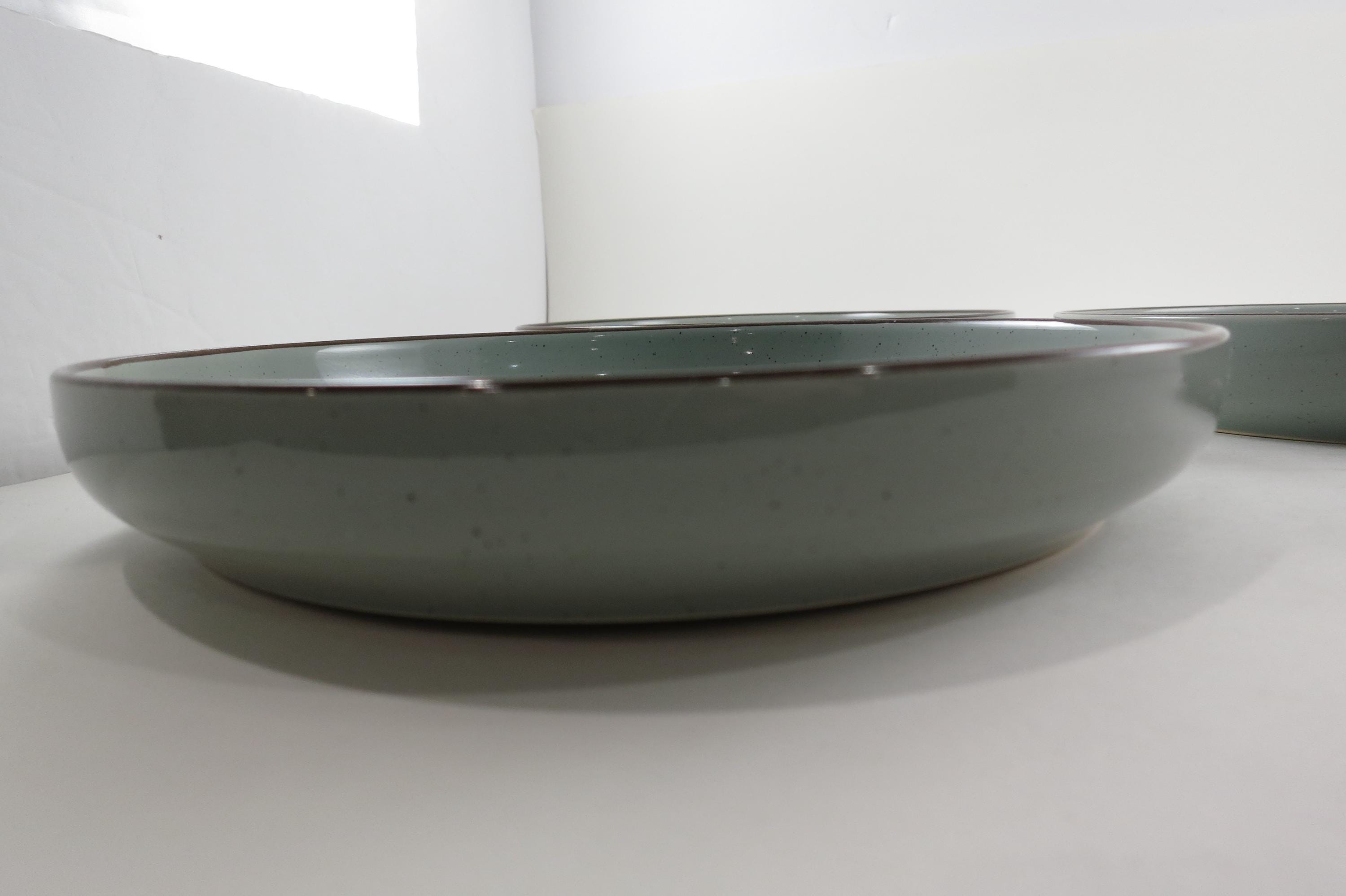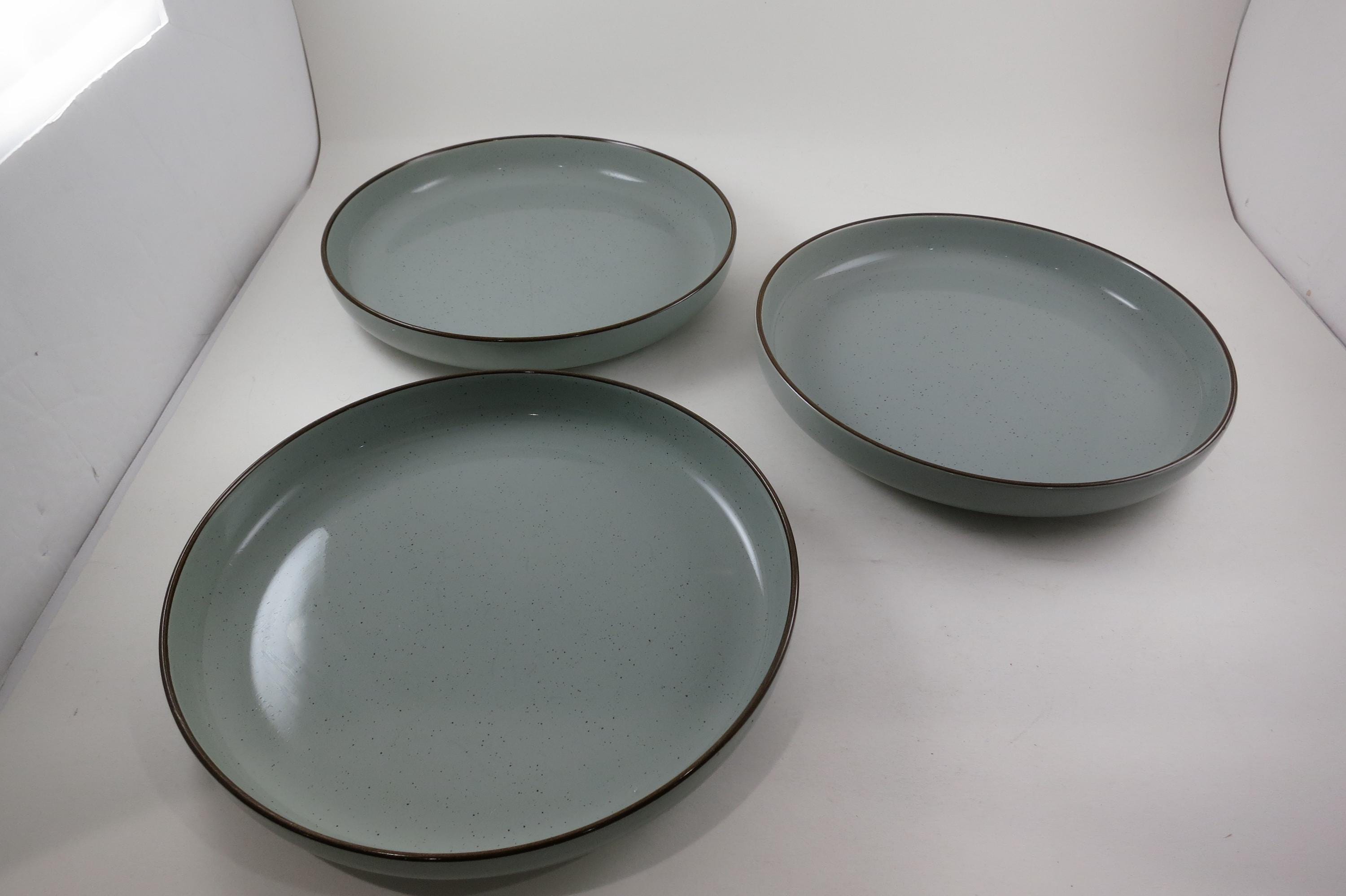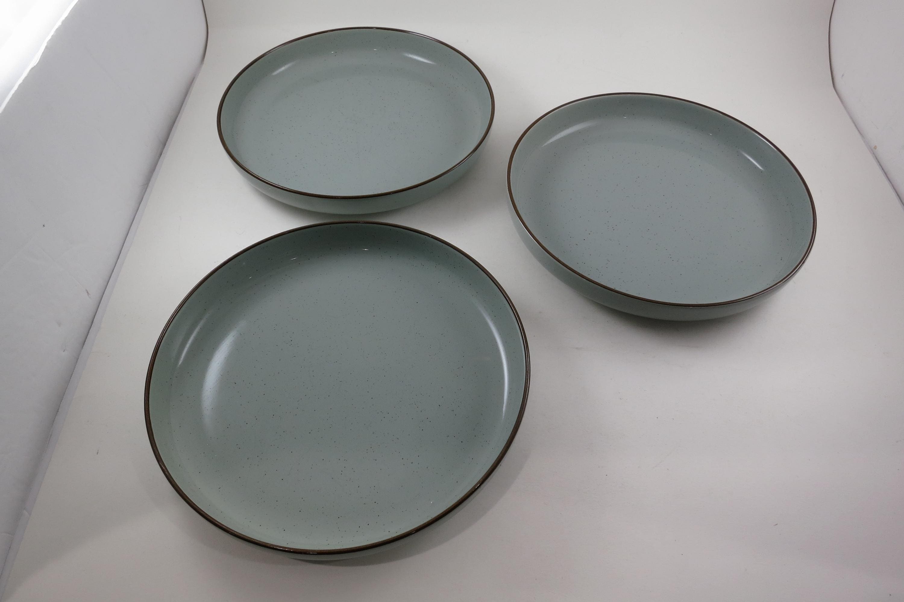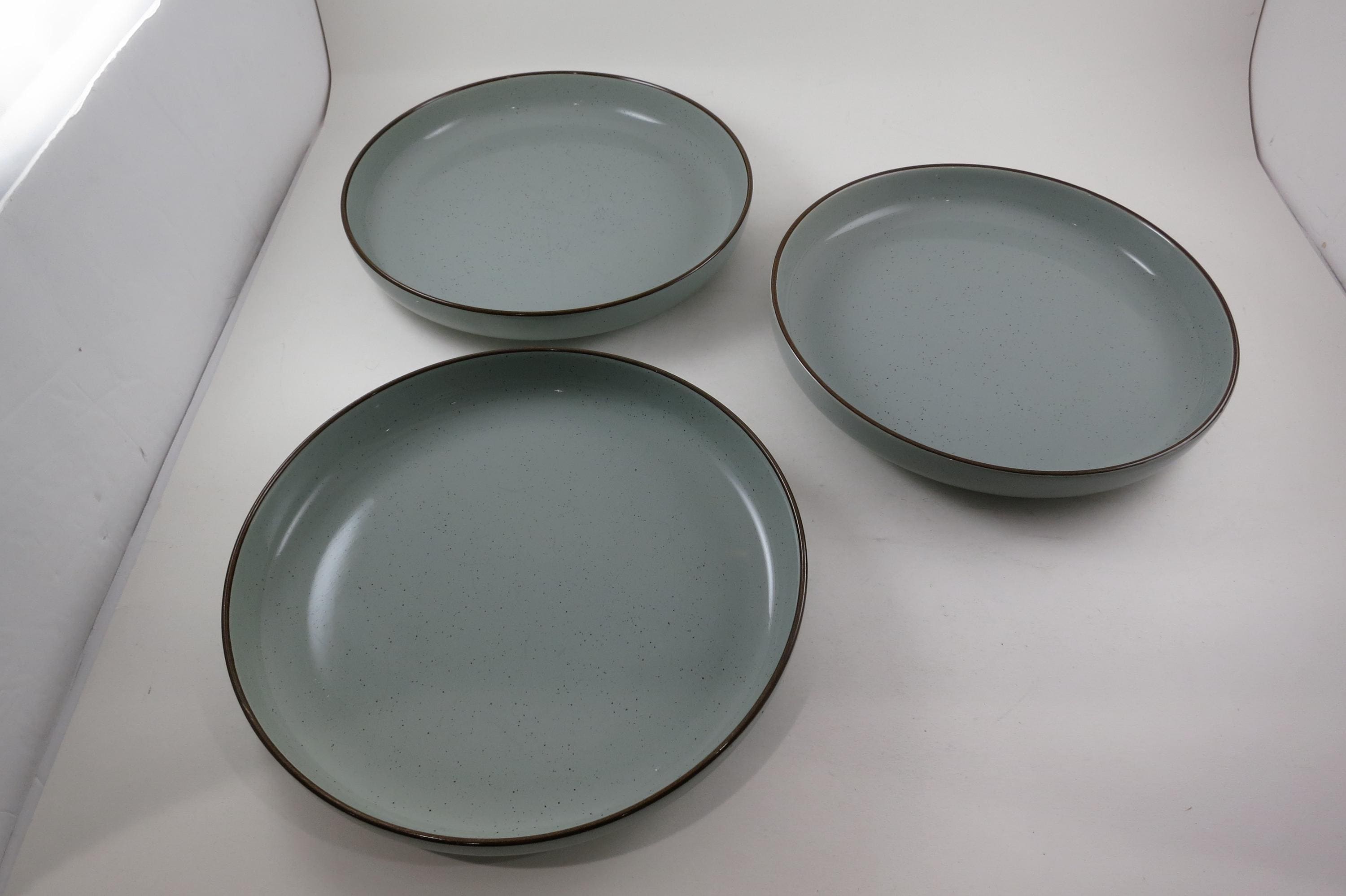 All three plates are in excellent used condition. Each measures 8 1/4 inches diameter. These are soft sage with brown rims.