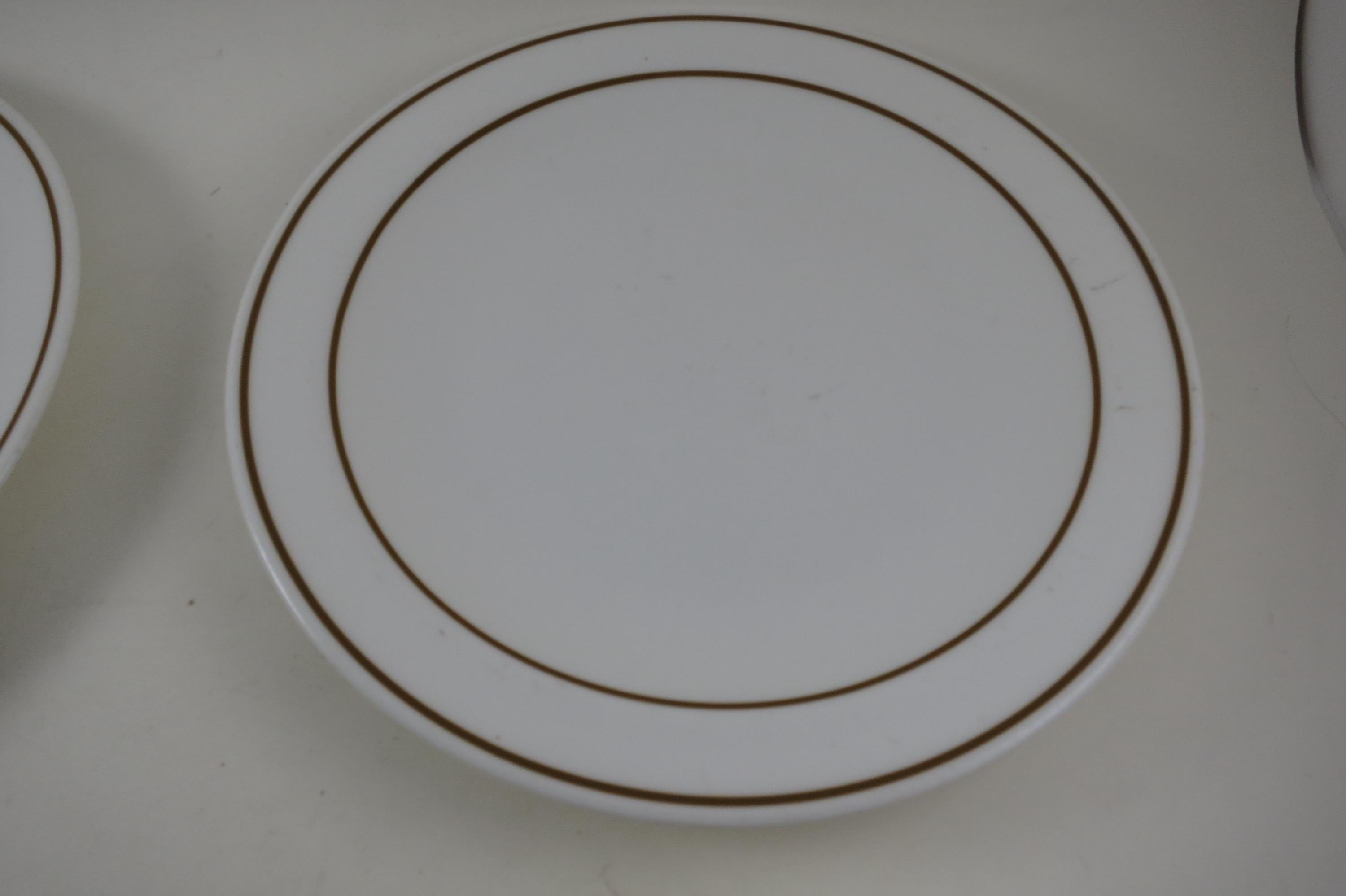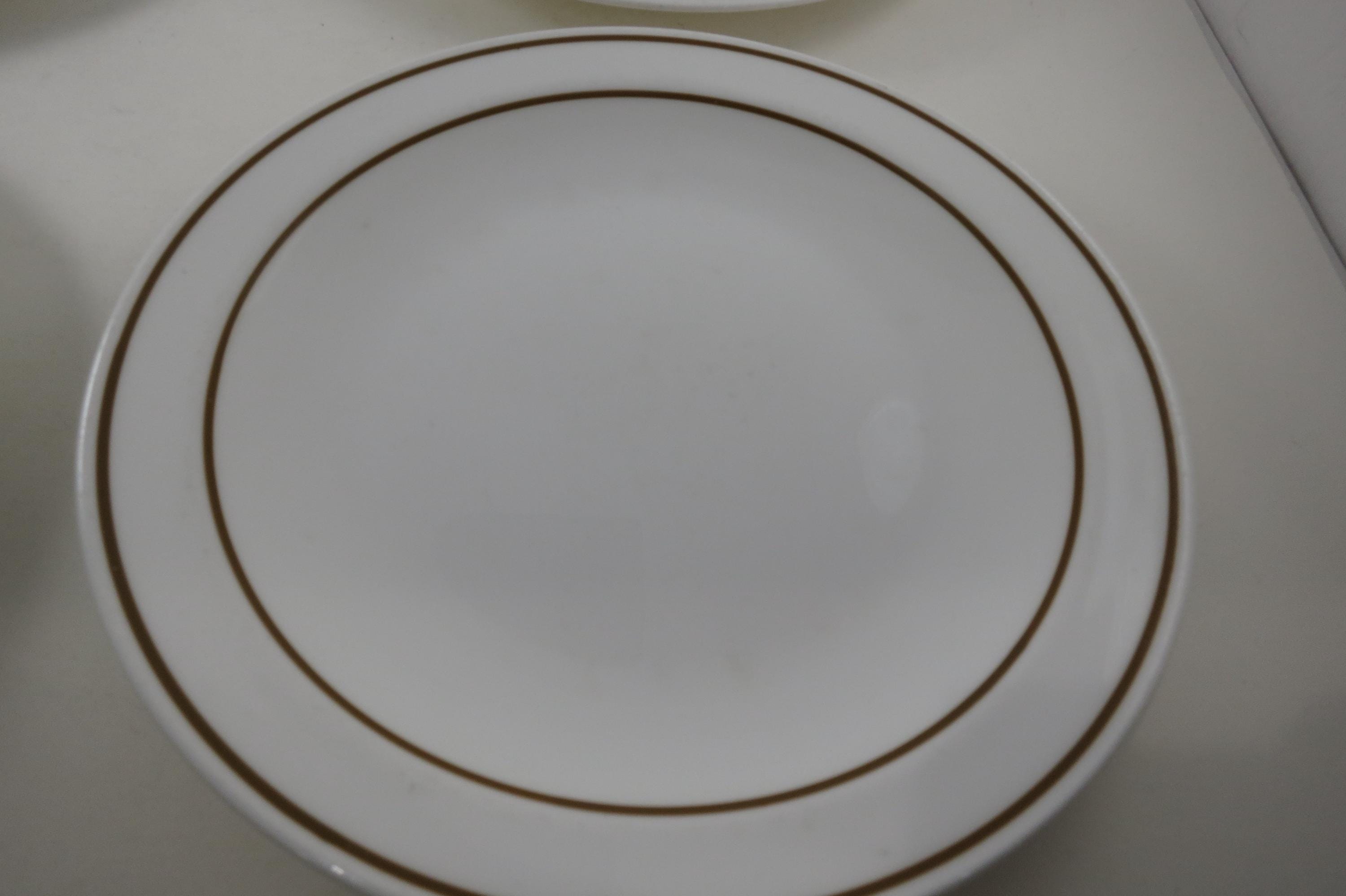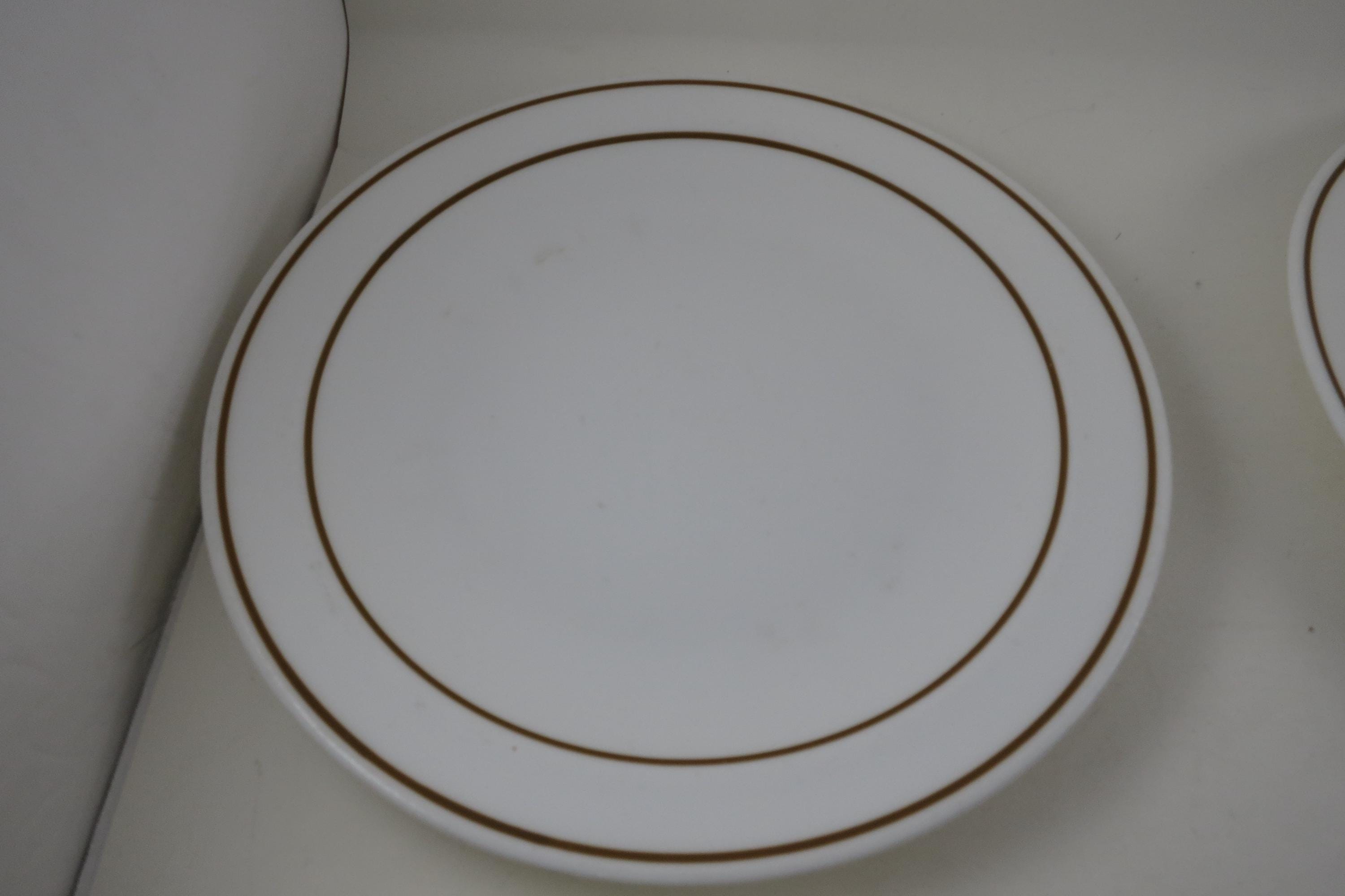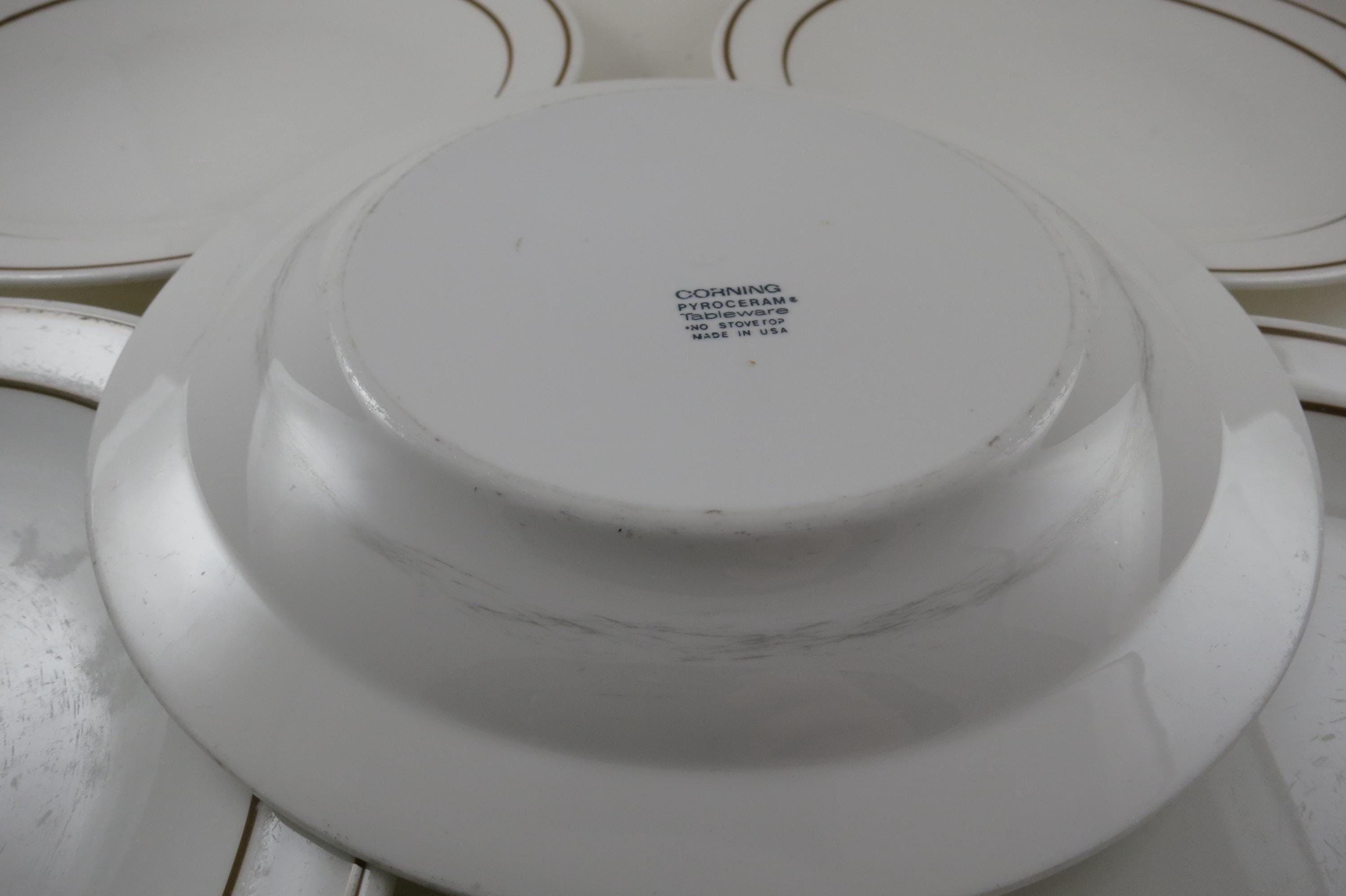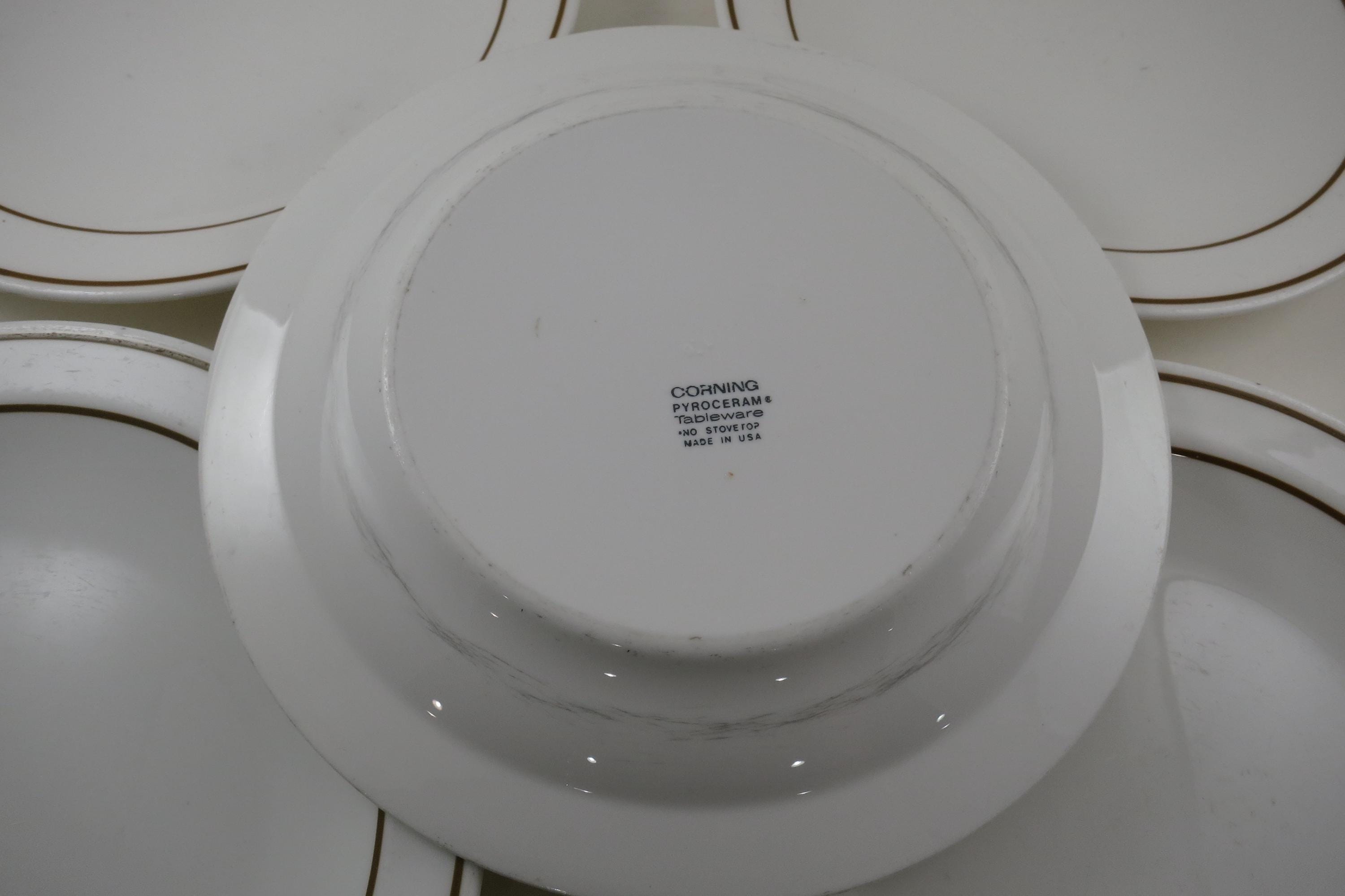 Set of Five Pyroceram Corning Corelle Gold Edge 9 Inch Luncheon Plates. These are in very good condition with No chips, cracks or damages but they do show use wear.