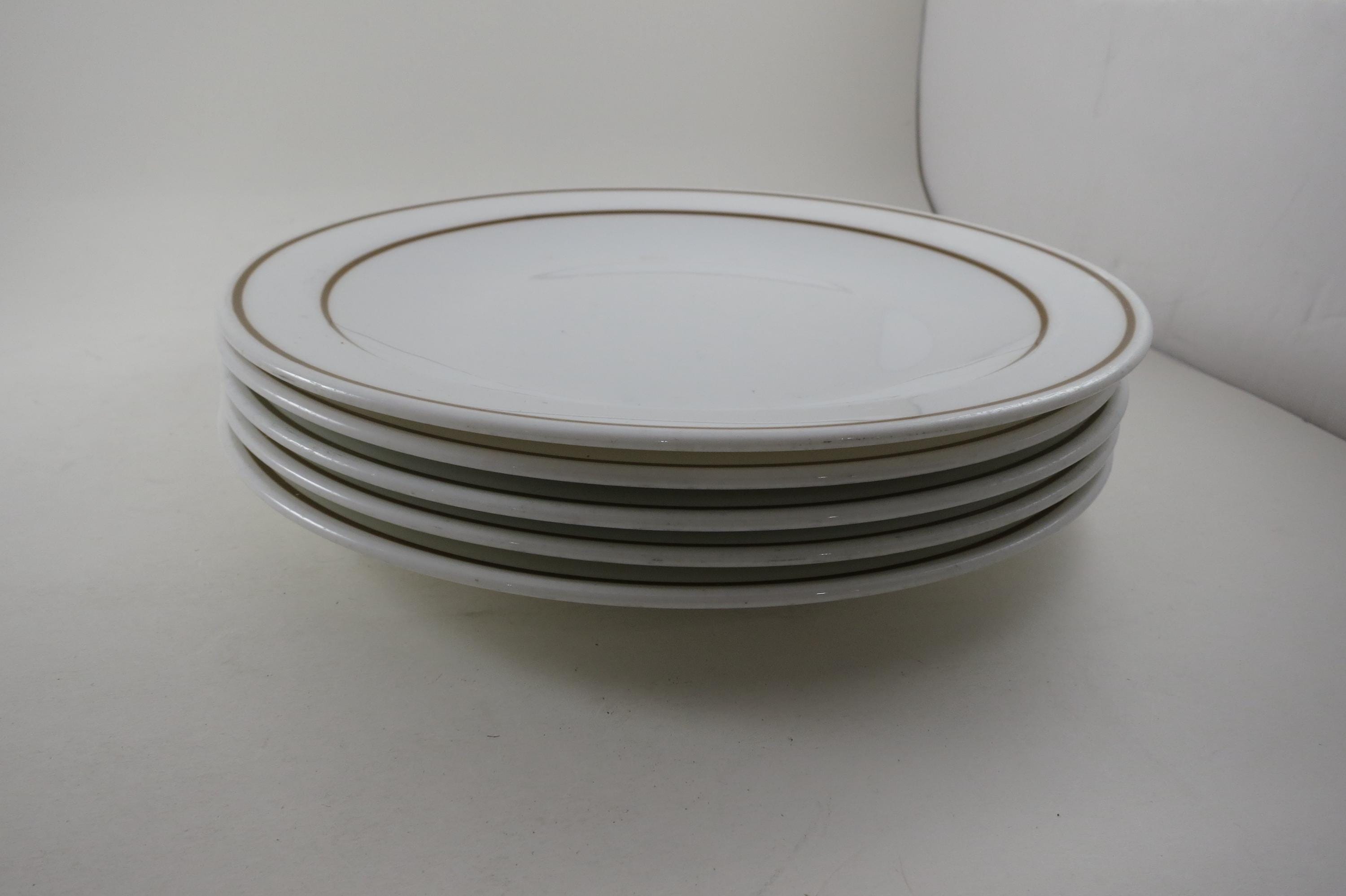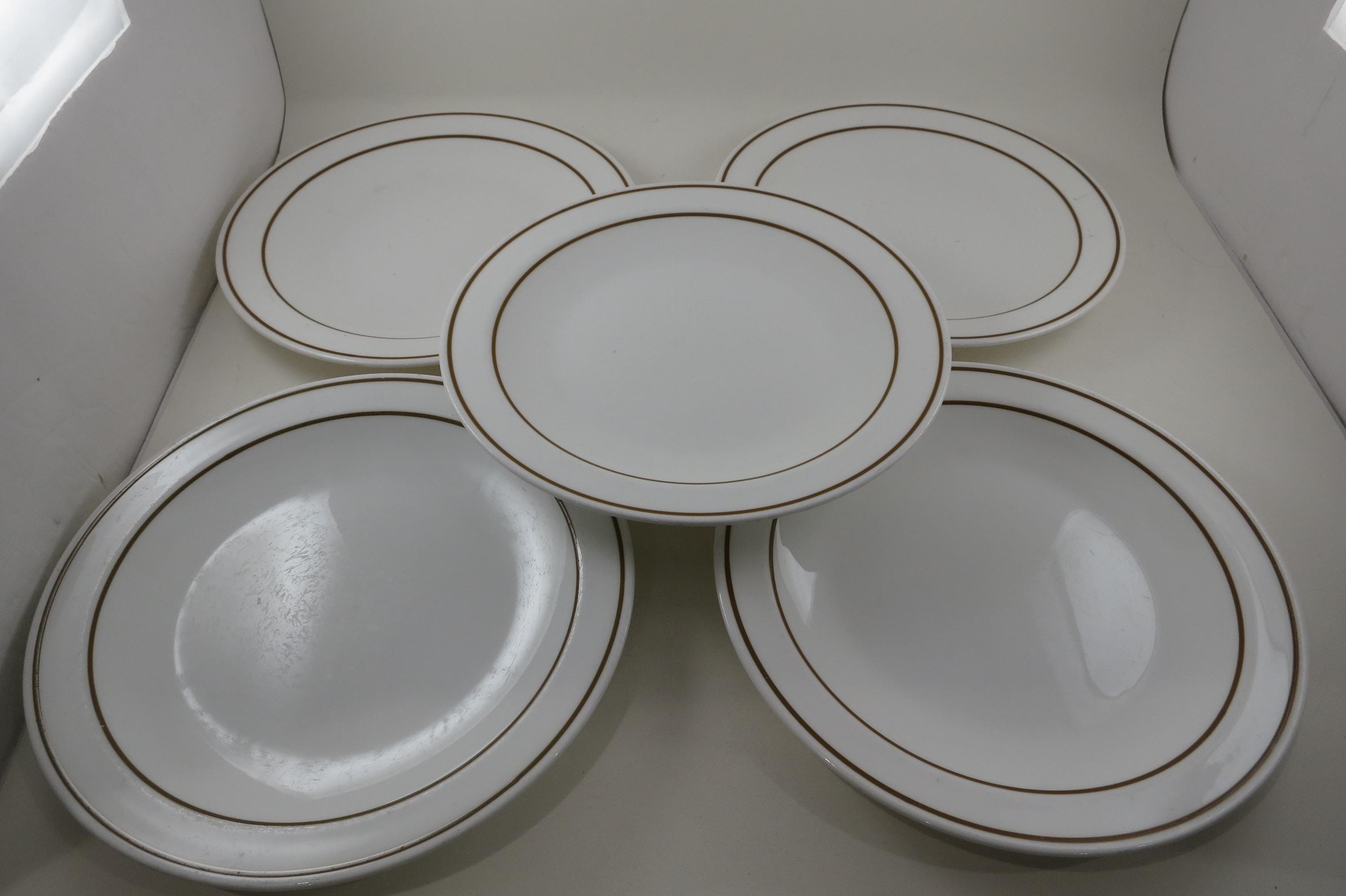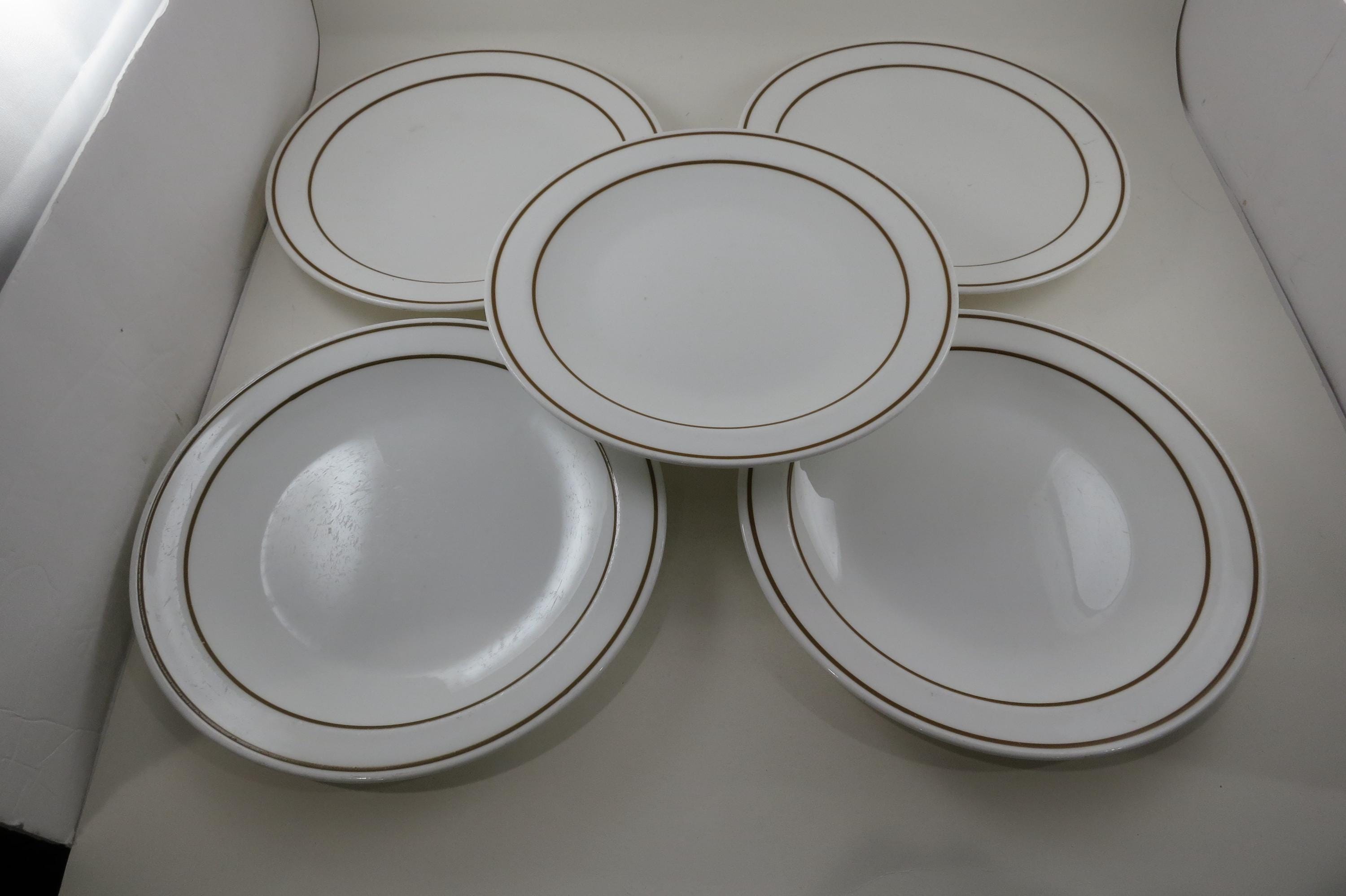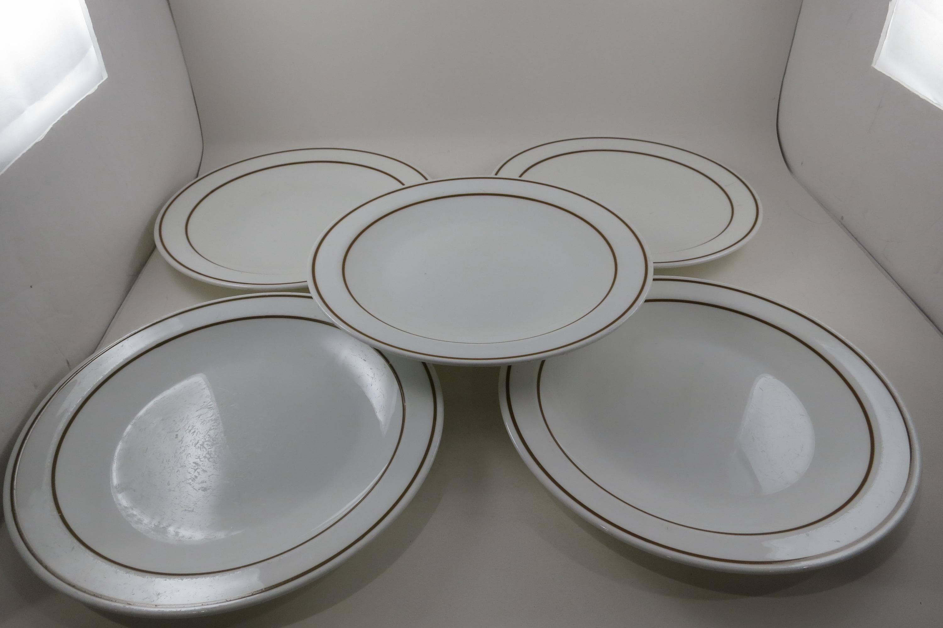 Set of Five Pyroceram Corning Corelle Gold Edge 9 Inch Luncheon Plates. These are in very good condition with No chips, cracks or damages but they do show use wear.