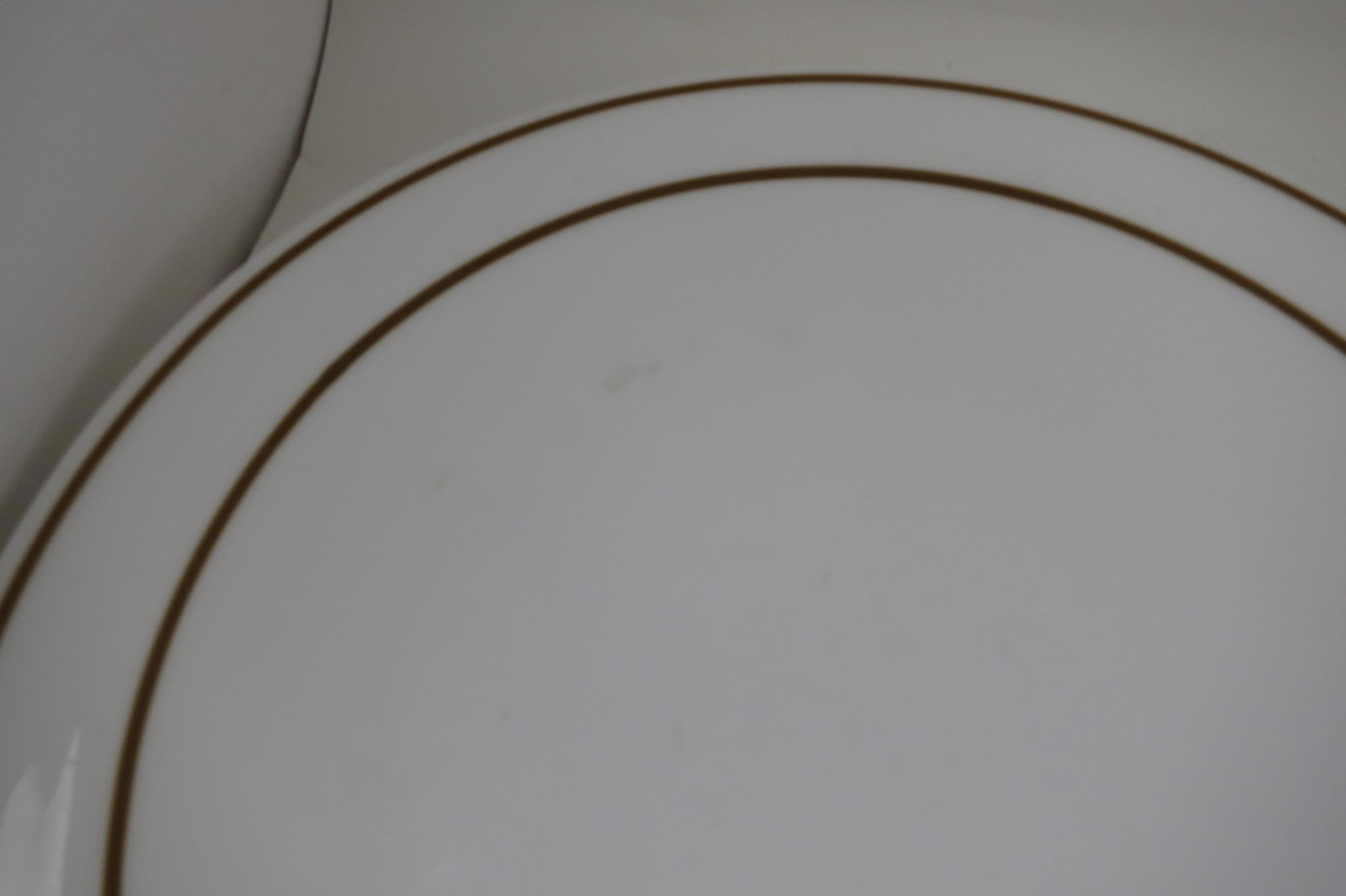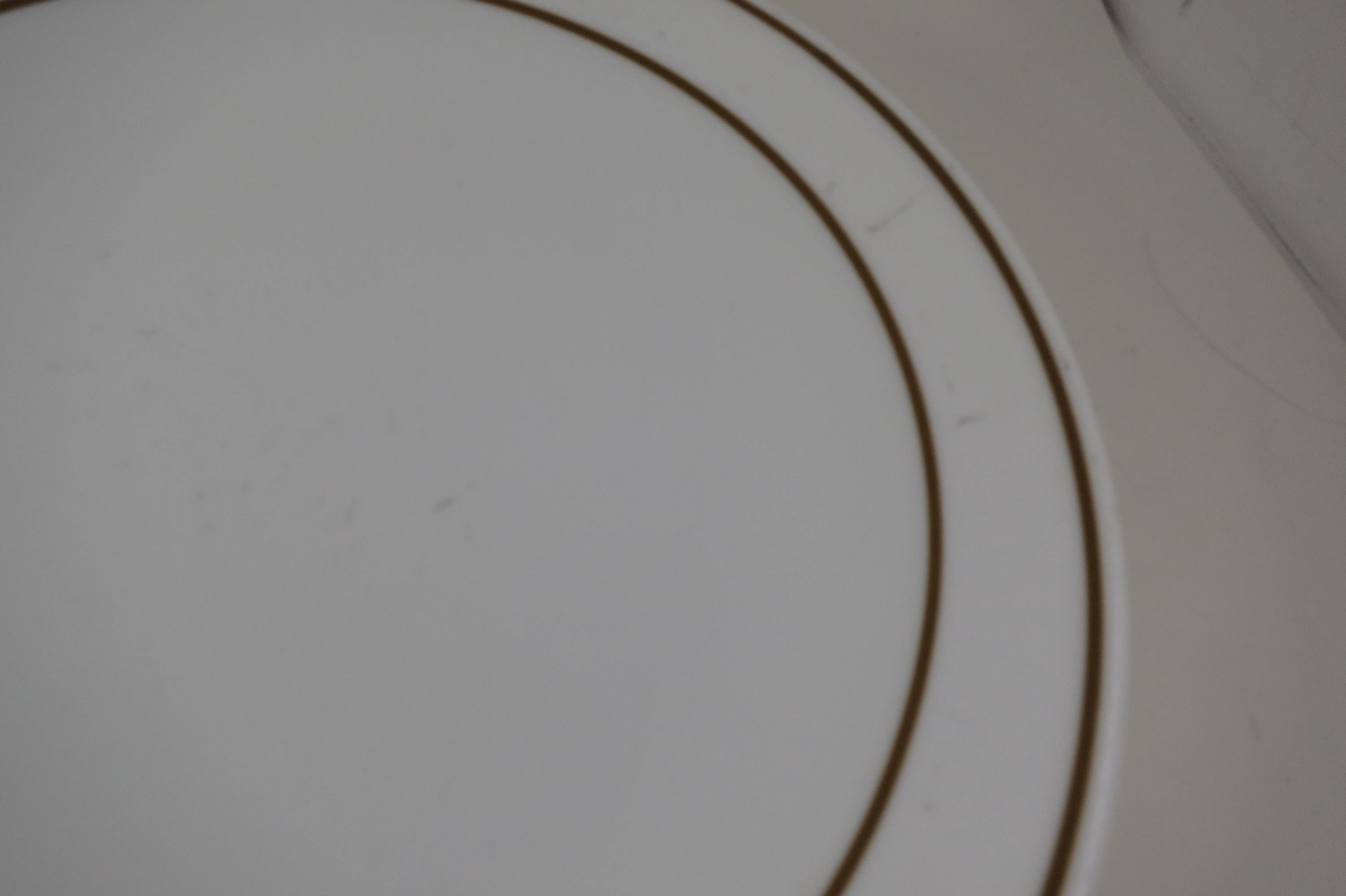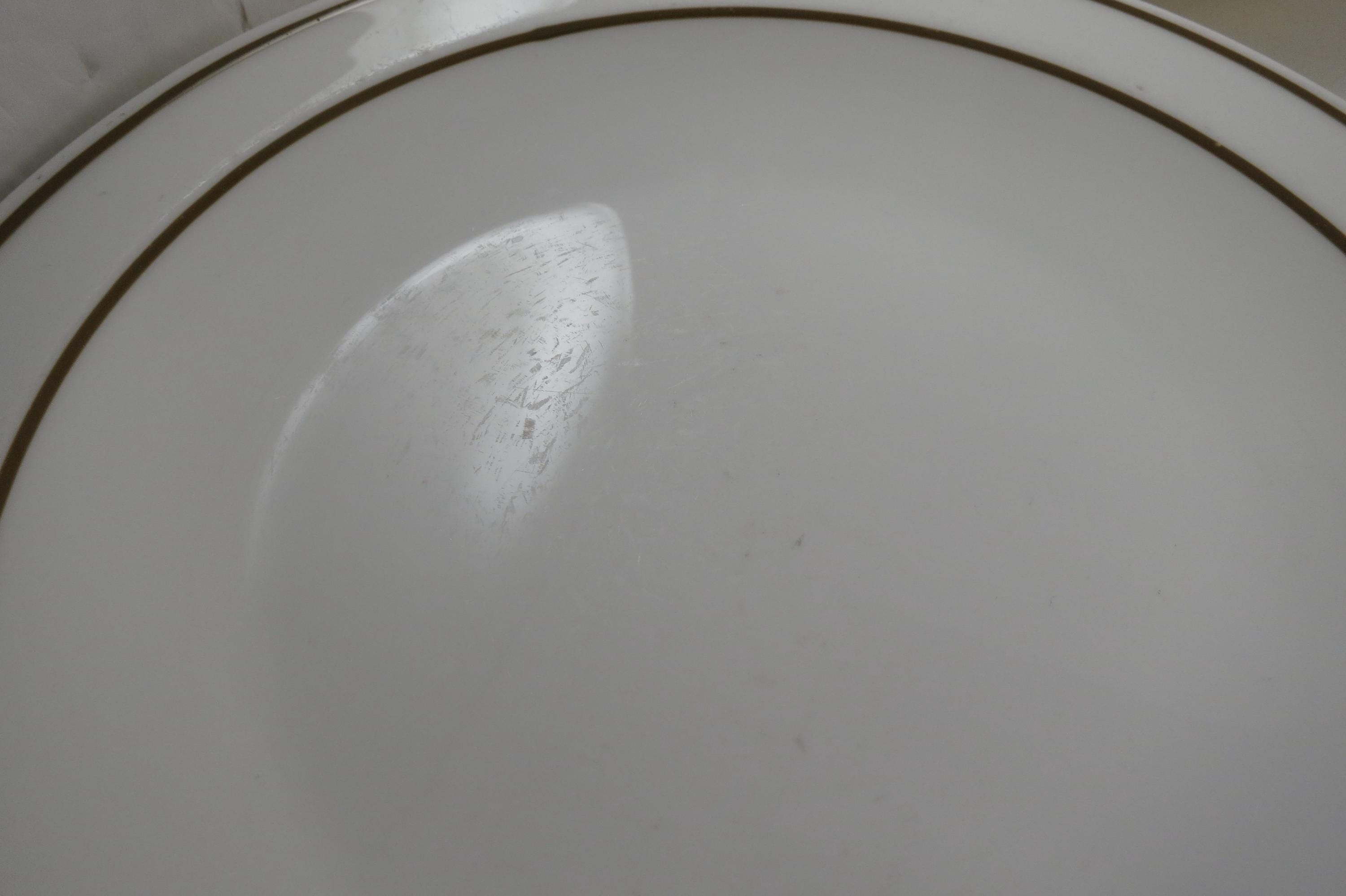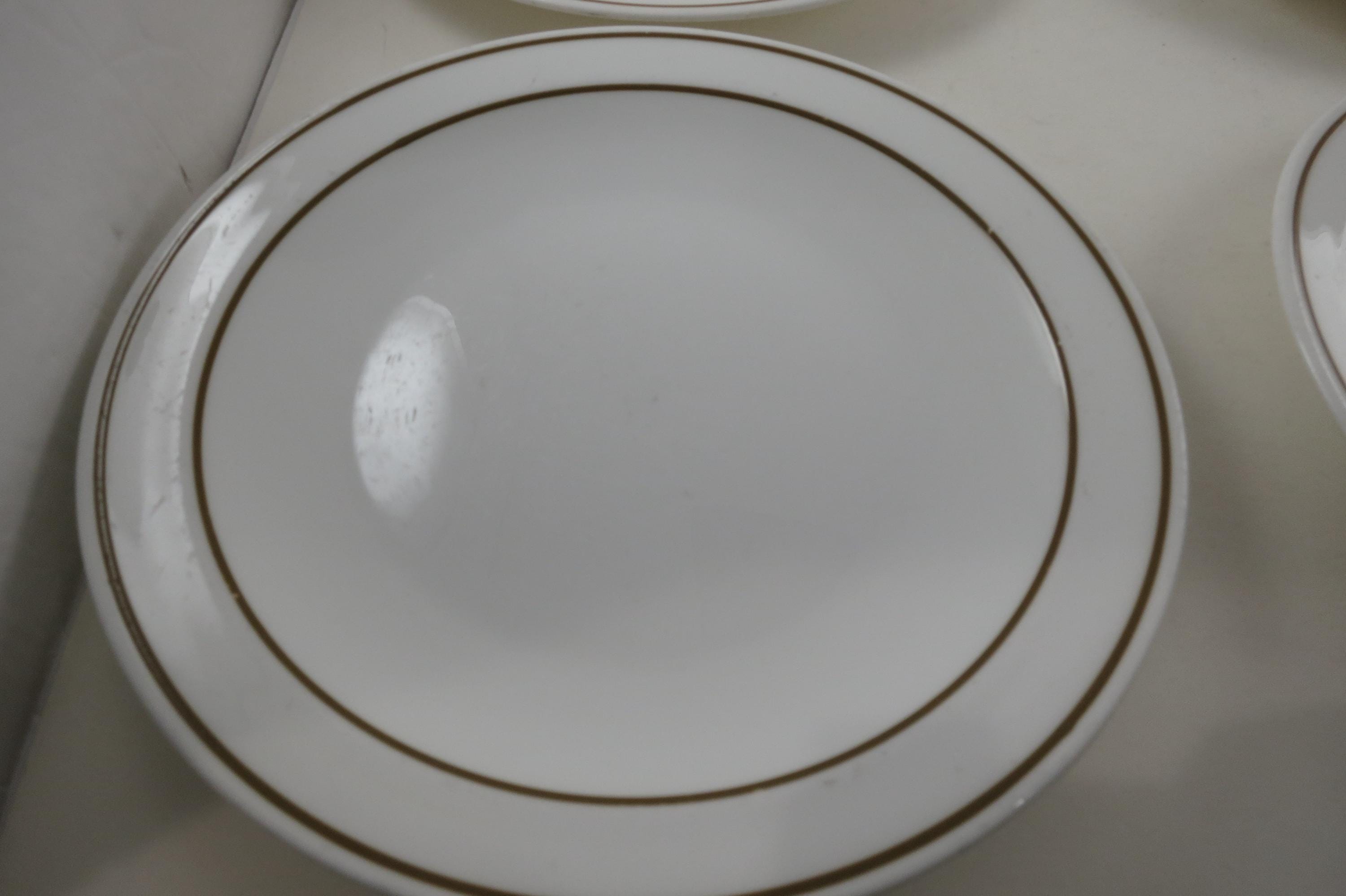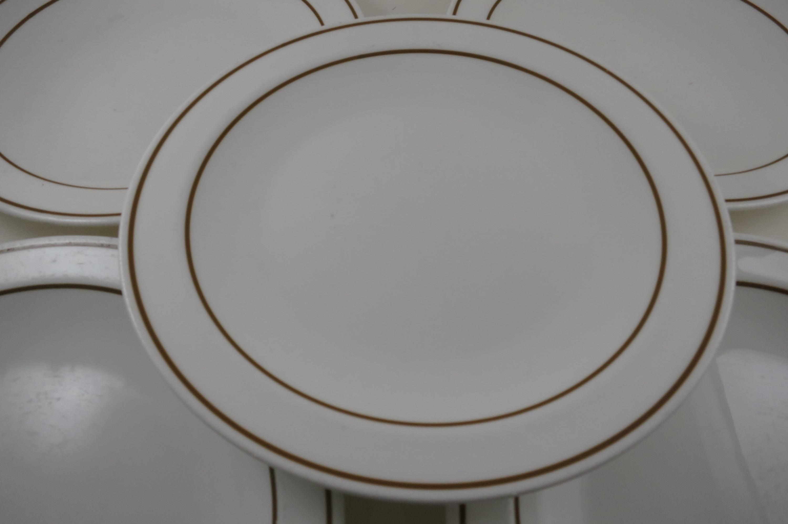 Set of Five Pyroceram Corning Corelle Gold Edge 9 Inch Luncheon Plates. These are in very good condition with No chips, cracks or damages but they do show use wear.