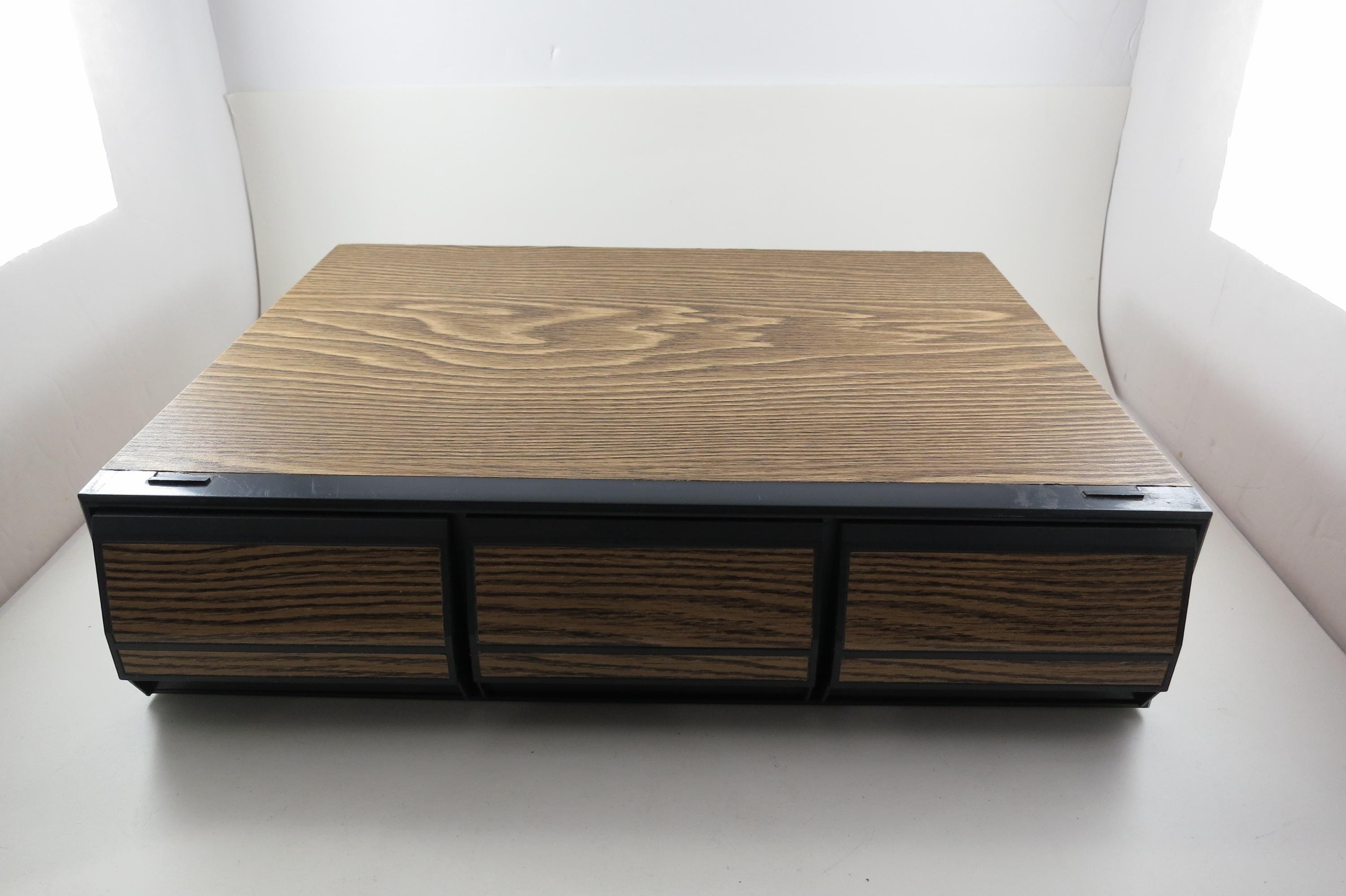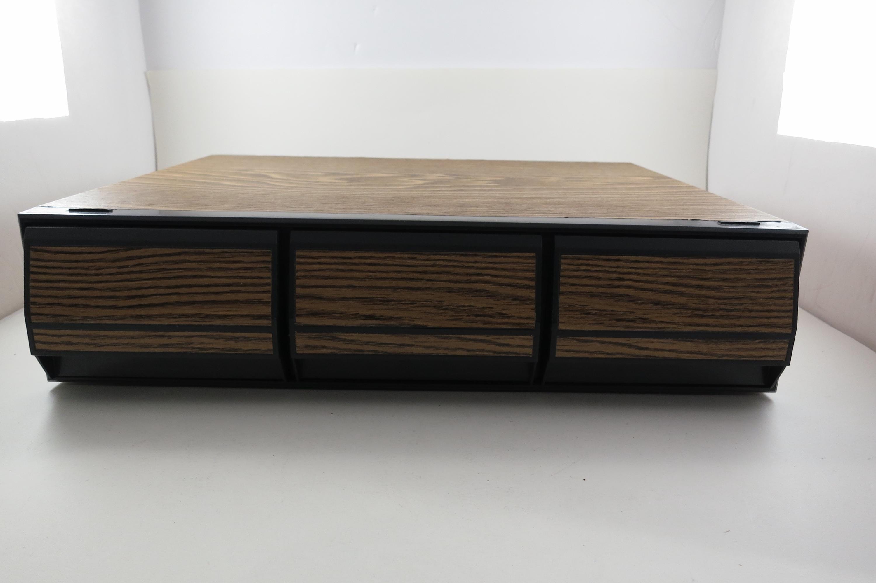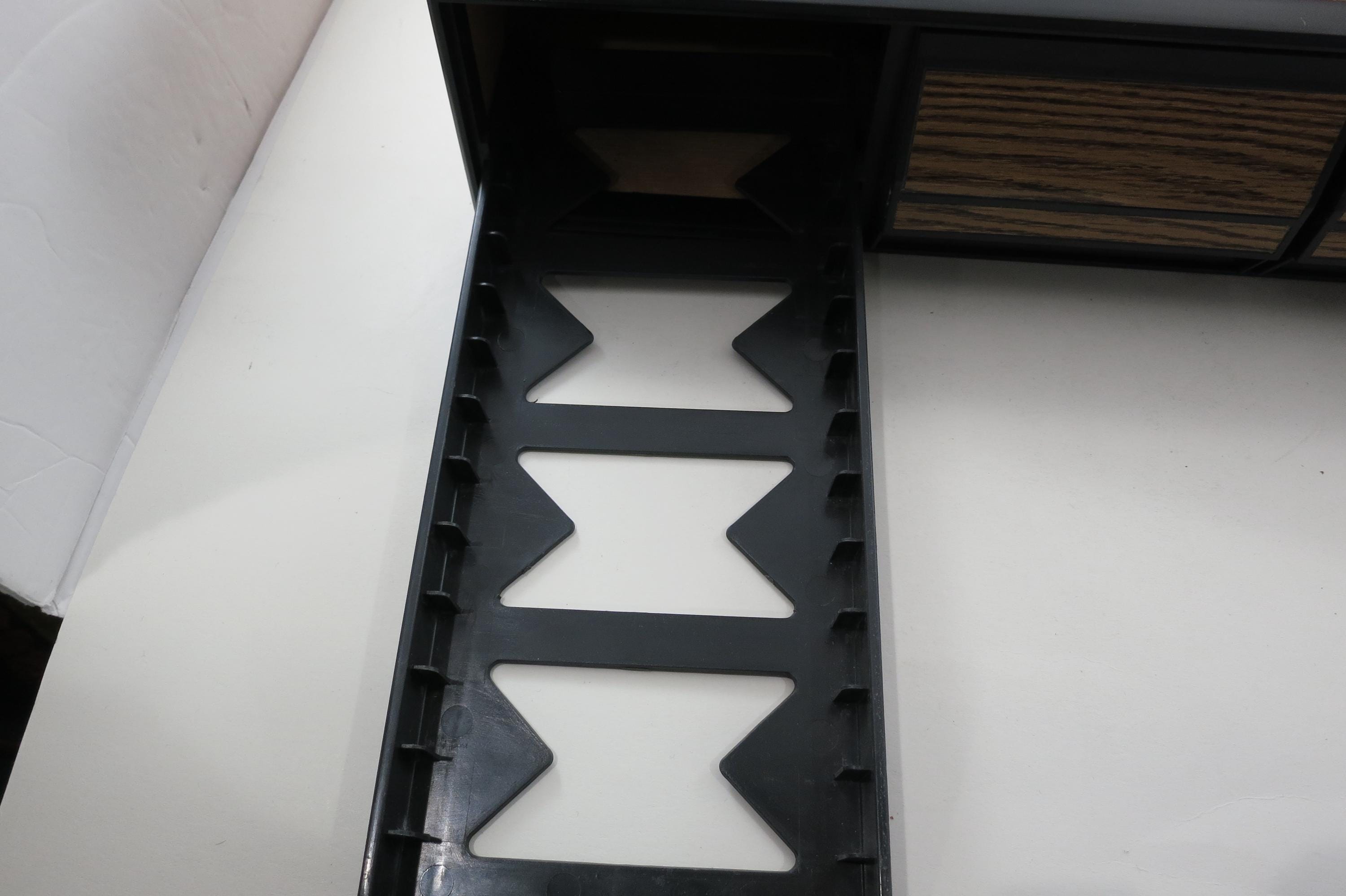 1980's Faux Wood Three Row Hard Cassette Holder Holds 42 Cassette Tapes Excellent Condition Home Storage. Has three pull out trays that each hold 14 Cassettes for a total of 42. This is the hard variety that is for home cassette storage. Measures 16 3/4 inches wide, 12 1/4 inches deep and 3 5/8 inches tall.