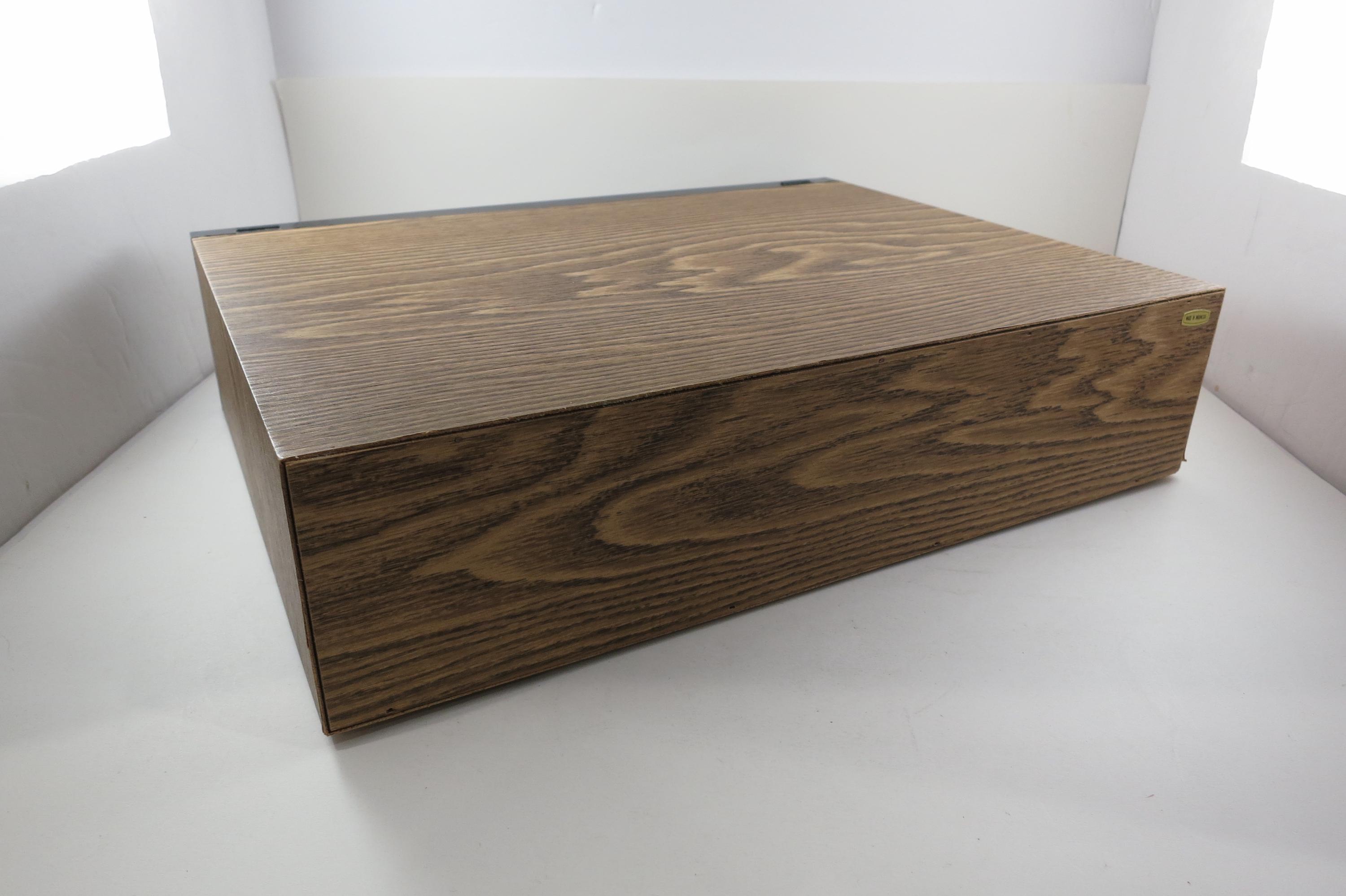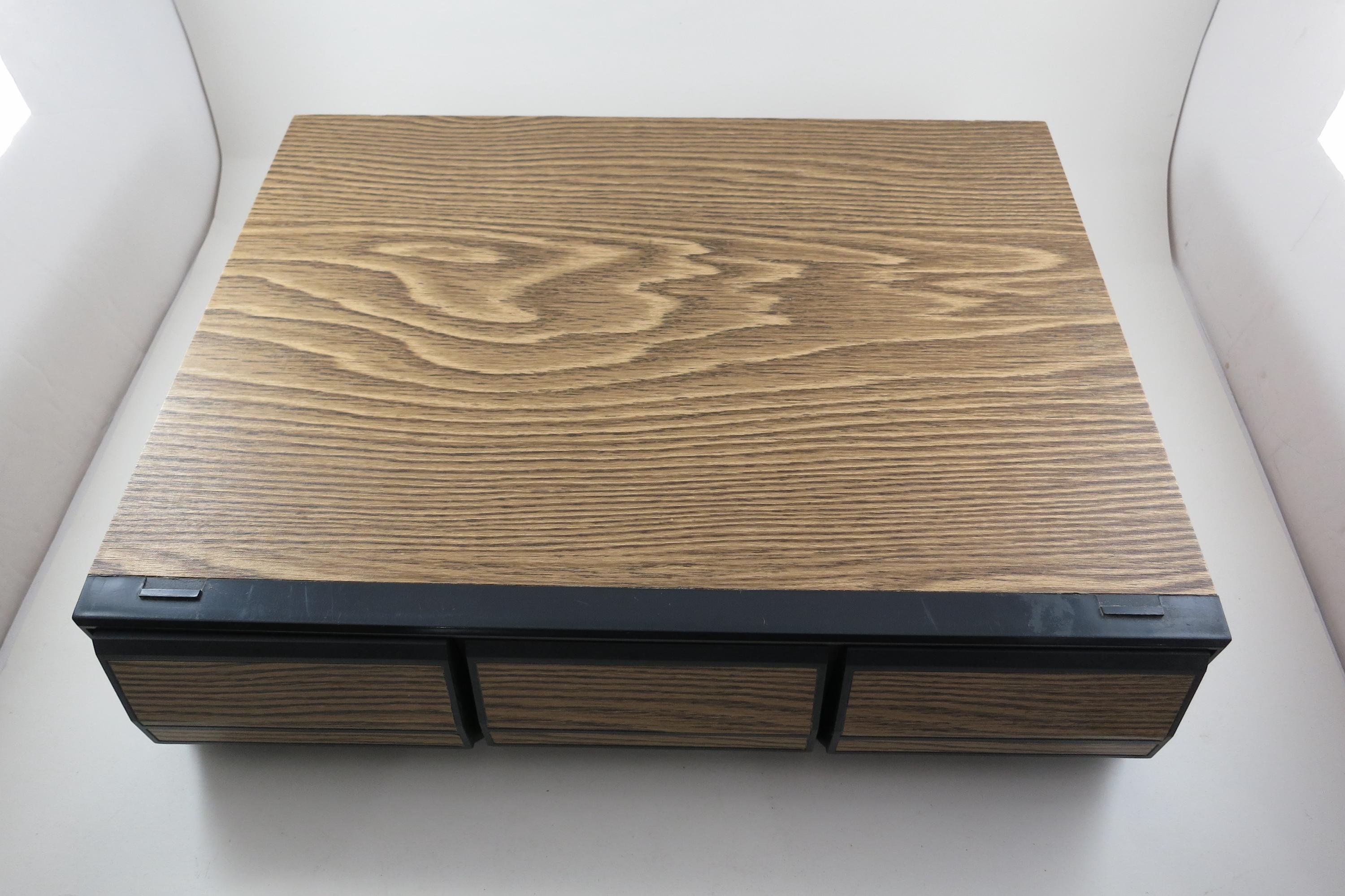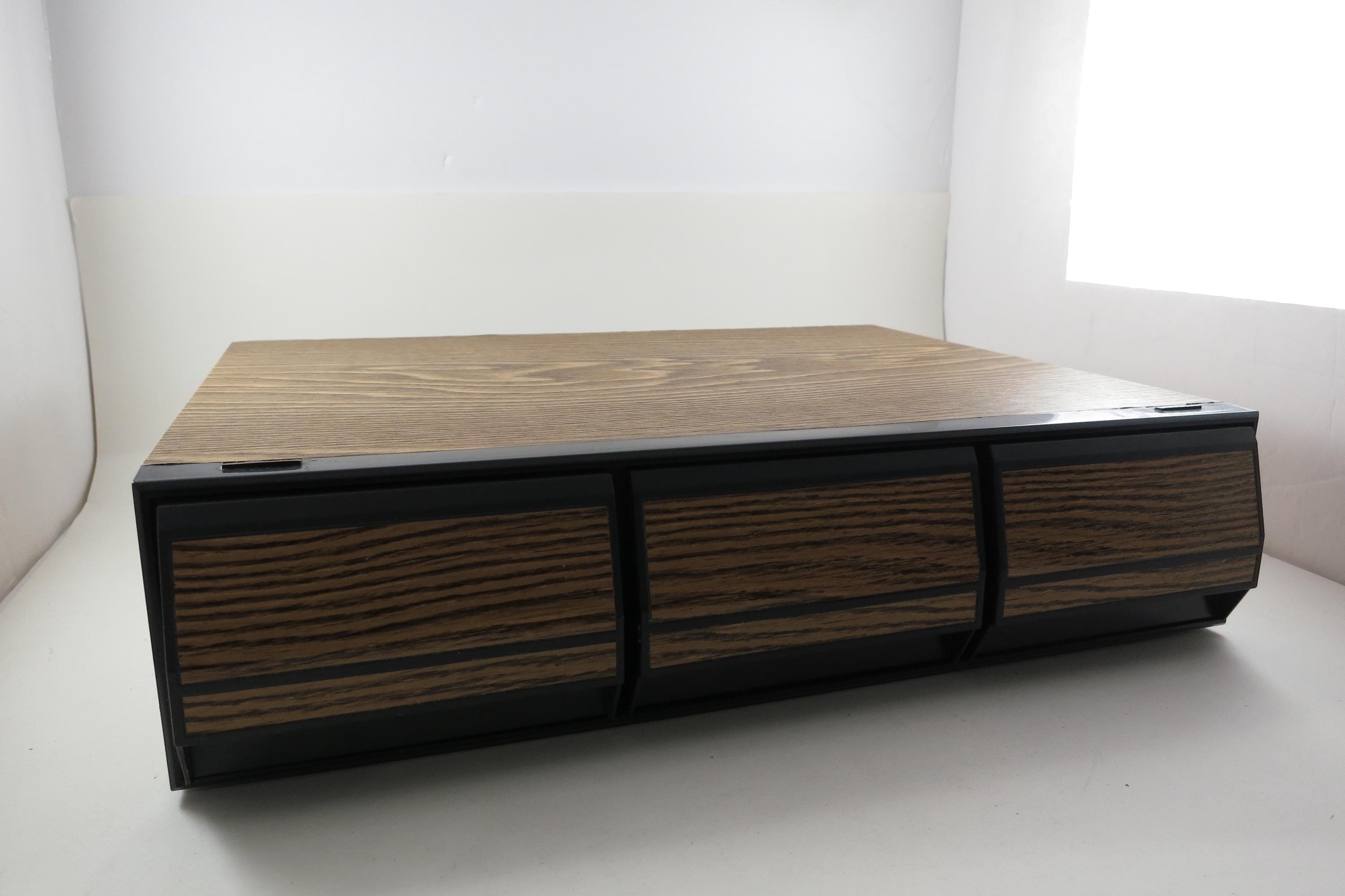 1980's Faux Wood Three Row Hard Cassette Holder Holds 42 Cassette Tapes Excellent Condition Home Storage. Has three pull out trays that each hold 14 Cassettes for a total of 42. This is the hard variety that is for home cassette storage. Measures 16 3/4 inches wide, 12 1/4 inches deep and 3 5/8 inches tall.