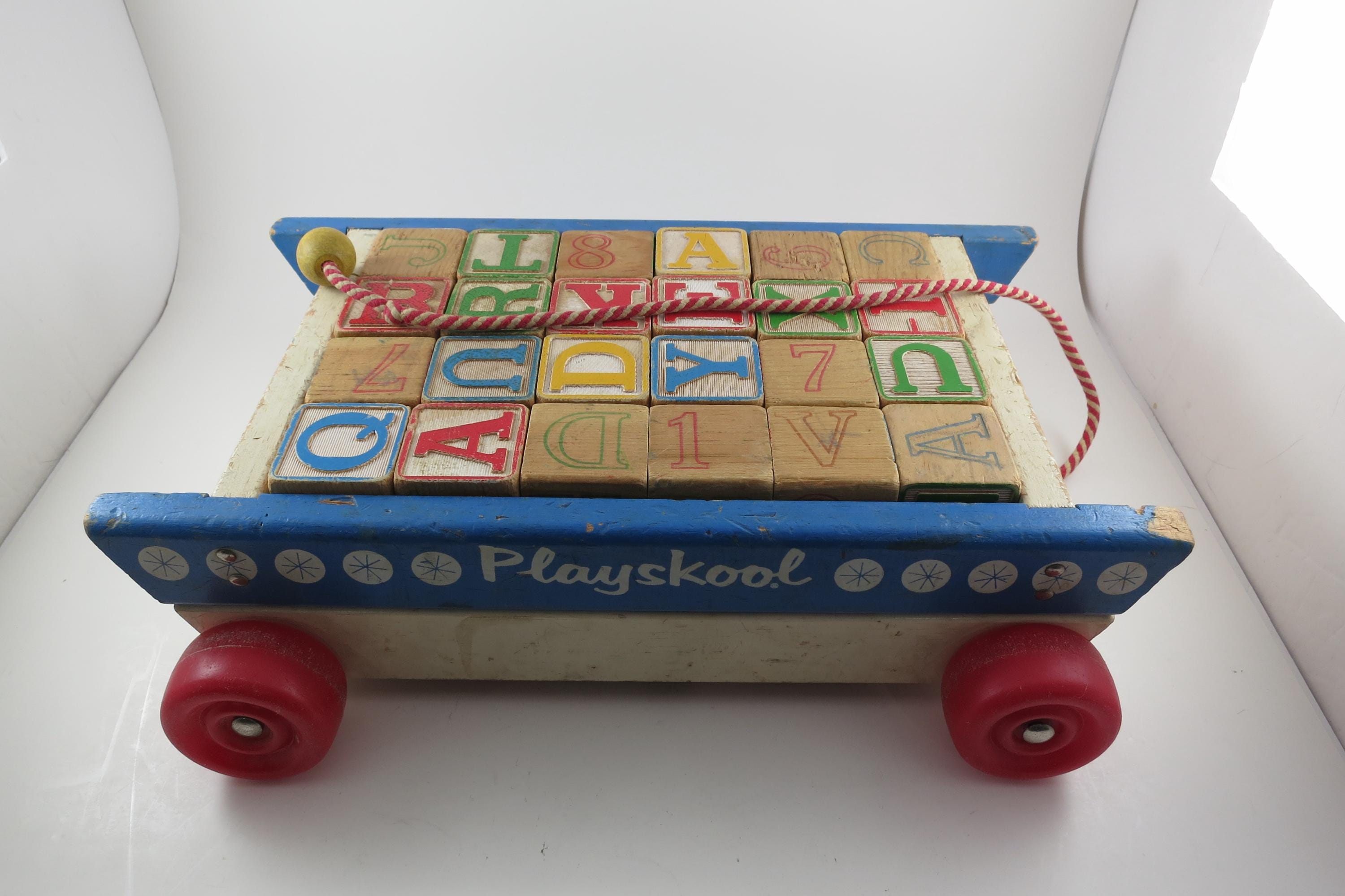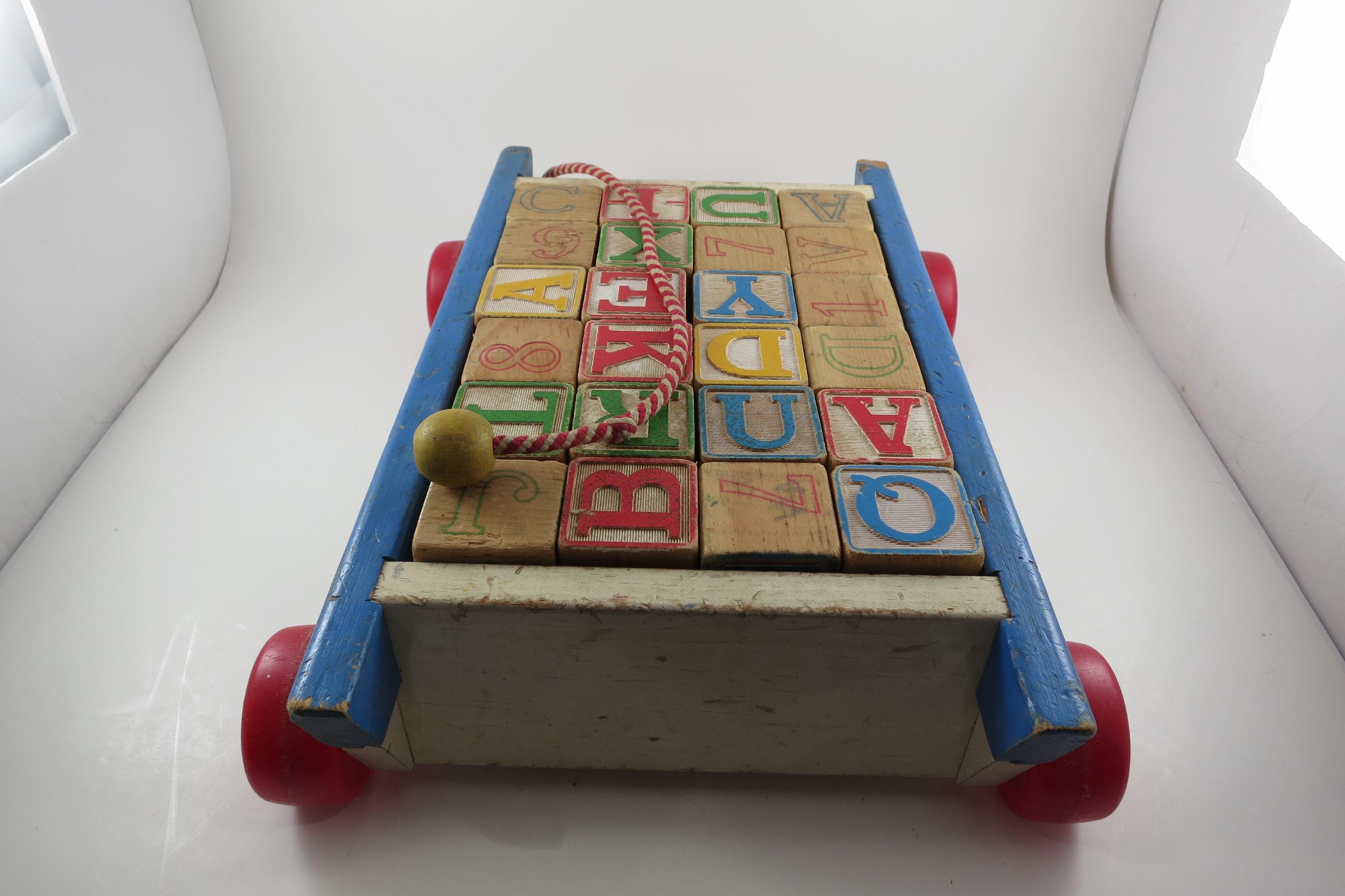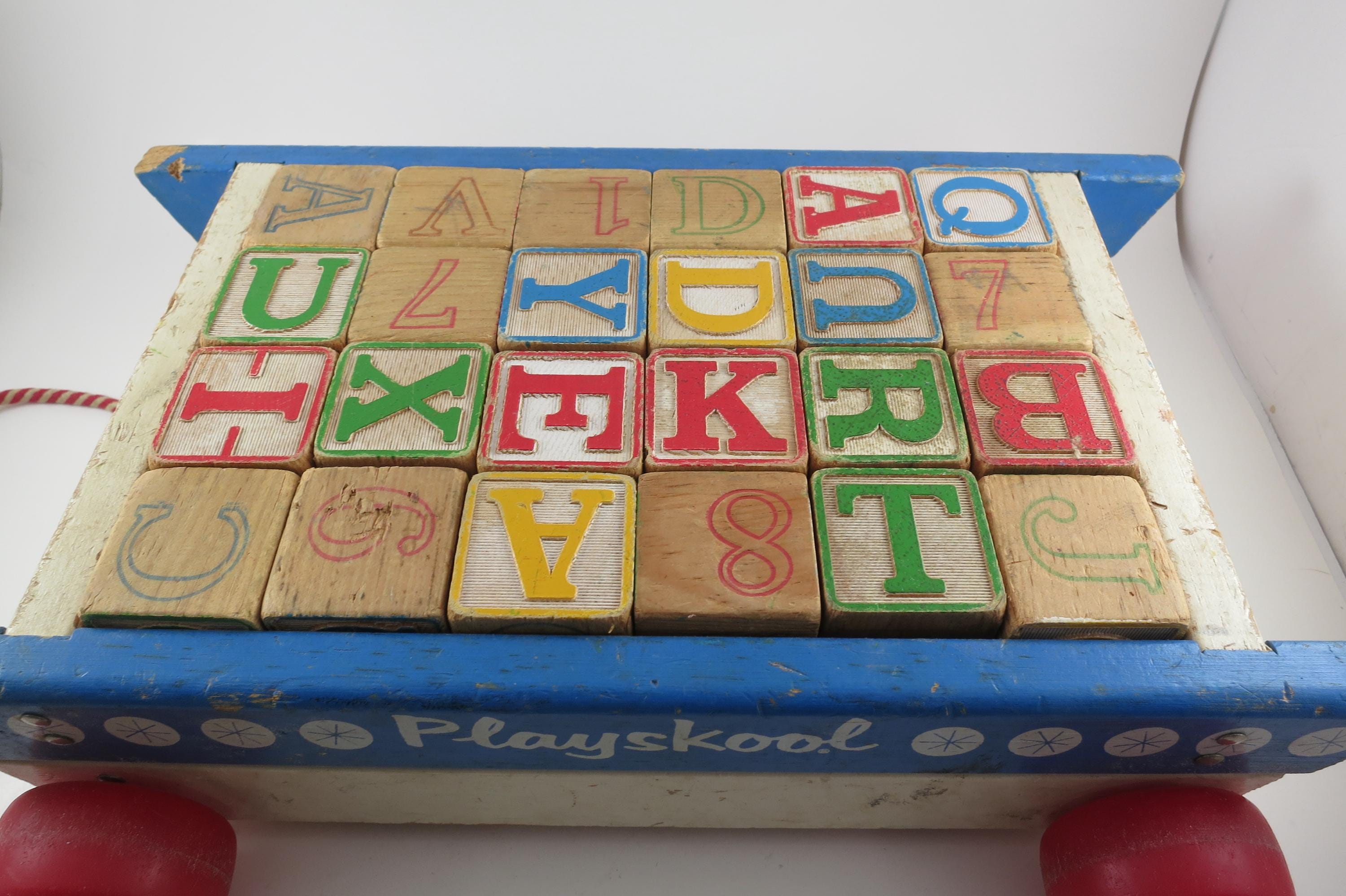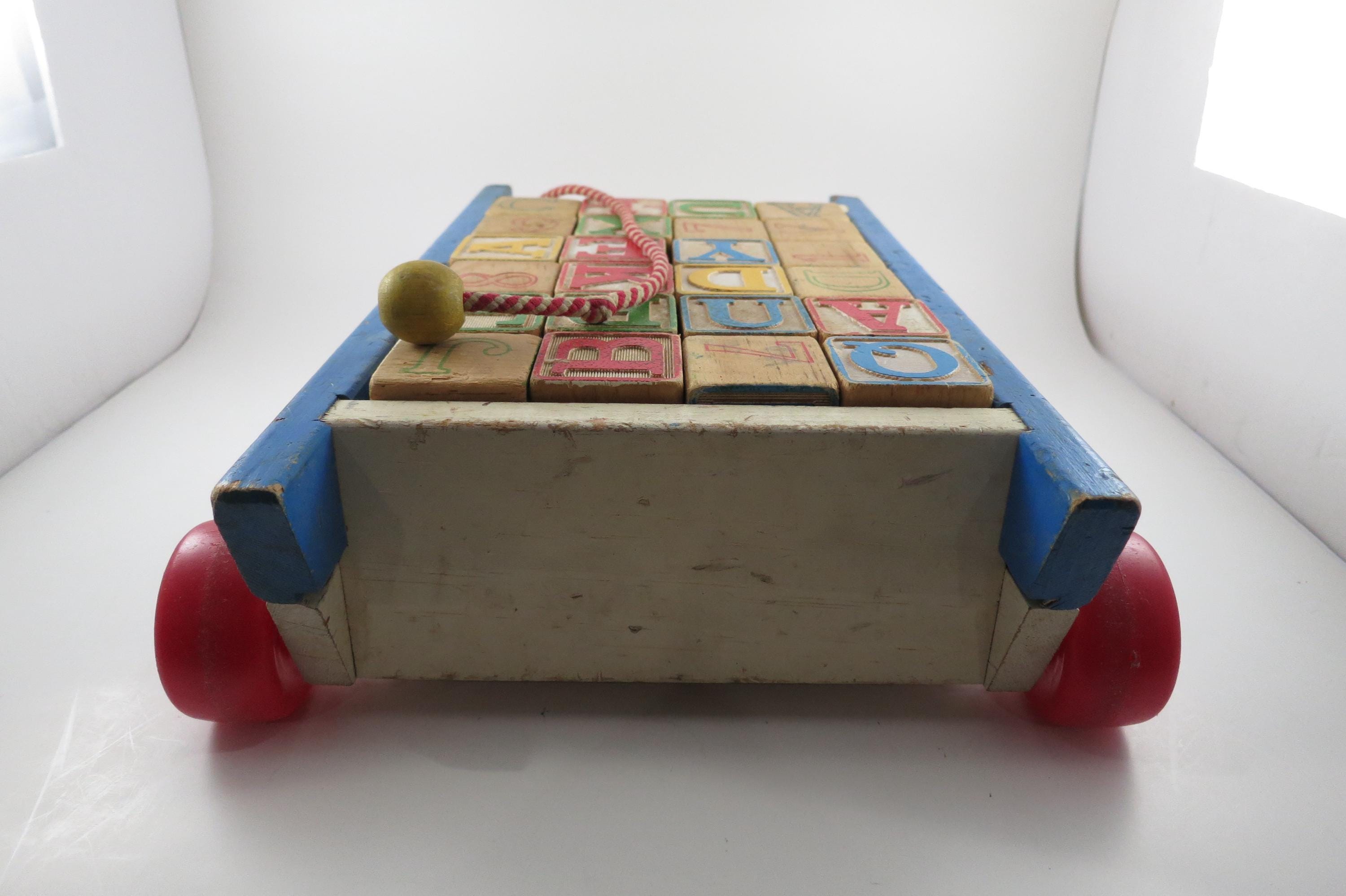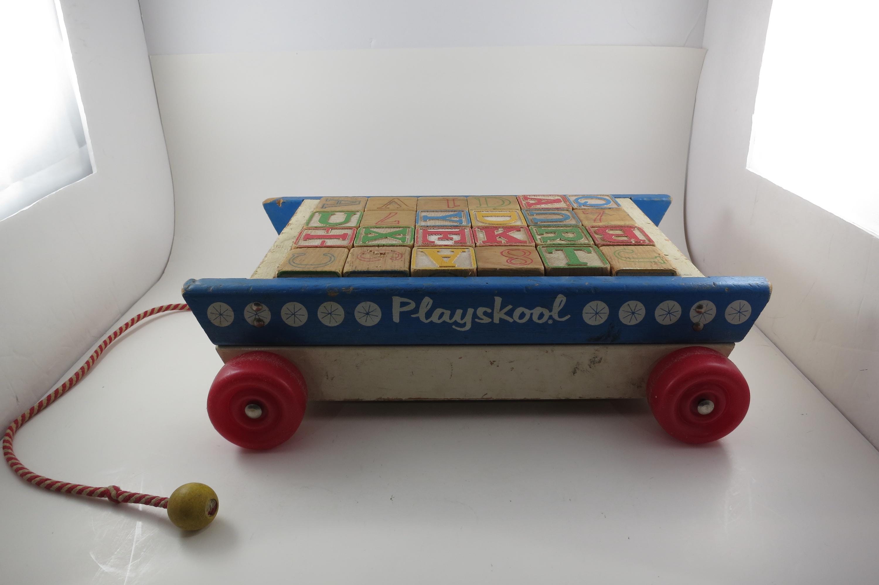 Vintage Wooden Playskool RWB Pull Along Wagon with Rope and 24 Original Blocks. Neat old toy!