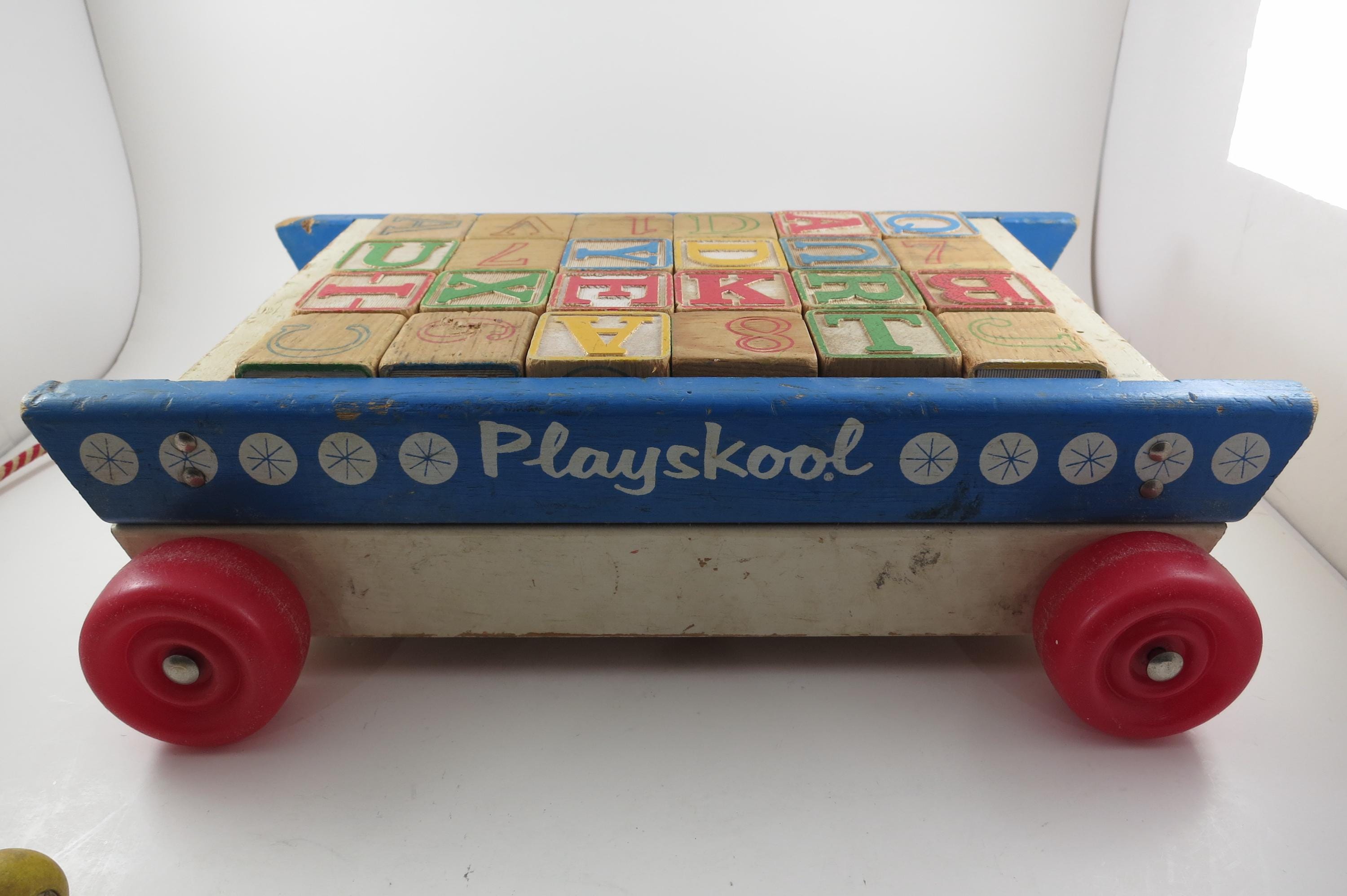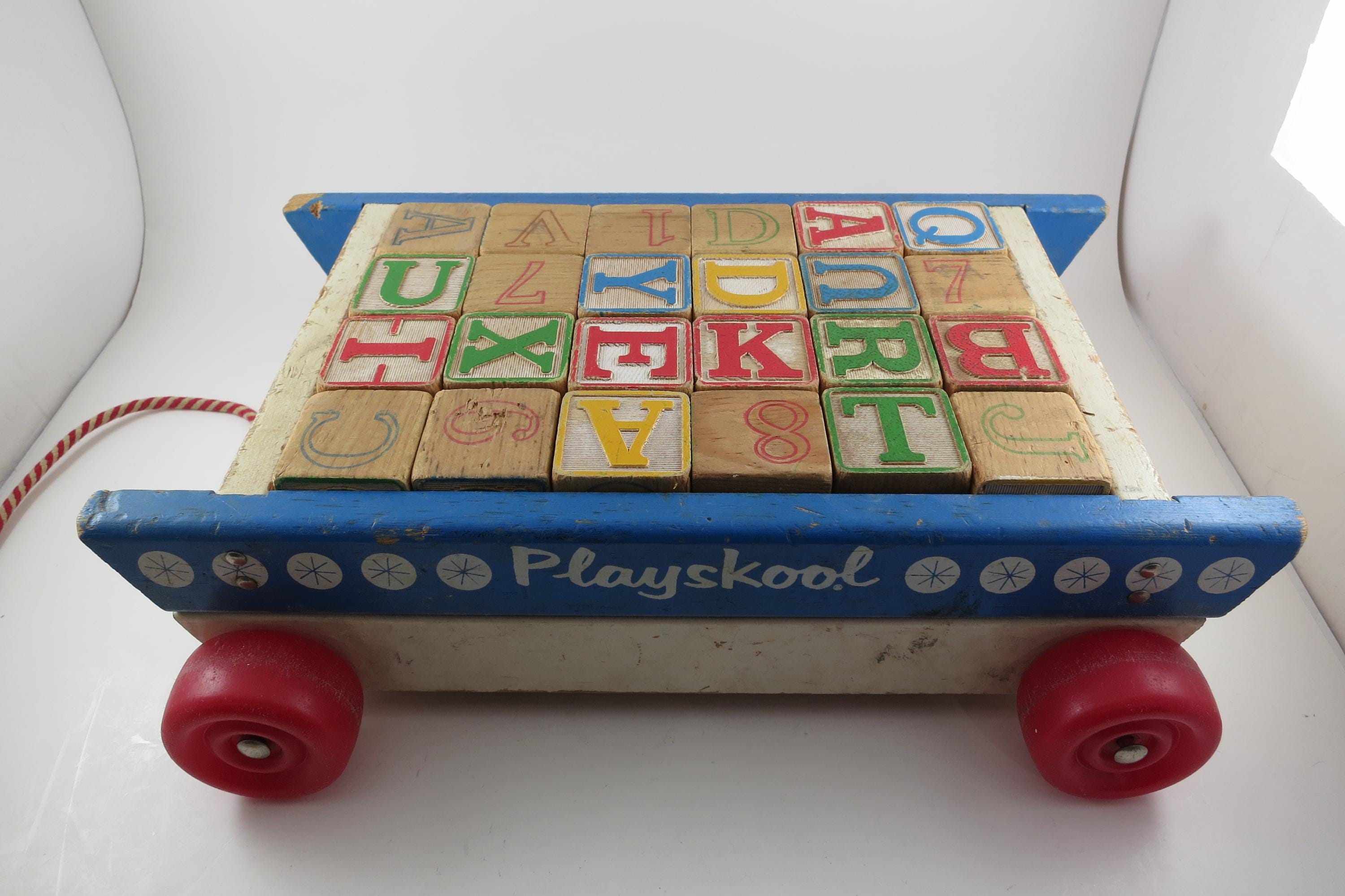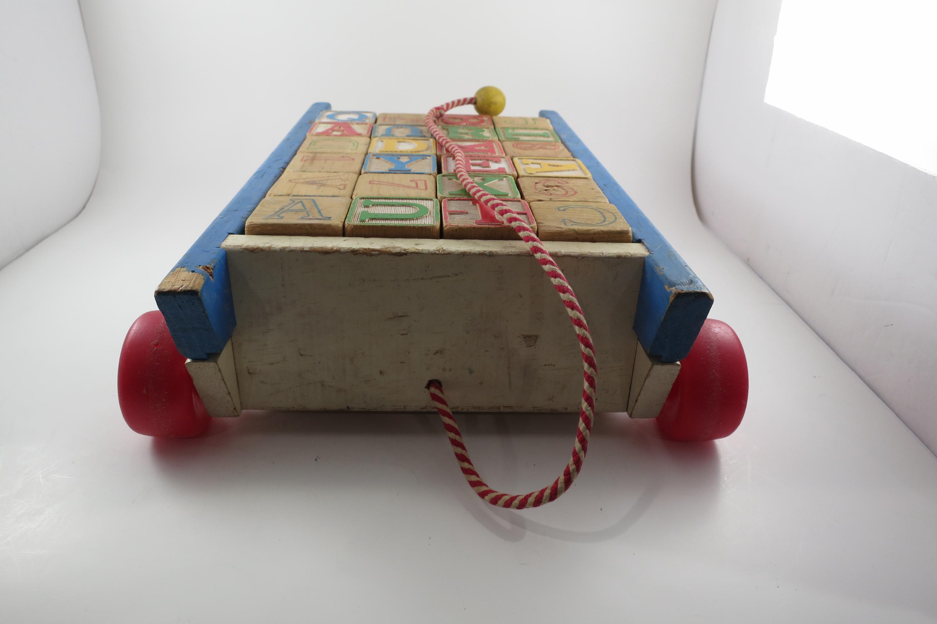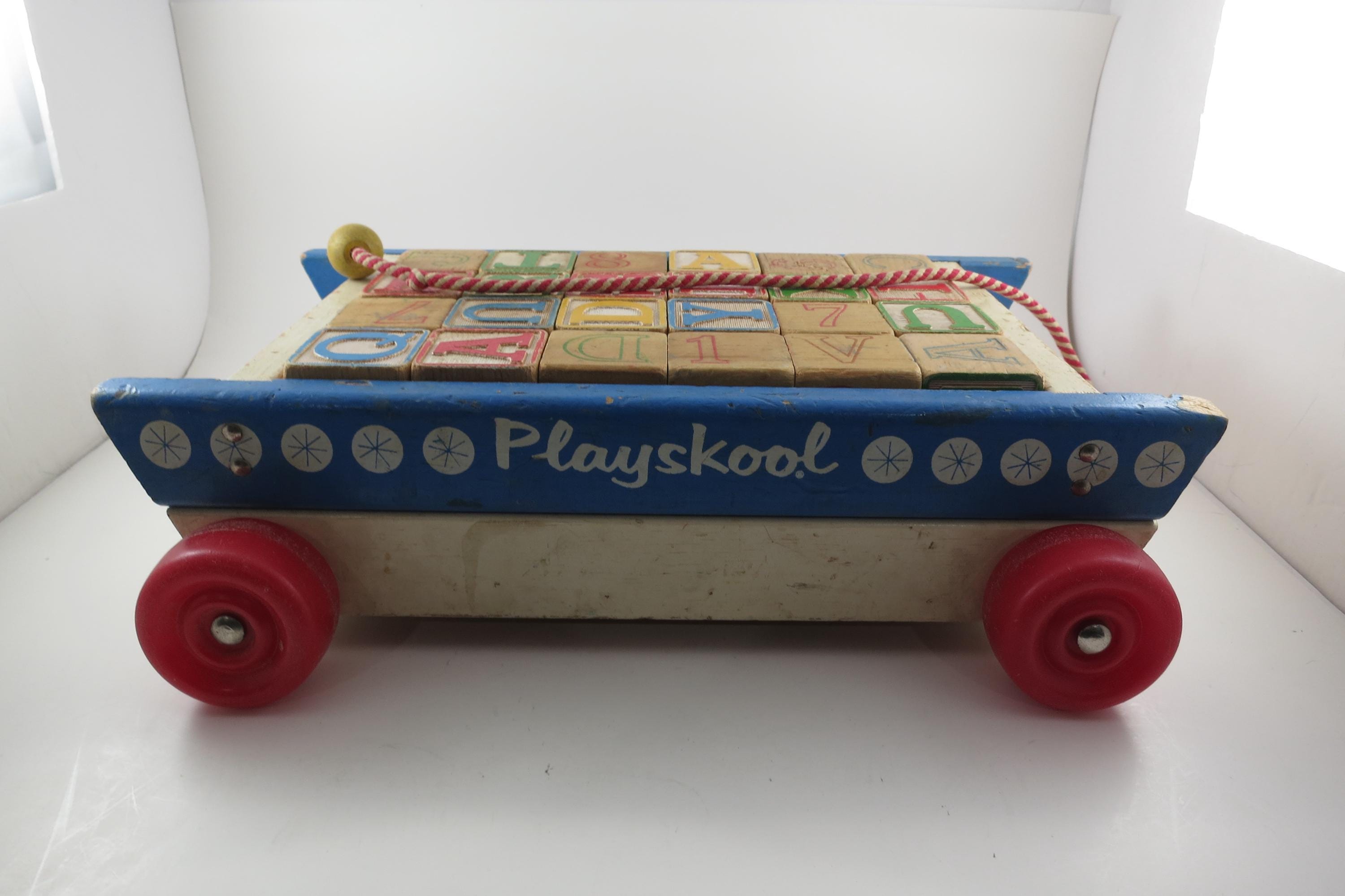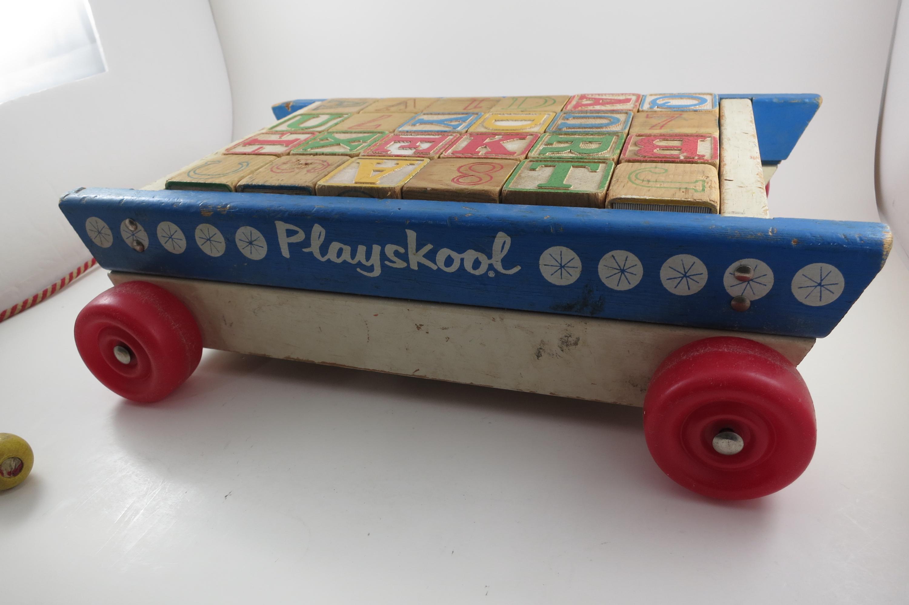 Vintage Wooden Playskool RWB Pull Along Wagon with Rope and 24 Original Blocks. Neat old toy!