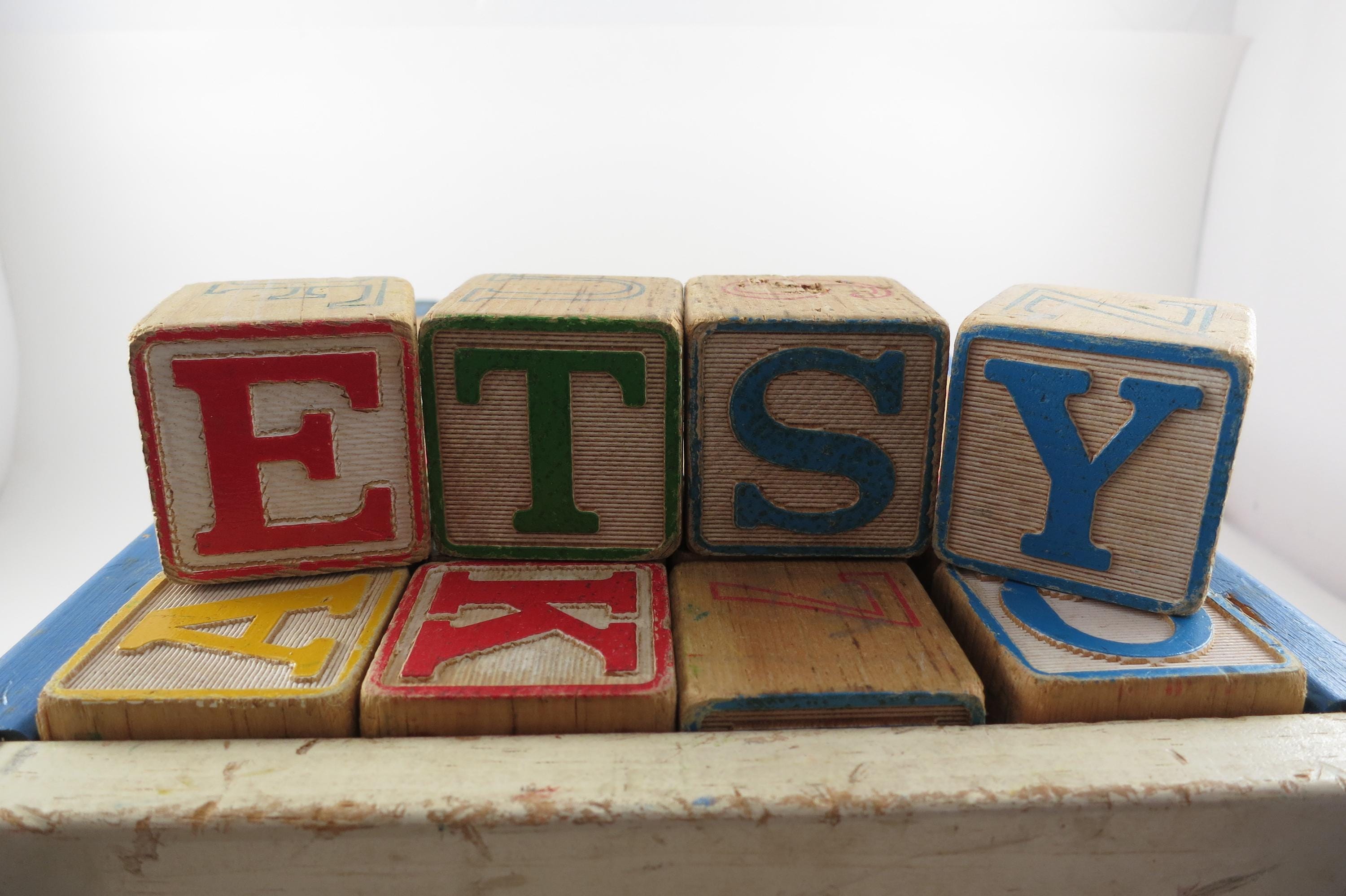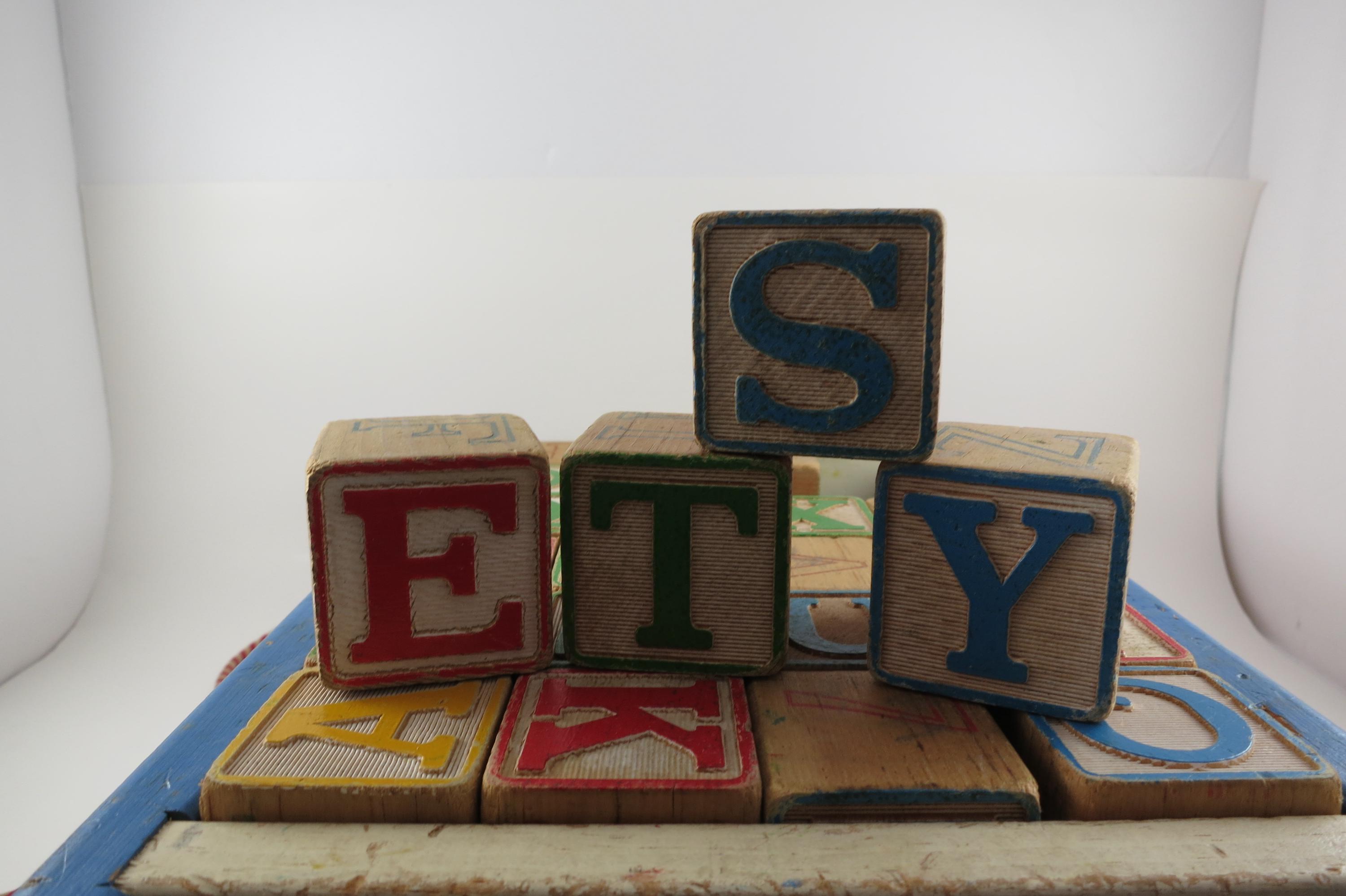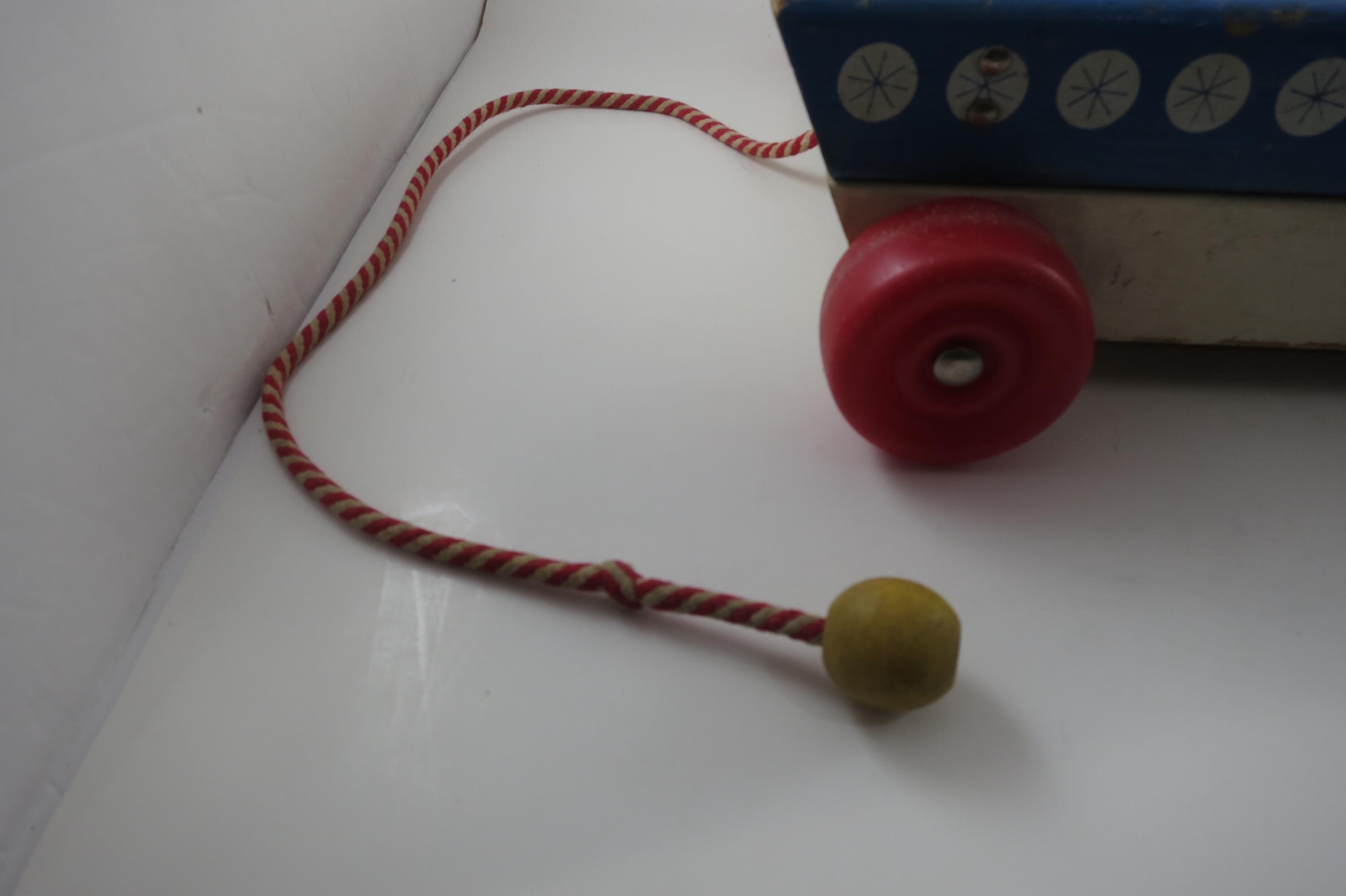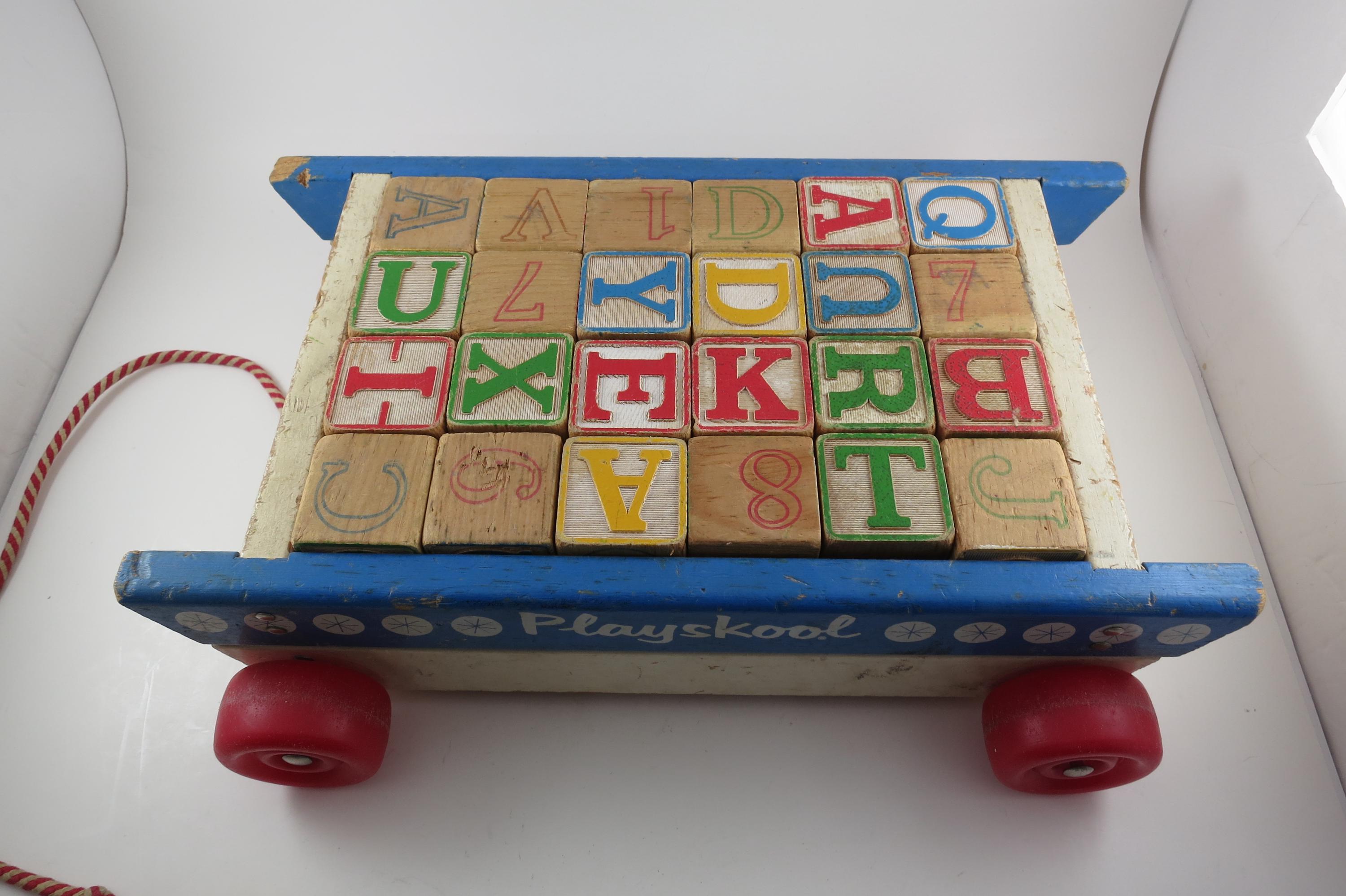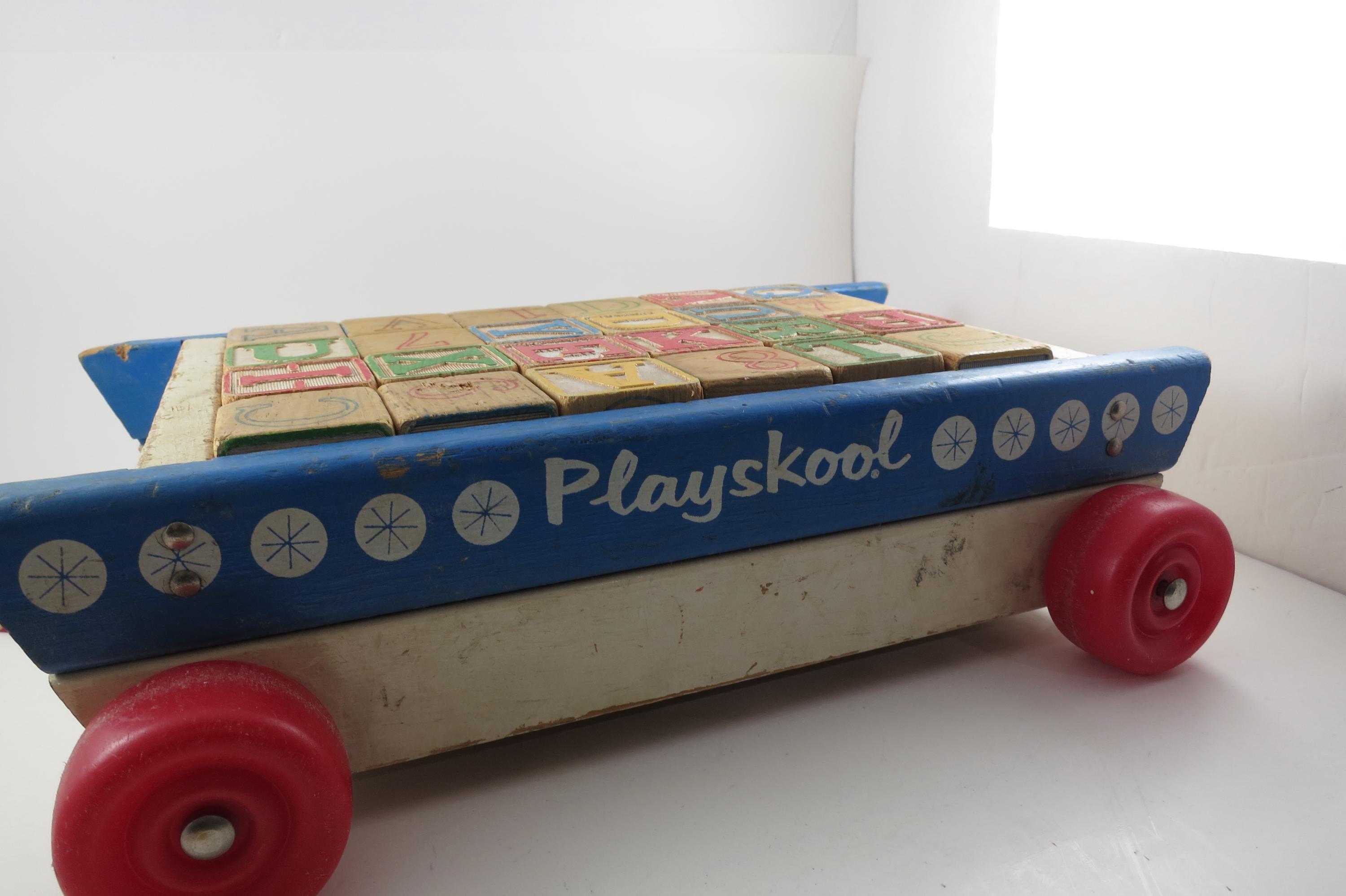 Vintage Wooden Playskool RWB Pull Along Wagon with Rope and 24 Original Blocks. Neat old toy!