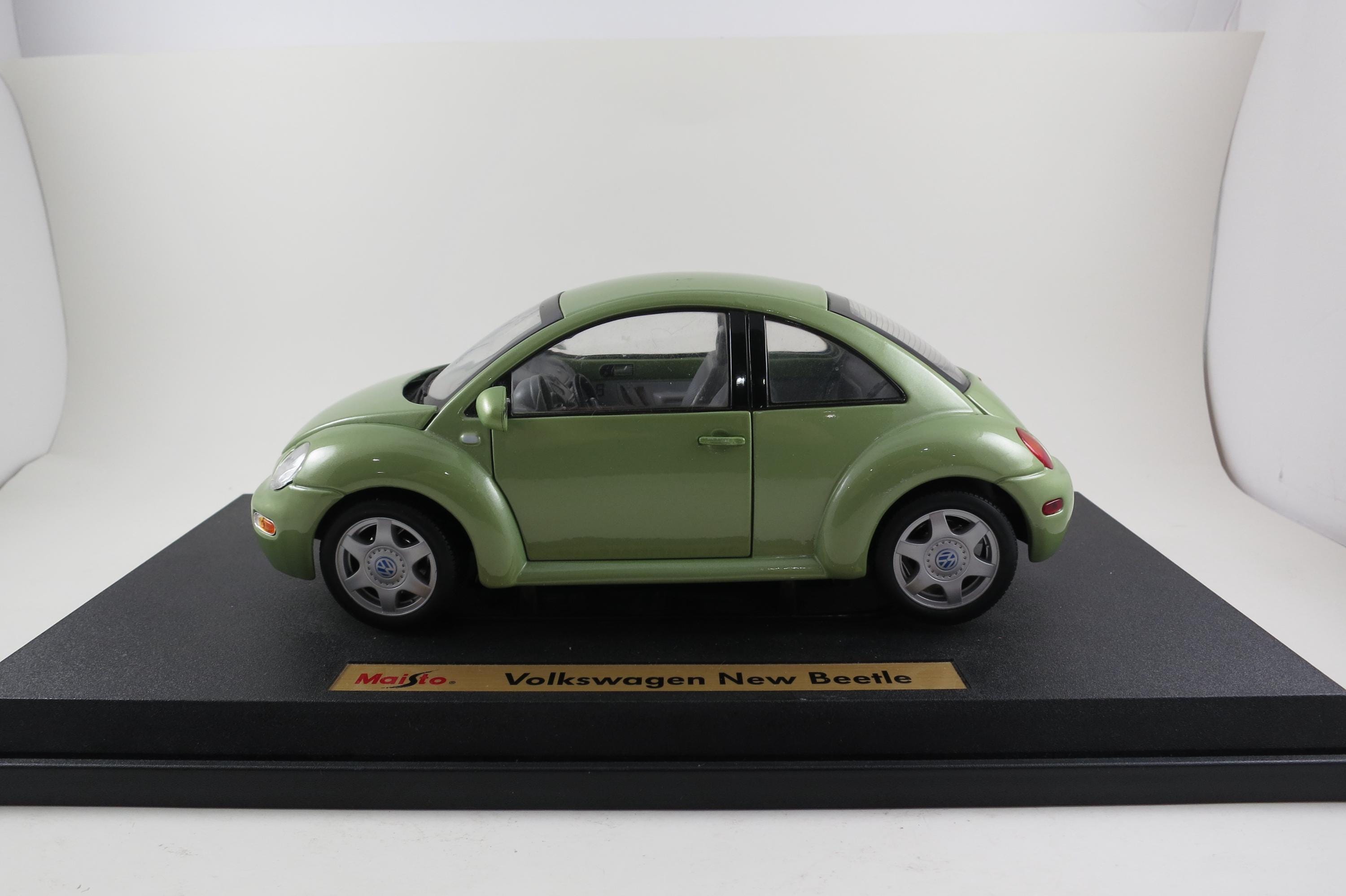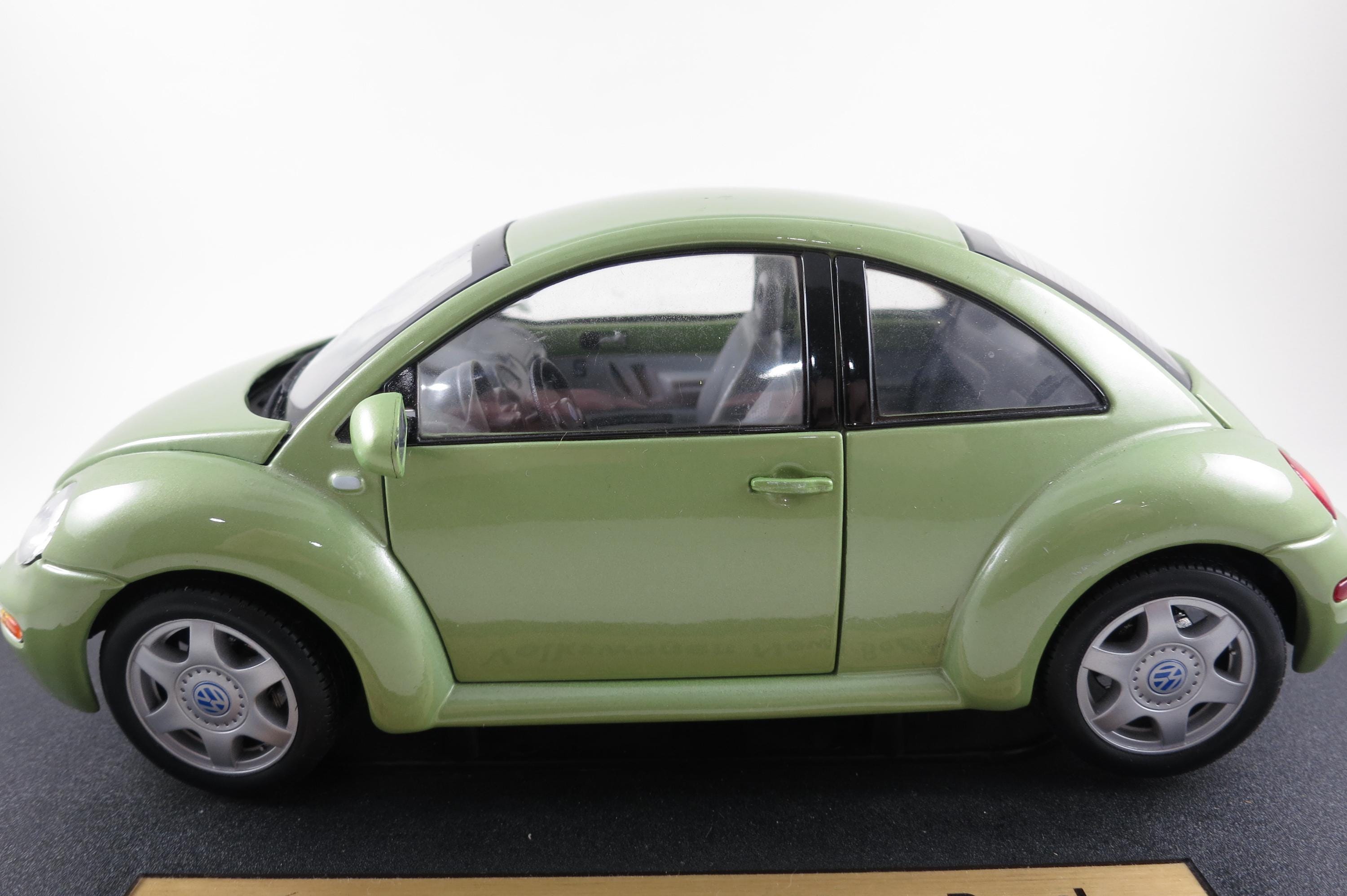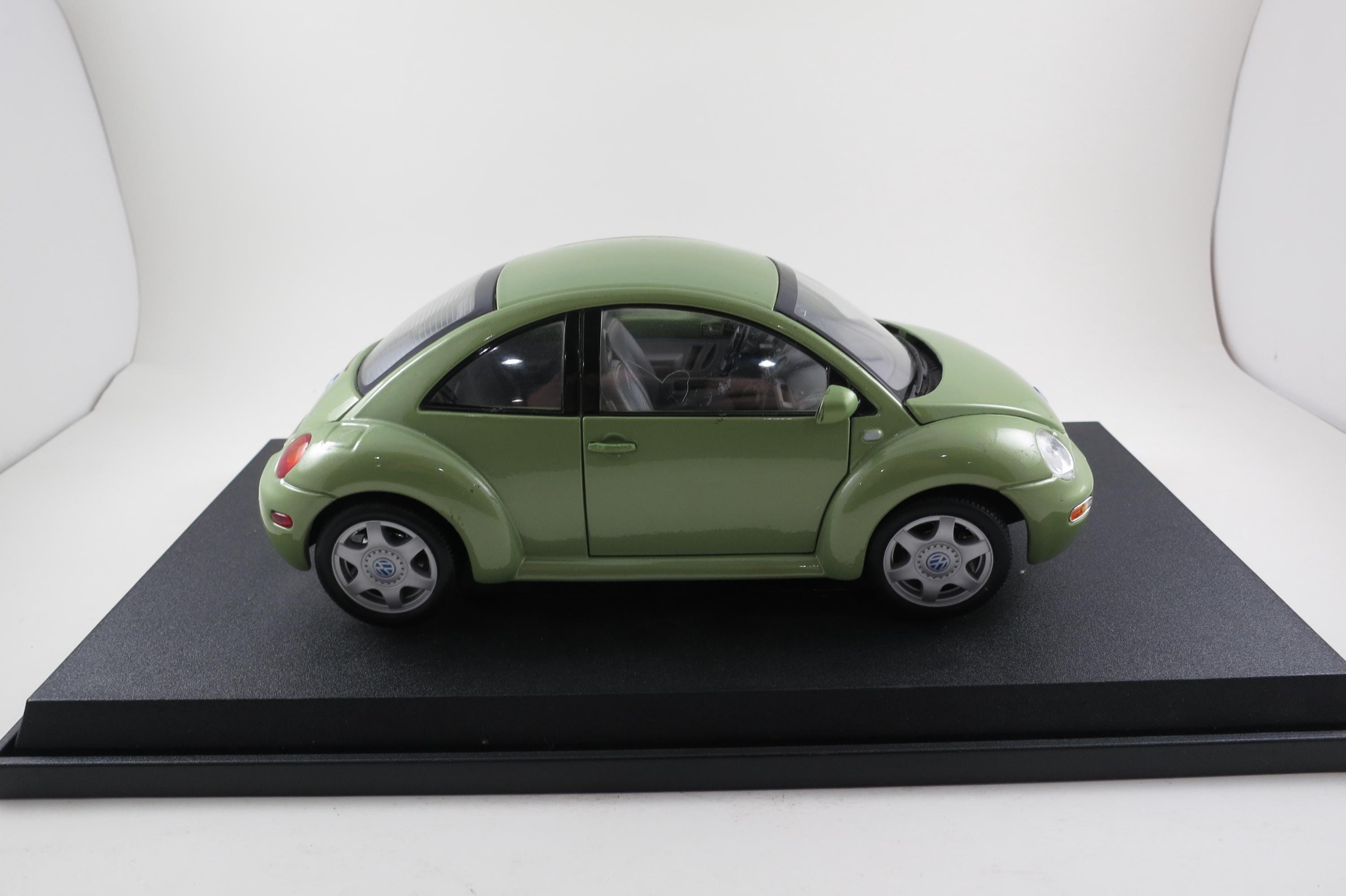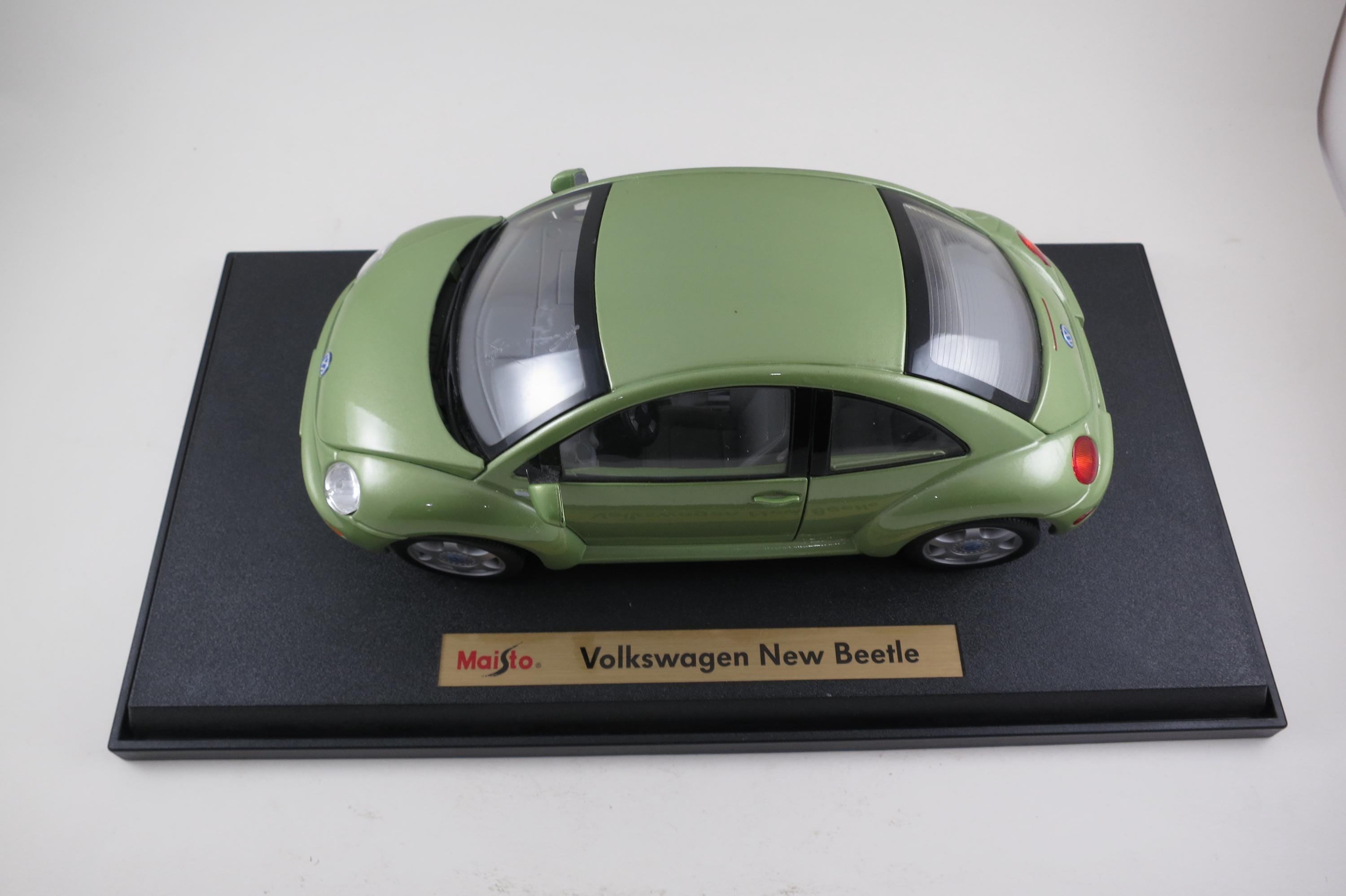 1:18 Scale Maisto Model 1998 Volkswagen New Beetle Lime Green. Small Windshield Crack. Very detailed as are all the Maisto models. This one has been on display for many years and comes complete with some dust!