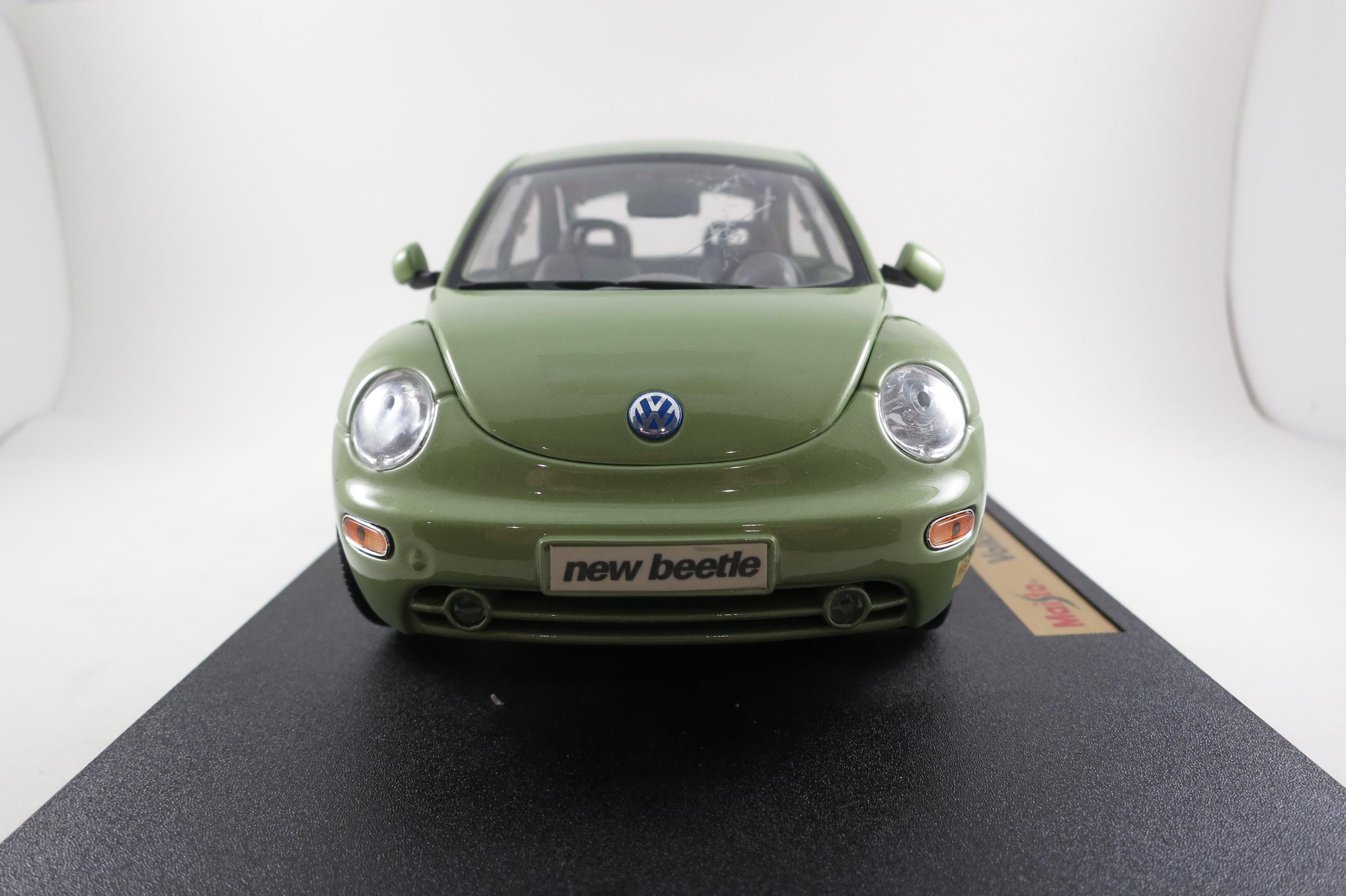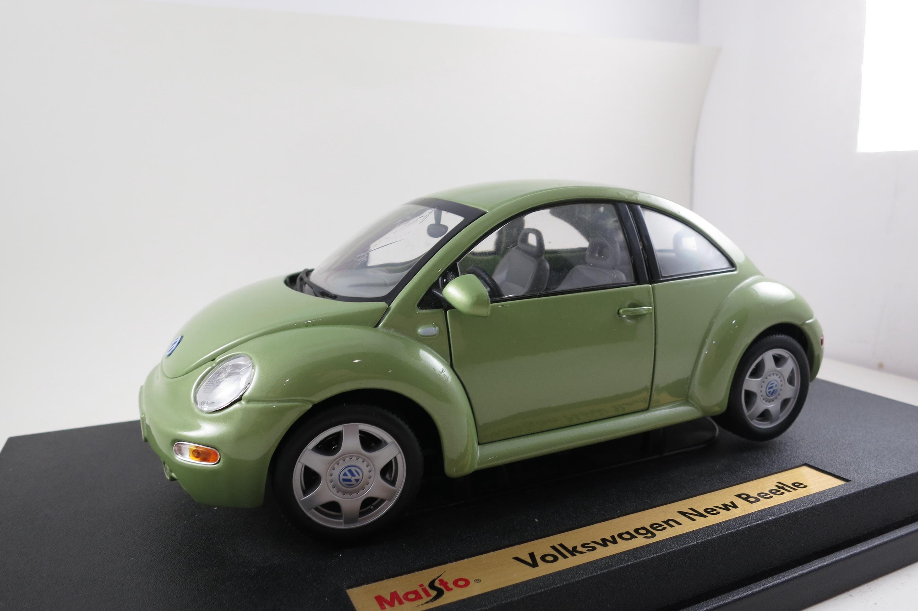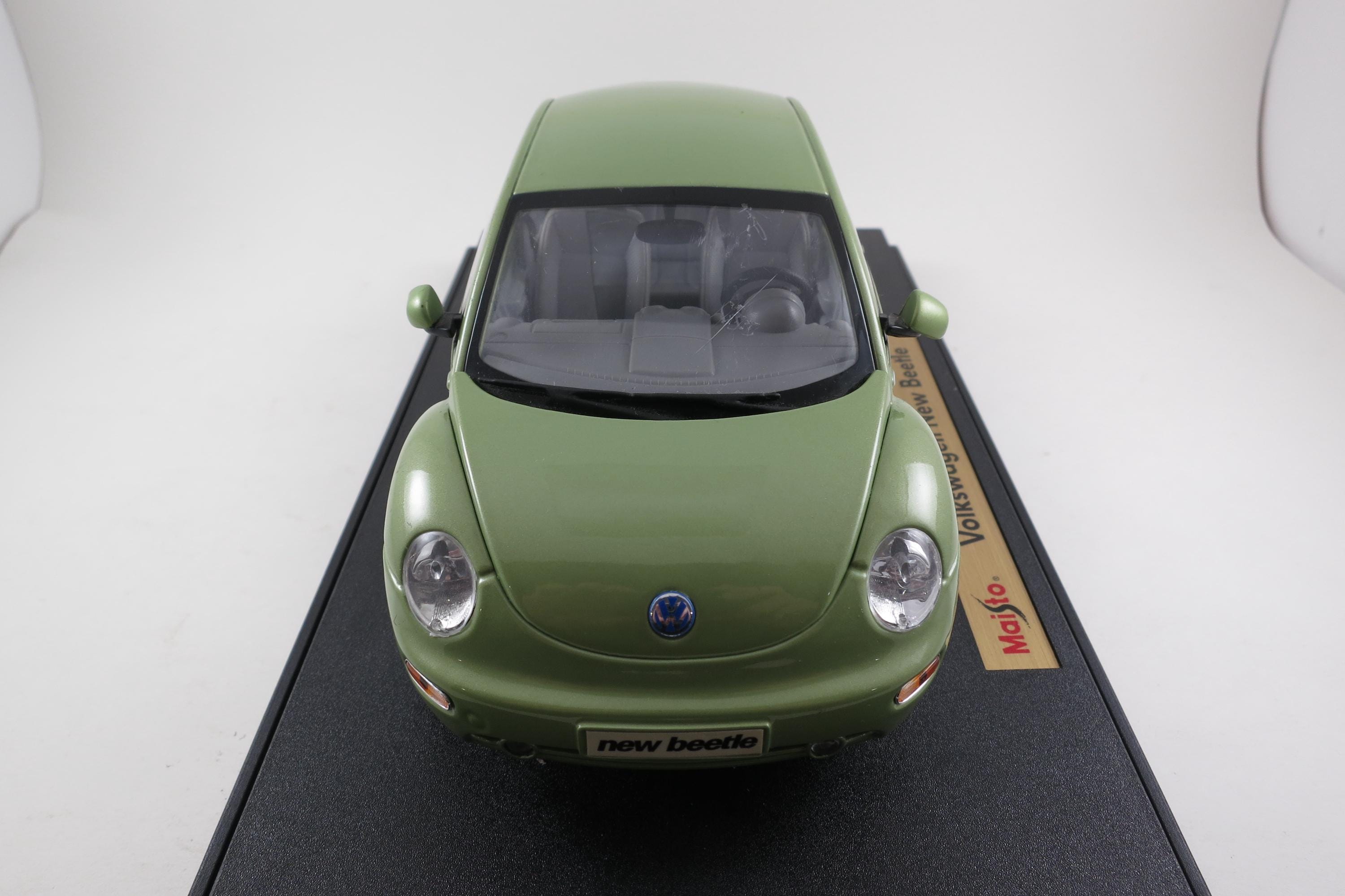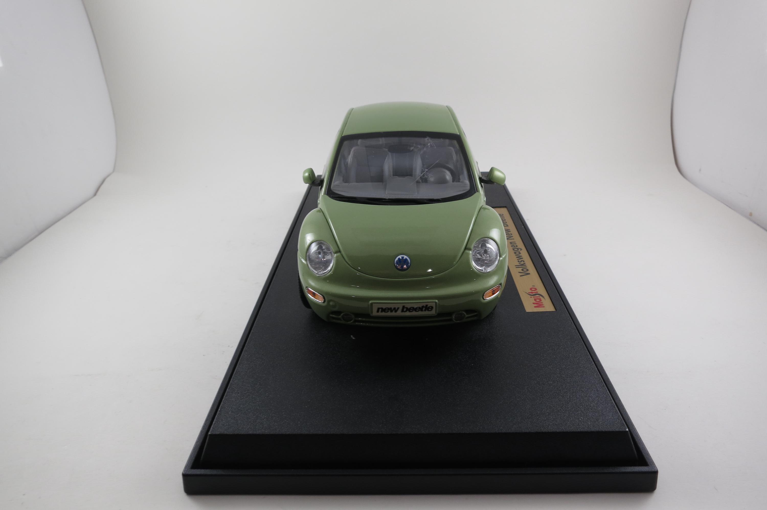 1:18 Scale Maisto Model 1998 Volkswagen New Beetle Lime Green. Small Windshield Crack. Very detailed as are all the Maisto models. This one has been on display for many years and comes complete with some dust!