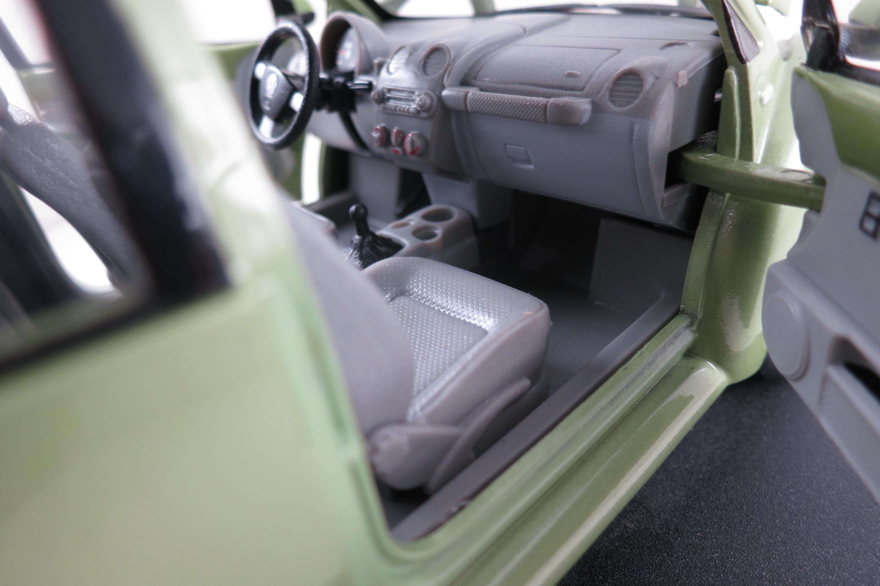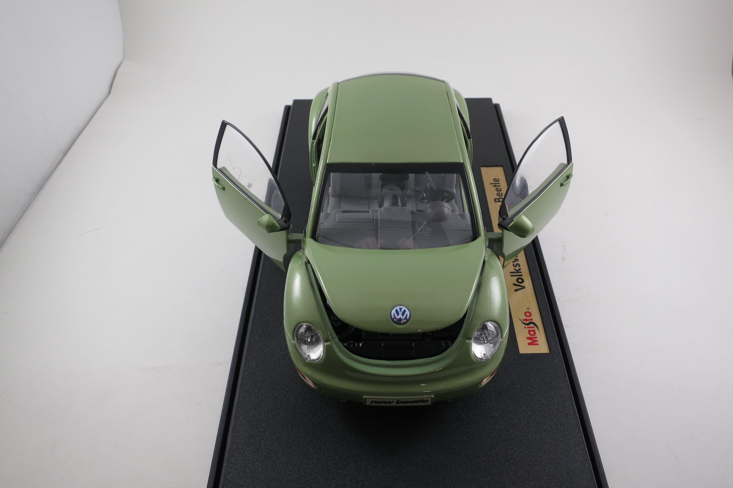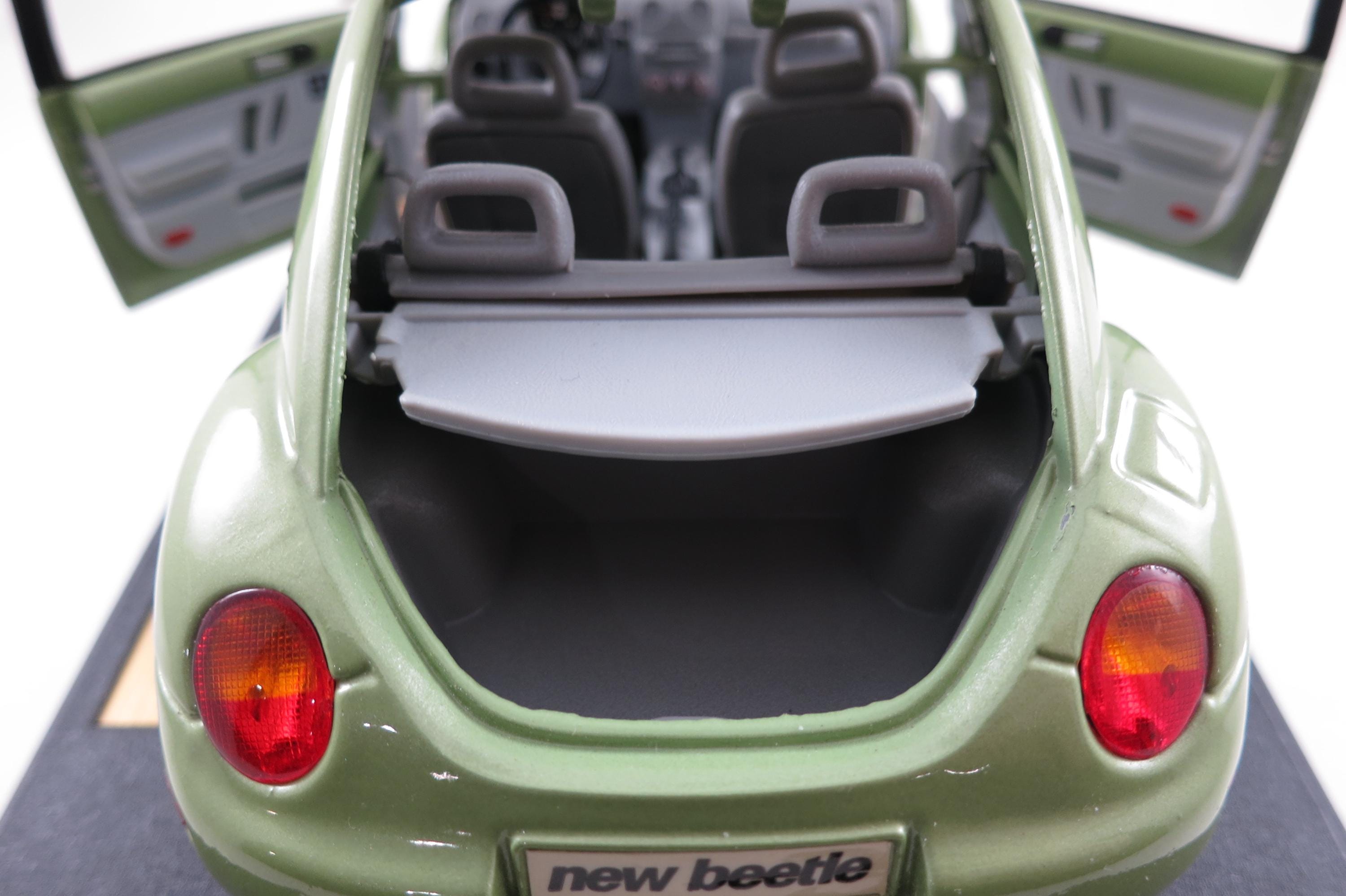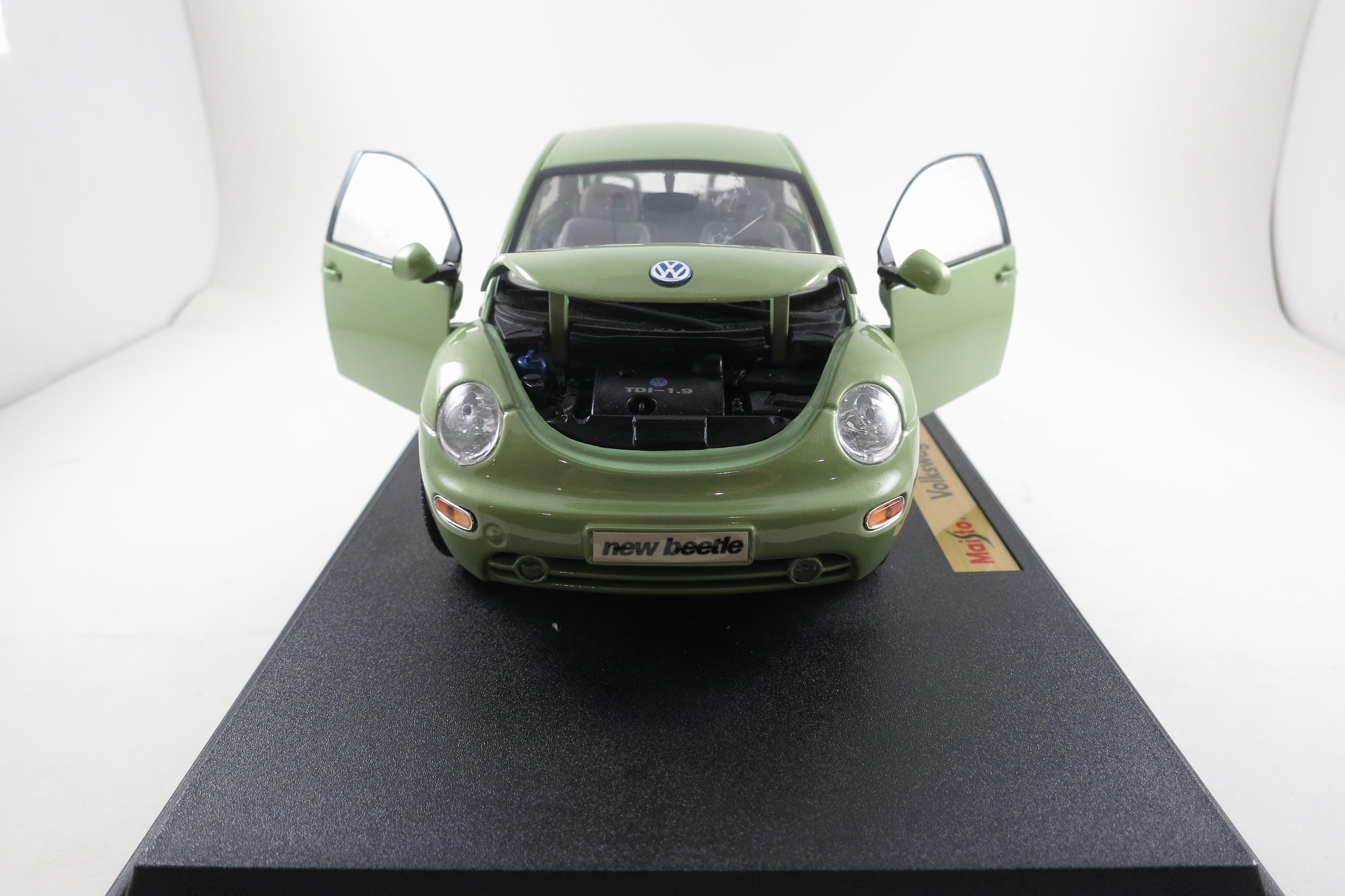 1:18 Scale Maisto Model 1998 Volkswagen New Beetle Lime Green. Small Windshield Crack. Very detailed as are all the Maisto models. This one has been on display for many years and comes complete with some dust!