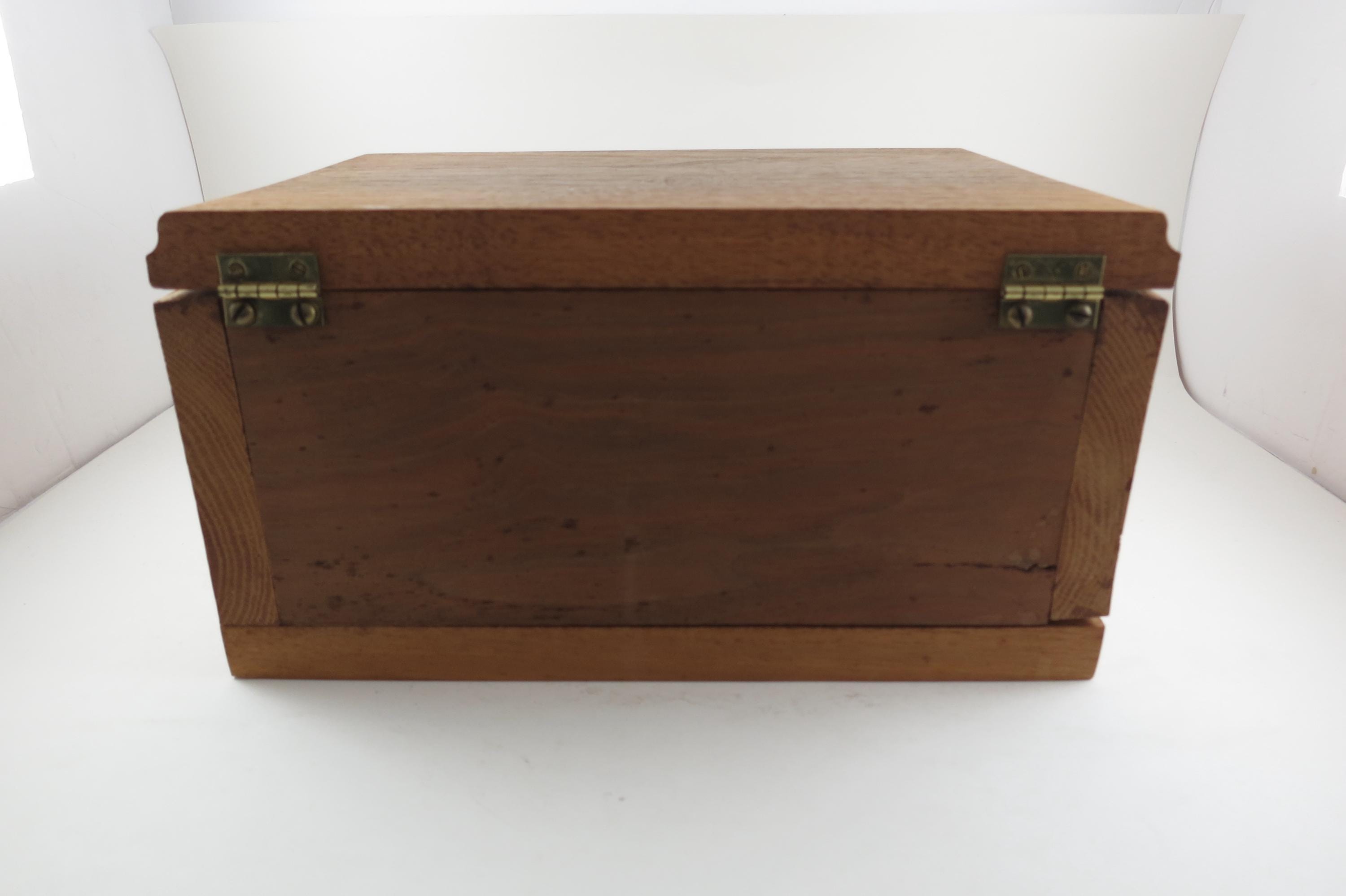 Measures 10 3/8 inches wide, 7 1/2 inches deep and 5 1/2 Inches Tall. Neat Old Box!