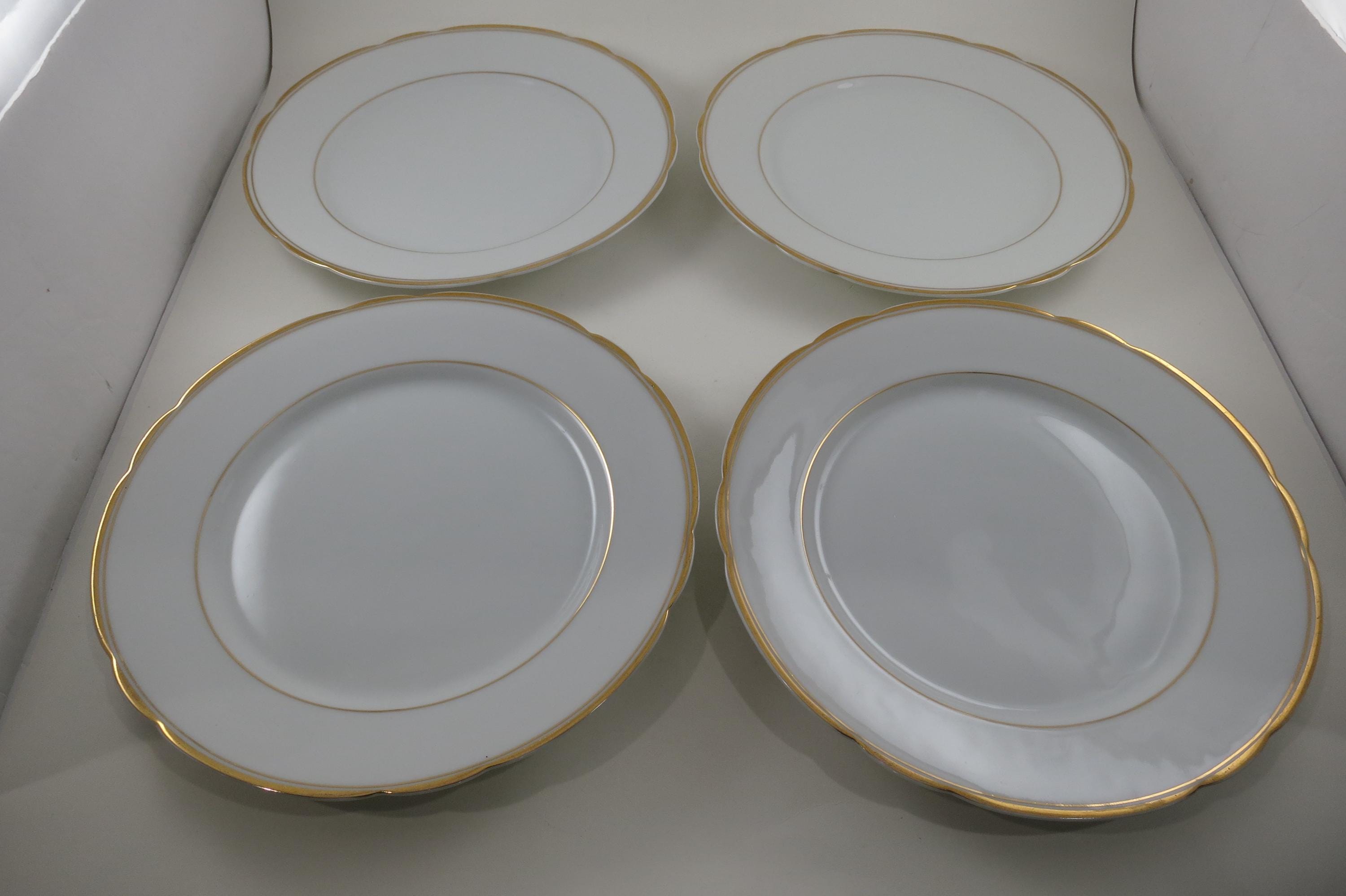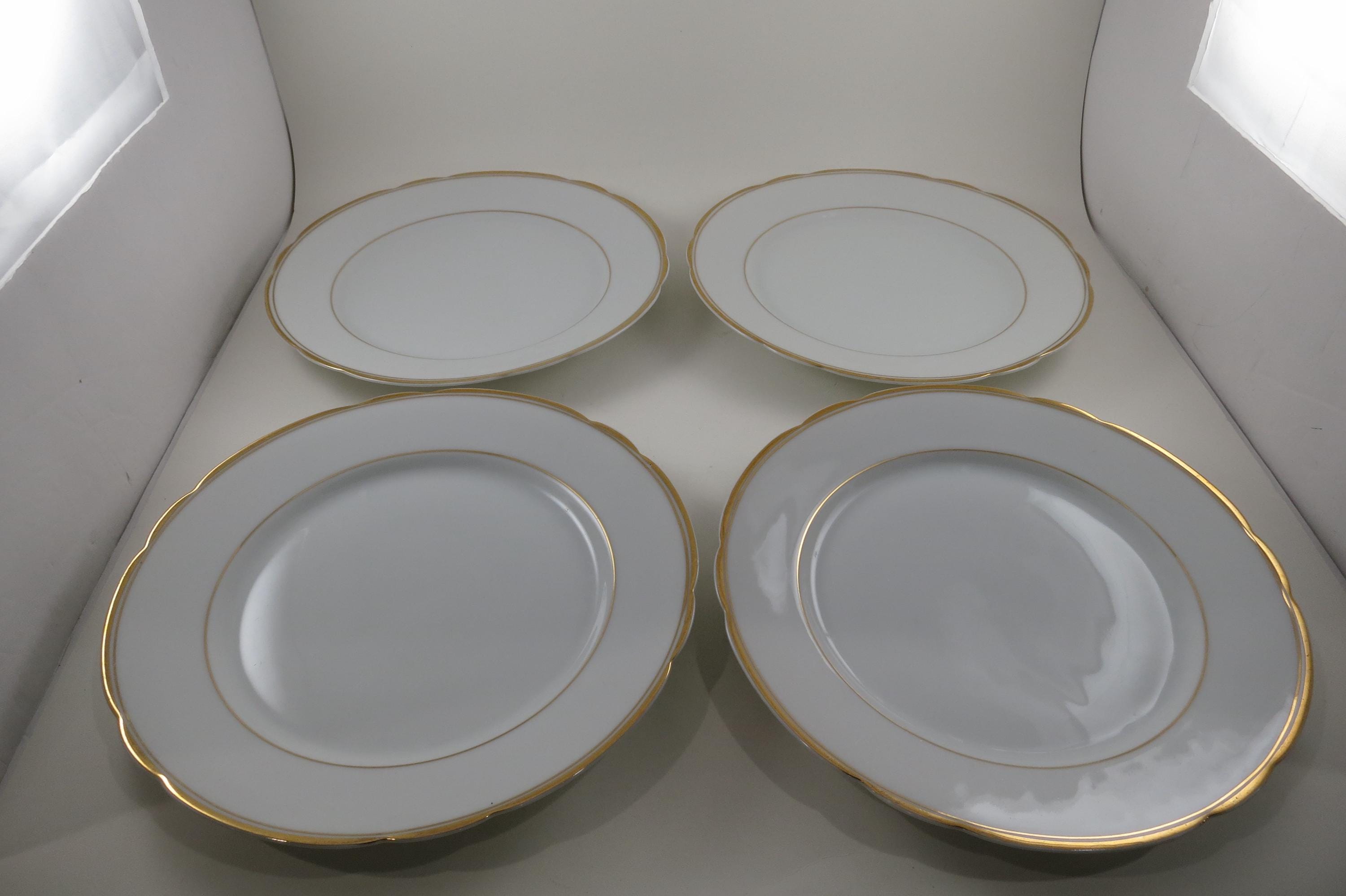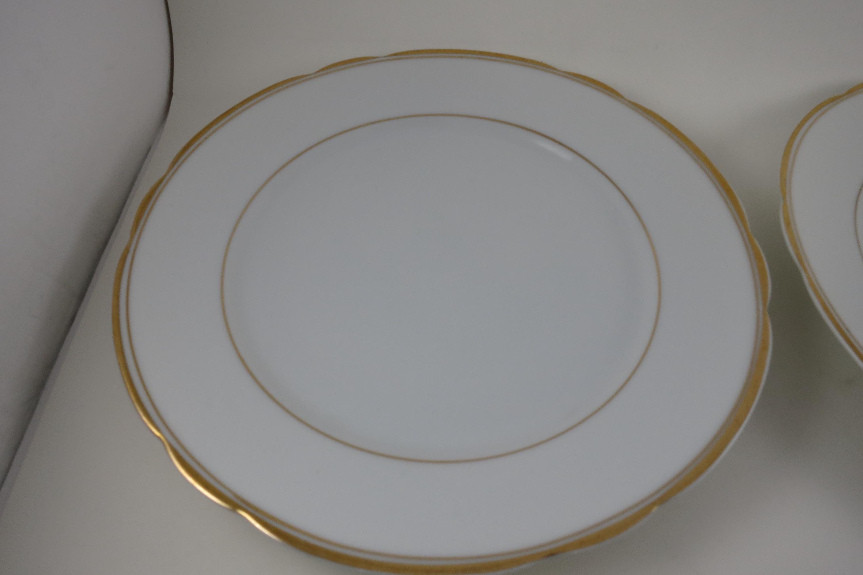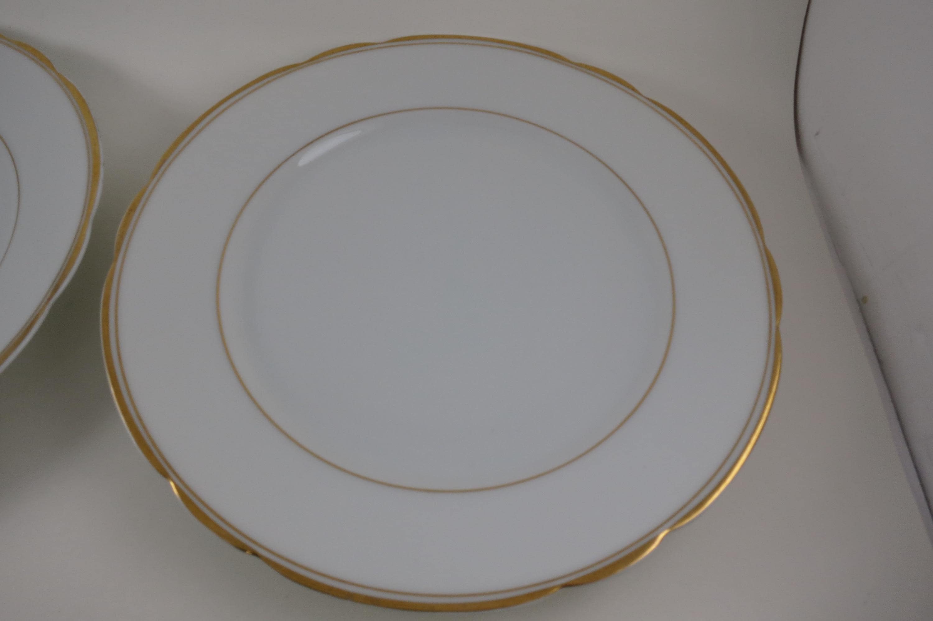 These are fabulous and in excellent condition with no chips, cracks or damages. Beautiful Scalloped pattern with gold rims. Each measures 9 1/2 Inches.