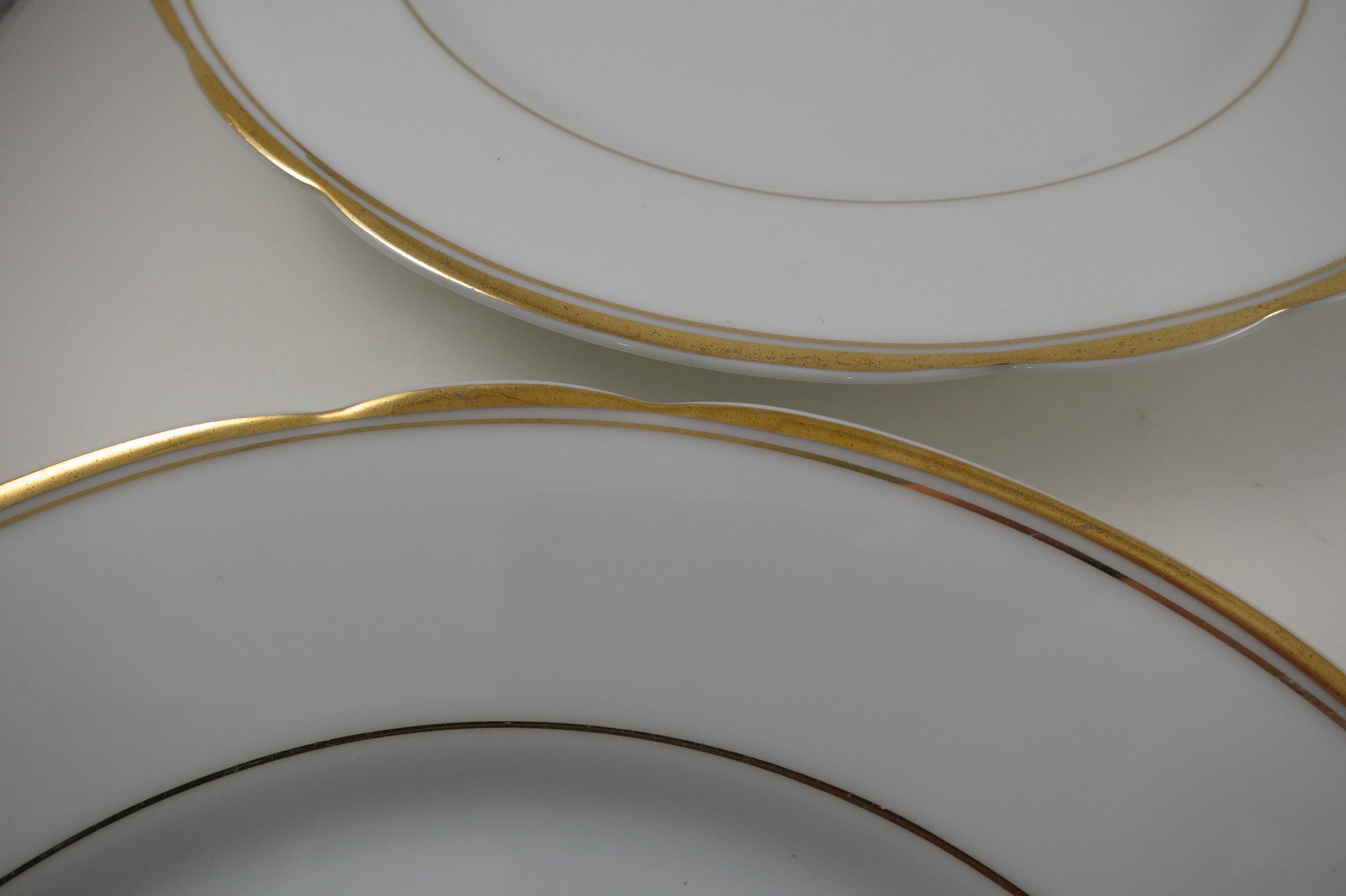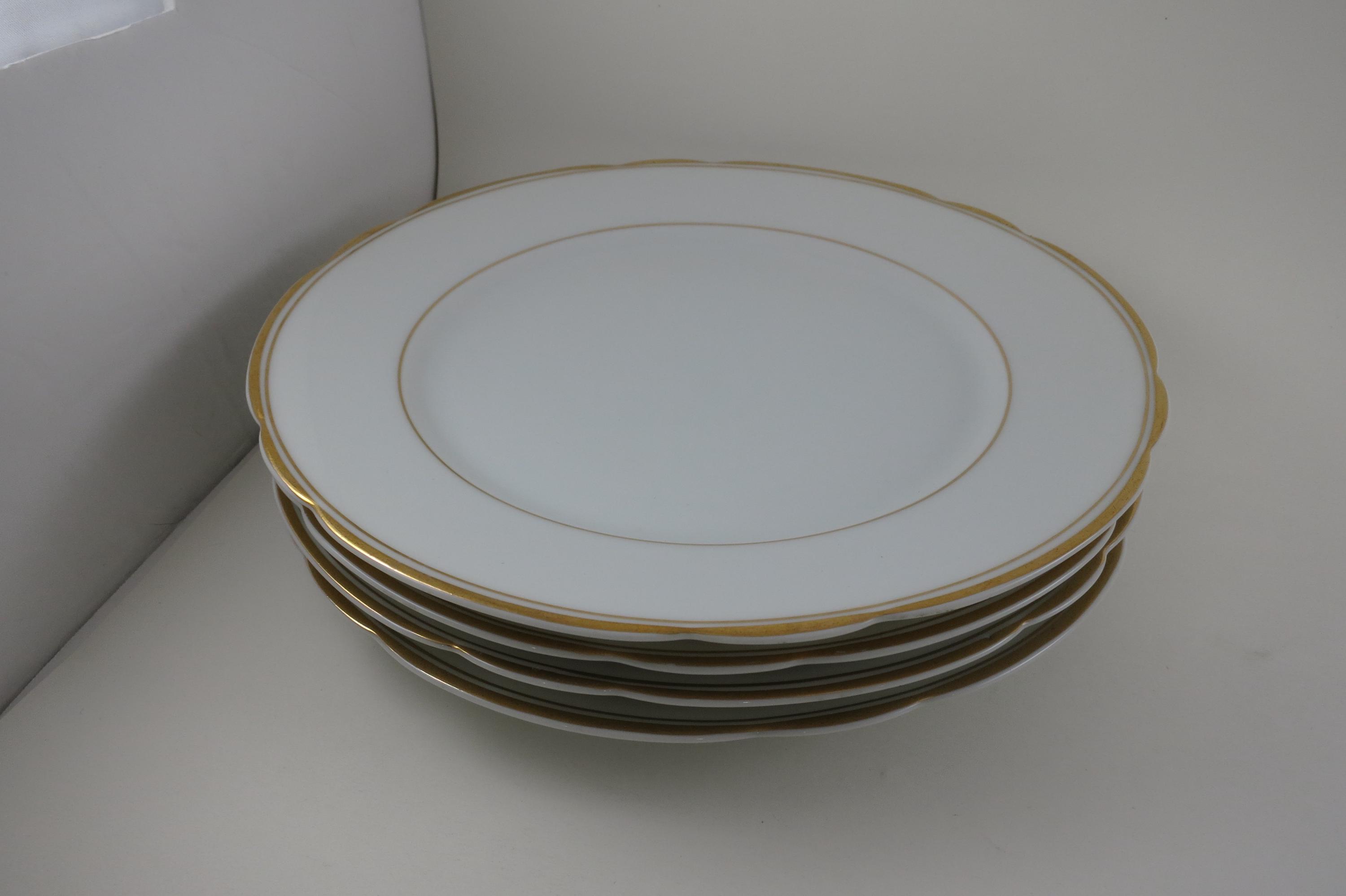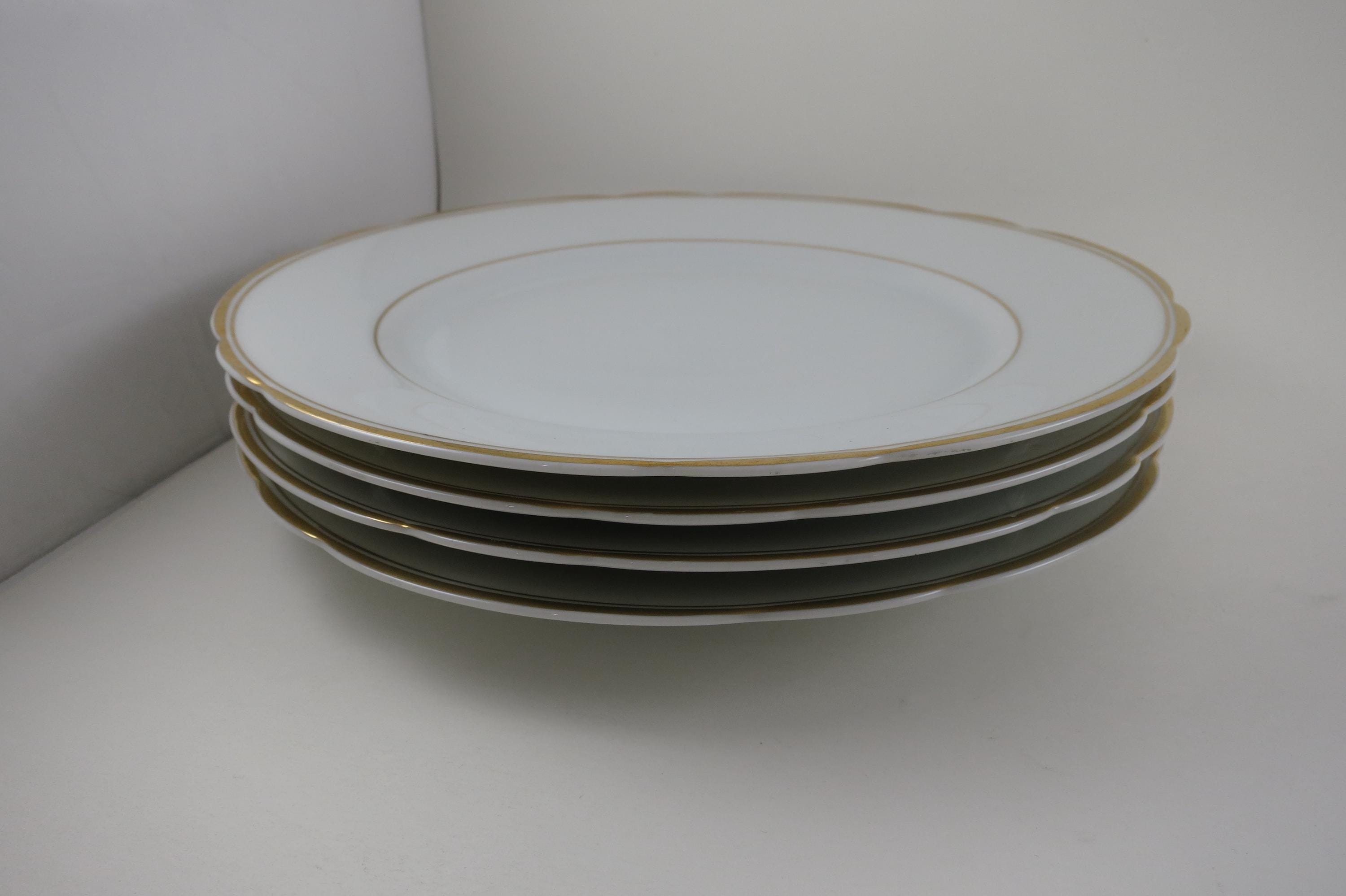 These are fabulous and in excellent condition with no chips, cracks or damages. Beautiful Scalloped pattern with gold rims. Each measures 9 1/2 Inches.