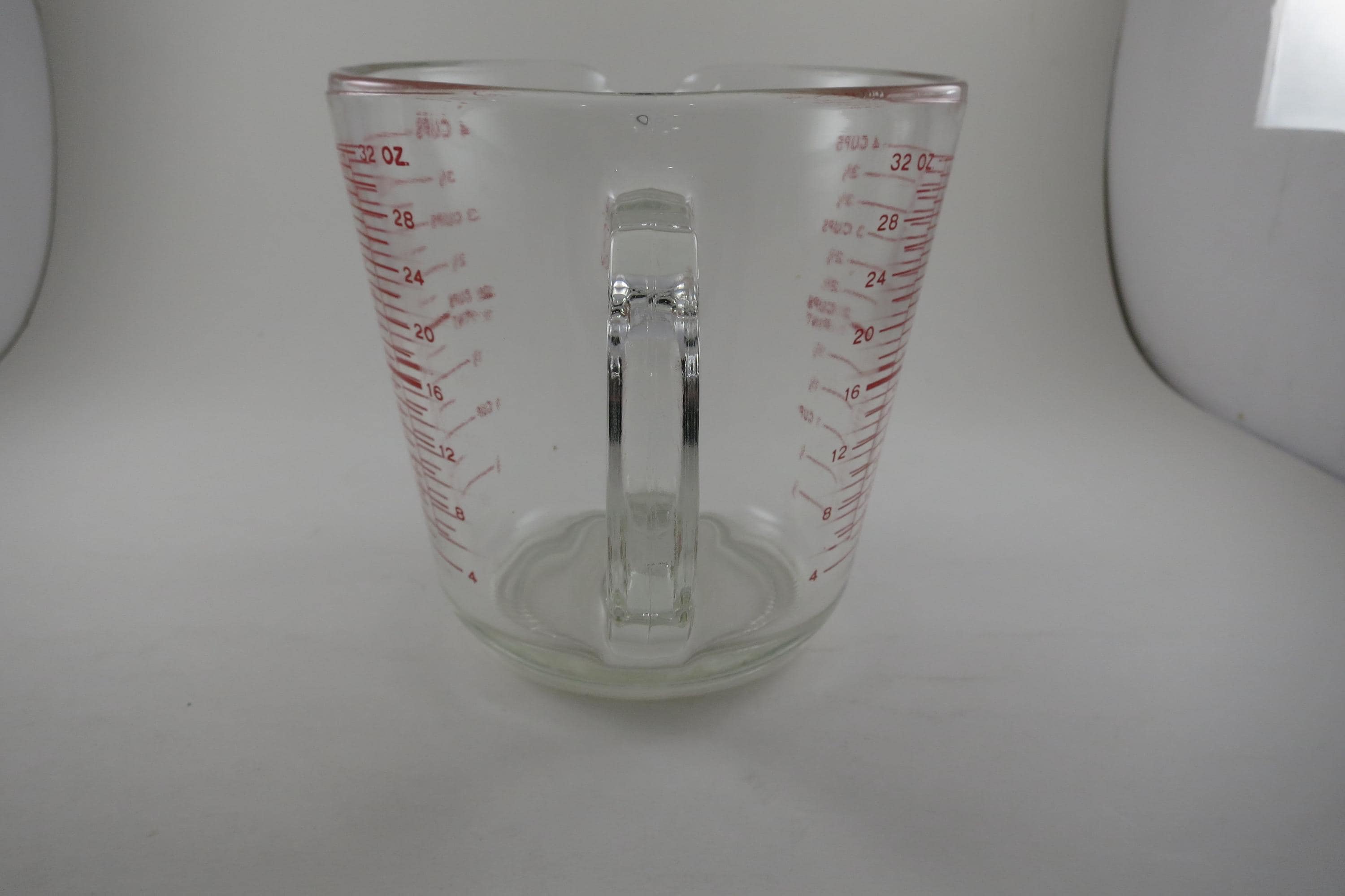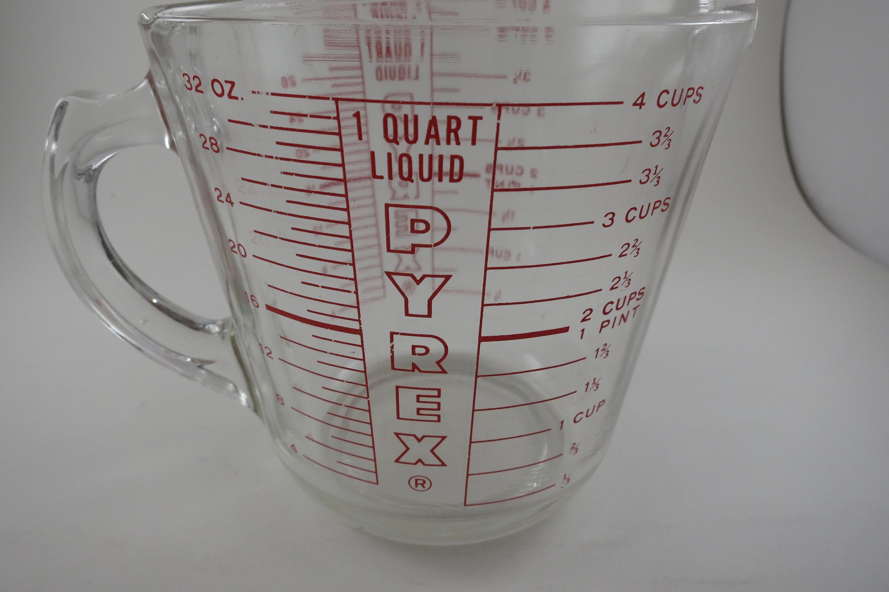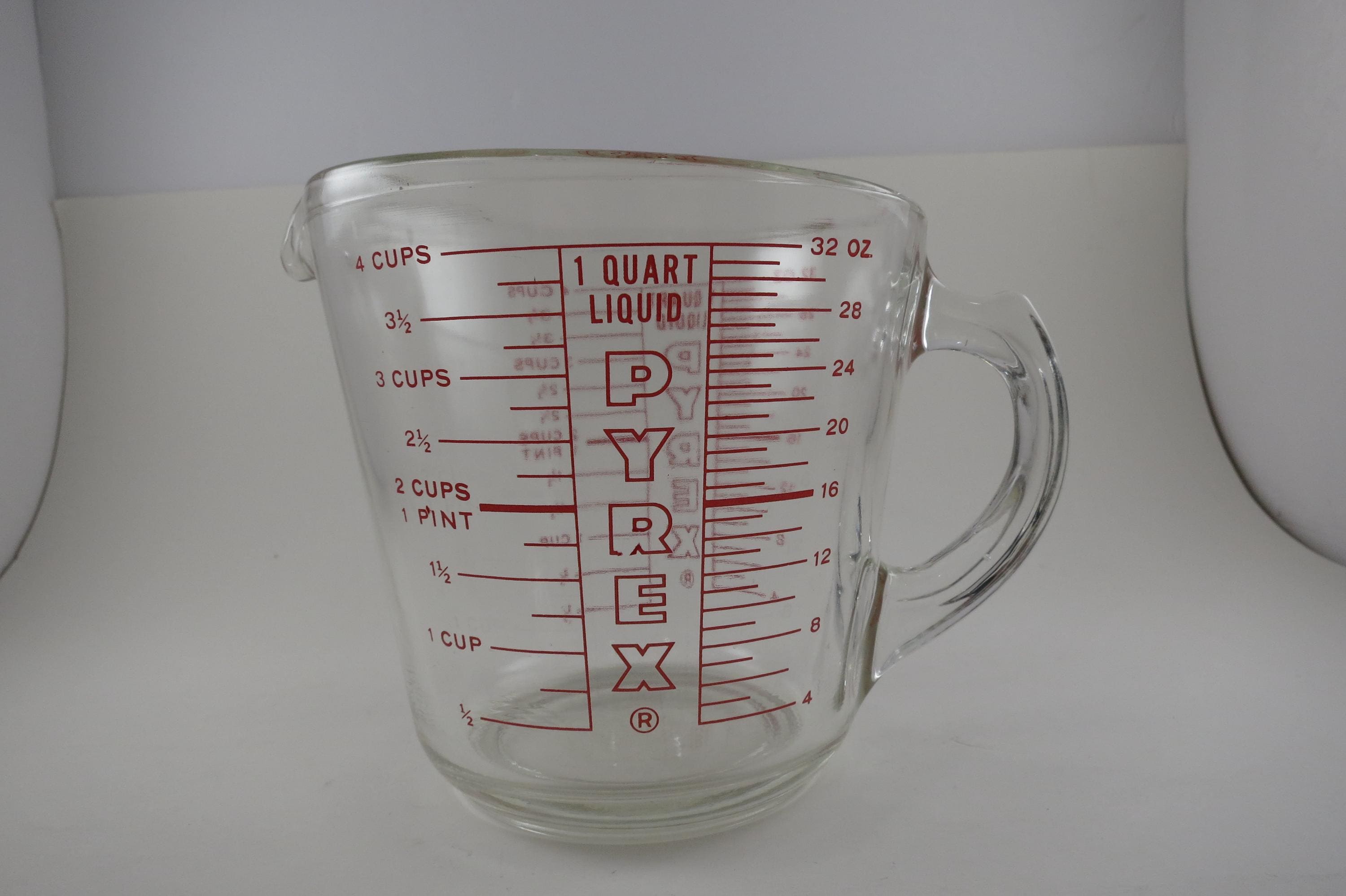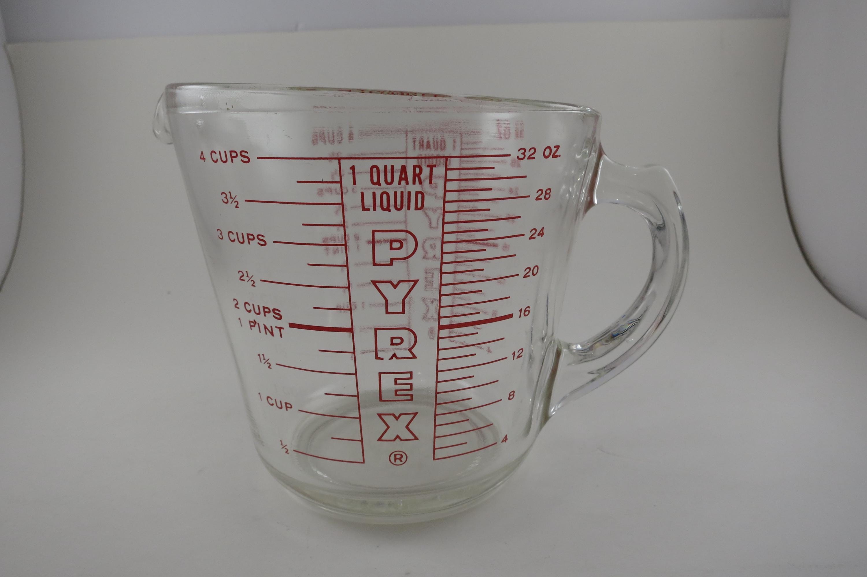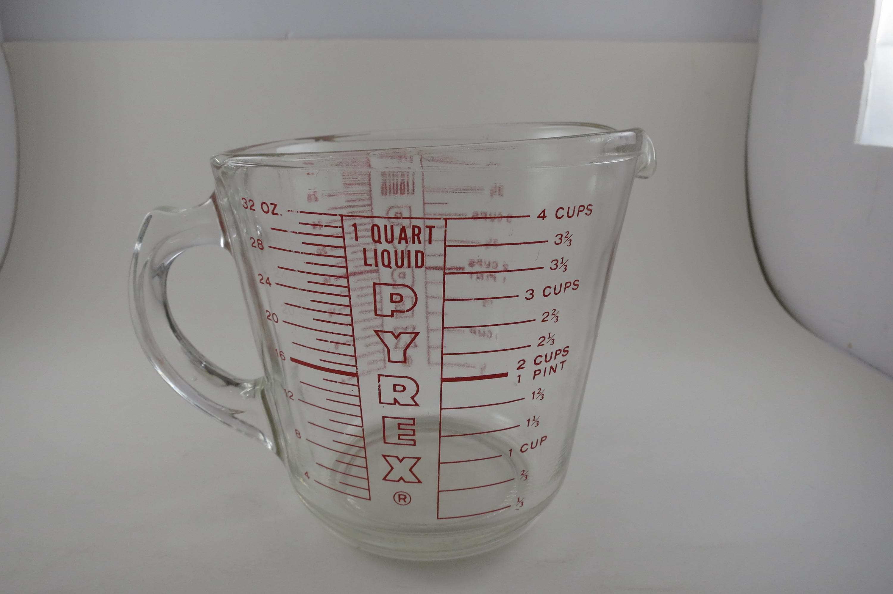 Vintage Pyrex Measuring Cup: 4 Cups 32 Ounce, Red Lettering. Excellent Condition. No chips, cracks or damages.
