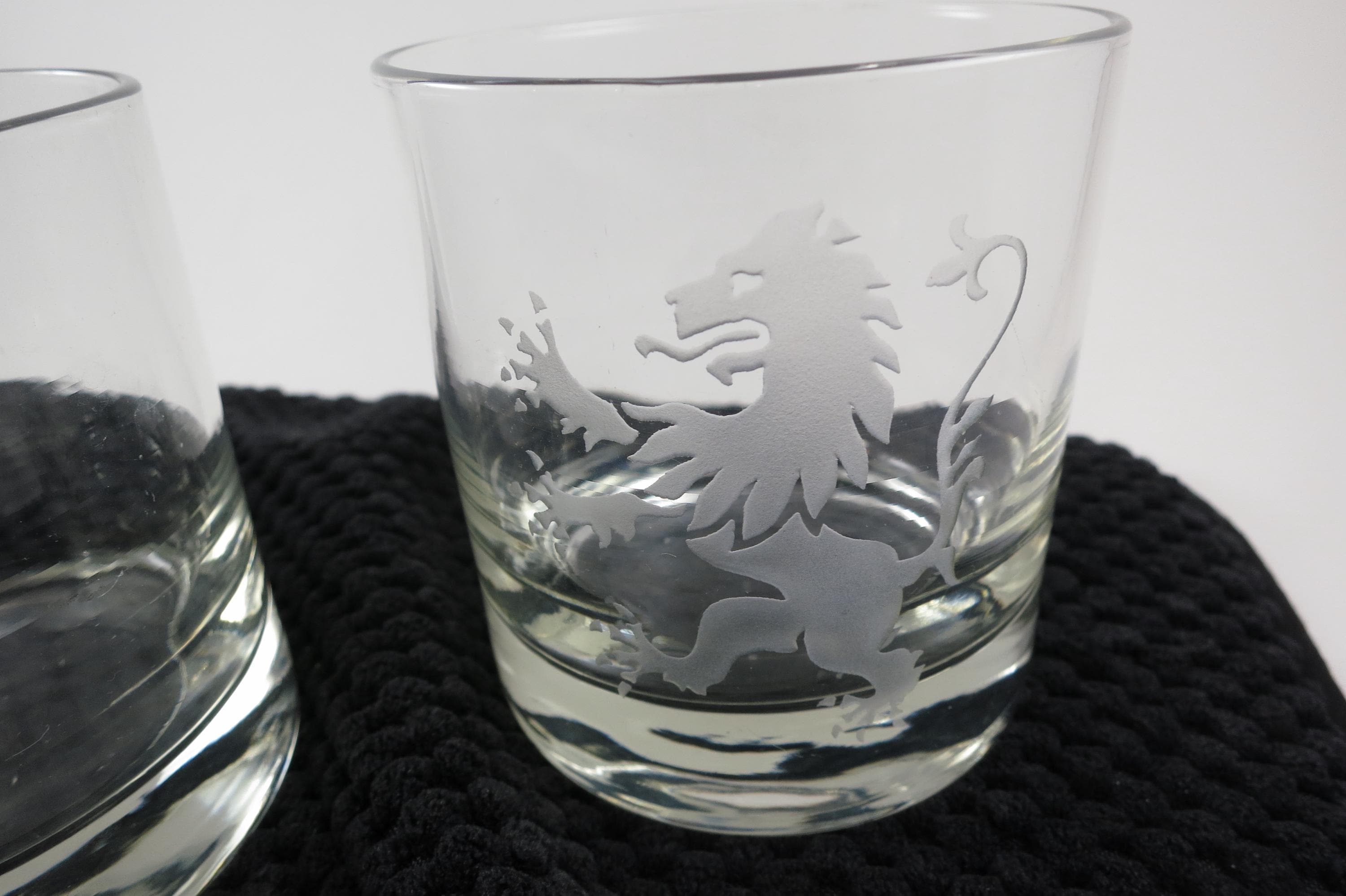 These are beautiful glasses in excellent condition. Each has an etched Lion. They measure 3 1/2 inches tall and 3 1/8 inches wide. No damages.
