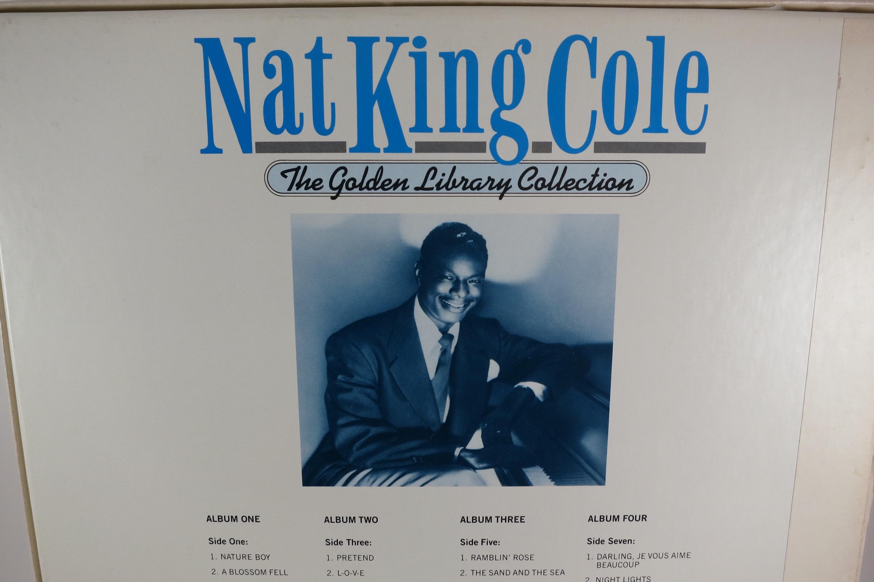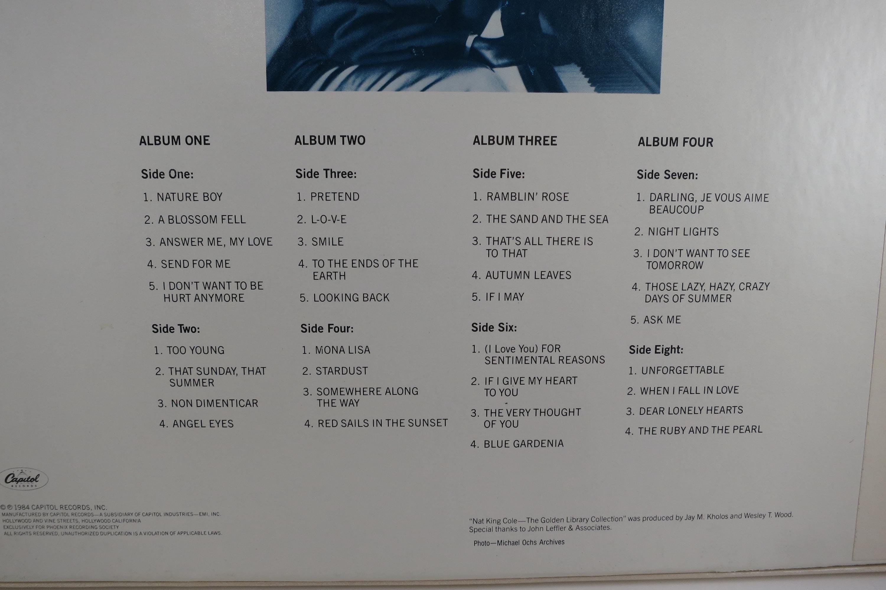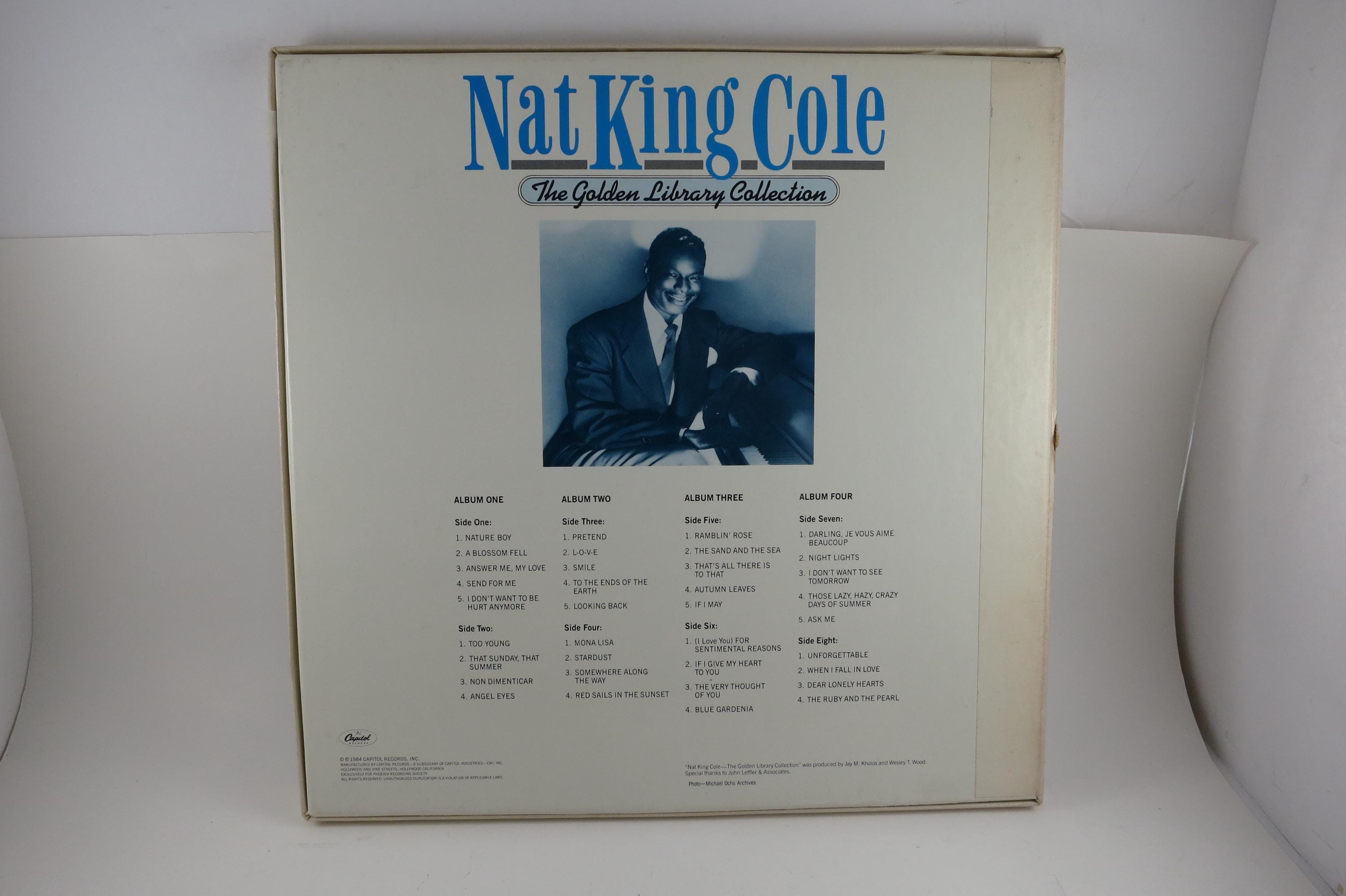 Vintage 1984 Vinyl Four LP Box Set Nat King Cole The Golden Library Collection. Original box is in excellent condition and includes the inner sleeves. All six records are Near Mint. Tracks are as follows